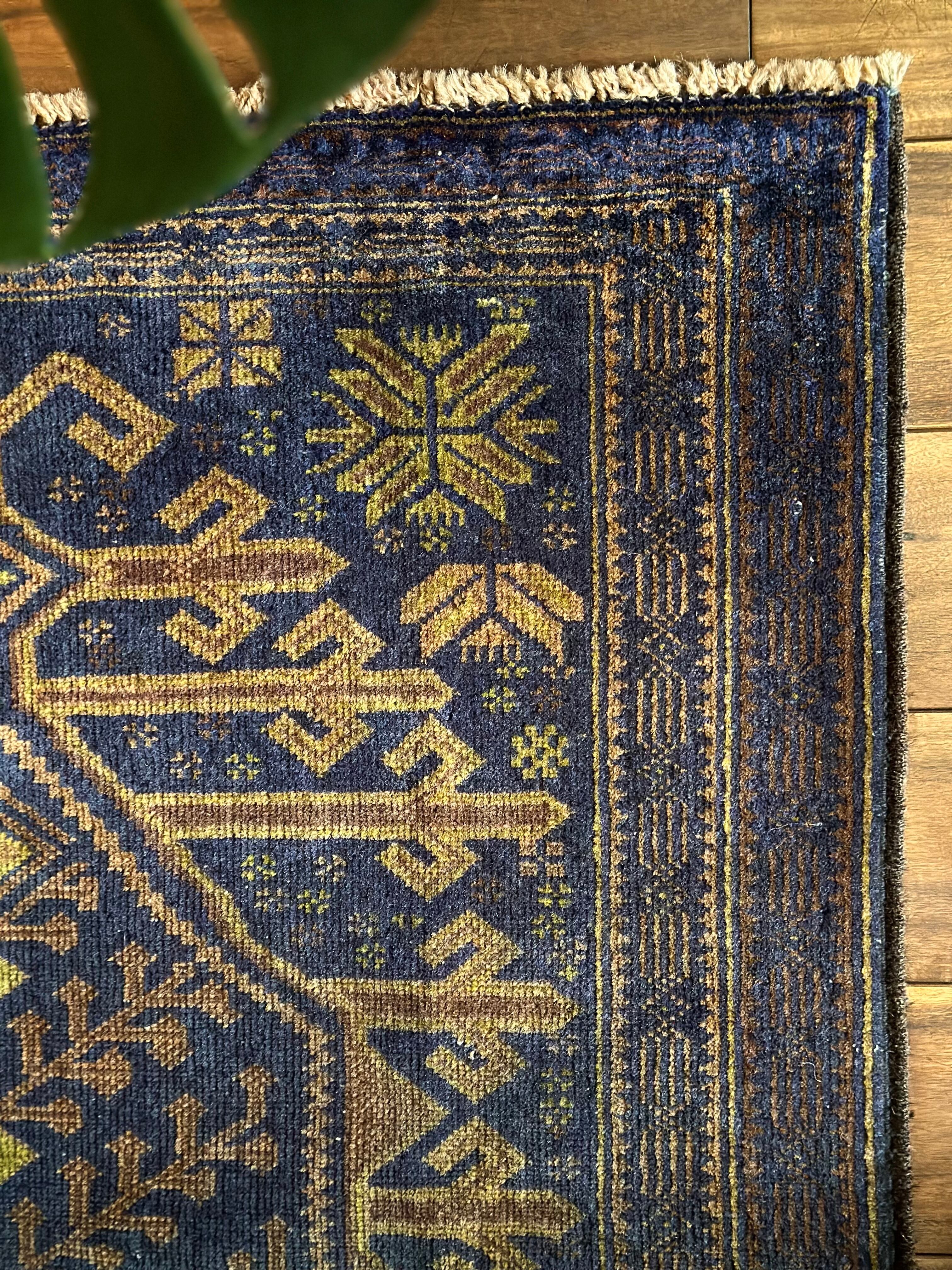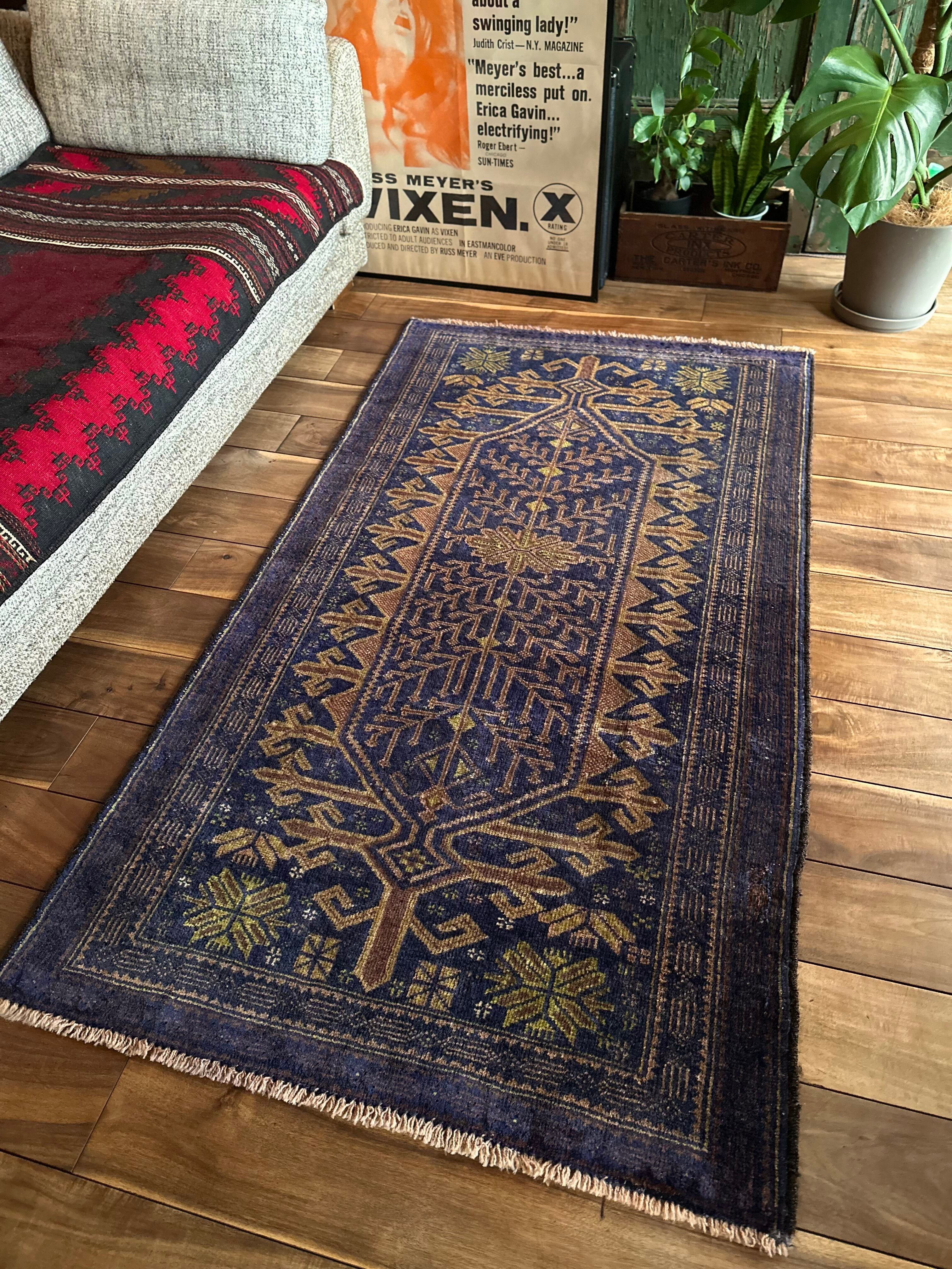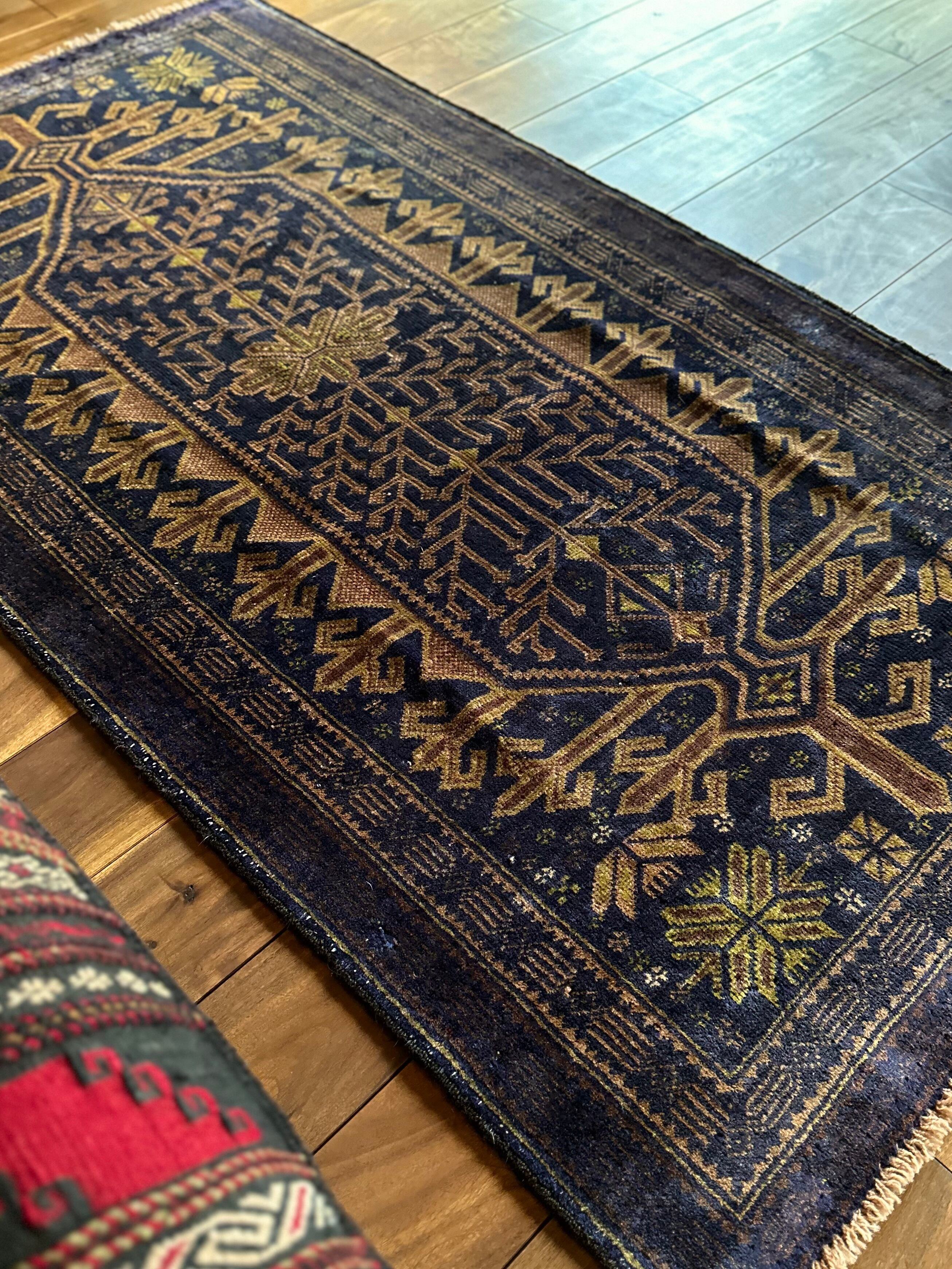 アフガニスタン西部のイランとの国境付近に位置するヘラート州から、光り輝くネイビーベースに描かれた生命の樹がモチーフのバルーチ族のトライバルラグになります。