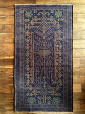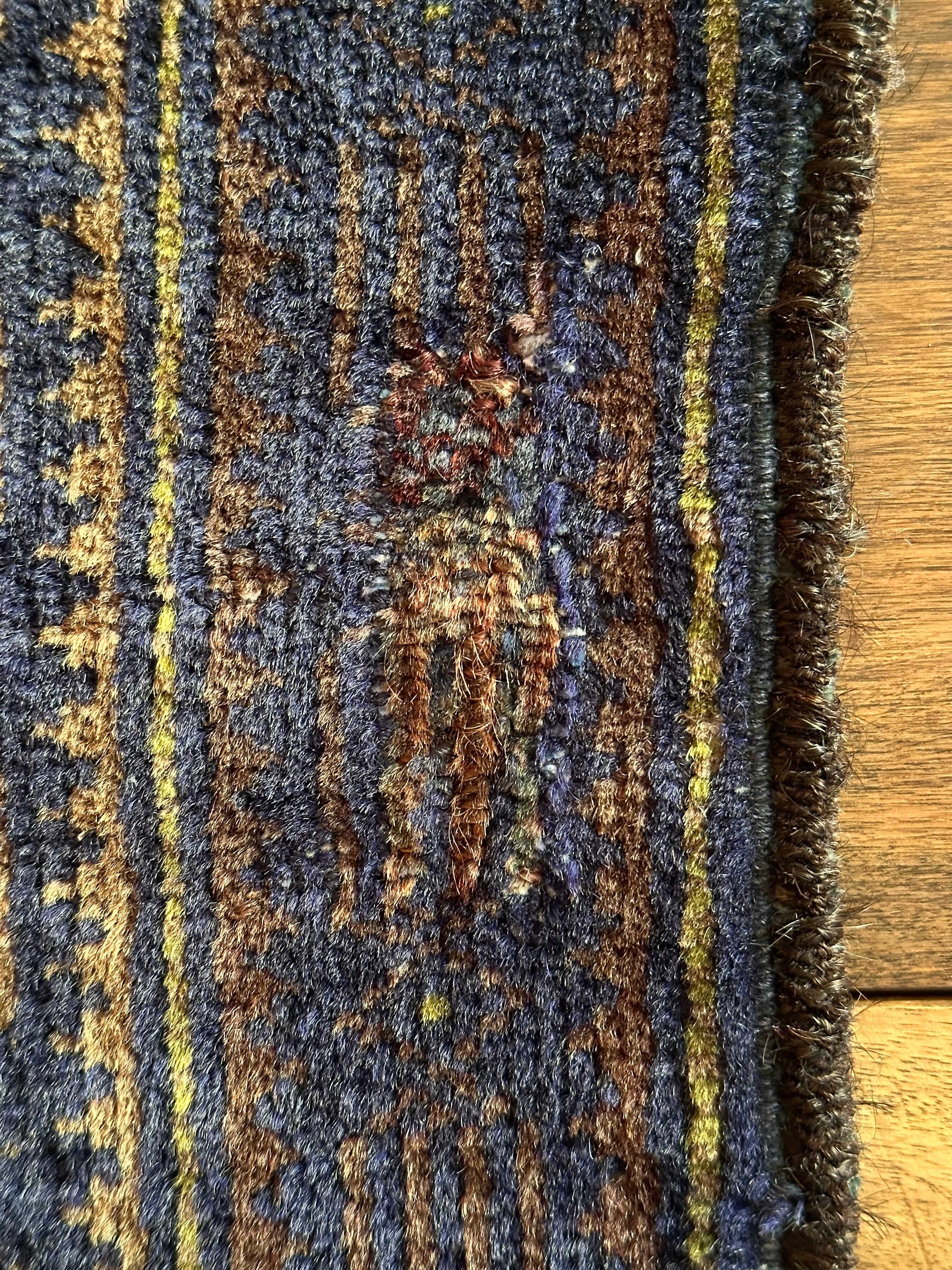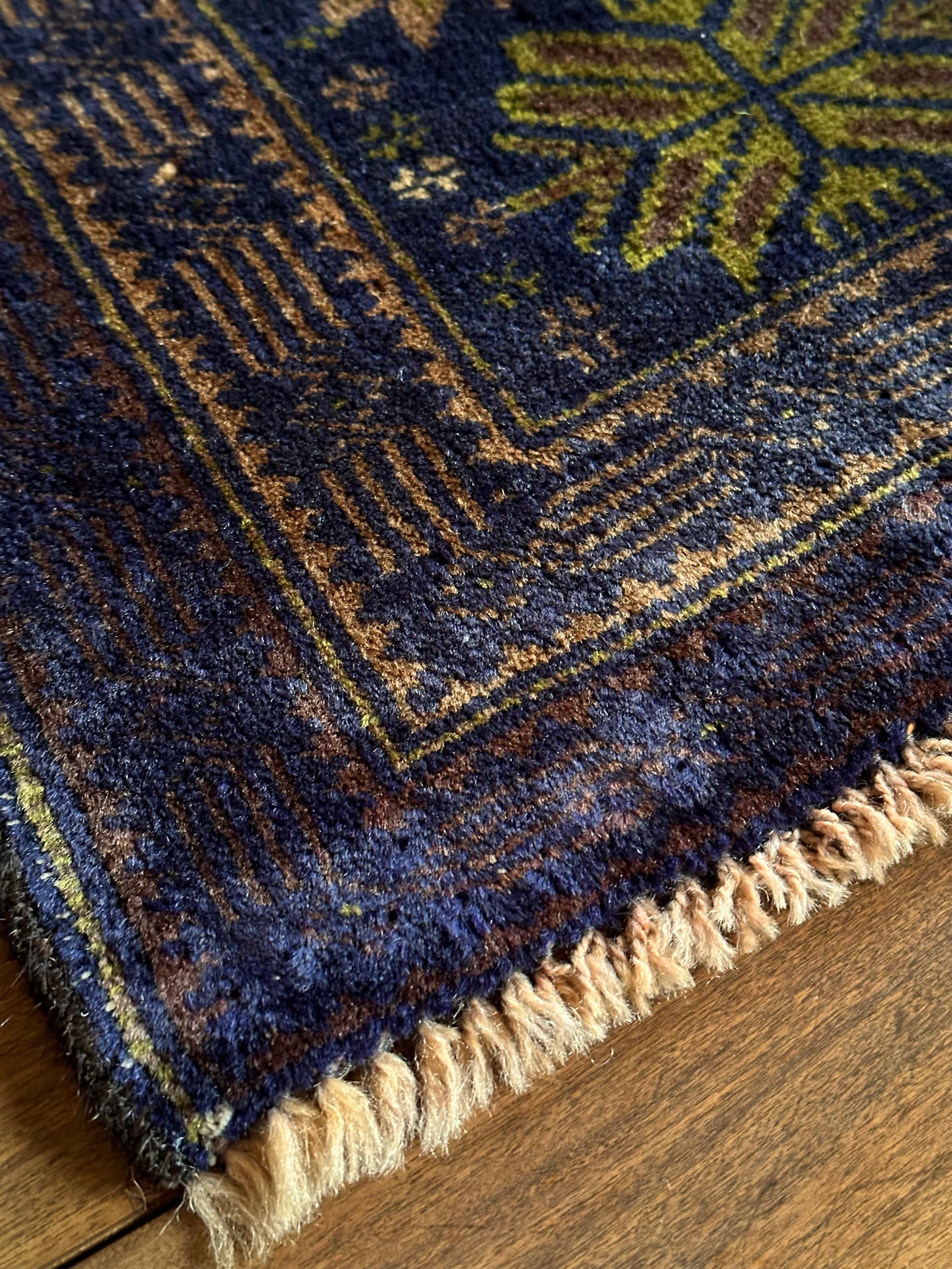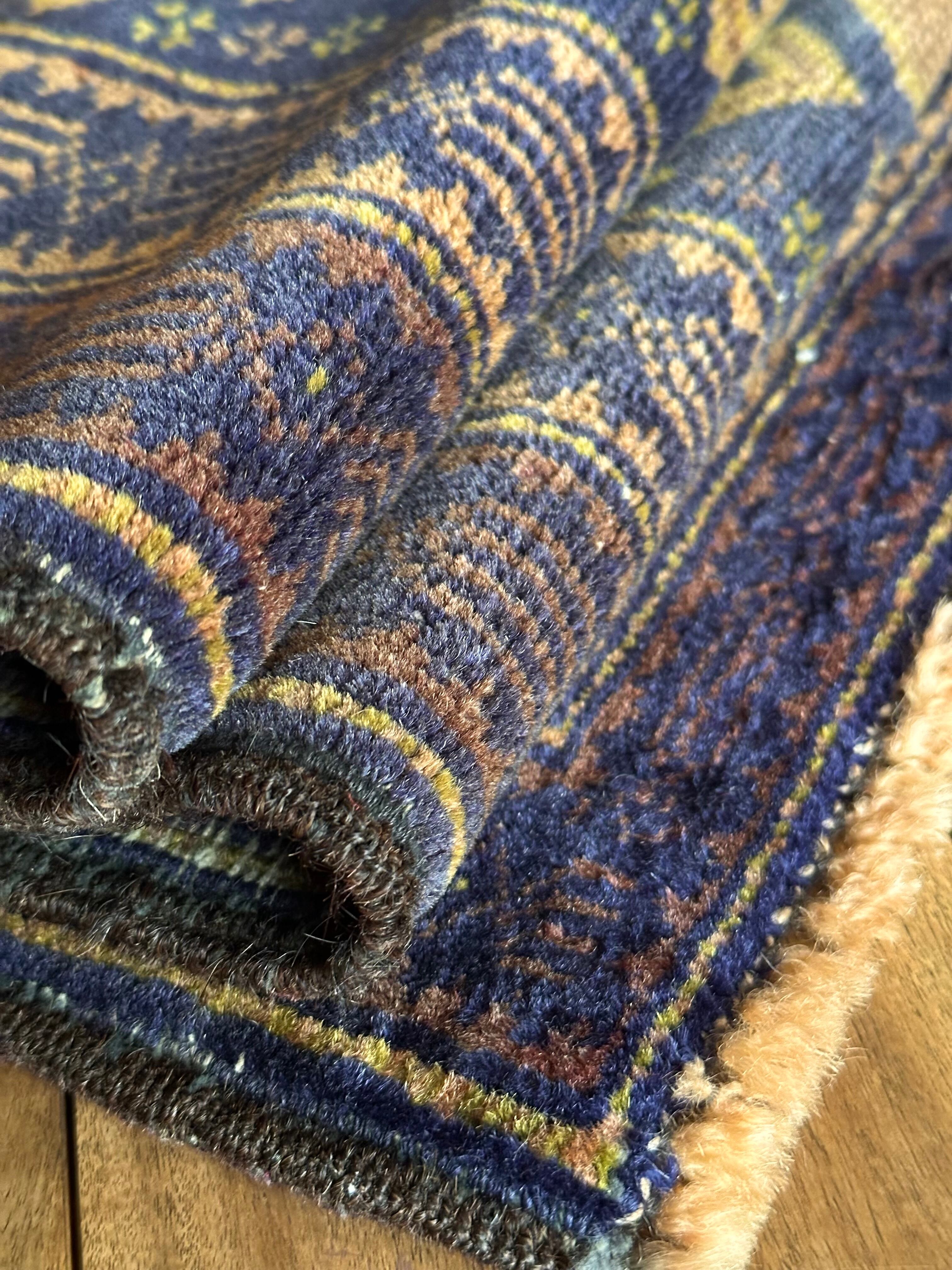 同じくイランのマシュハド産バルーチとは一線を画する泥臭さで、色合いもネイビーをベースにブラウンのコントラストにオリーブグリーンを合わせた洒落た雰囲気の1枚になり、大きさも扱い易いミディアム感がアクセントラグとして重宝しそうです。