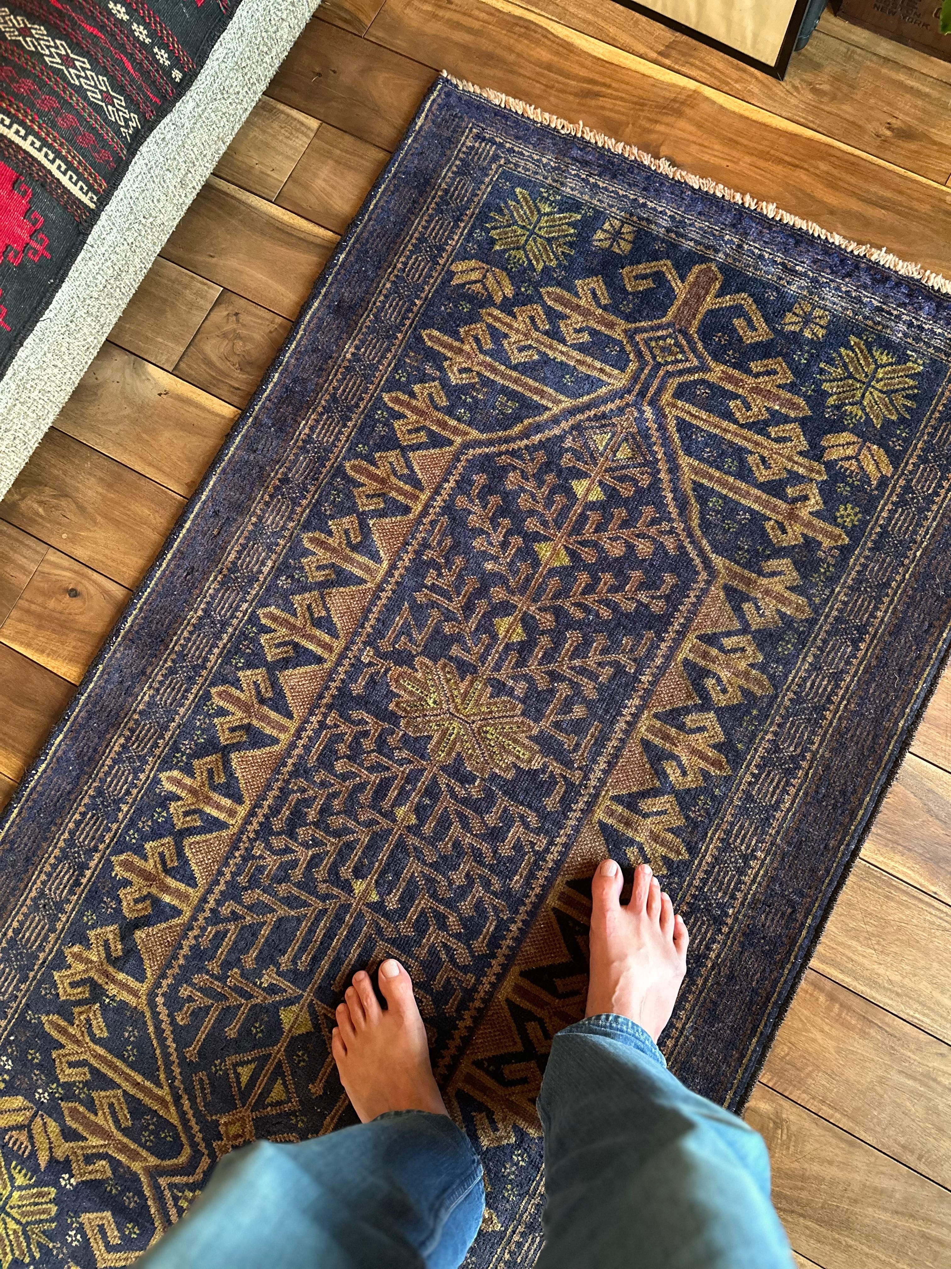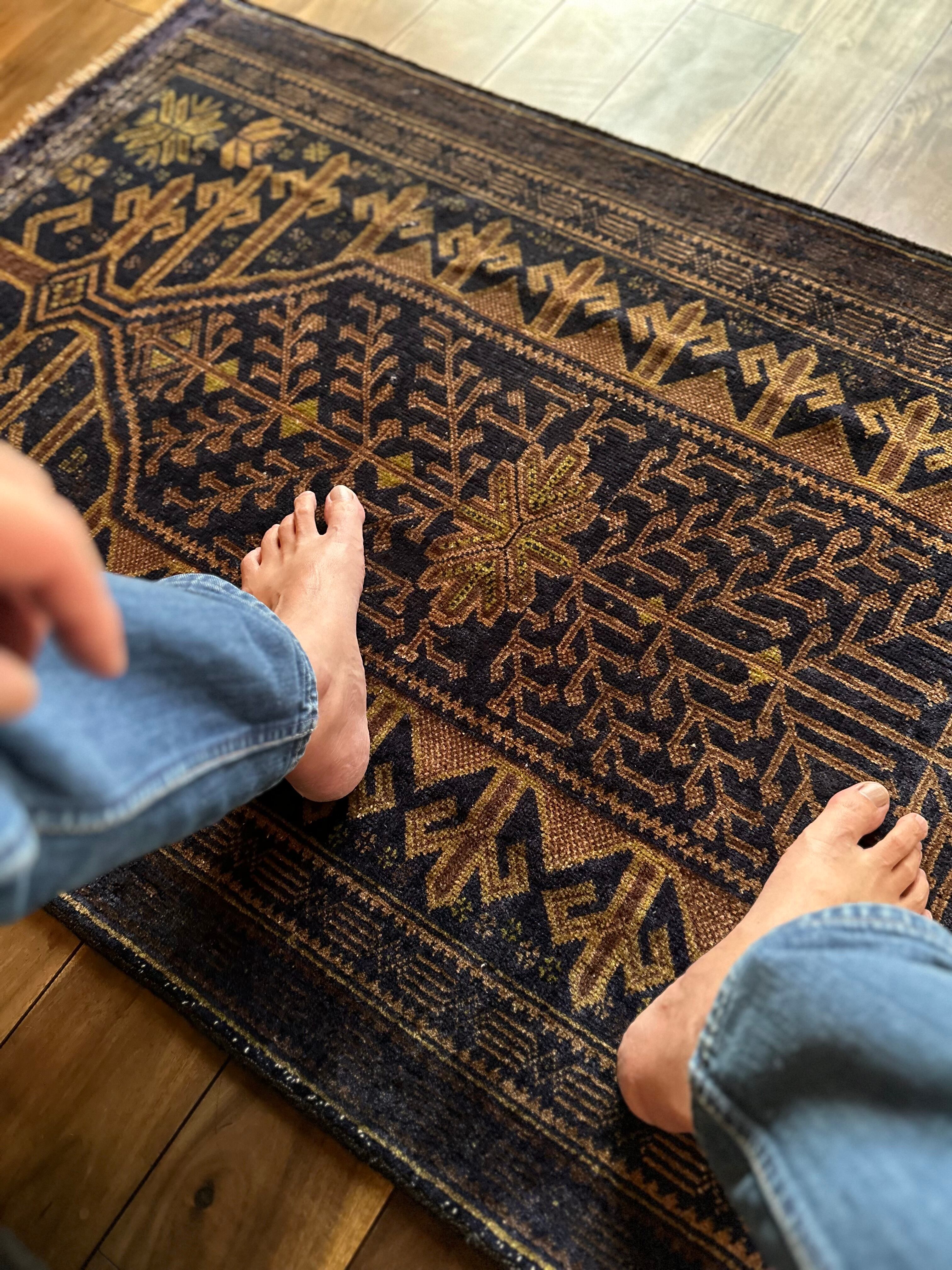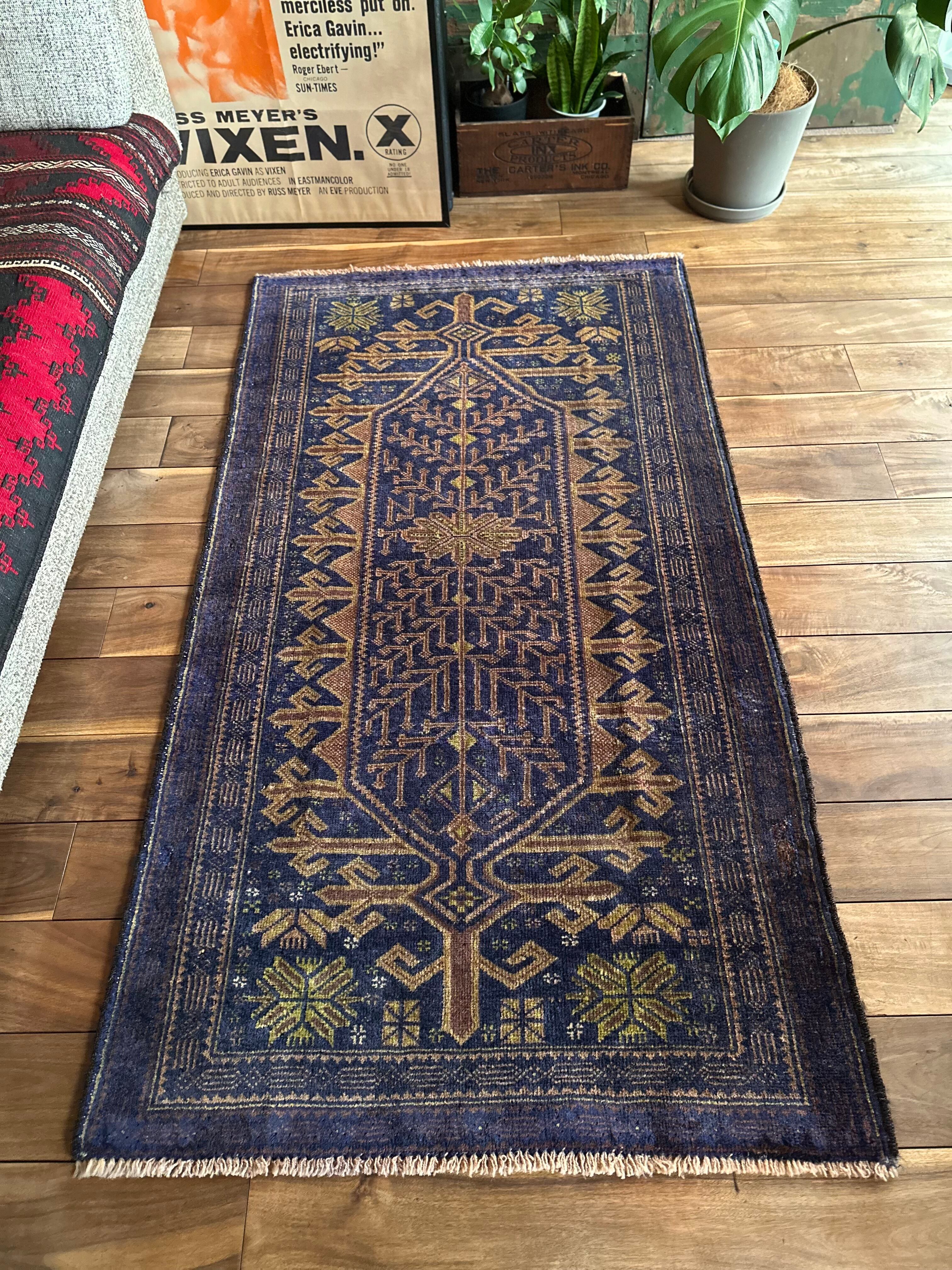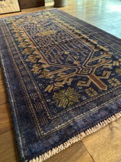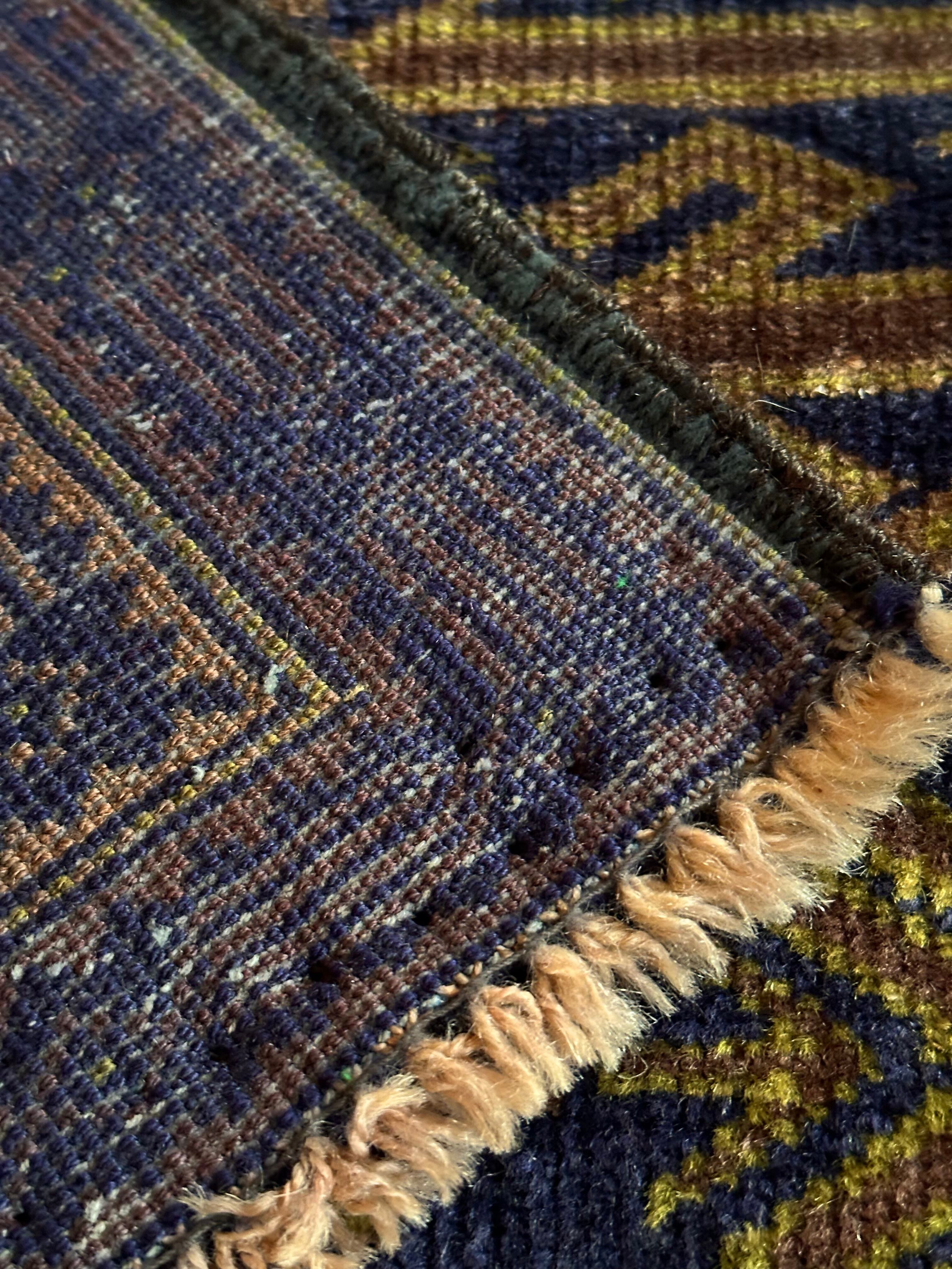 同じくイランのマシュハド産バルーチとは一線を画する泥臭さで、色合いもネイビーをベースにブラウンのコントラストにオリーブグリーンを合わせた洒落た雰囲気の1枚になり、大きさも扱い易いミディアム感がアクセントラグとして重宝しそうです。