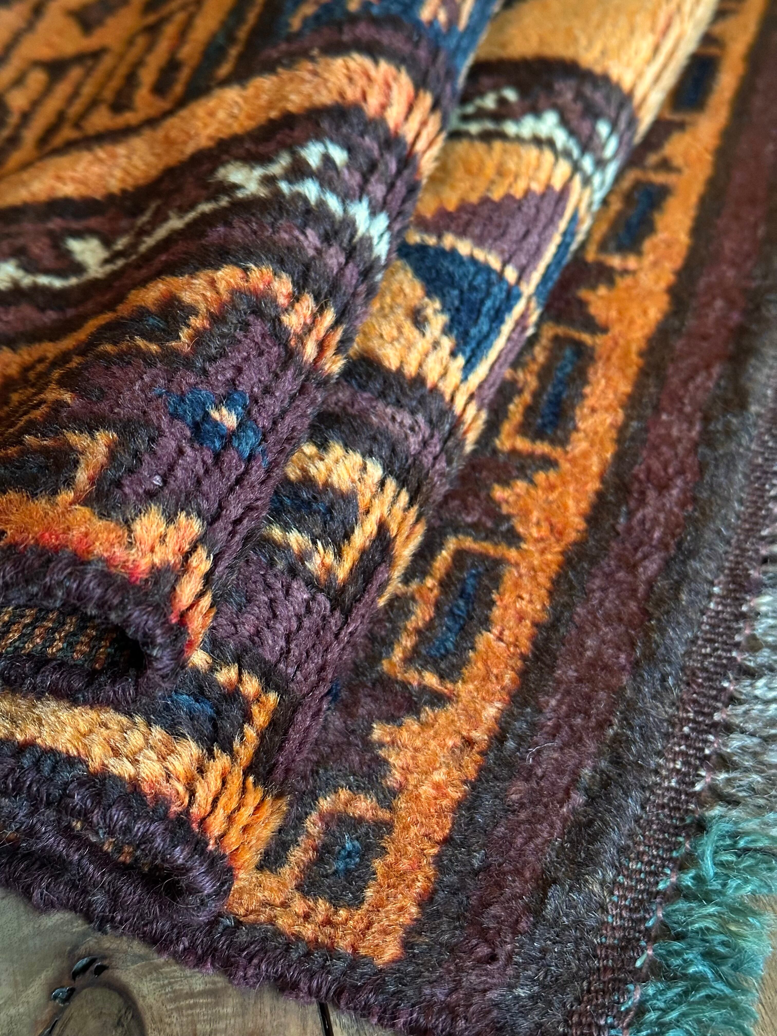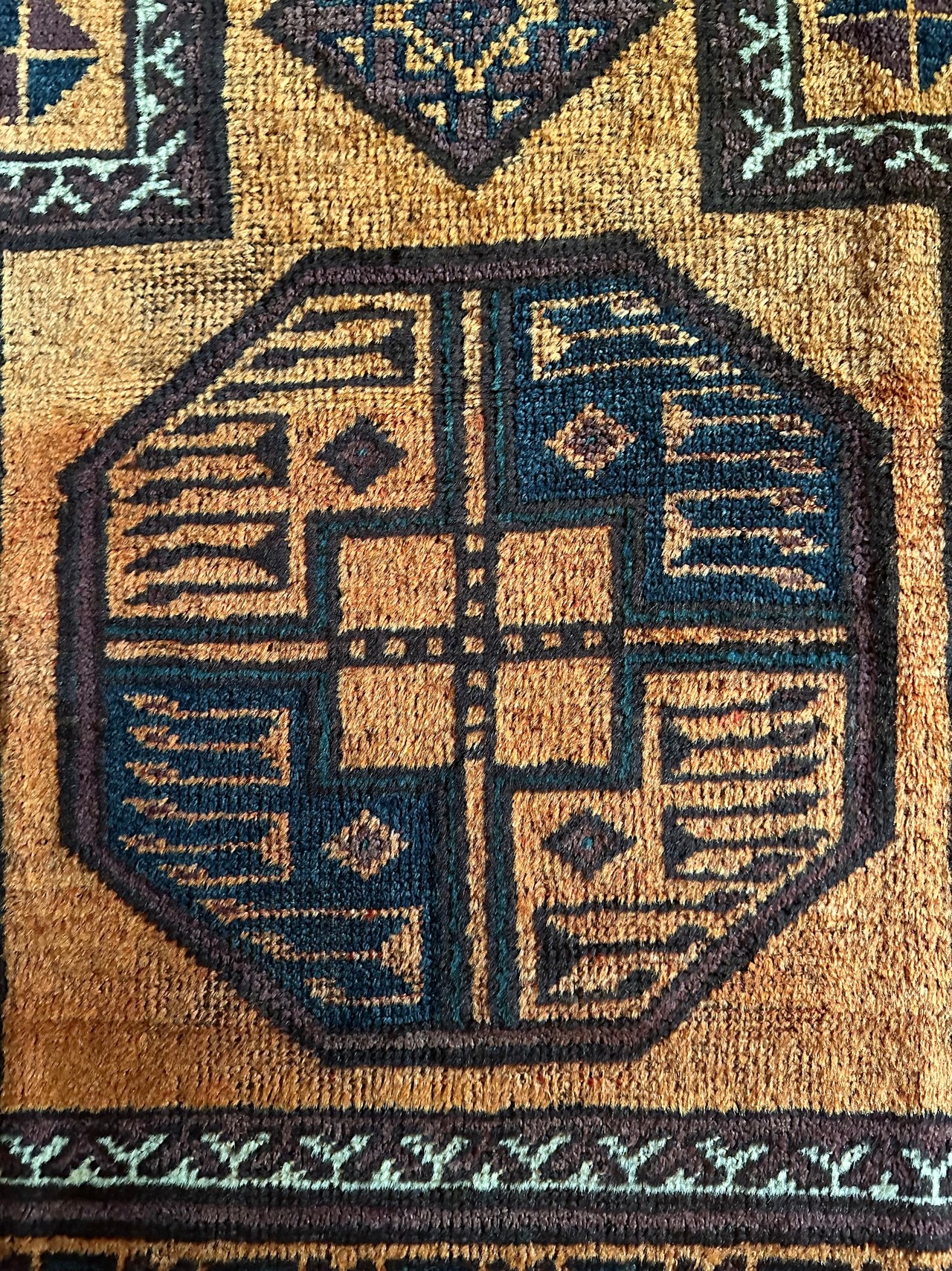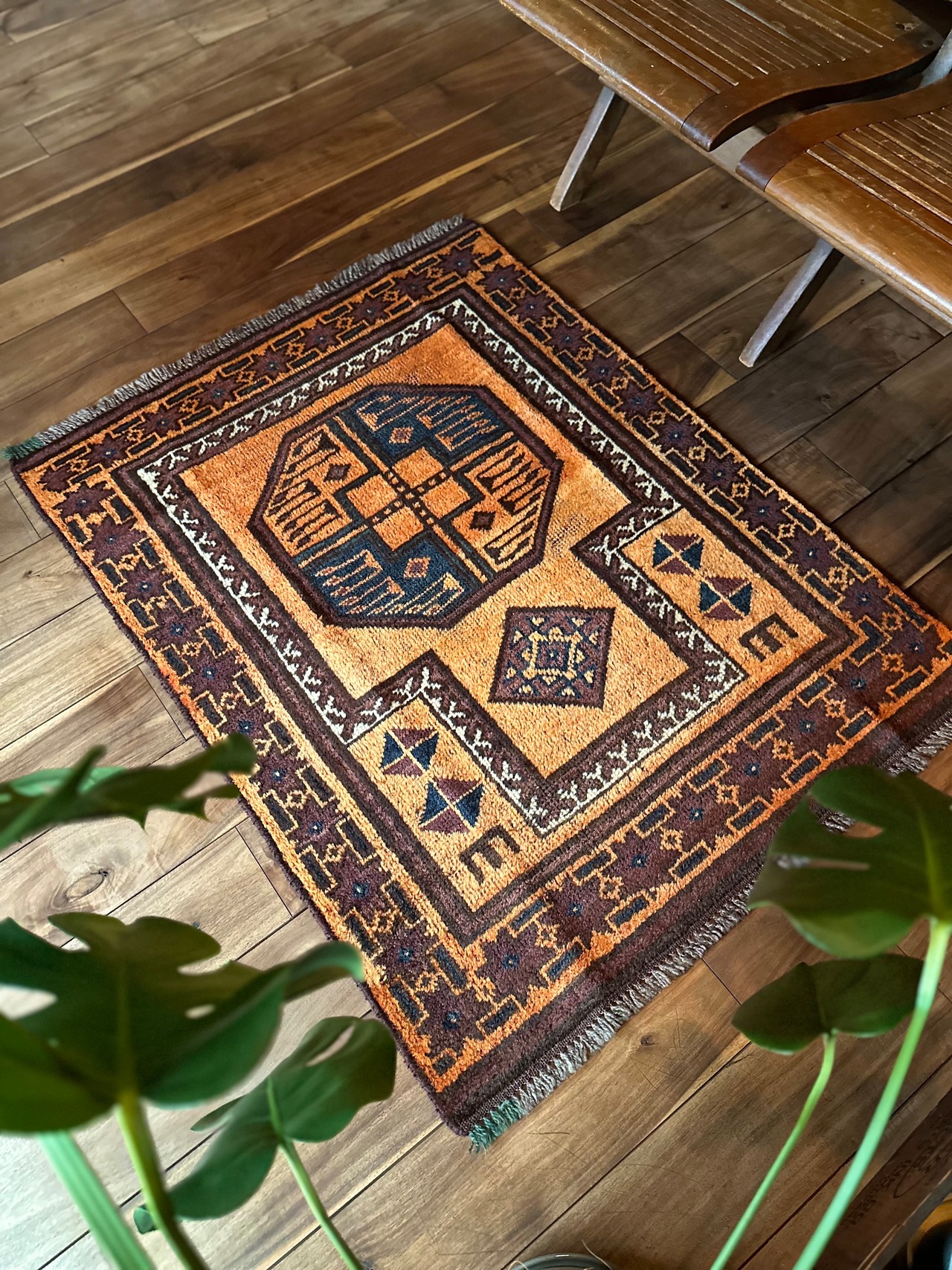 トルクメンらしくないタイマニ族のようなざっくりとした織りに長めの毛足で柔らかな質感の1枚ですが、色合いも他にはない艶やかなオレンジ・ゴールドといった感じで、大きなスレイマンギュルにアブラッシュでムラの出た色合いがかっこいいでしょうか。