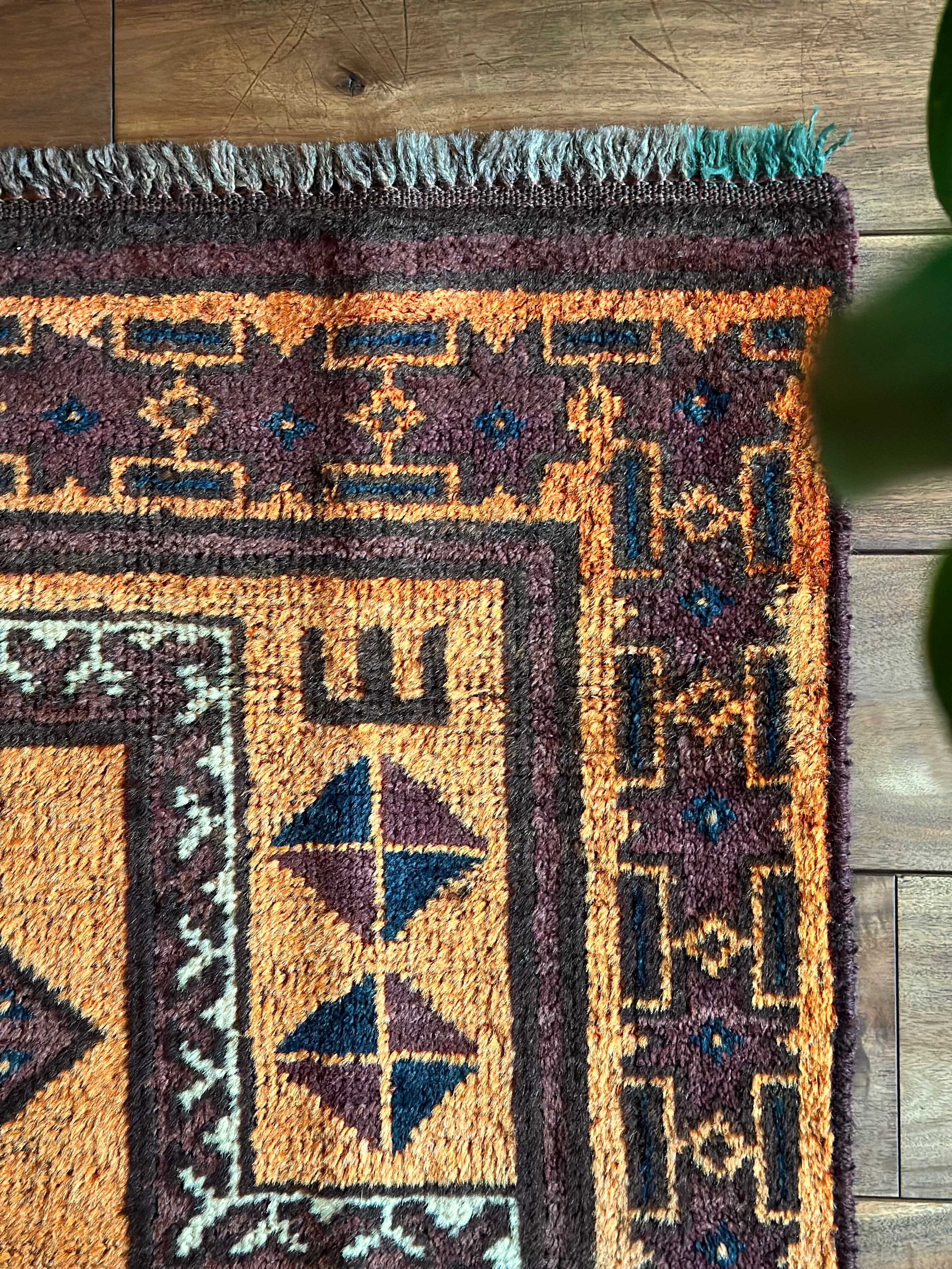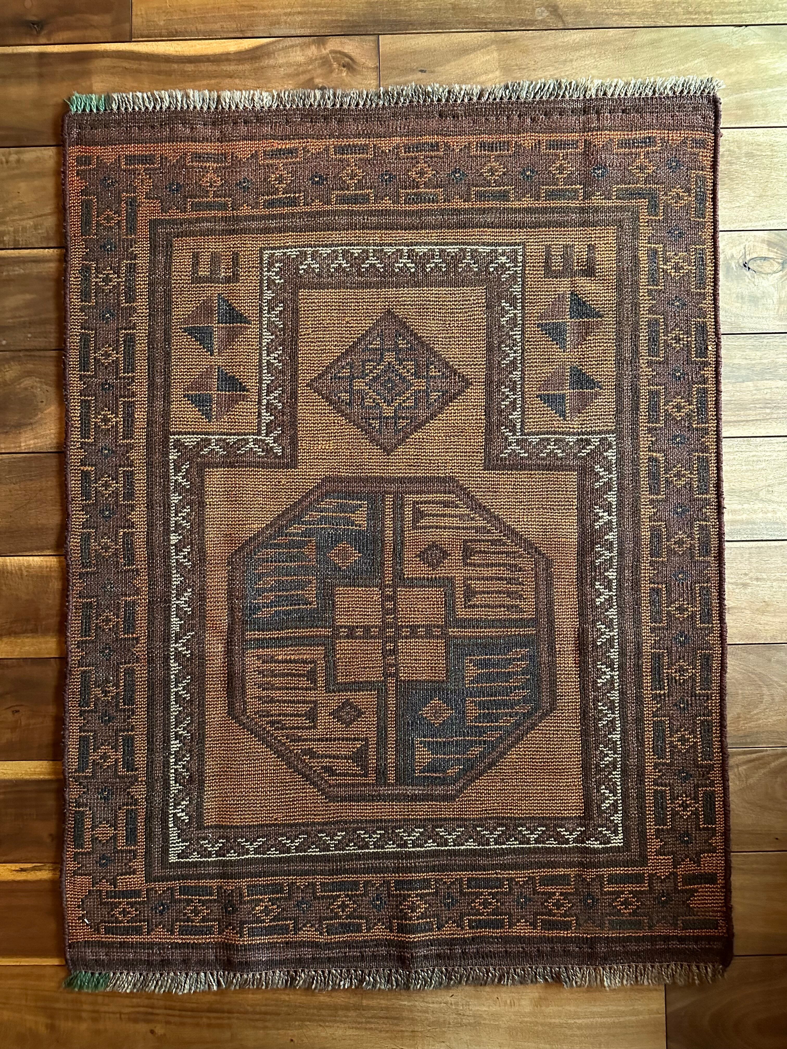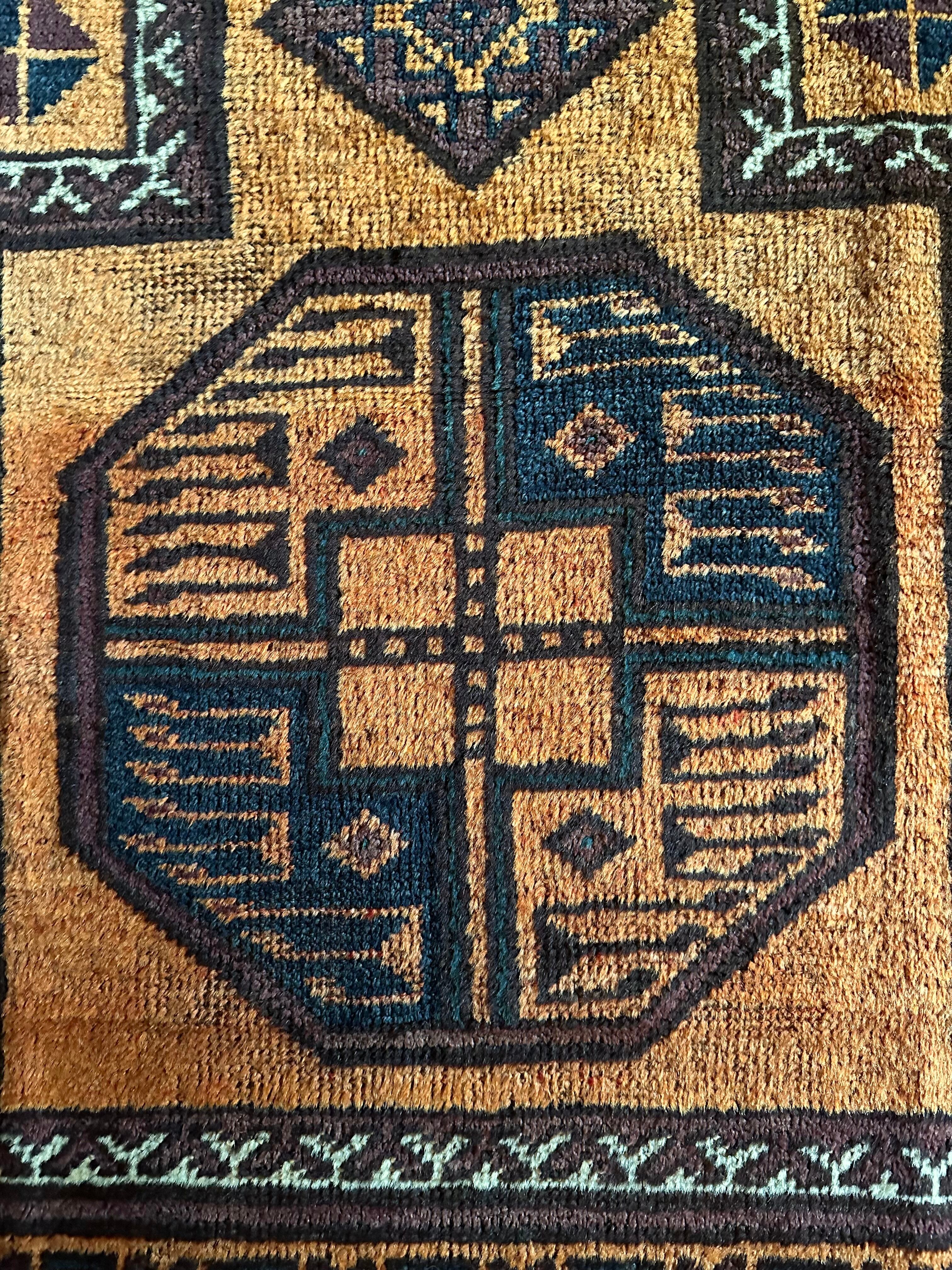 仕入れの段階からパッと見た目に飛び込んだ荒々しい織りに、インパクトのある象の足跡と言われるフィルパイ柄が印象的な、アフガニスタン北部に居住するトルクメンの支族であるエルサリ族の小振りなプレイヤーラグになります。