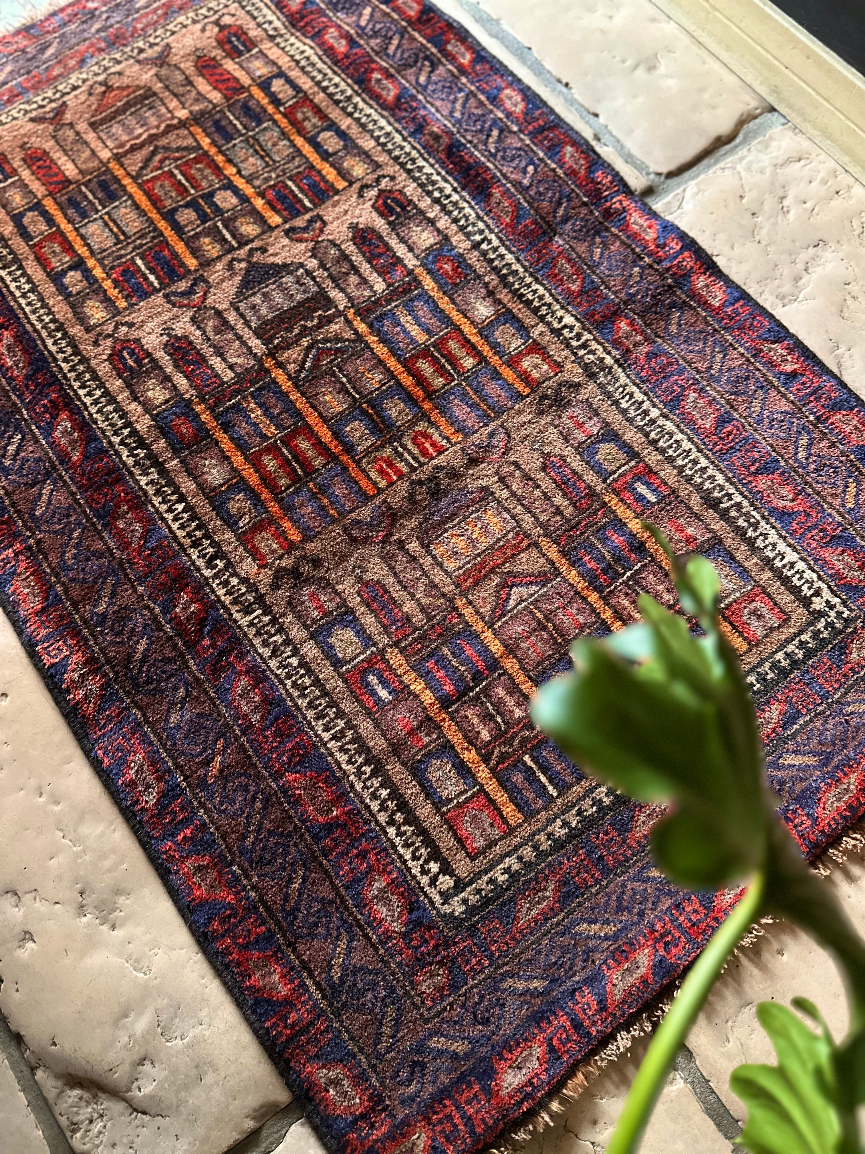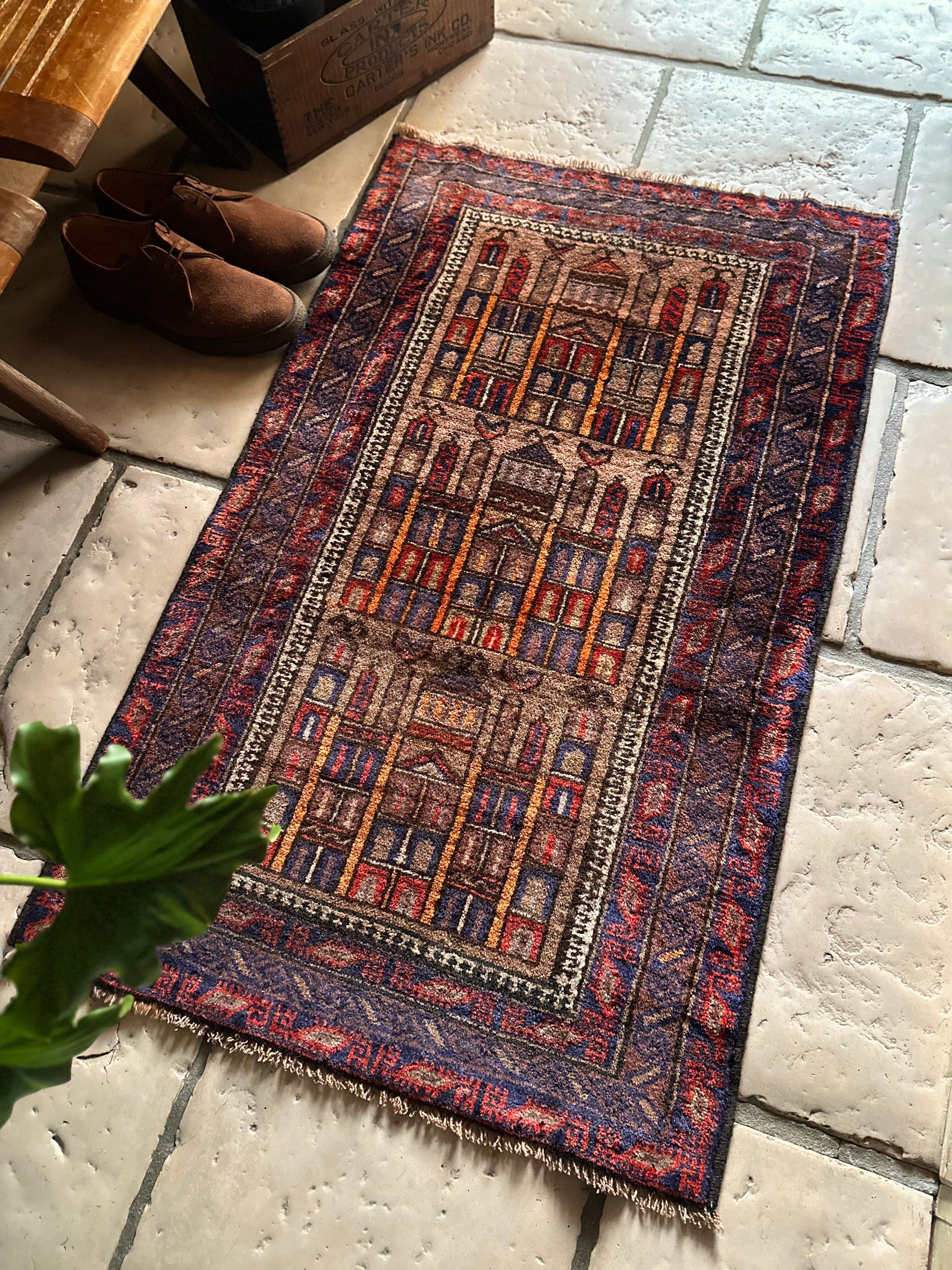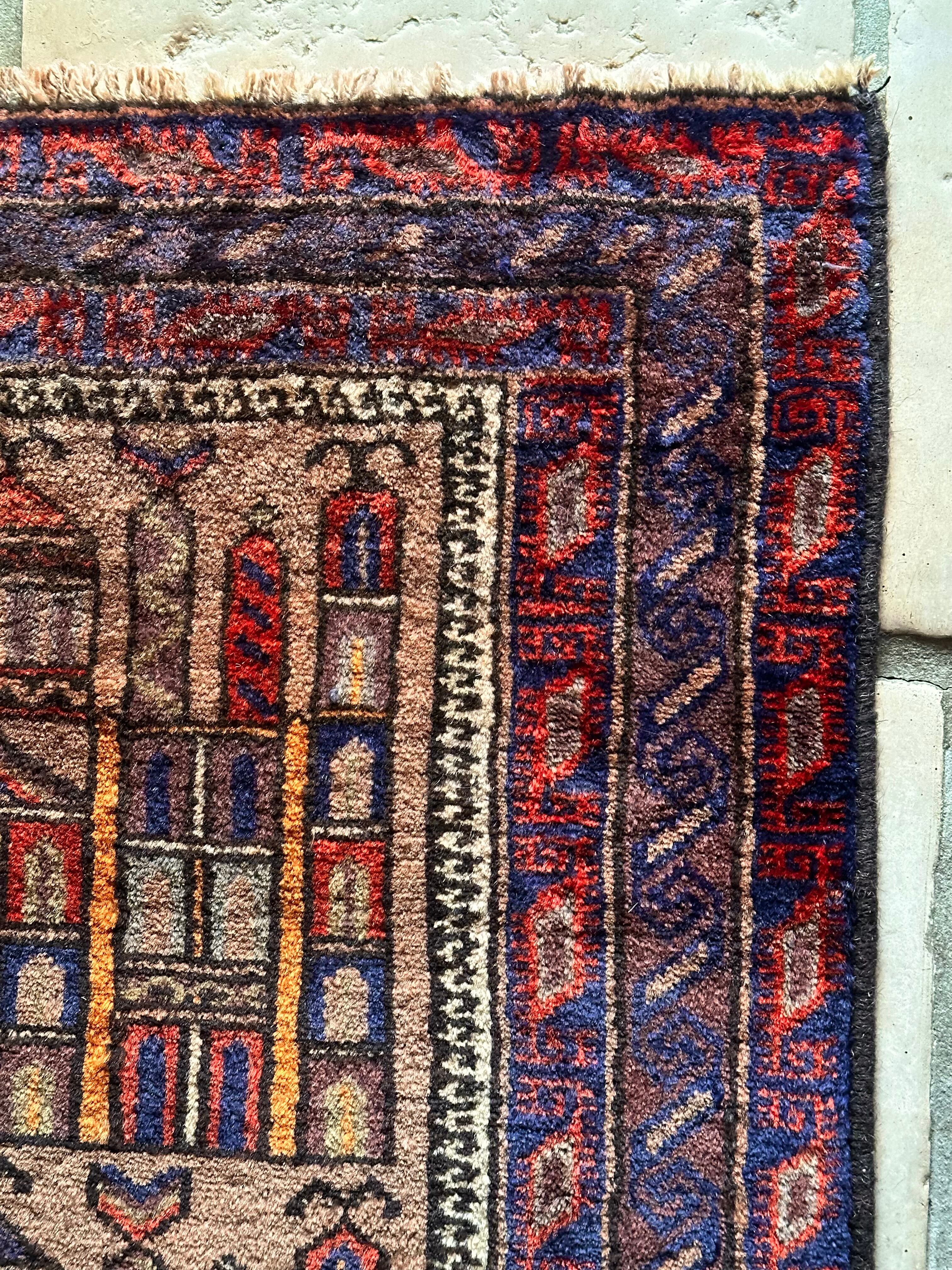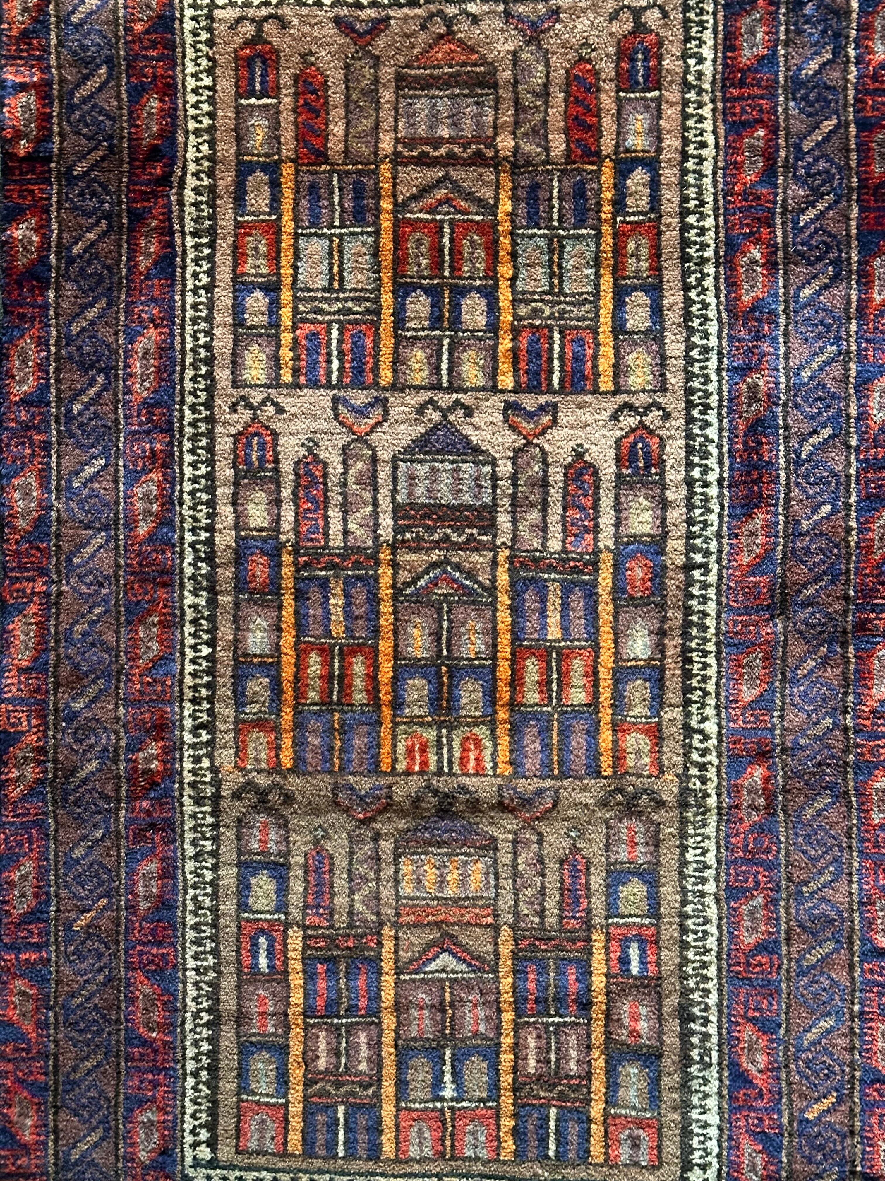 三層に連なったモスクの様な背景画がカラフルな印象の祈祷用プレイヤーラグで、ボーダー部分にバルーチ族らしいチェーンの連続紋様が描かれたトライバルラグになります。