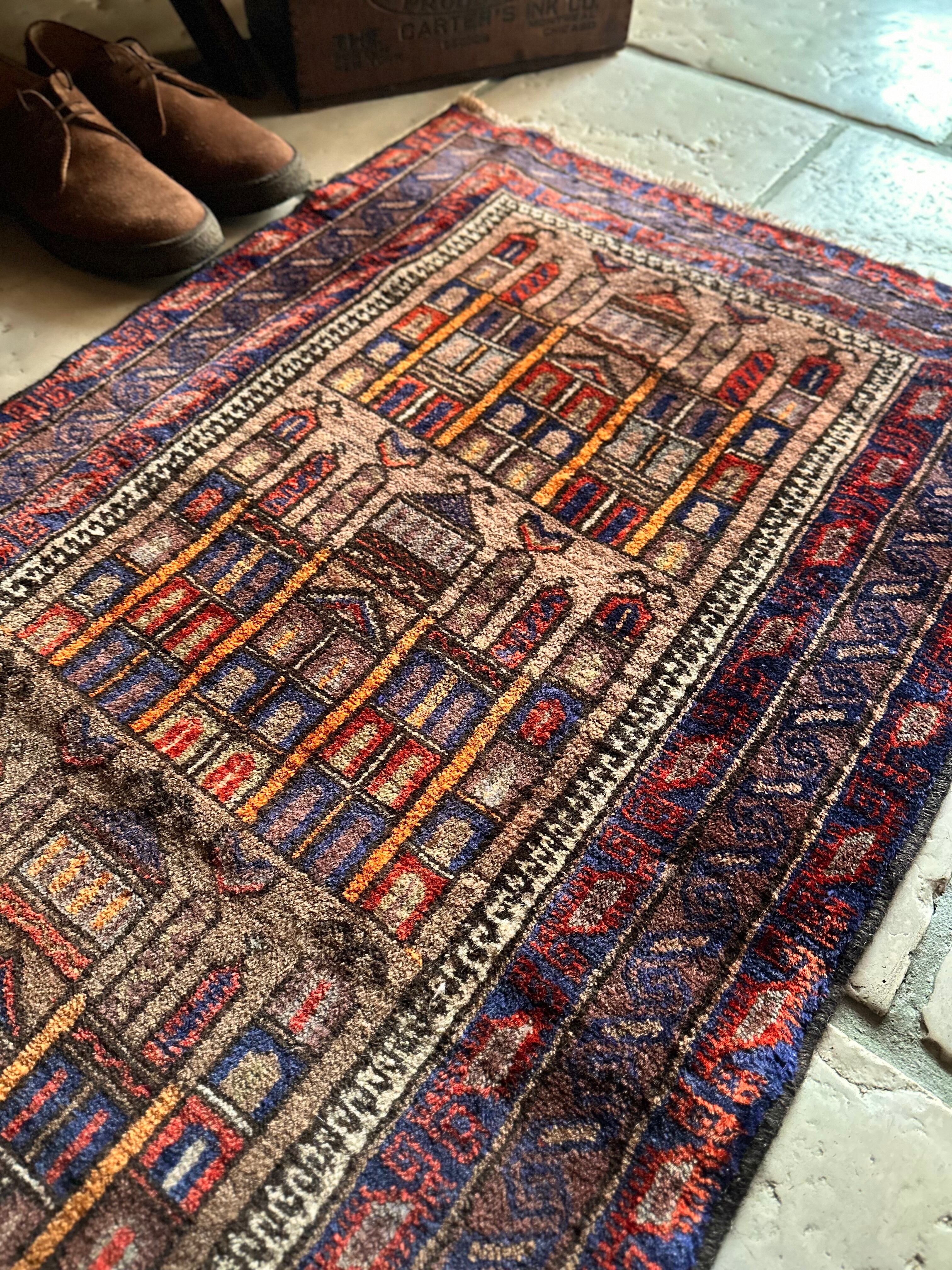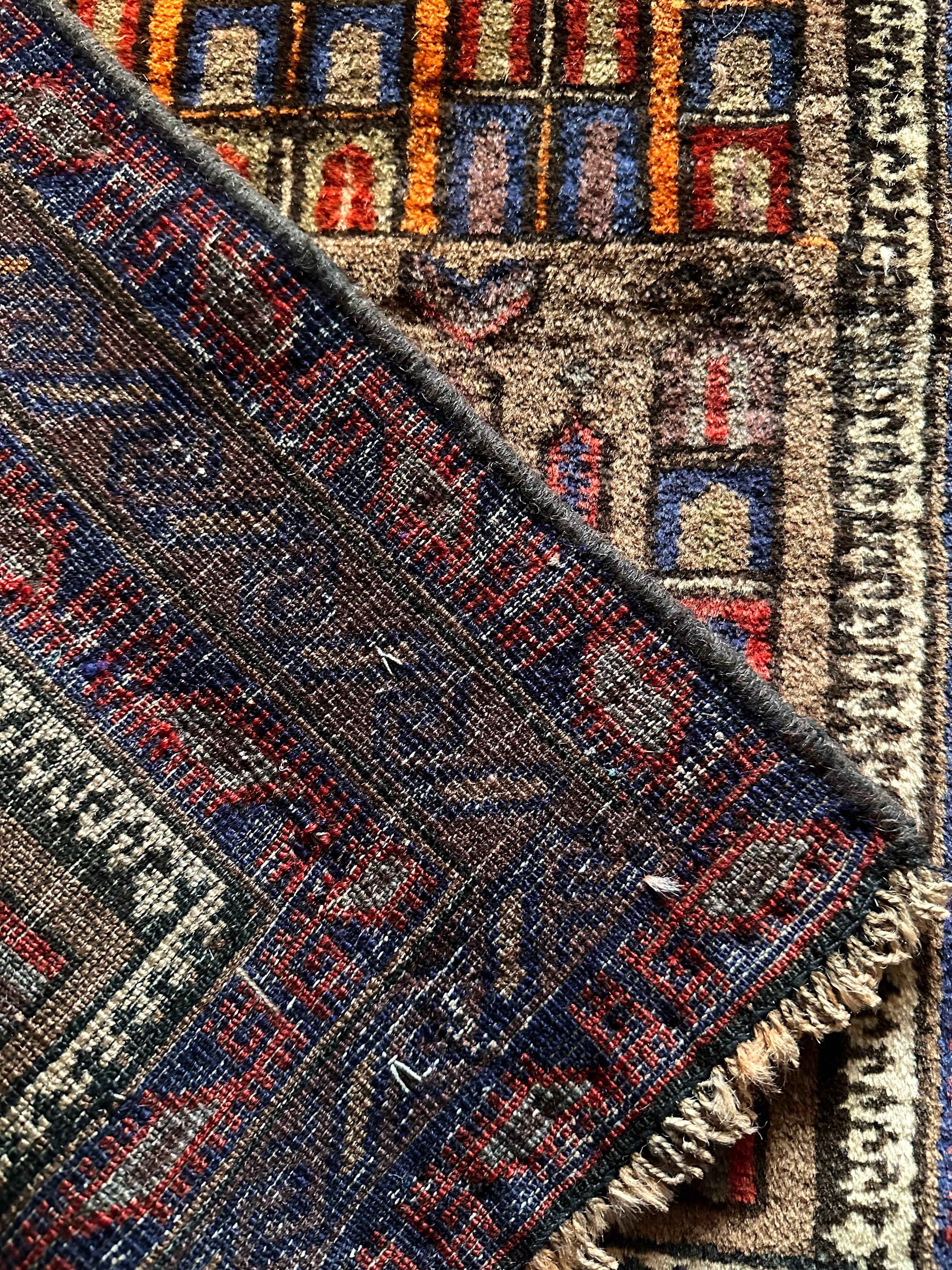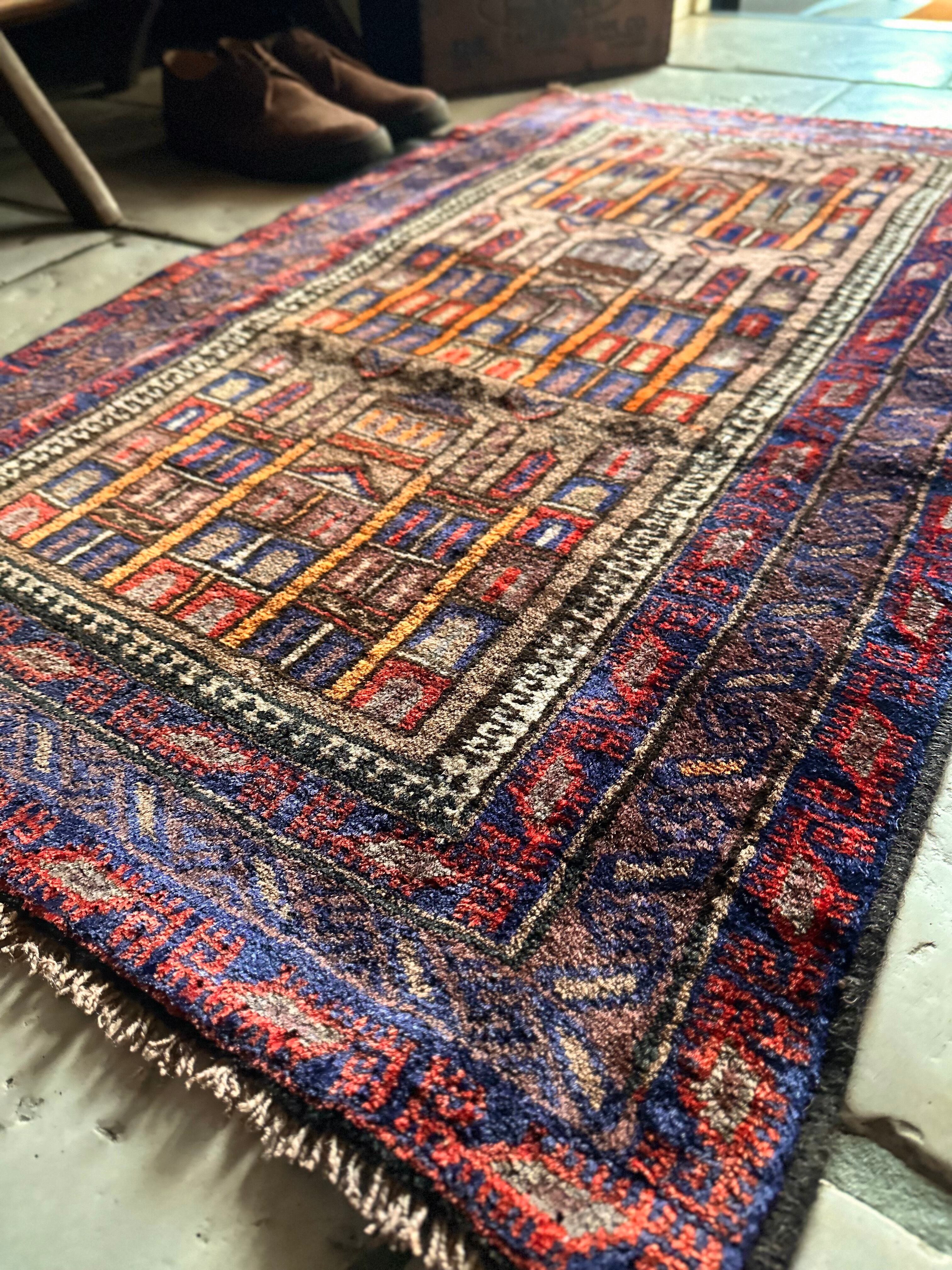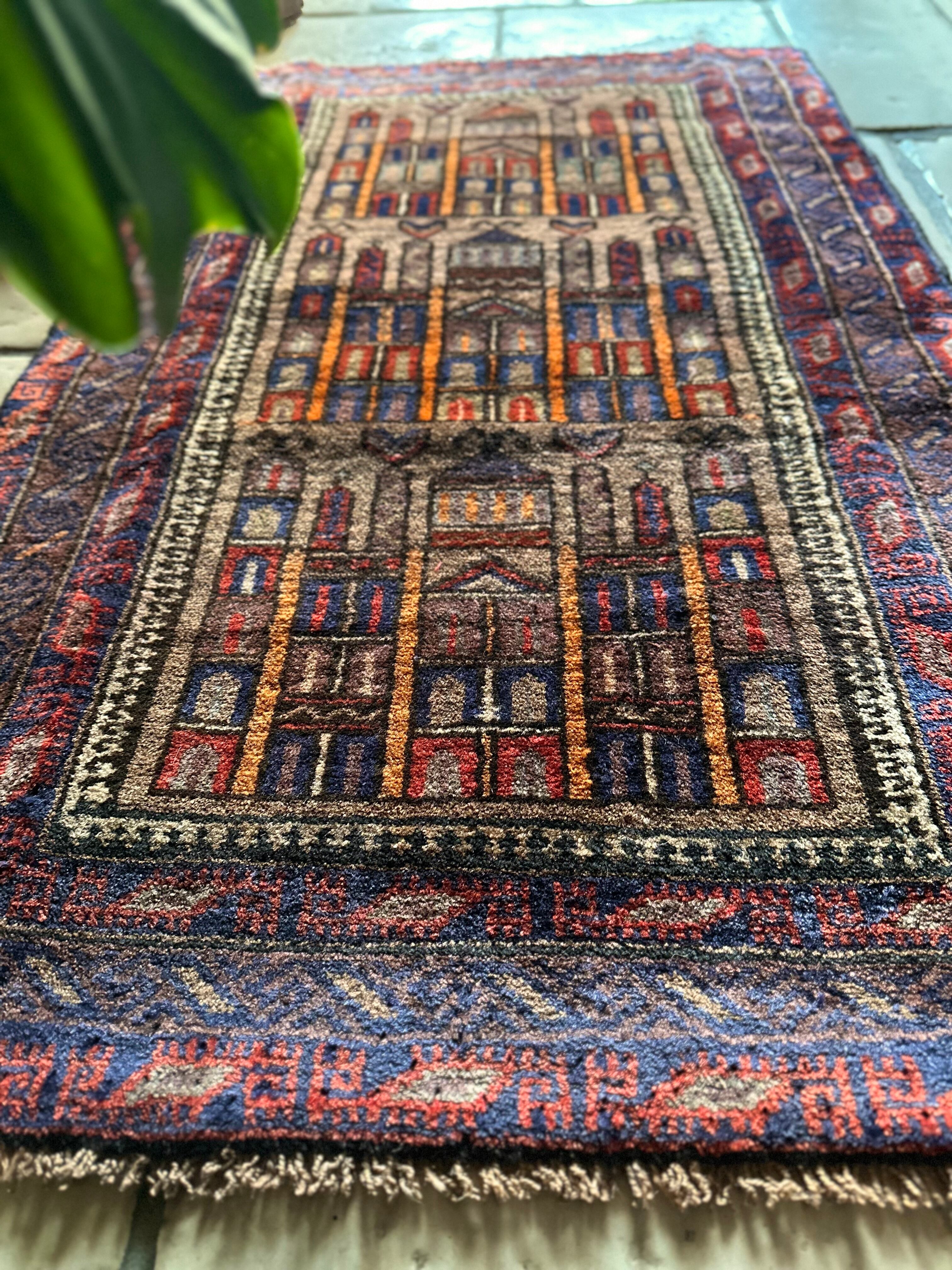 三層に連なったモスクの様な背景画がカラフルな印象の祈祷用プレイヤーラグで、ボーダー部分にバルーチ族らしいチェーンの連続紋様が描かれたトライバルラグになります。