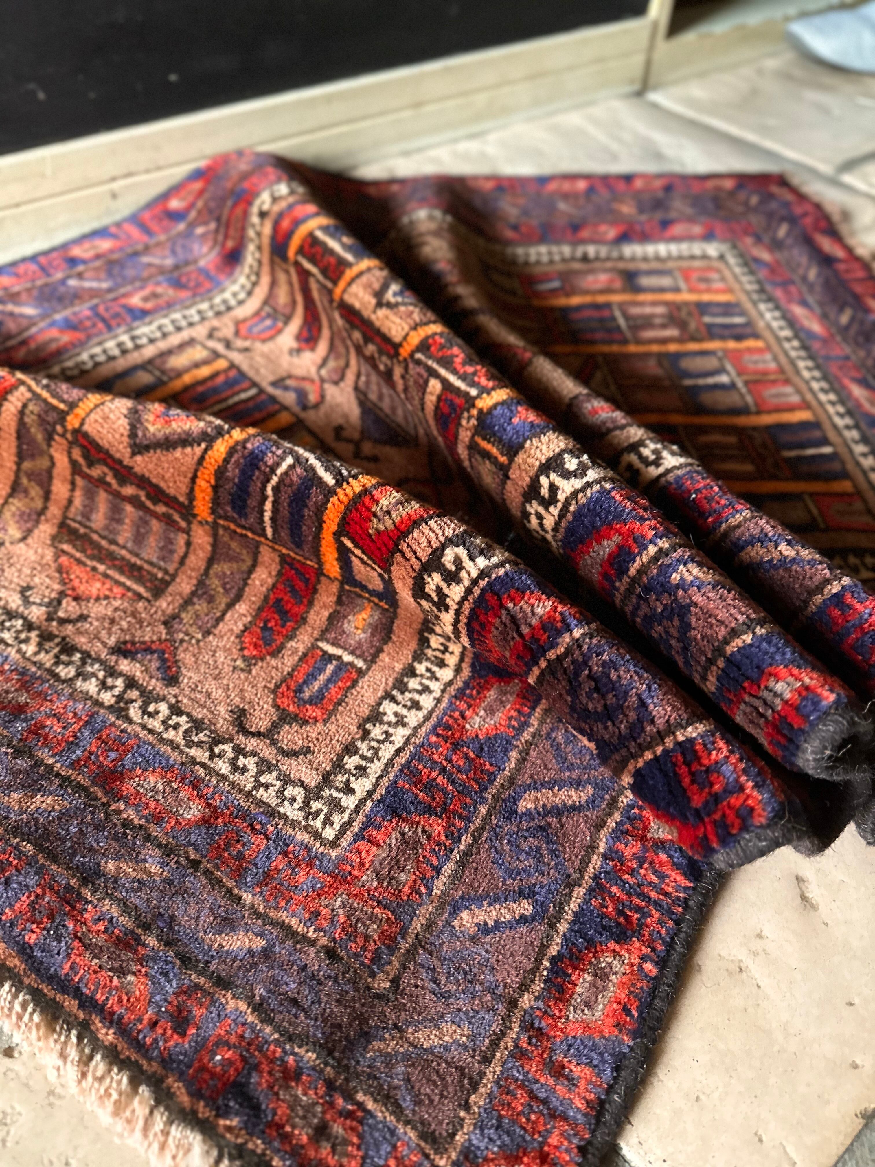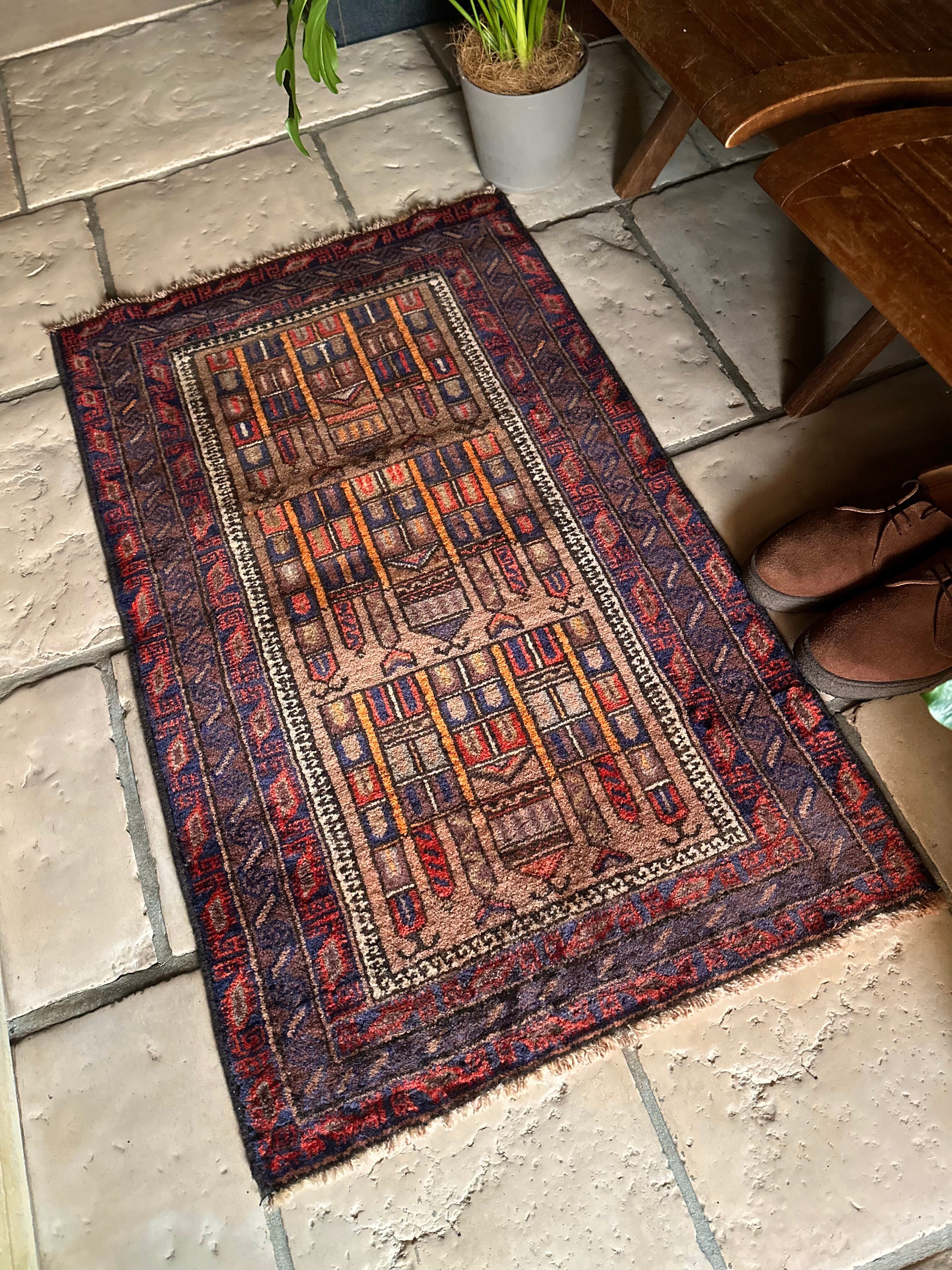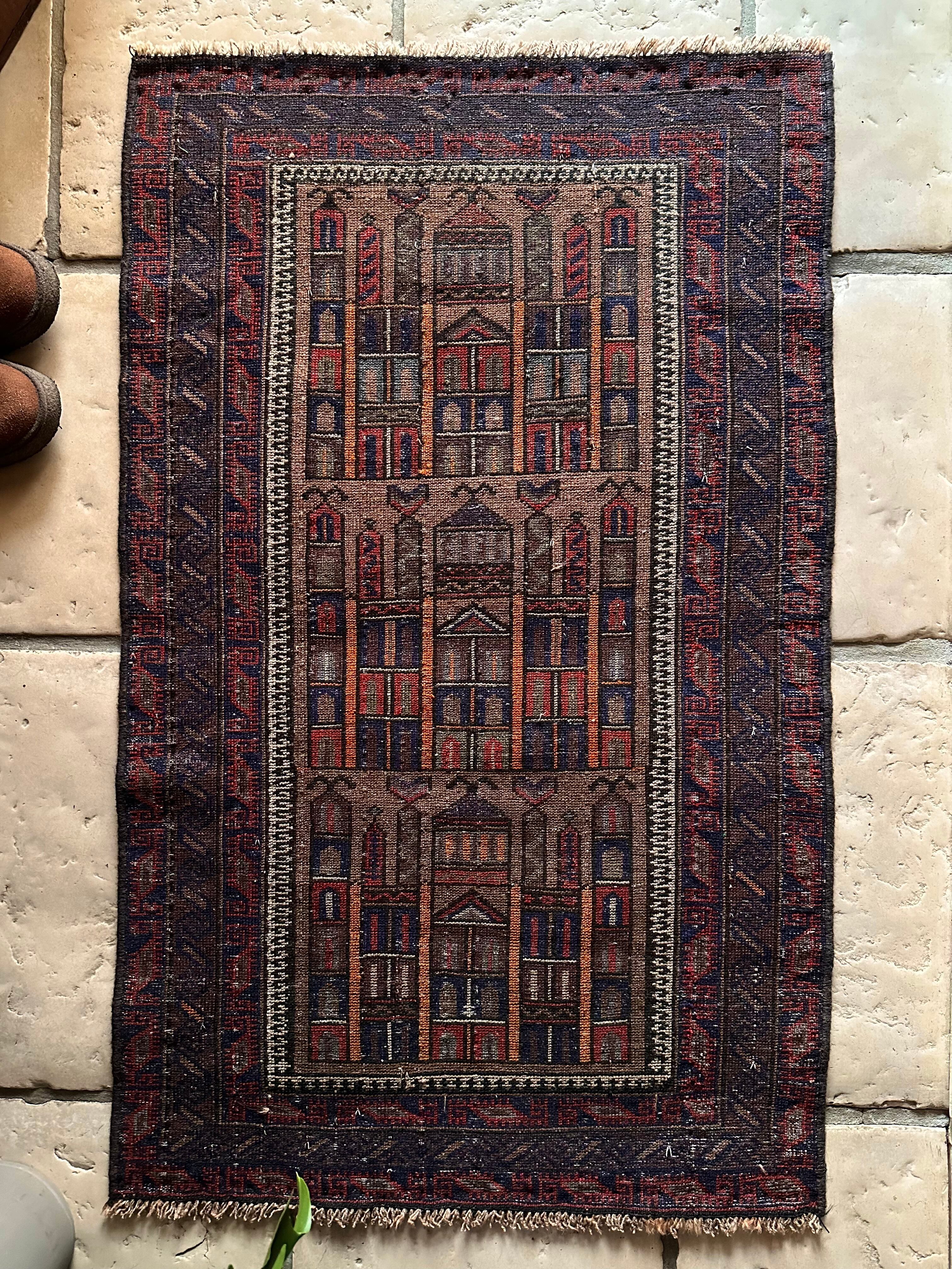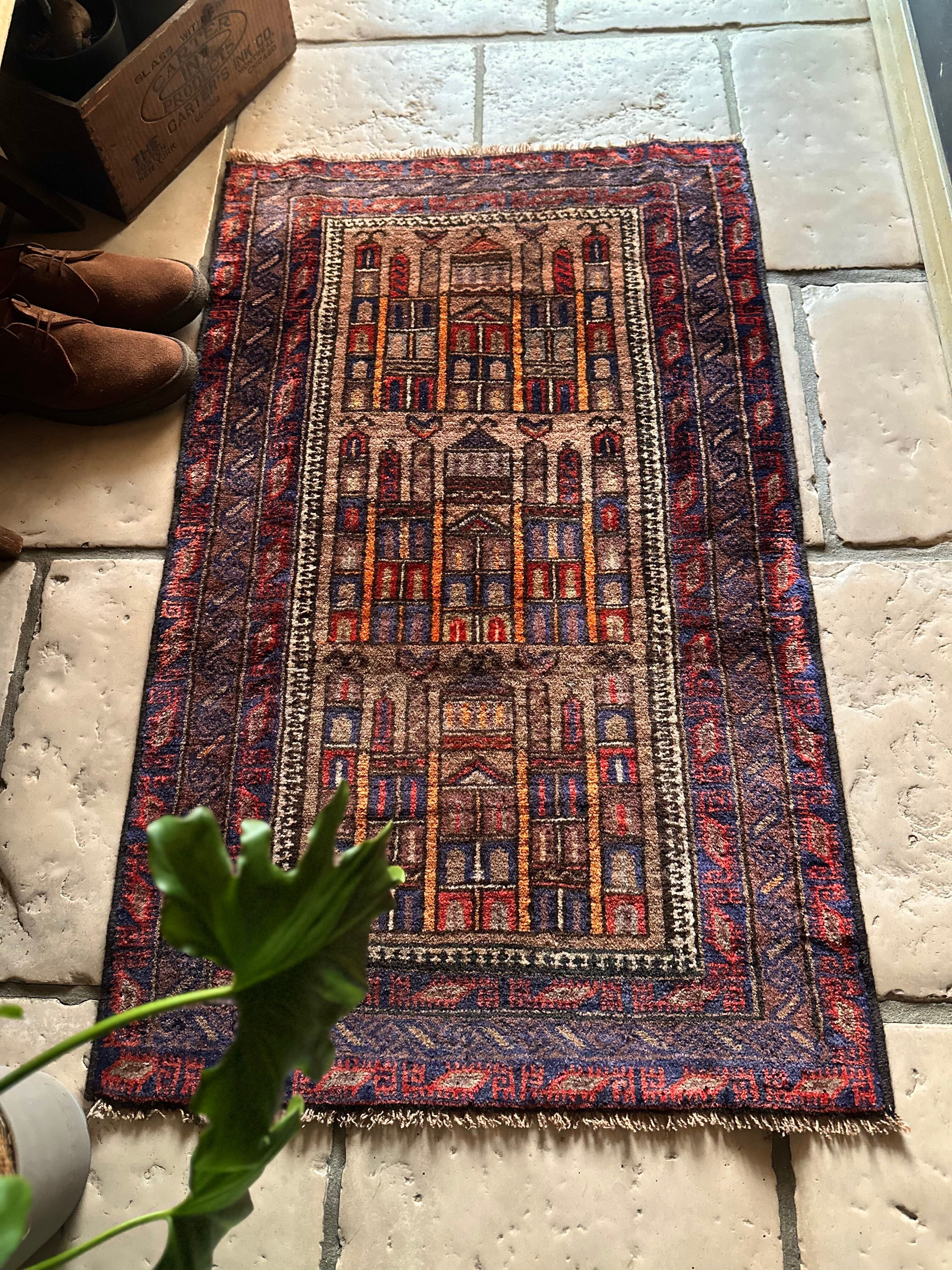 三層に連なったモスクの様な背景画がカラフルな印象の祈祷用プレイヤーラグで、ボーダー部分にバルーチ族らしいチェーンの連続紋様が描かれたトライバルラグになります。