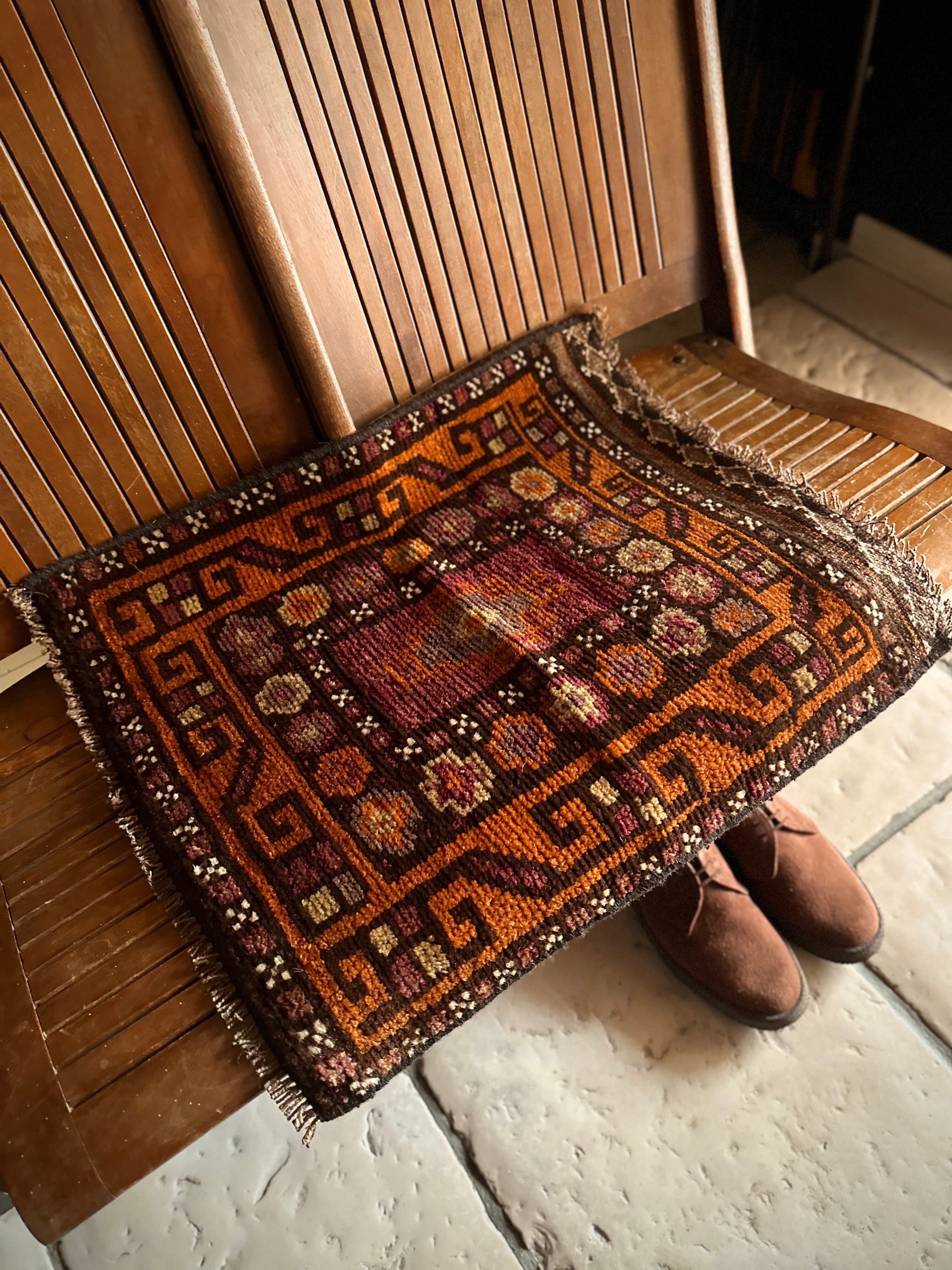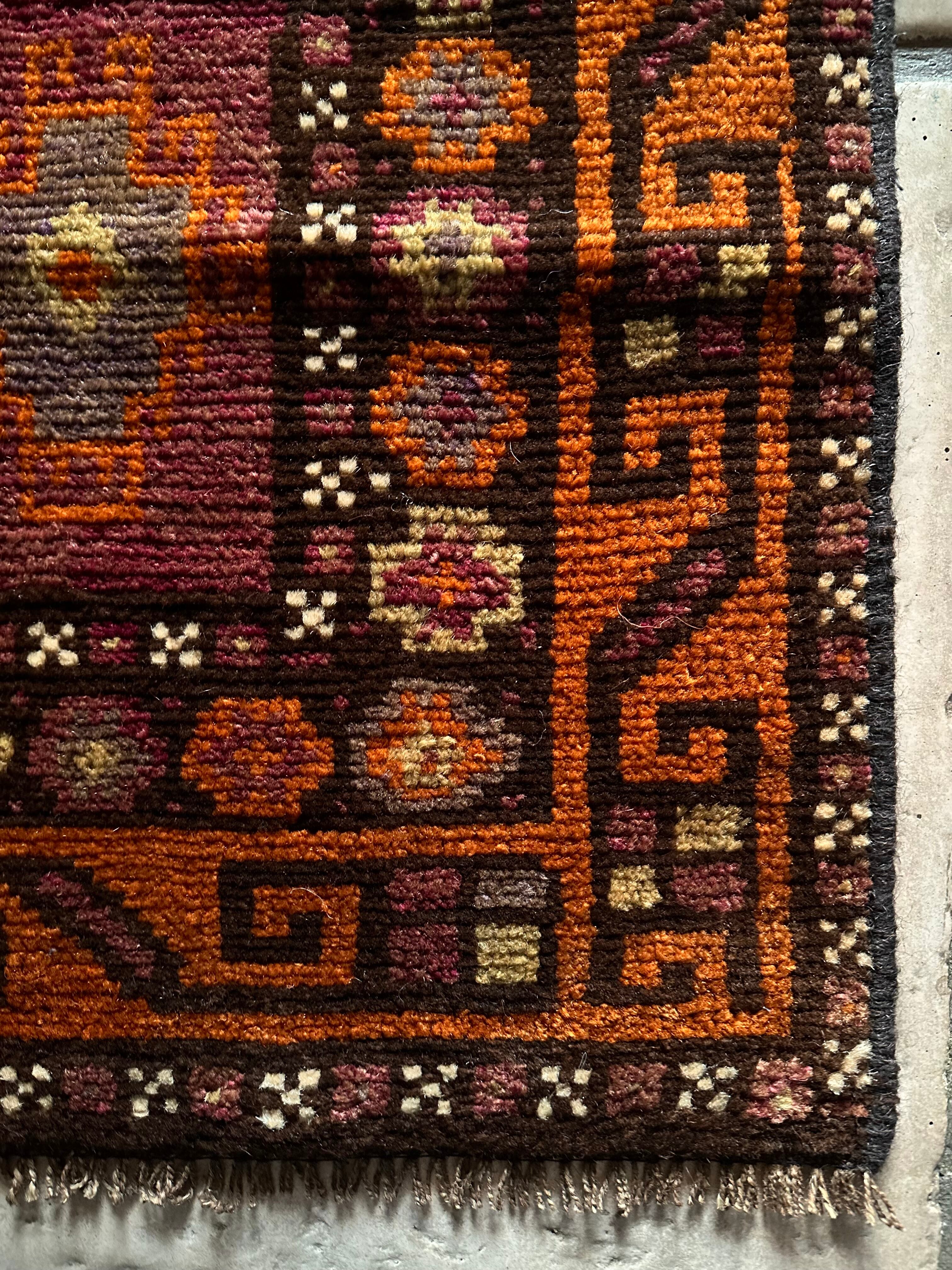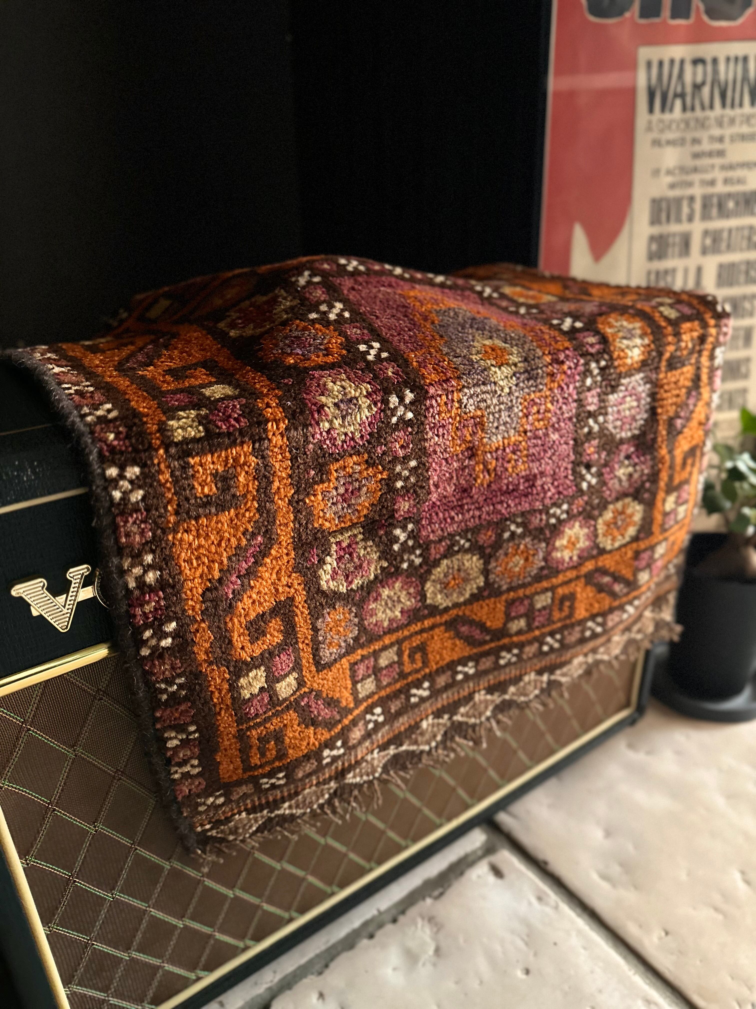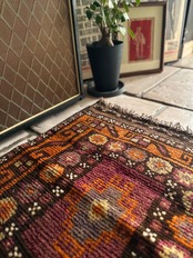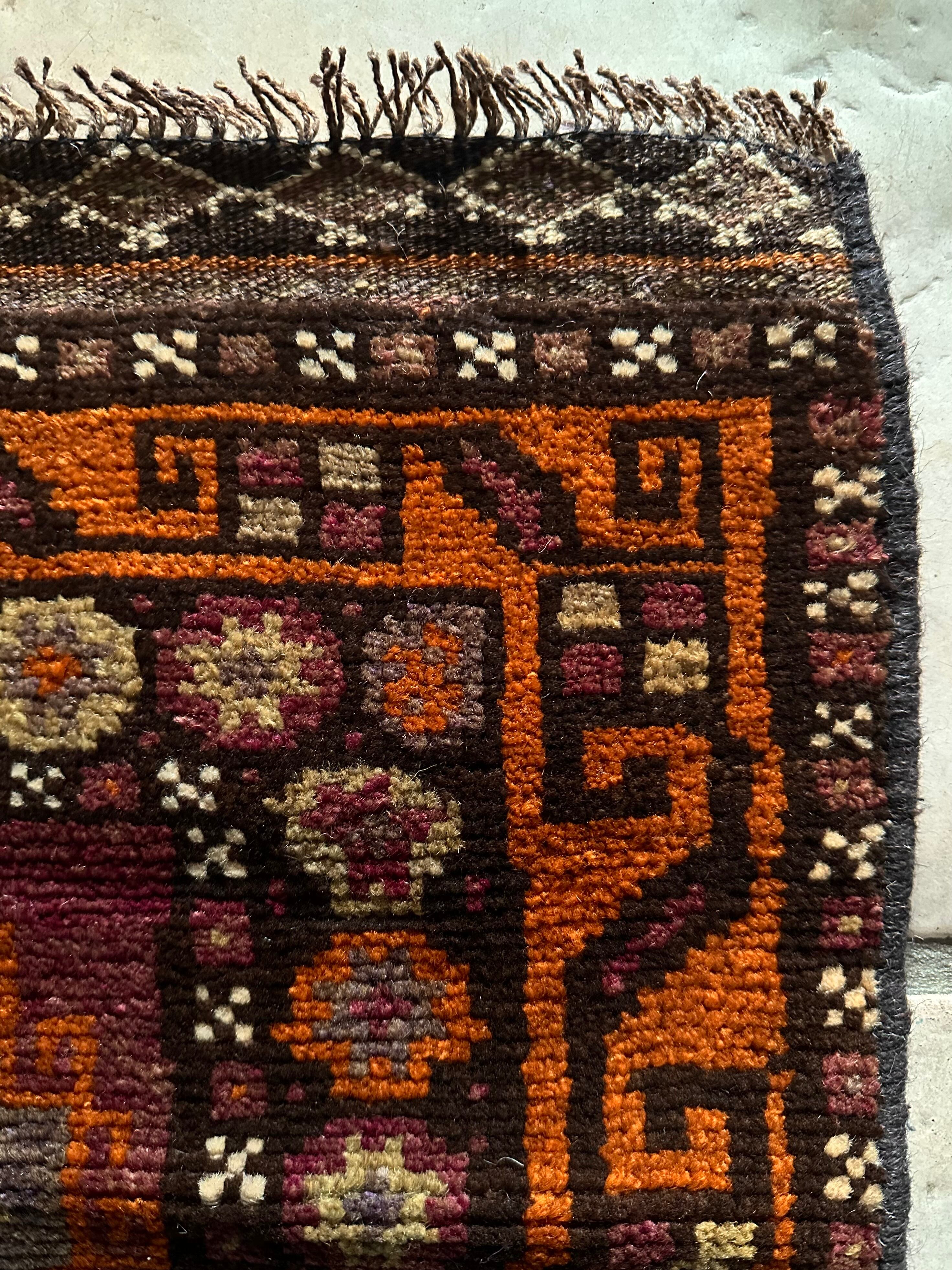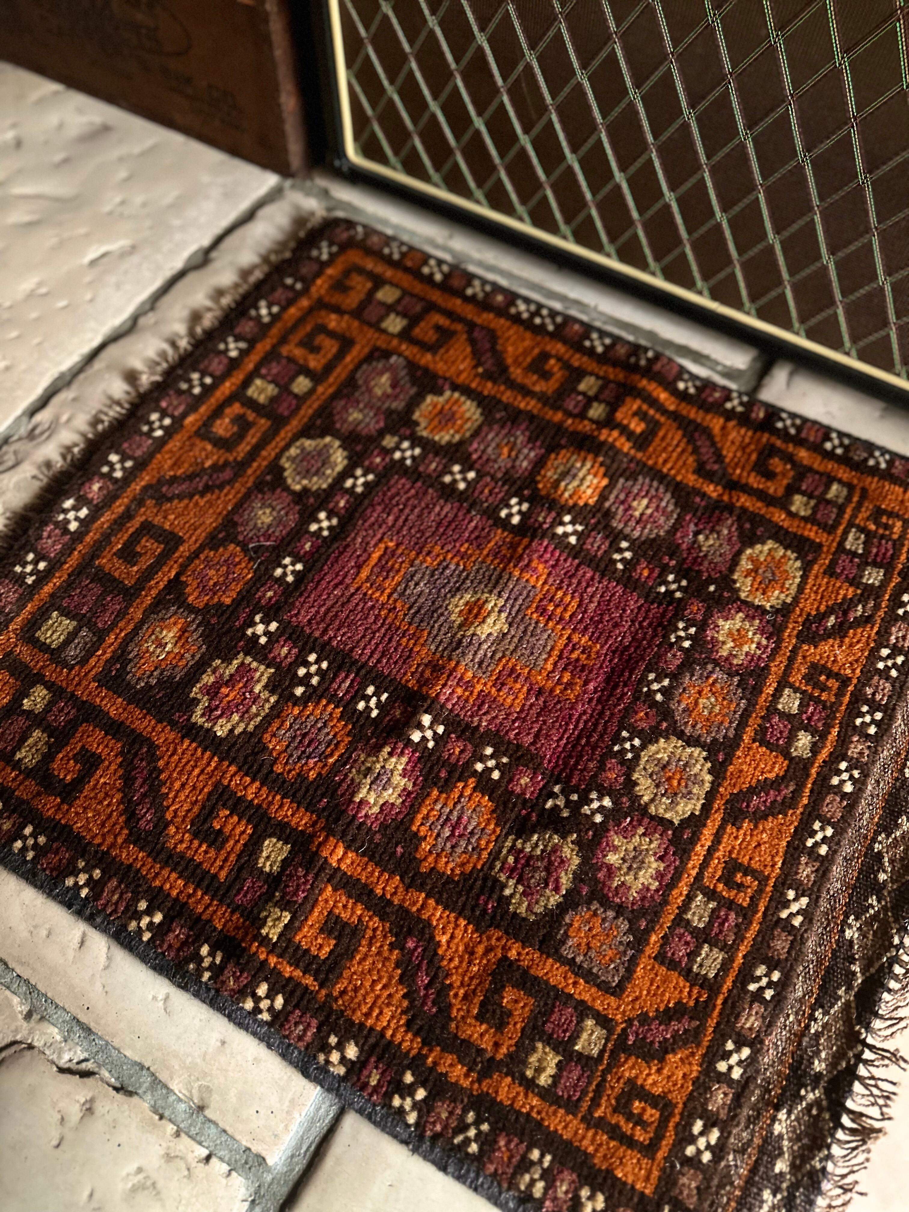 落ち着いた雰囲気のオレンジブラウンをベースカラーに、ぐるりと囲んだ幸運をもたらす八芒星がバルーチらしいトライバルラグで、元々はホルジンと呼ばれるラクダやロバの背に跨がせるサドルバッグや、トルパと言った袋物の表皮をラグに仕立て直したモノになります。