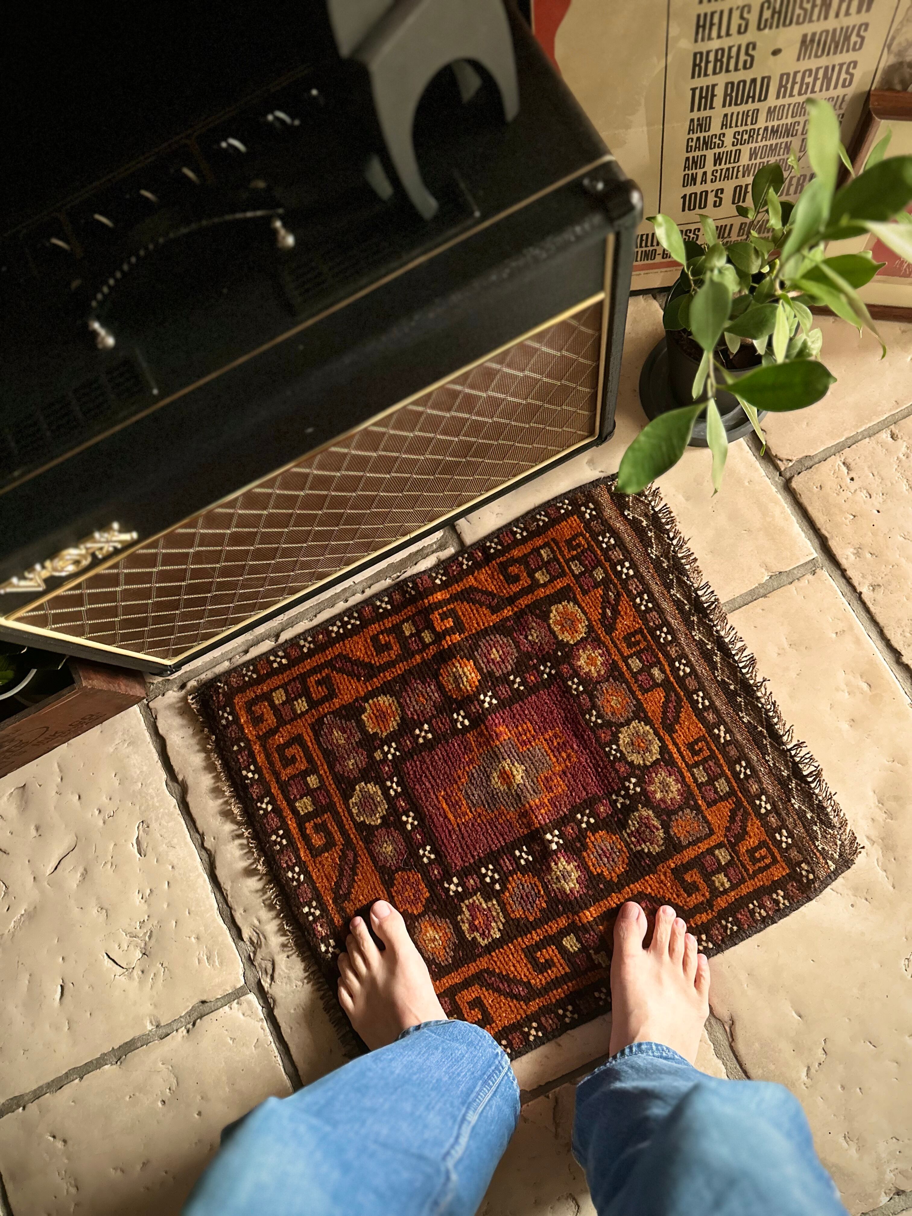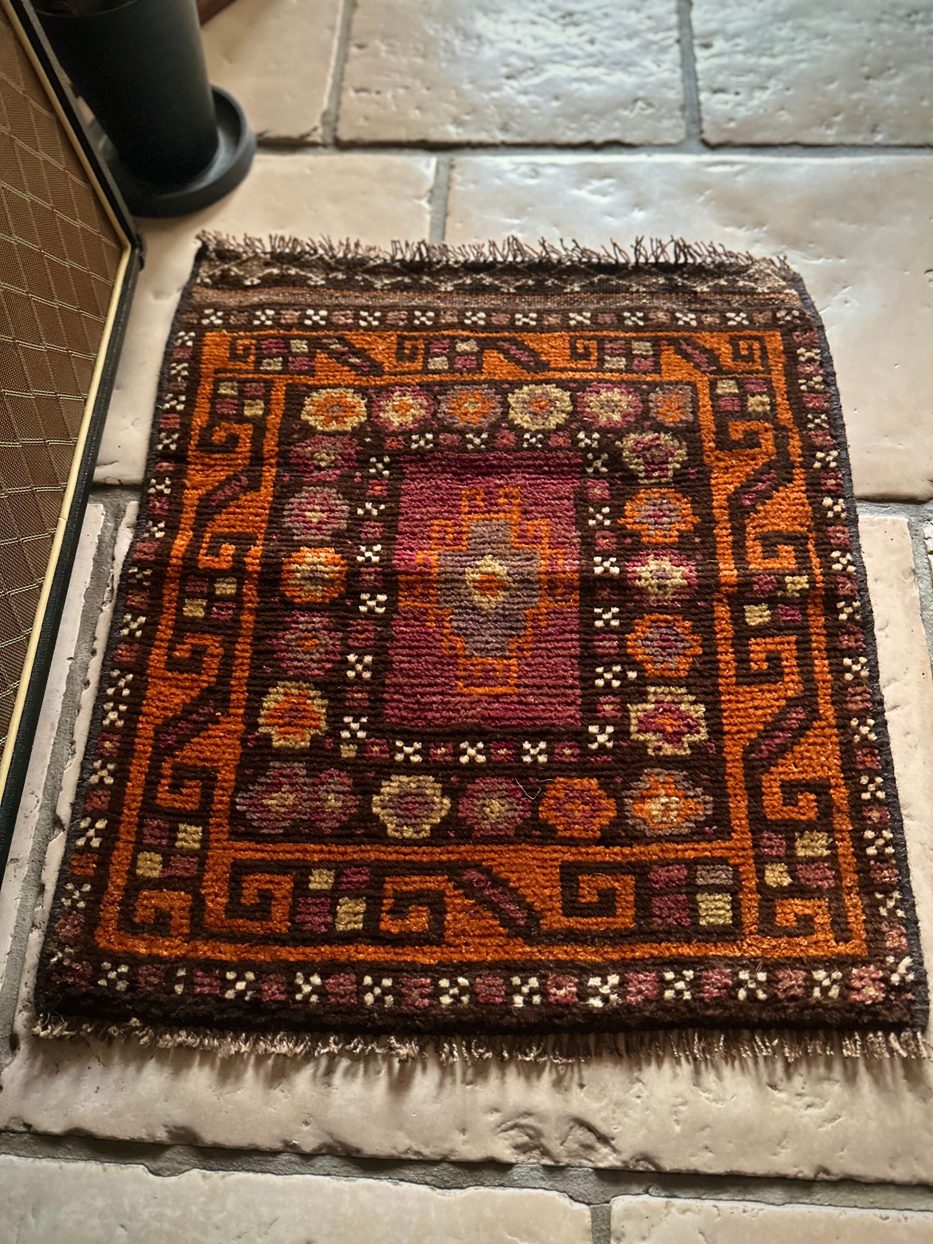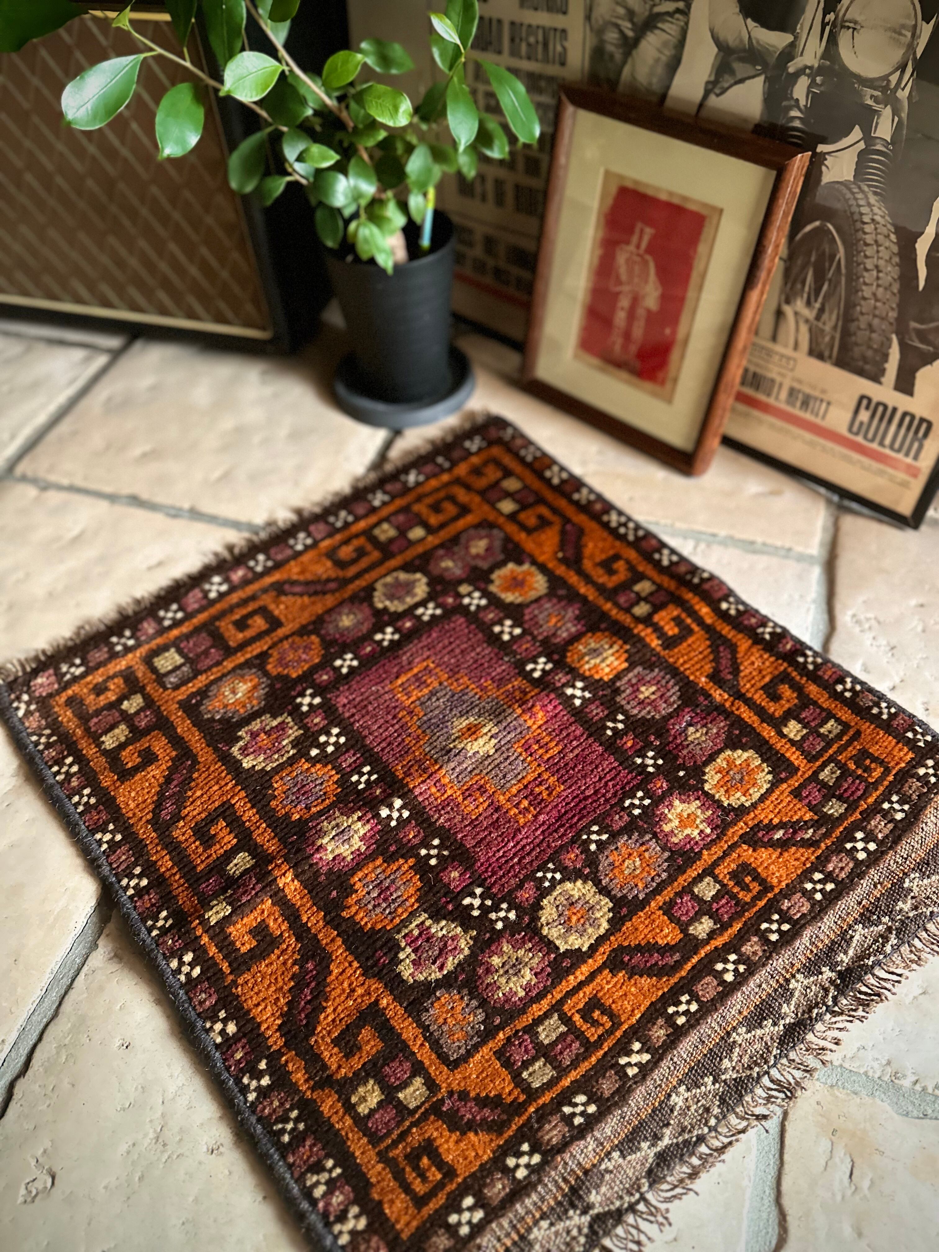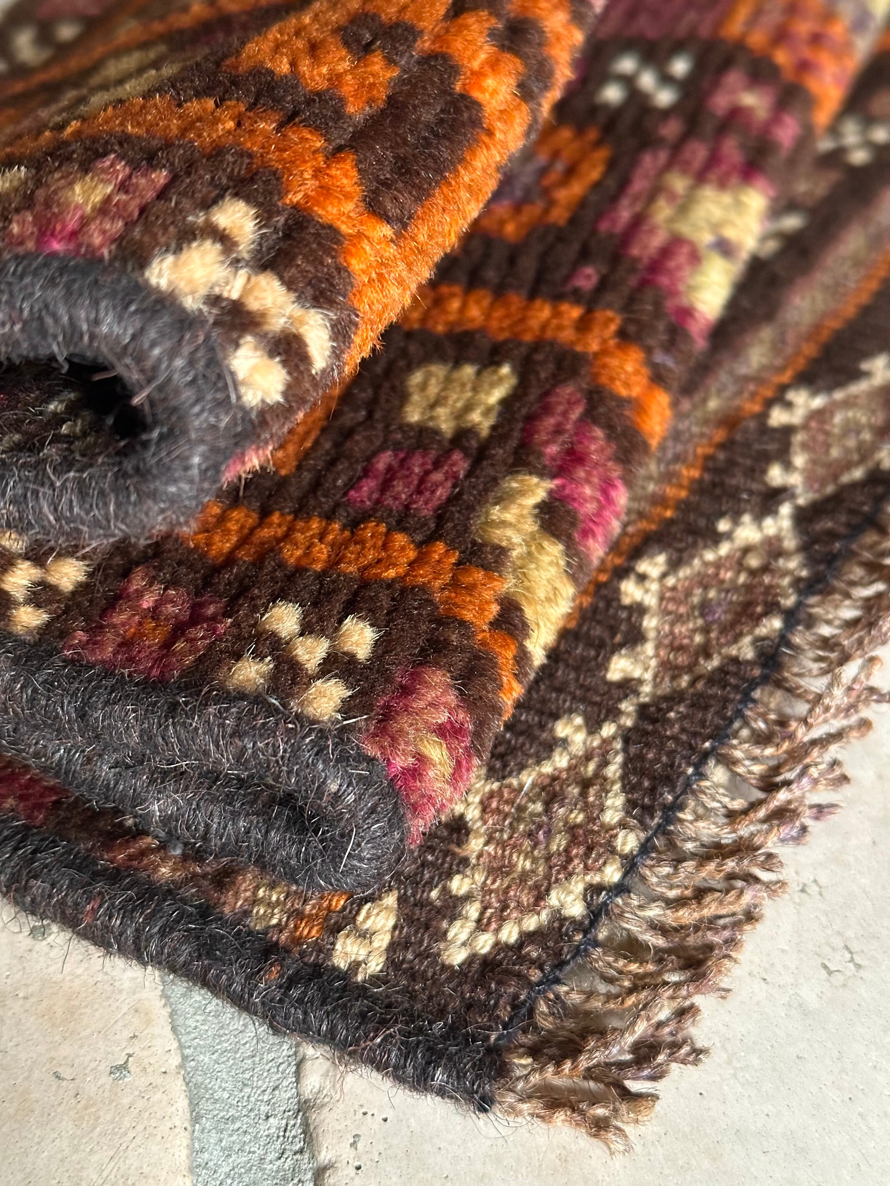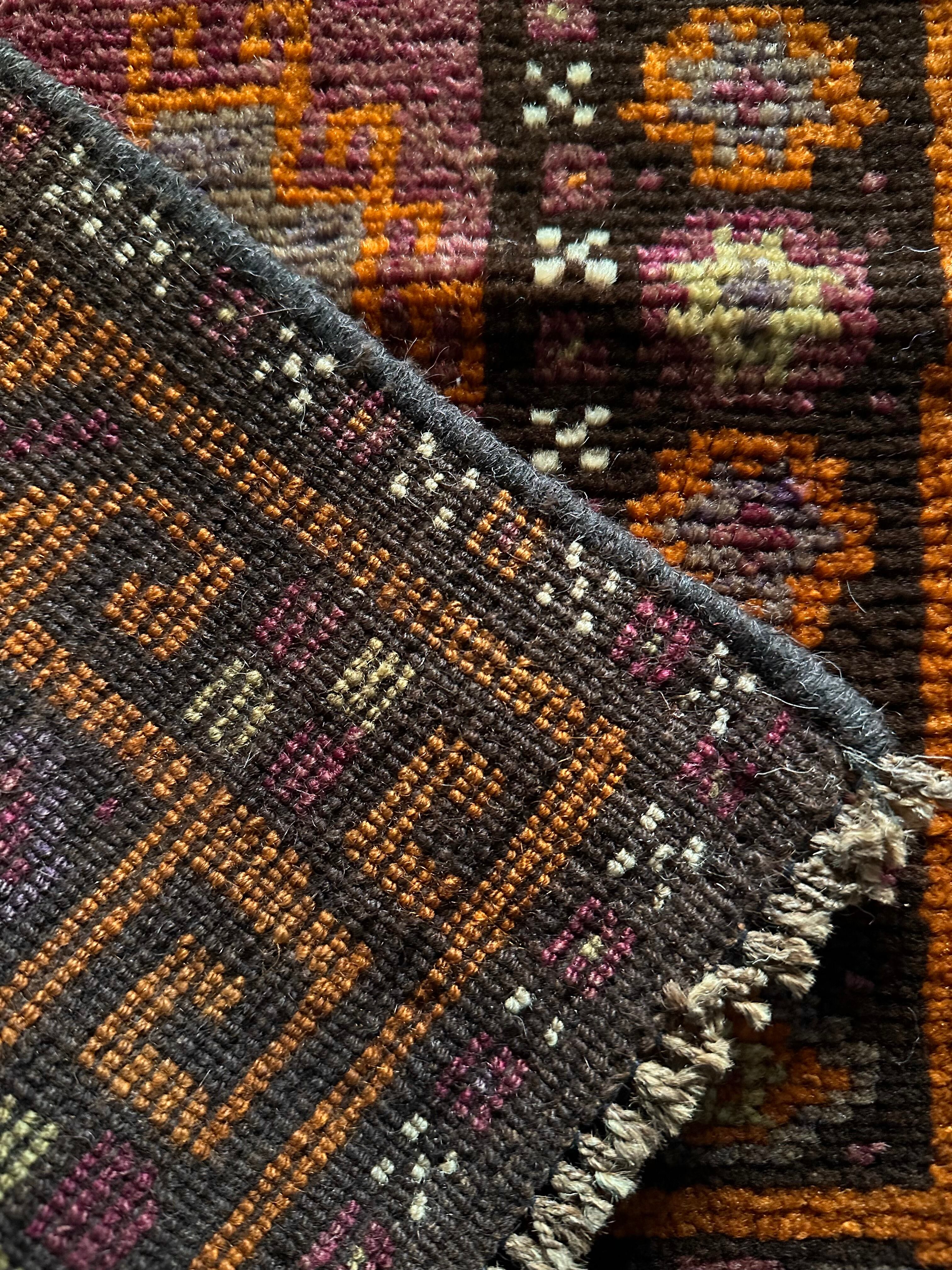 落ち着いた雰囲気のオレンジブラウンをベースカラーに、ぐるりと囲んだ幸運をもたらす八芒星がバルーチらしいトライバルラグで、元々はホルジンと呼ばれるラクダやロバの背に跨がせるサドルバッグや、トルパと言った袋物の表皮をラグに仕立て直したモノになります。