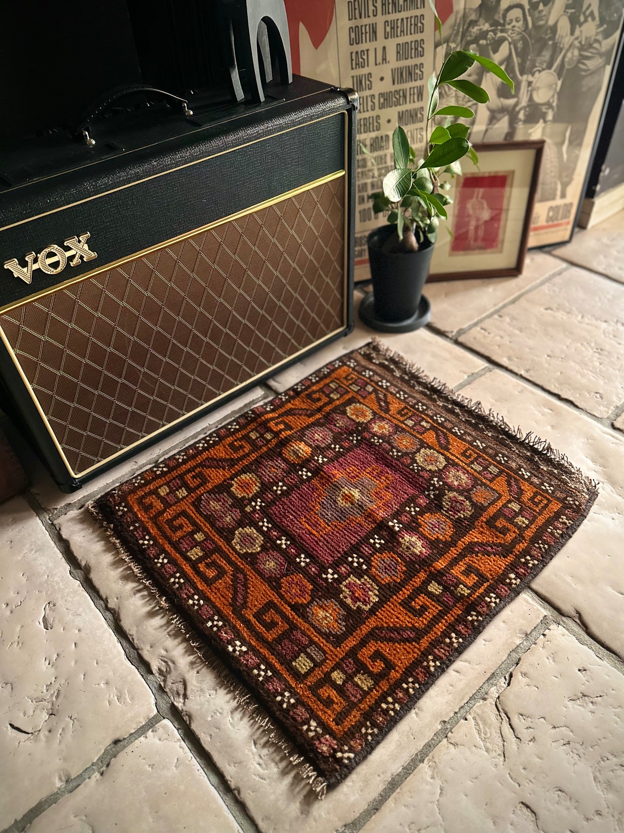 見た目にも使い勝手の良さそうなミニラグ仕立てでキリムエンドの装飾も可愛らしく、ちょっとした足下はもちろんソファの座面やテーブルなんかにも多用出来るでしょうか。ここ最近では植物の鉢置き敷きとしてもより良い雰囲気が楽しめる1枚になります。