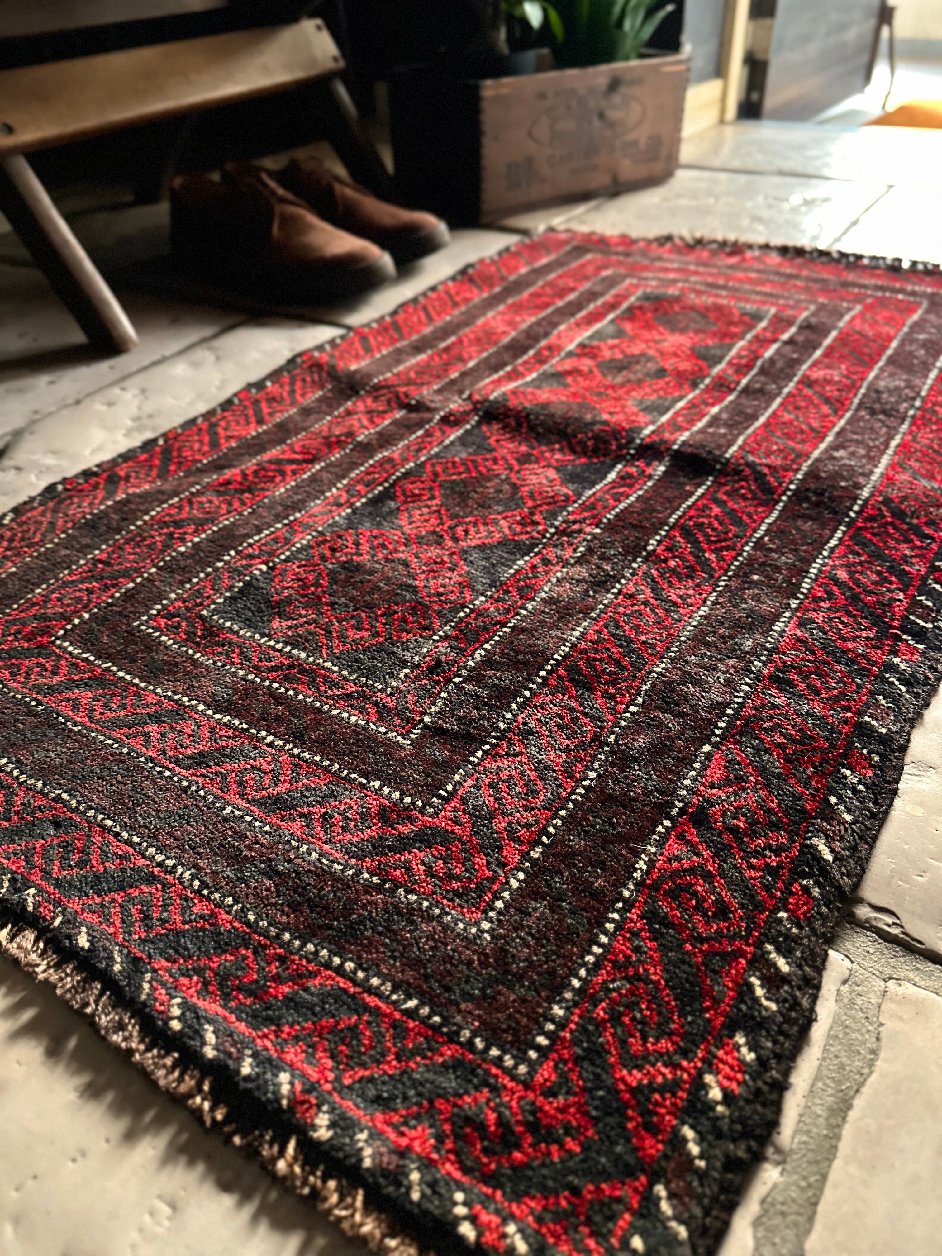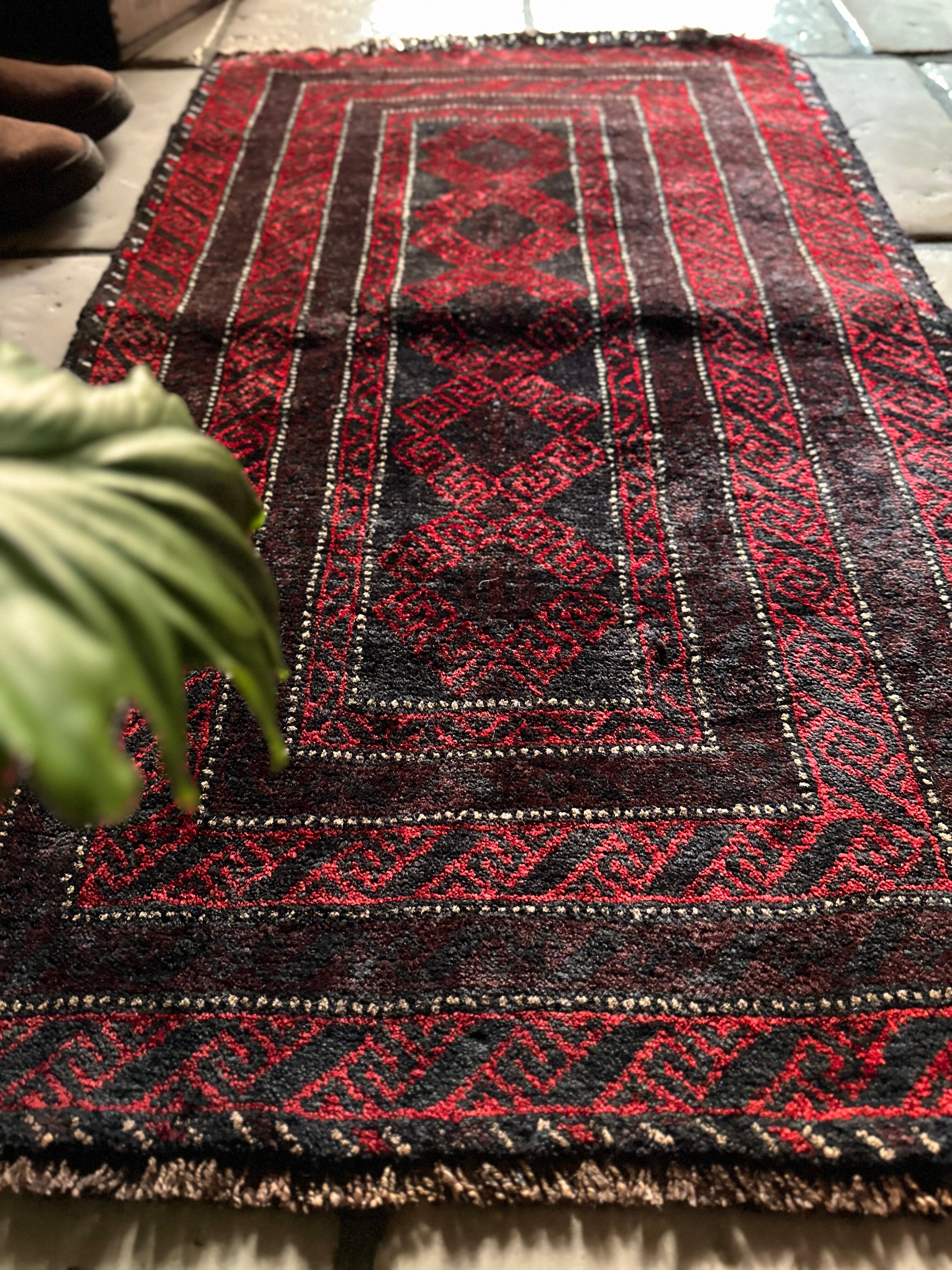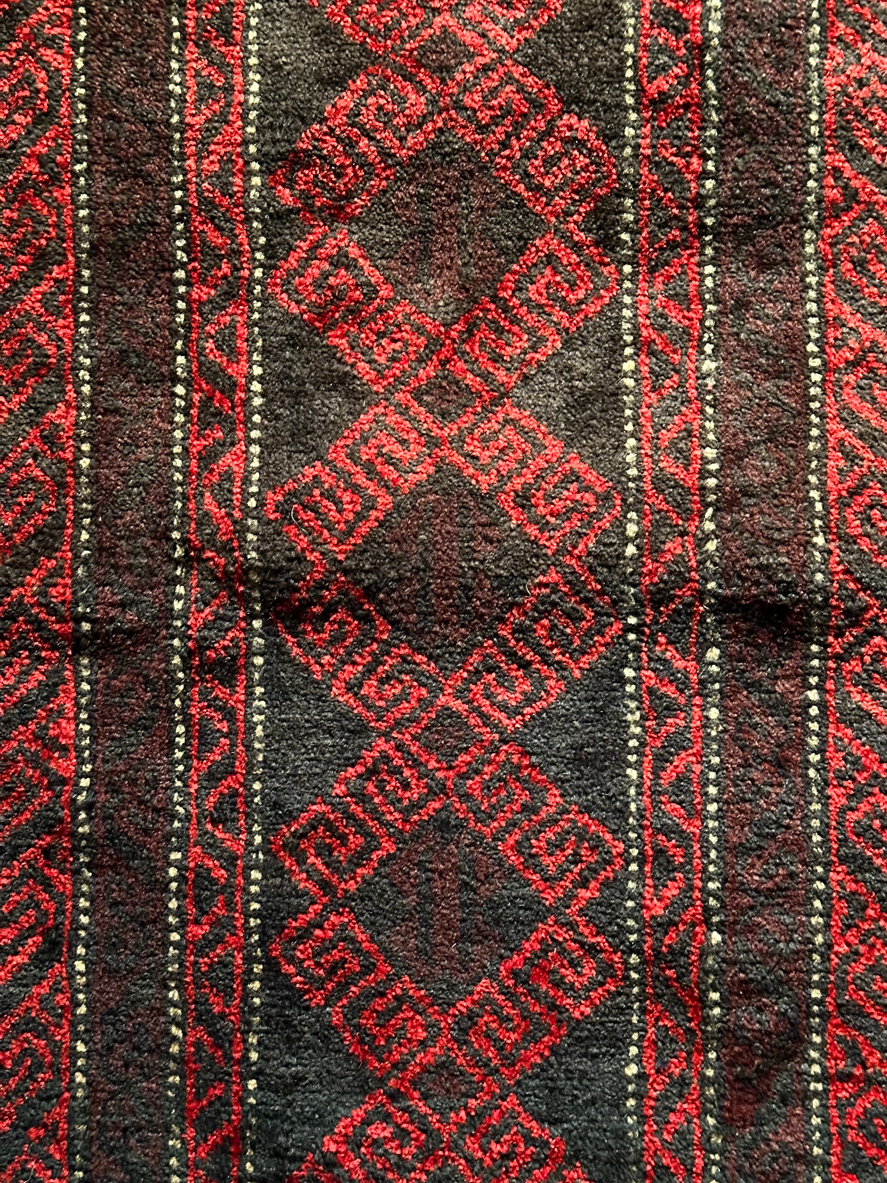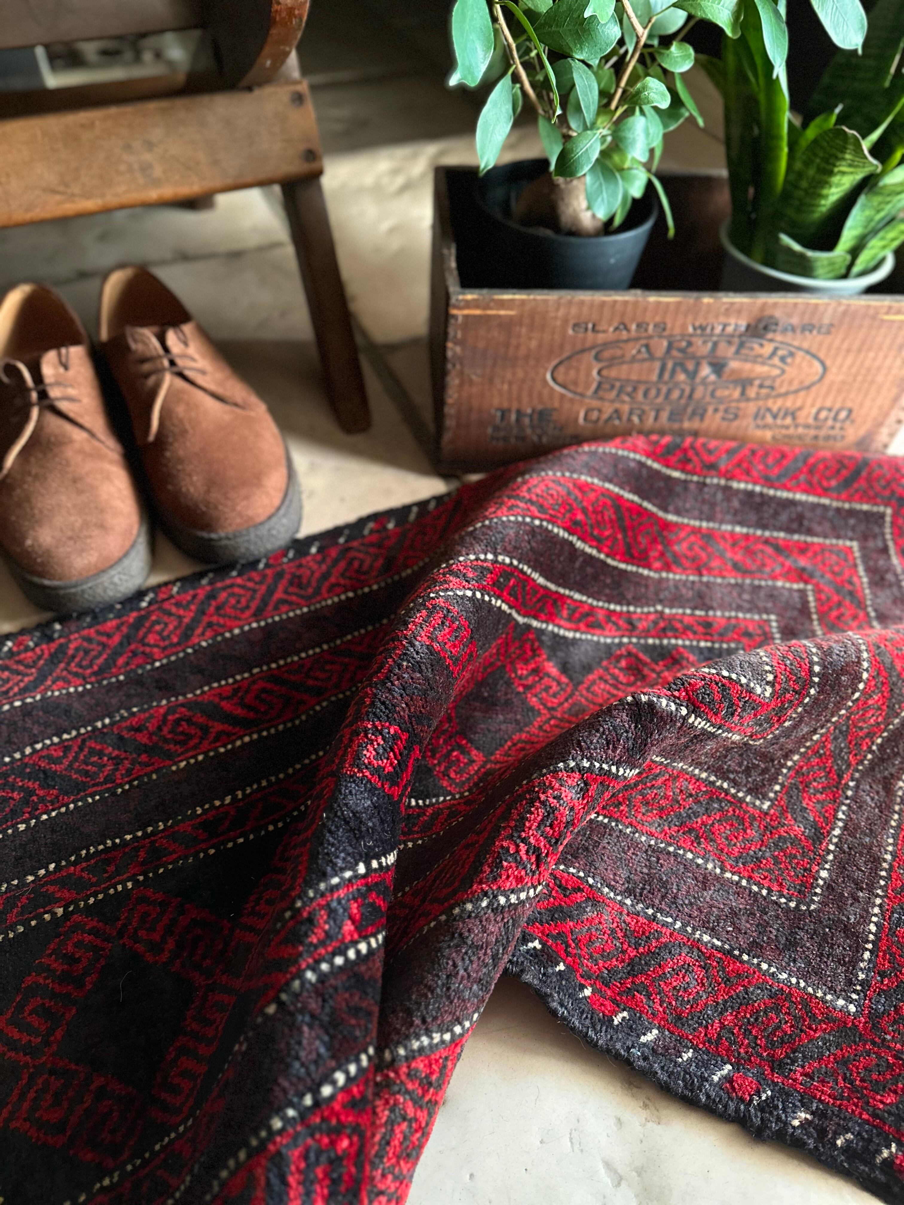 見事に艶やかなブラック&レッドにバーガンディと、そこに浮き出るかのように光り輝く白地のアクセントがバルーチらしいアフガニスタン西部のヘラート州で織られたトライバルラグになります。