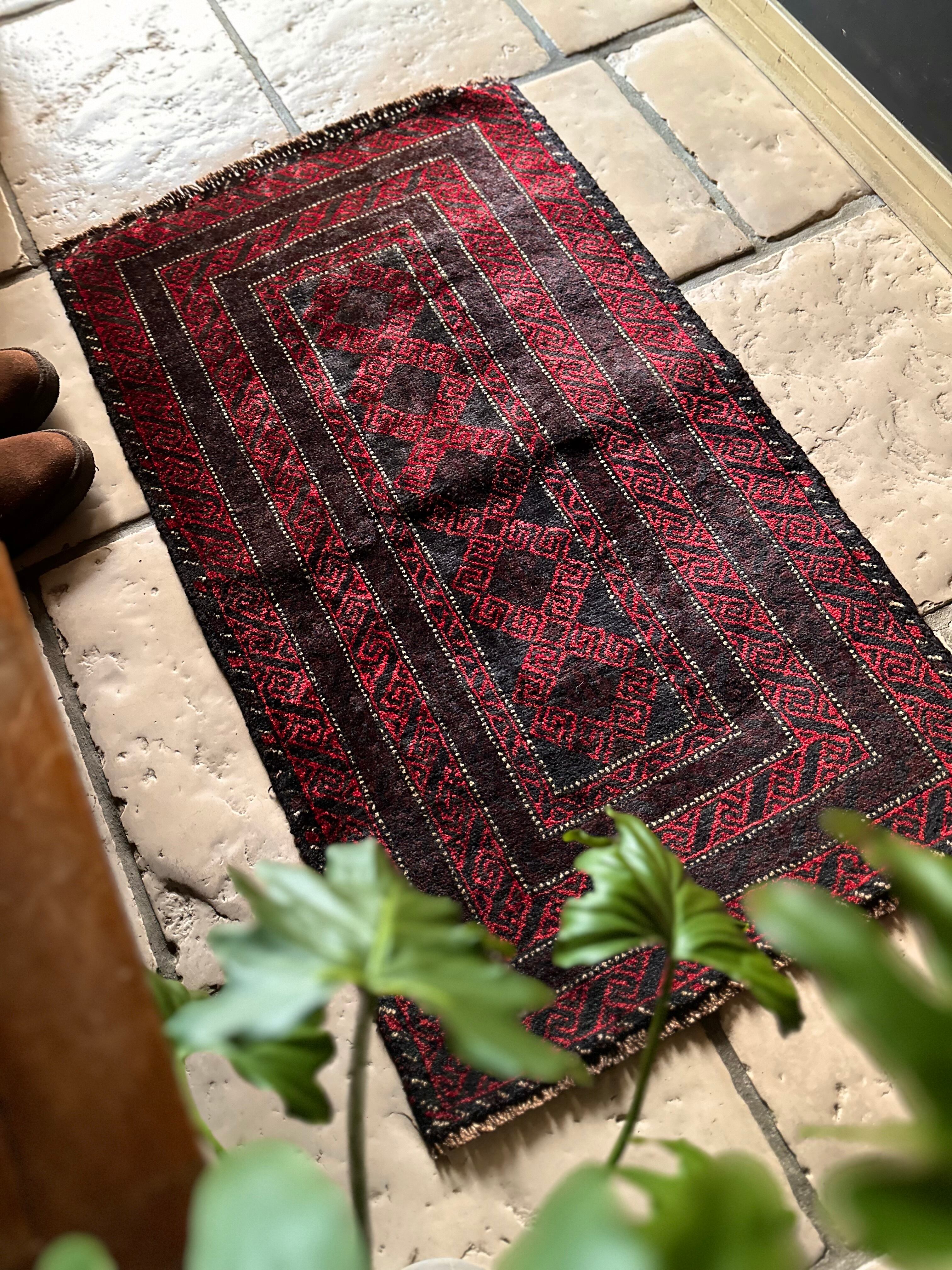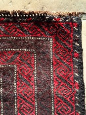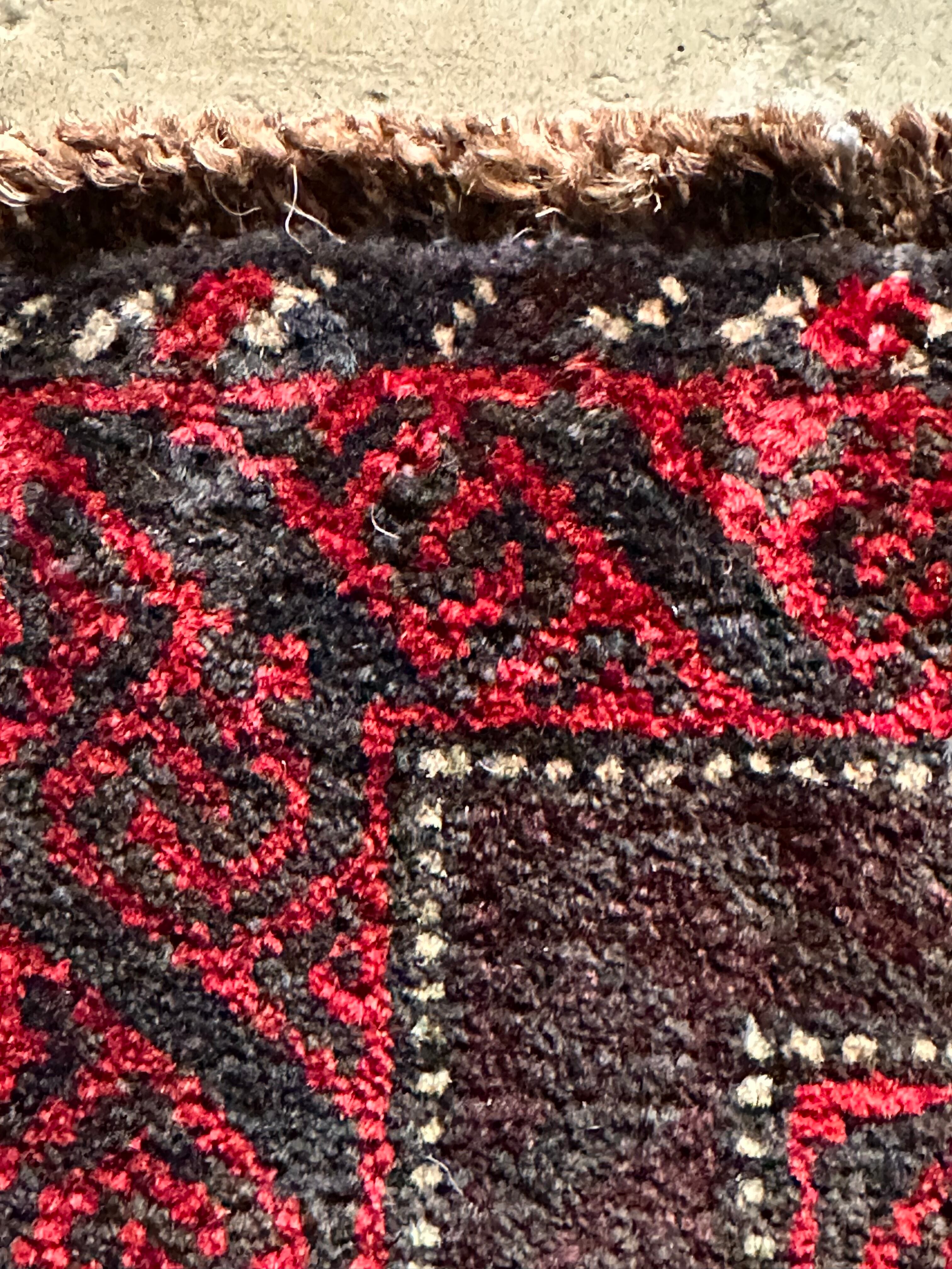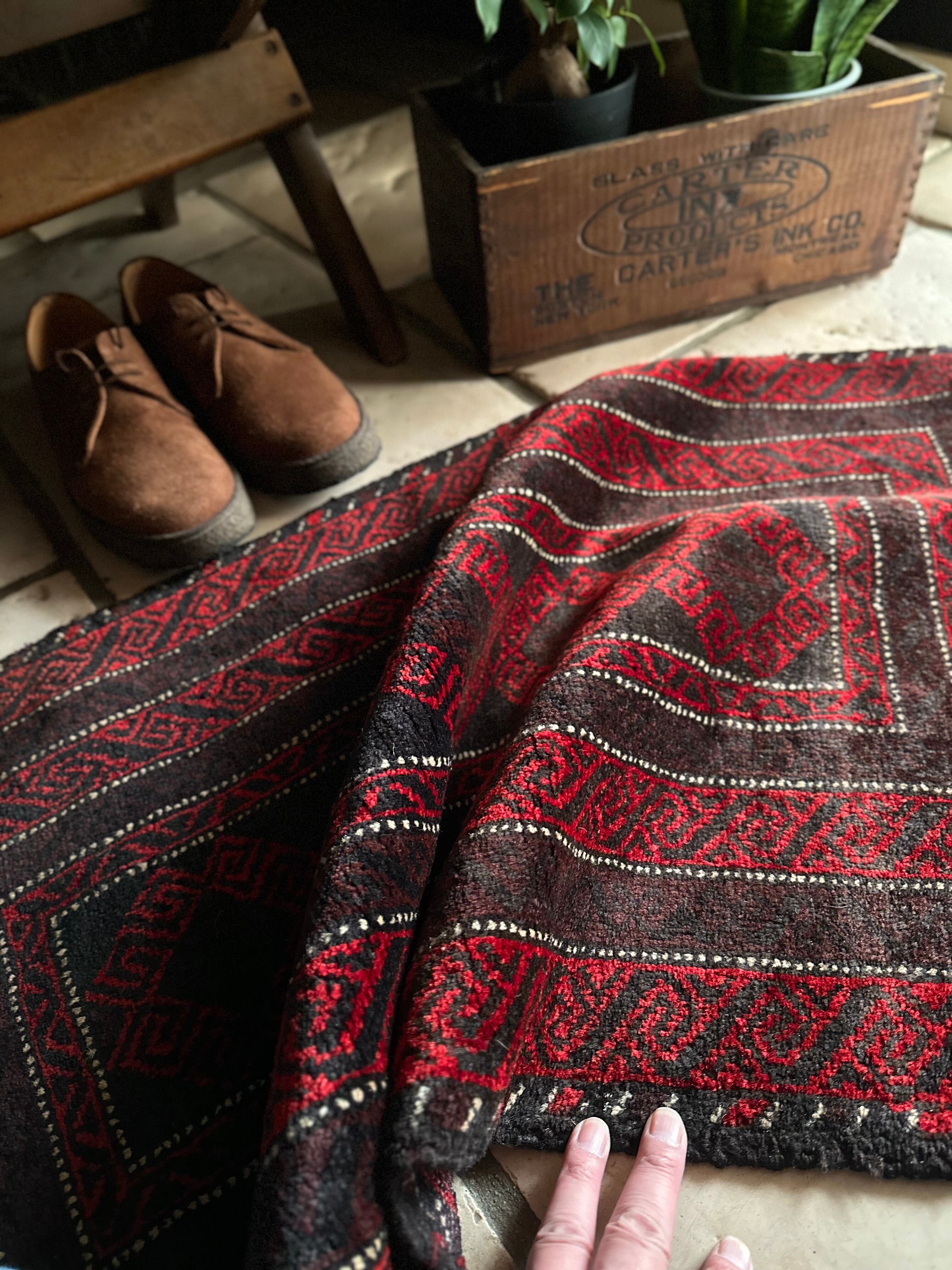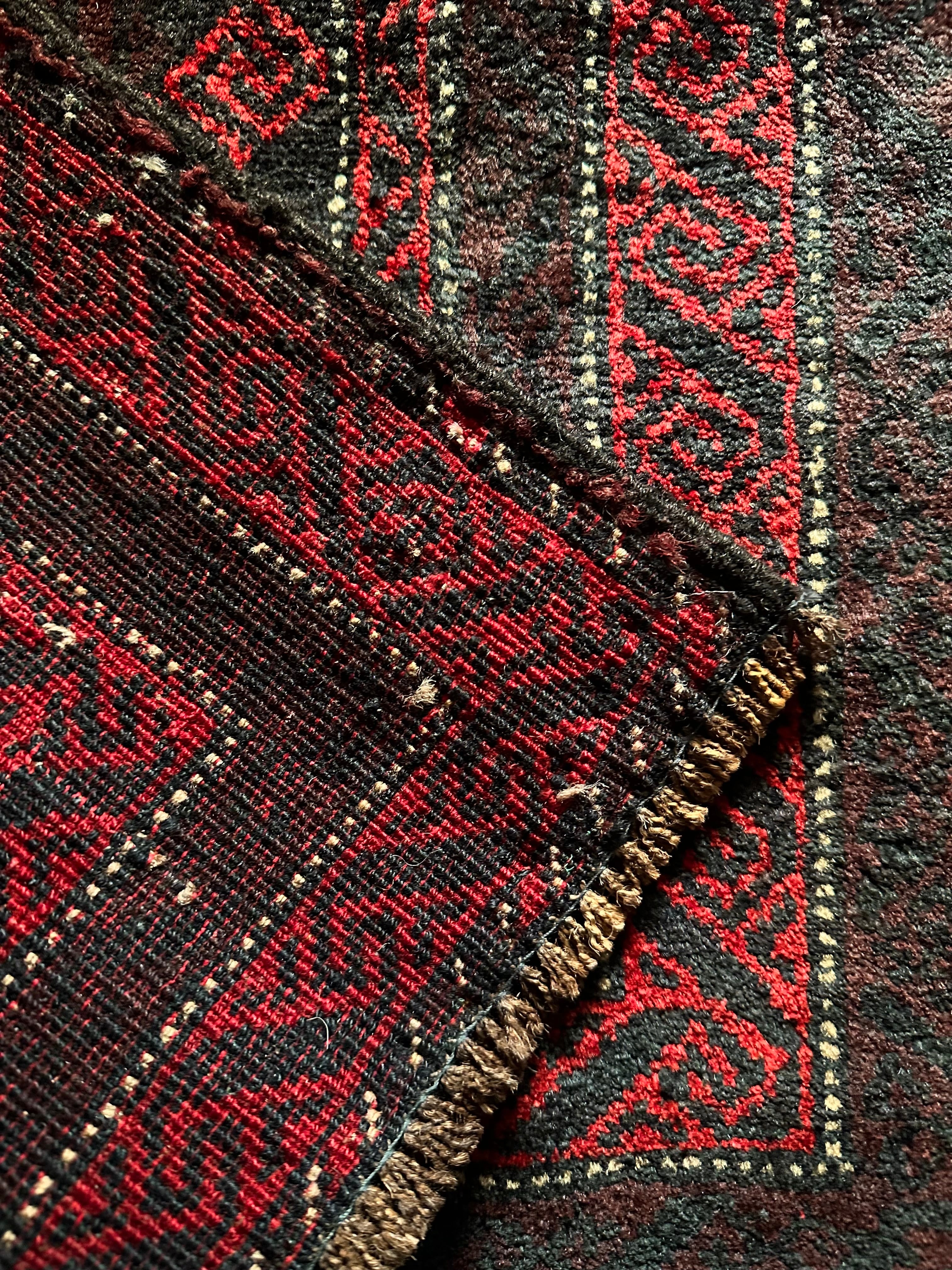 見事に艶やかなブラック&レッドにバーガンディと、そこに浮き出るかのように光り輝く白地のアクセントがバルーチらしいアフガニスタン西部のヘラート州で織られたトライバルラグになります。