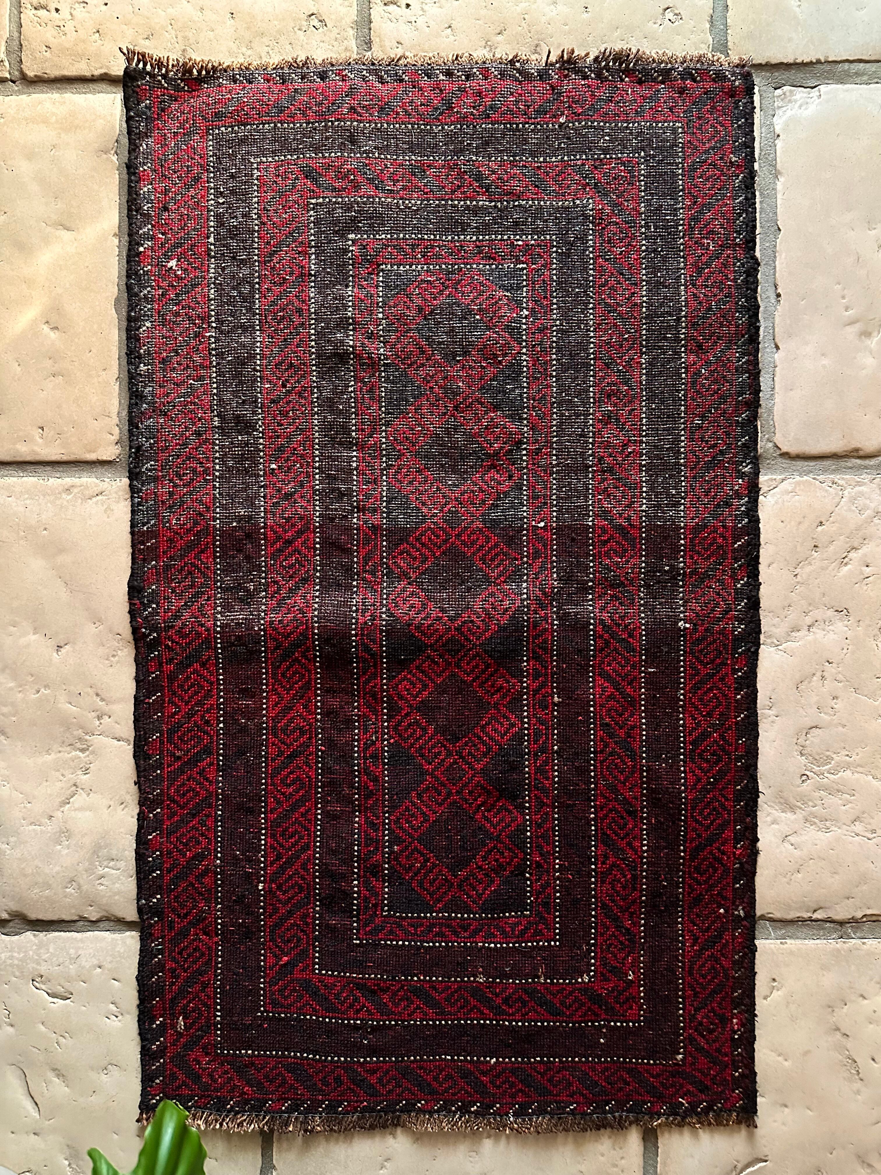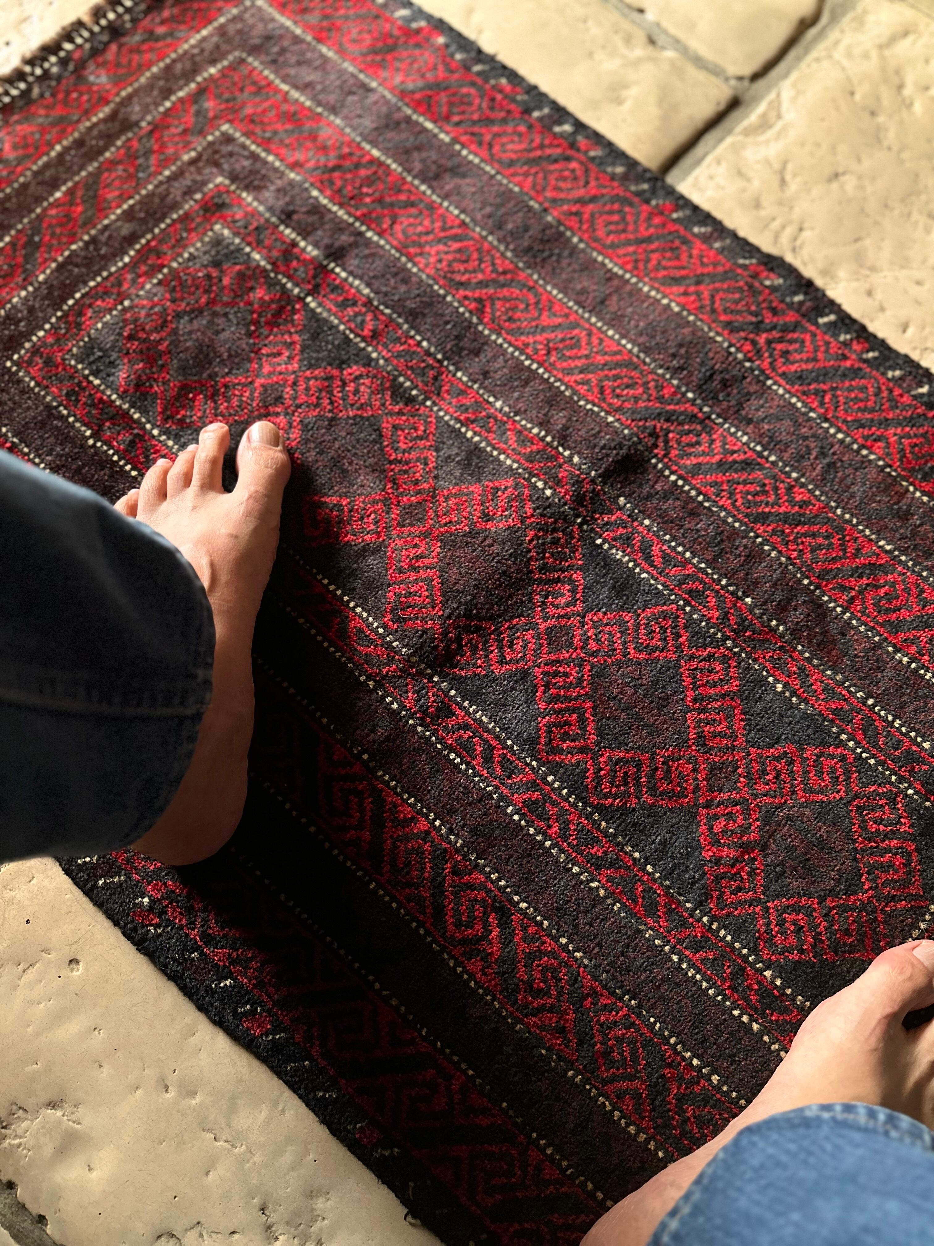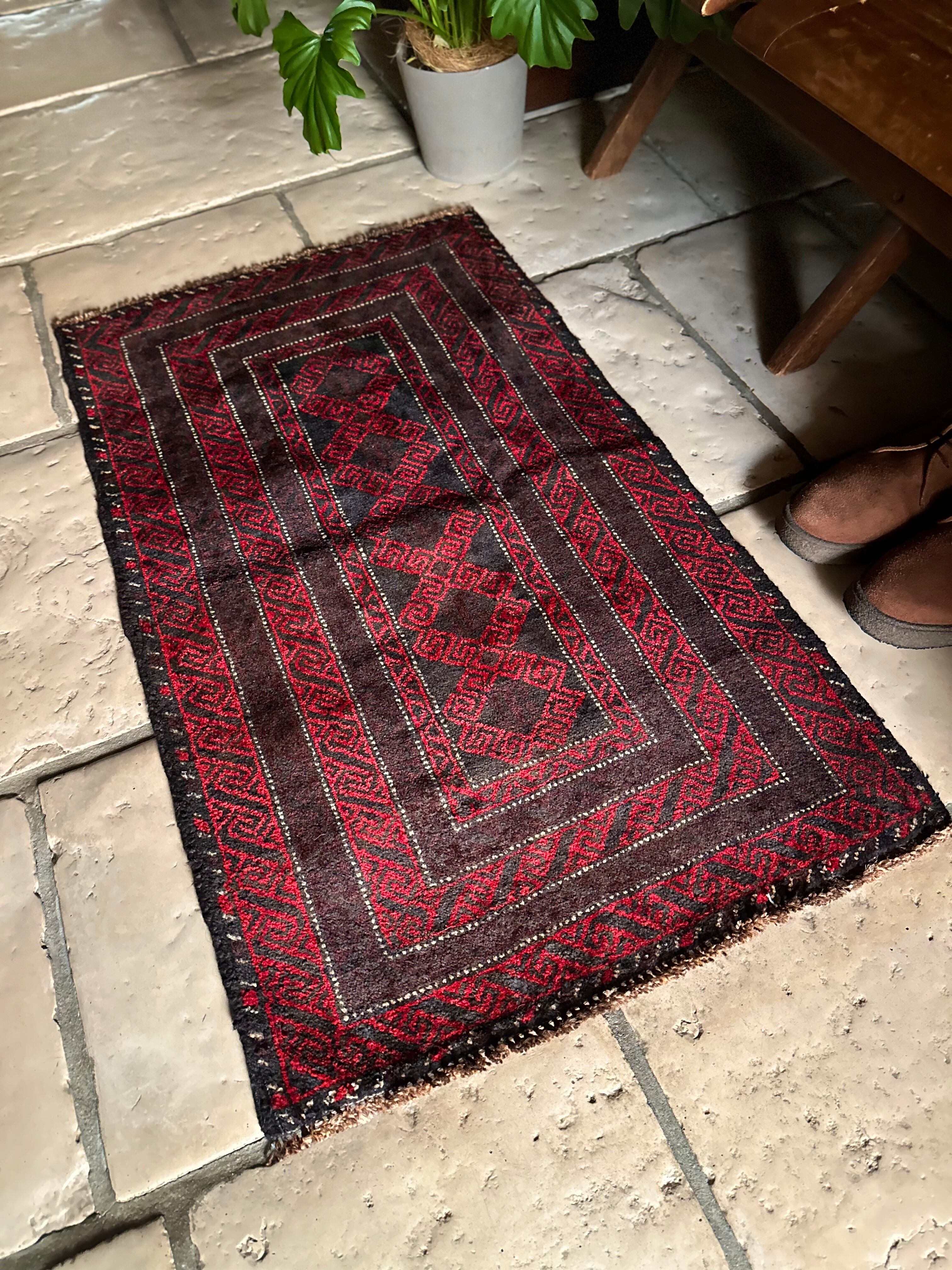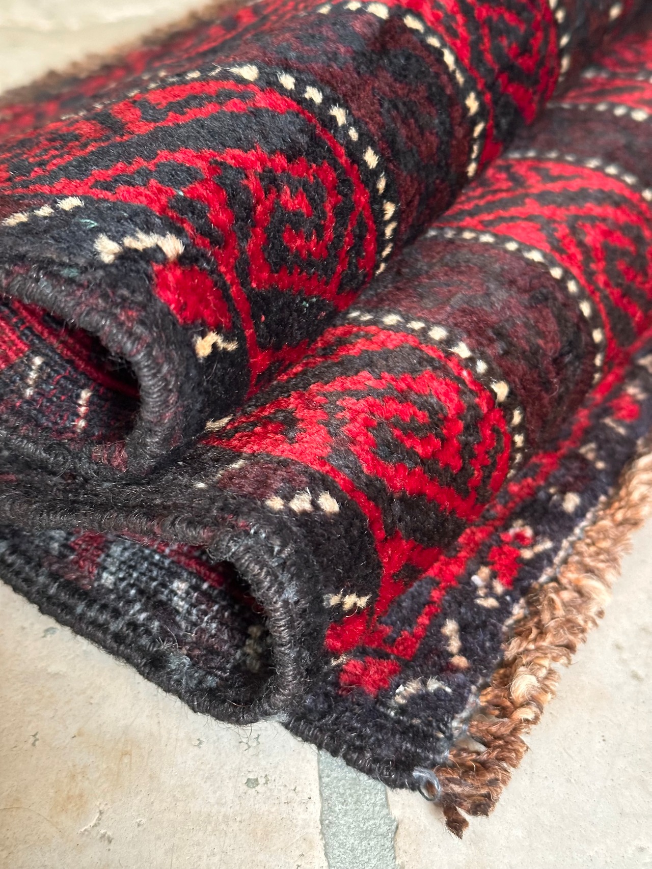 見事に艶やかなブラック&レッドにバーガンディと、そこに浮き出るかのように光り輝く白地のアクセントがバルーチらしいアフガニスタン西部のヘラート州で織られたトライバルラグになります。