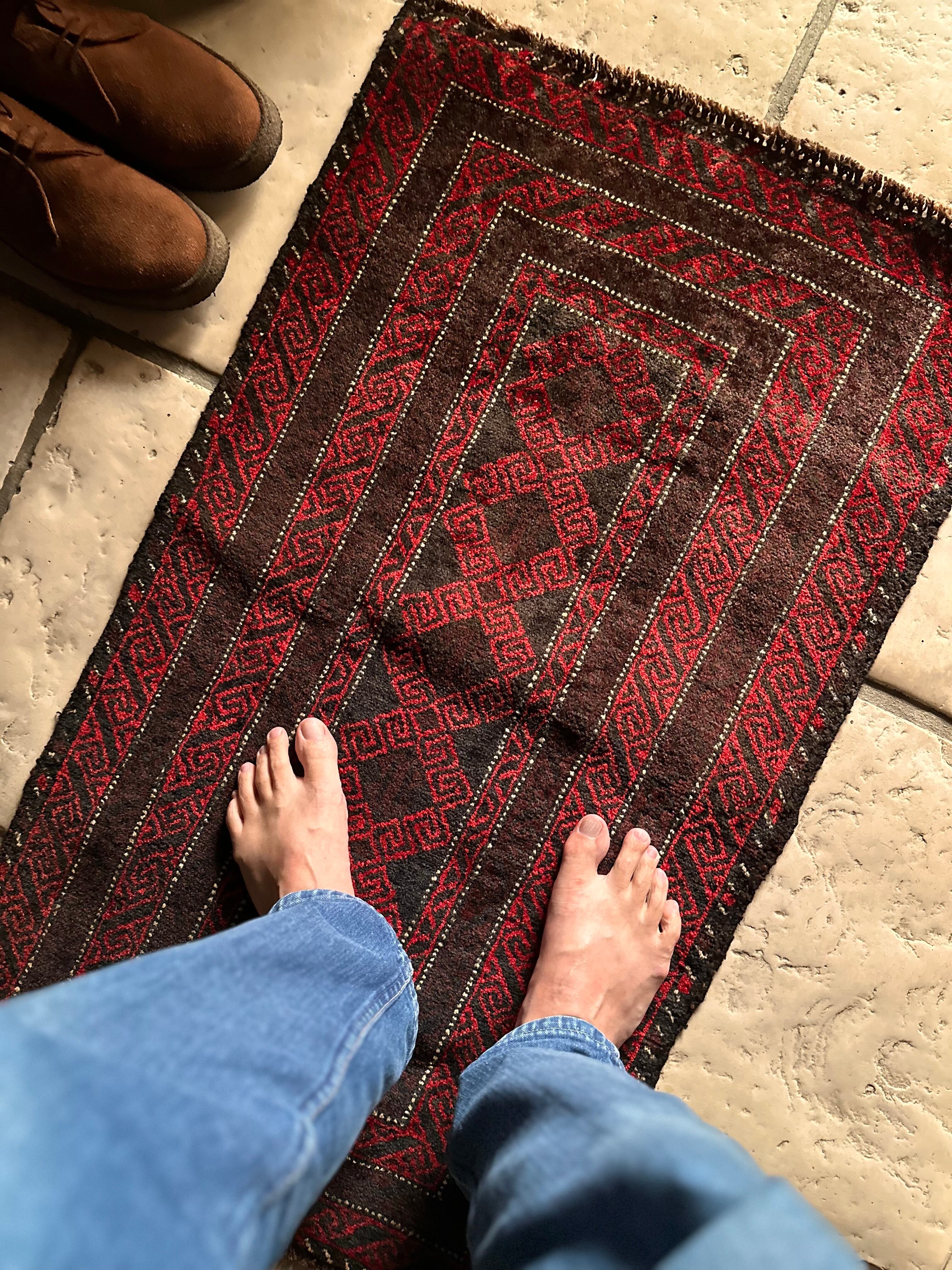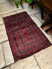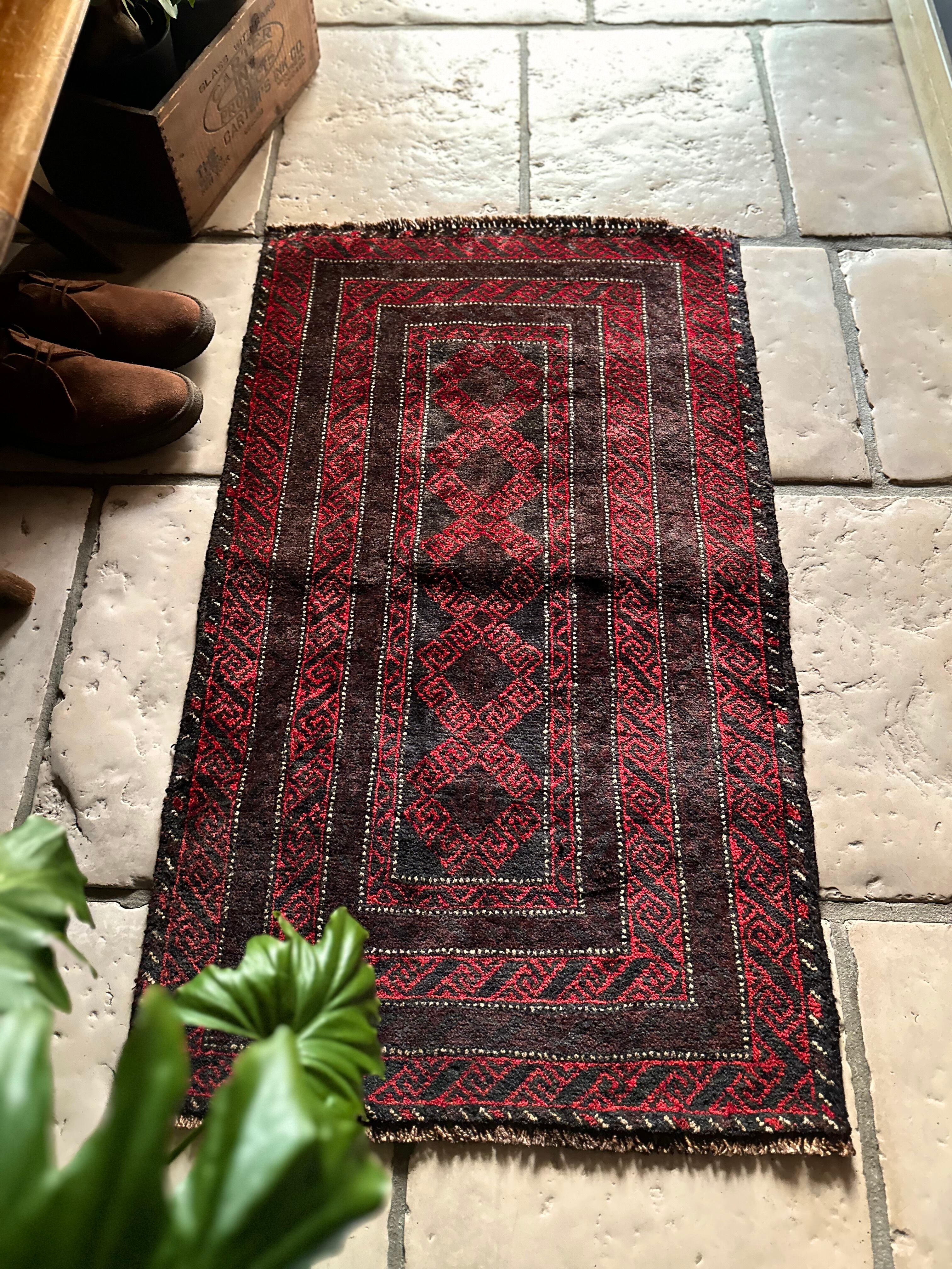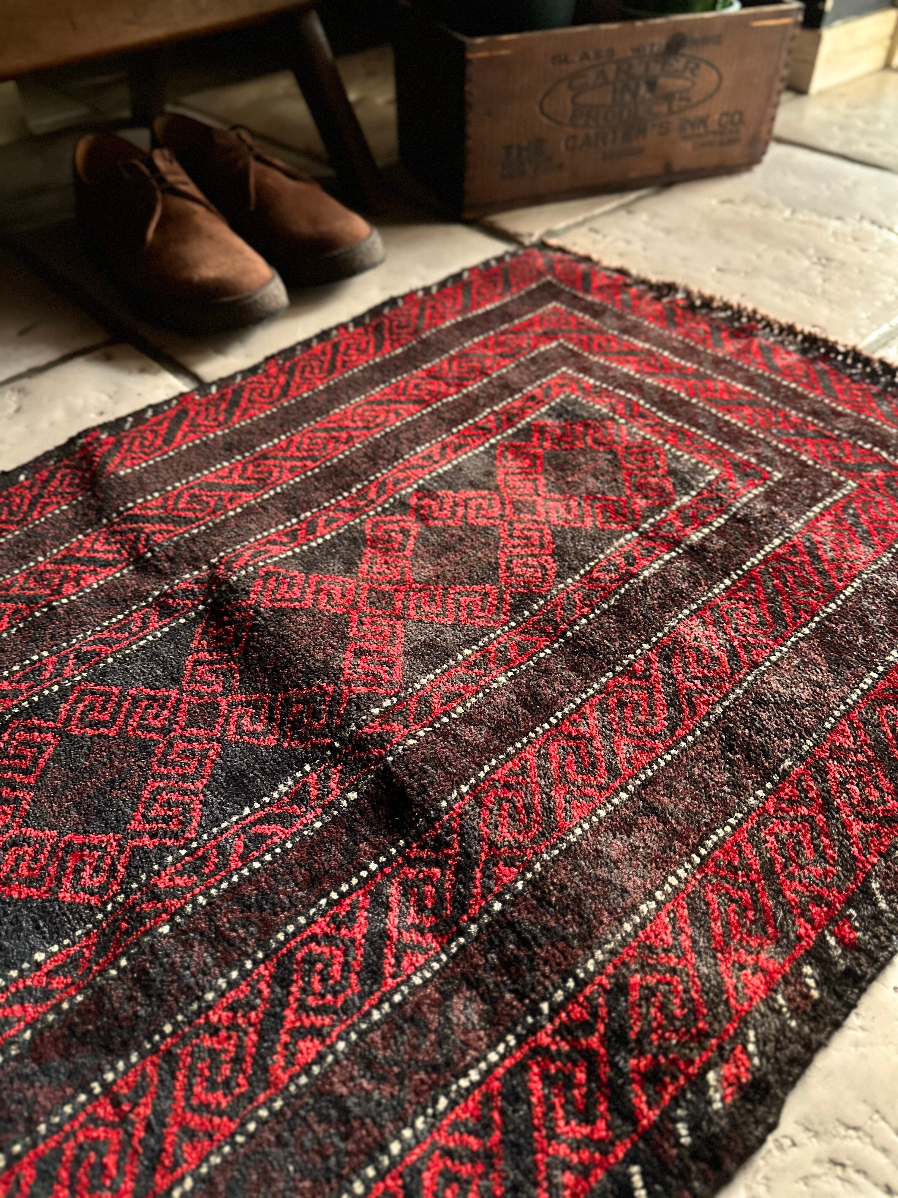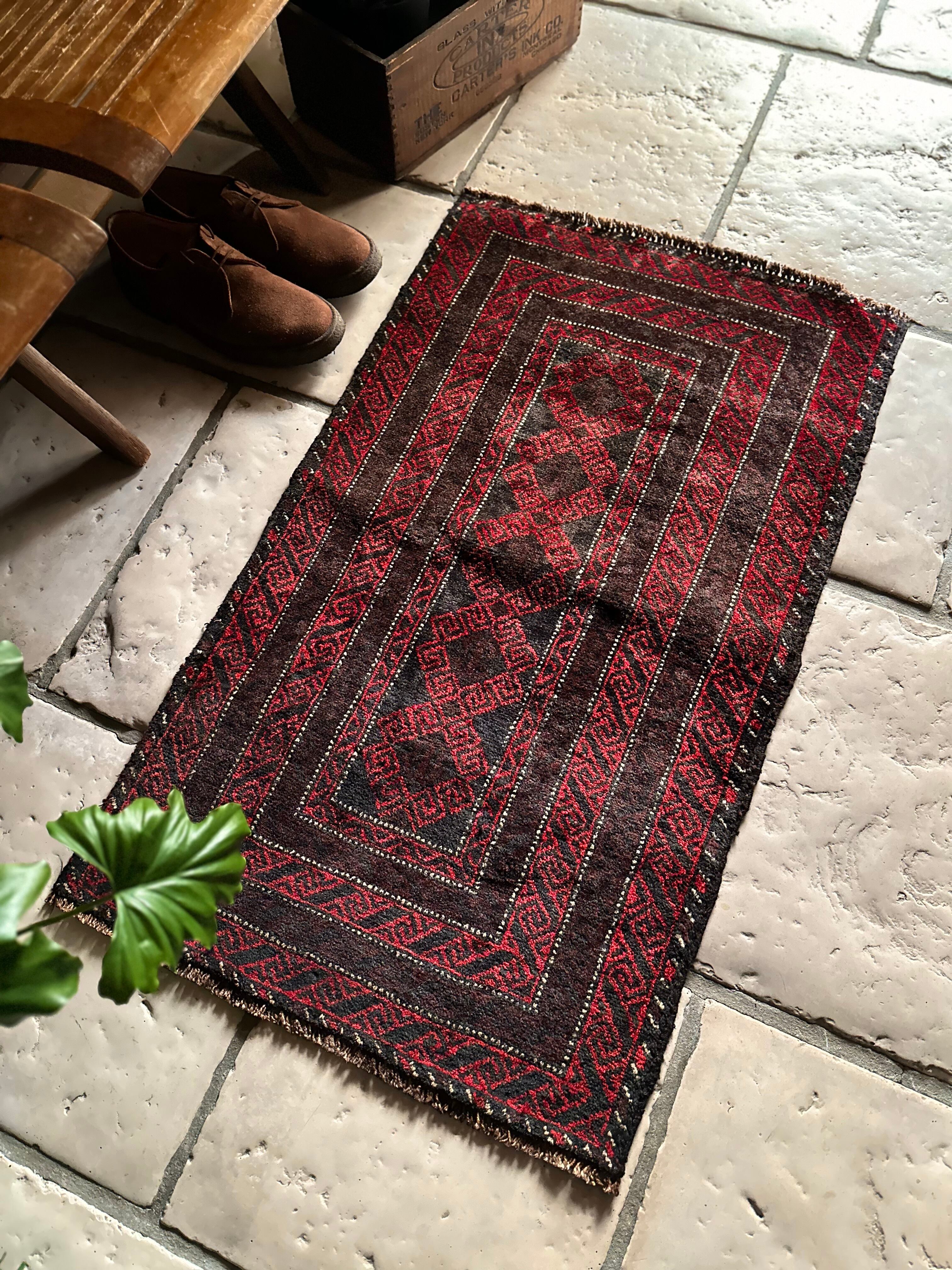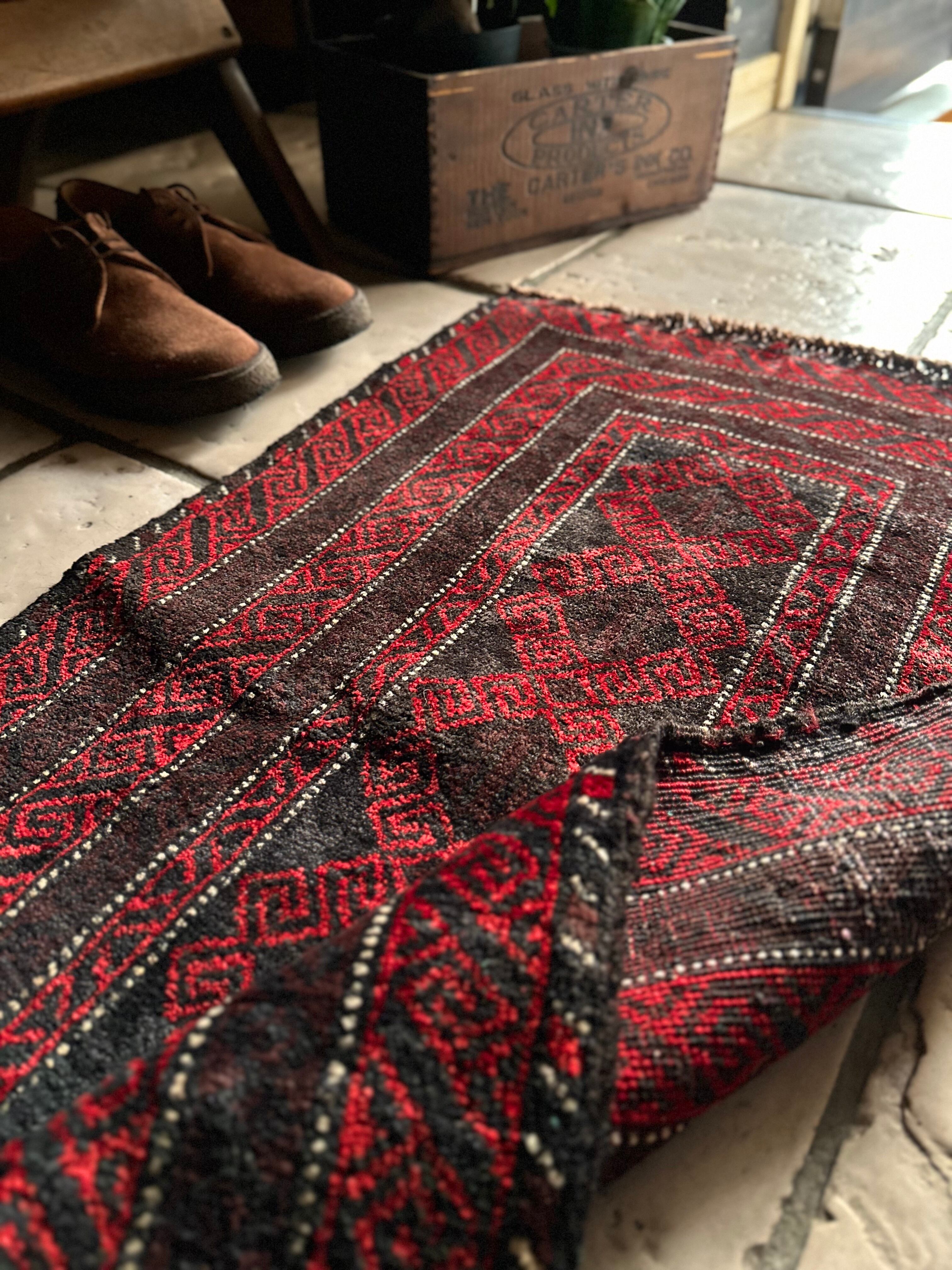 イランのバルーチ同様にダブル・ウェフトでしっかりと織られた1枚で、チェーンの連続紋様にフックドメダリオンがかっこいいでしょうか。ヴィンテージラグならではのツヤ感がより一層際立つ配色になり、これで玄関マットサイズというのが泣かせます。