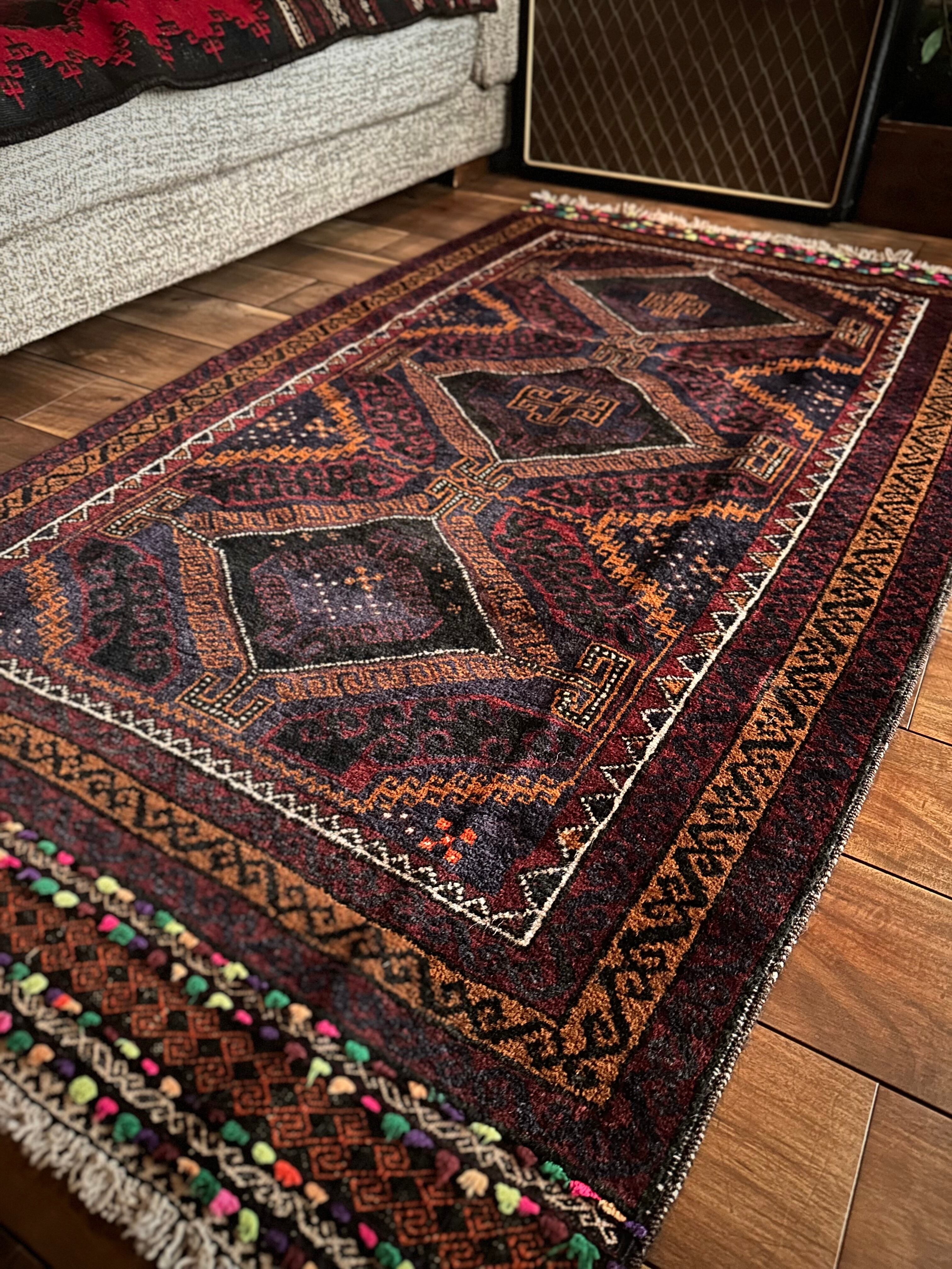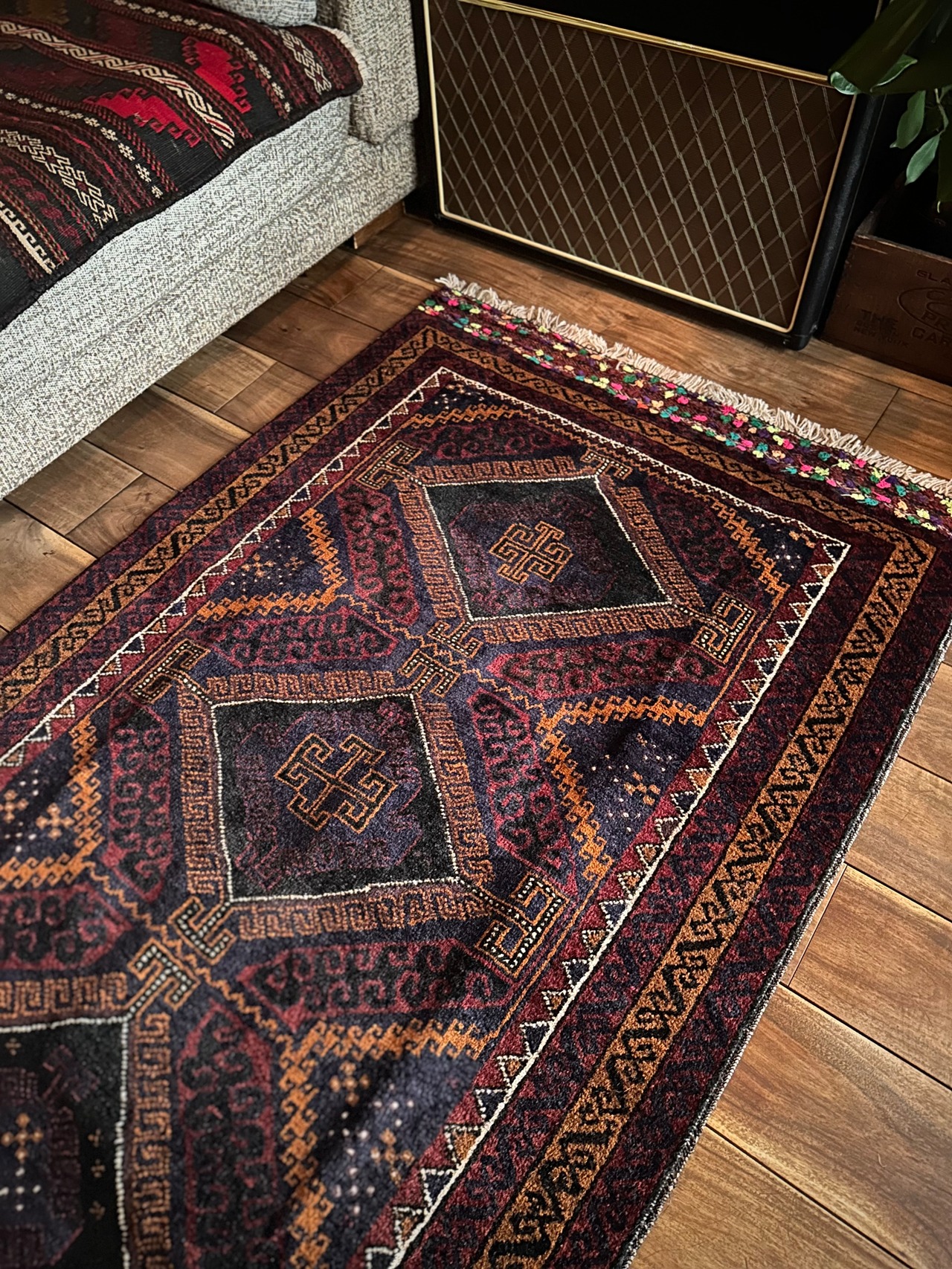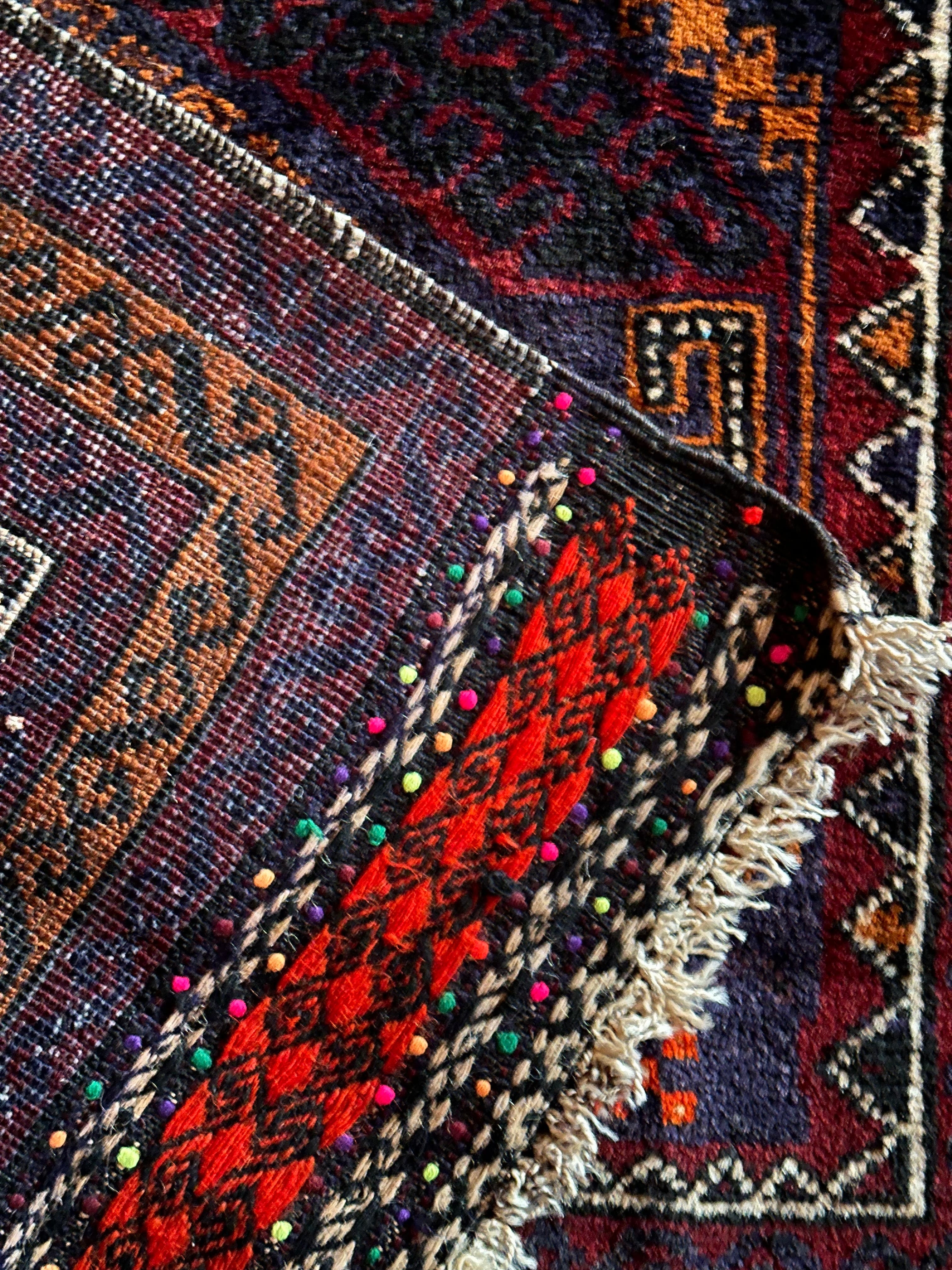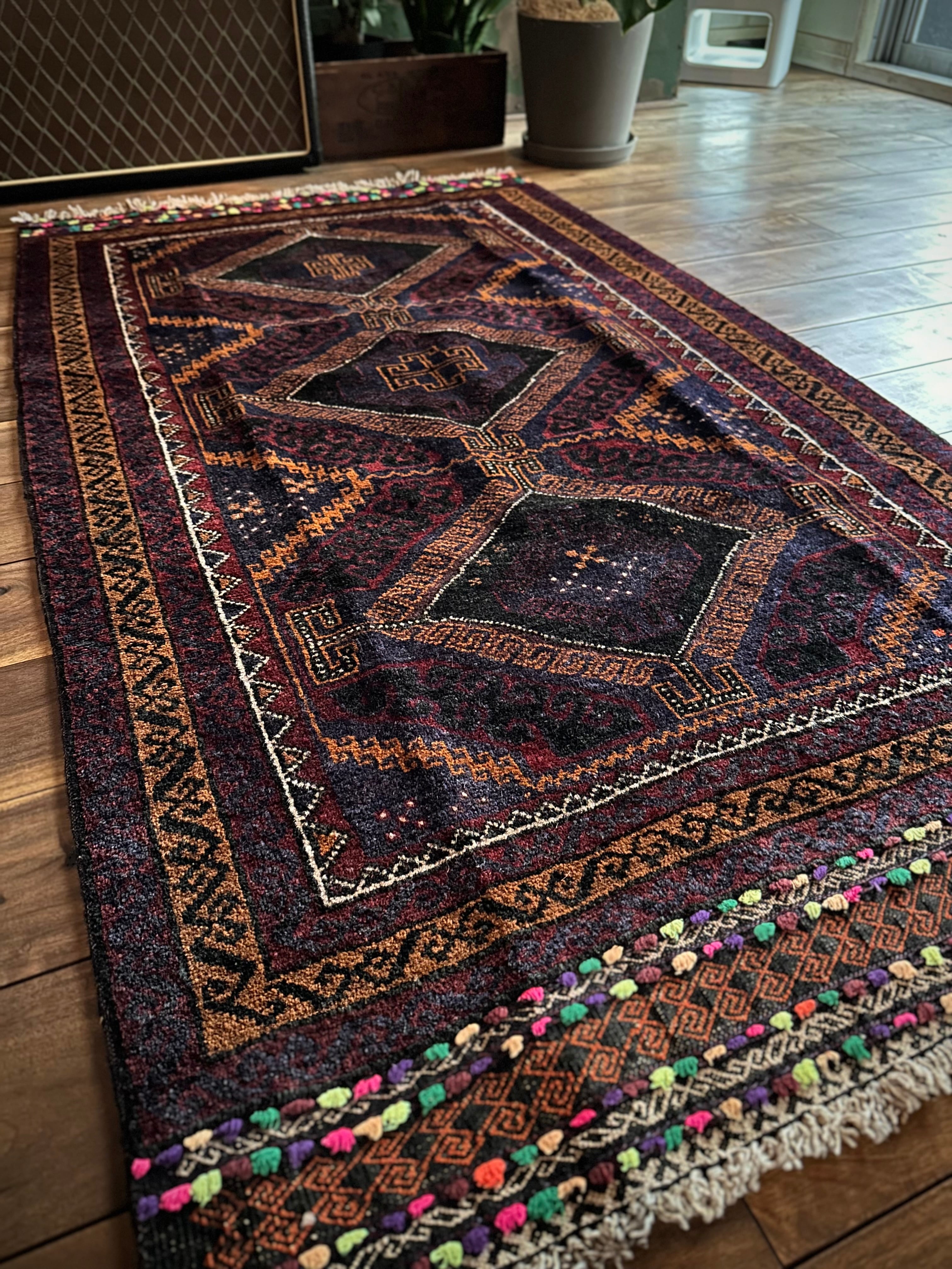 全体的に深みのある色合いにカフェブラウンが浮き彫りにされた"Zinjir gul”と呼ばれる紋様がかっこよく、チェーンの連続模様でミルフィーユされたボーダー部分がバルーチらしいでしょうか。5ミリという薄手になりますのでタペストリーとしても良さげです。