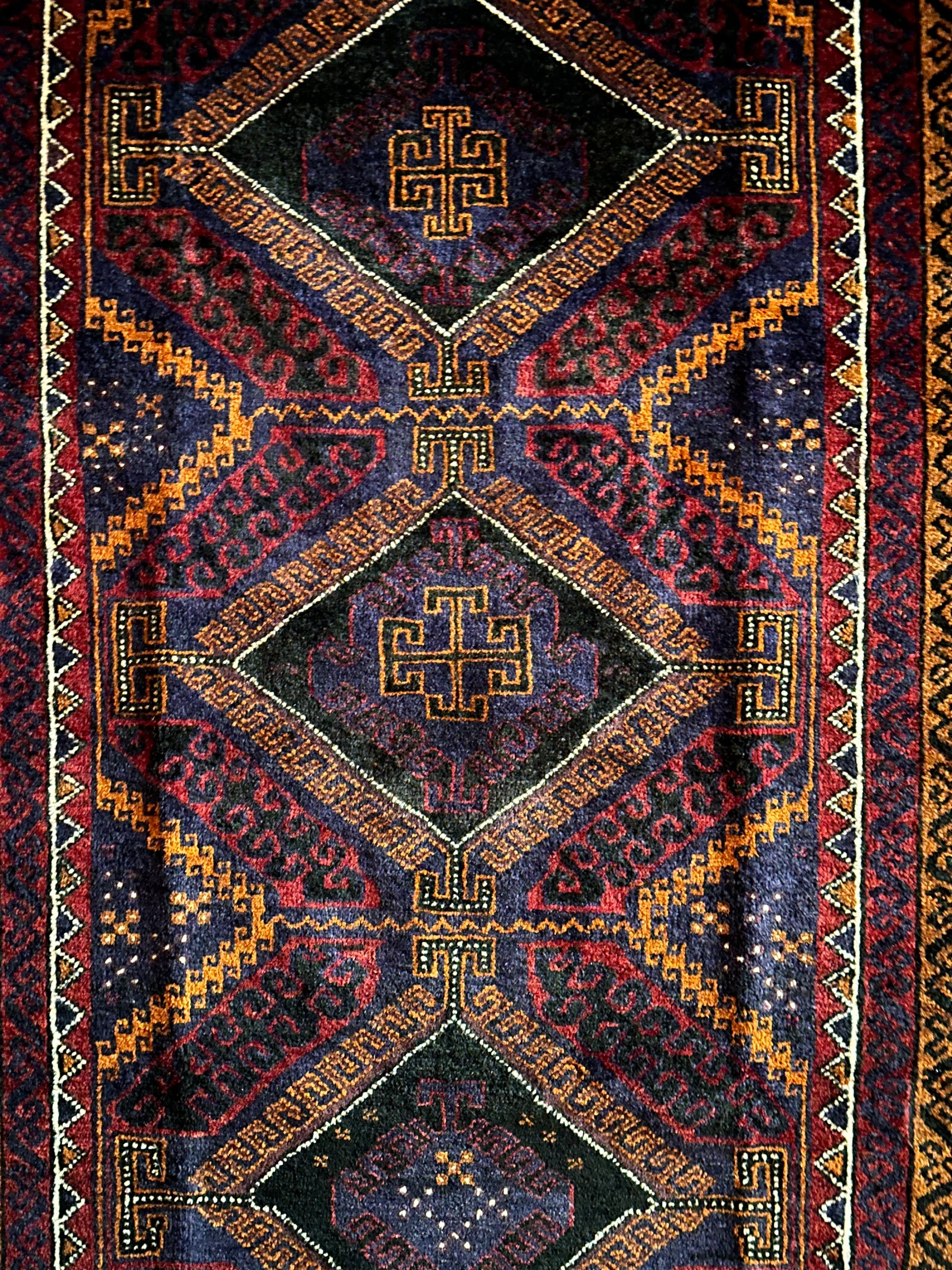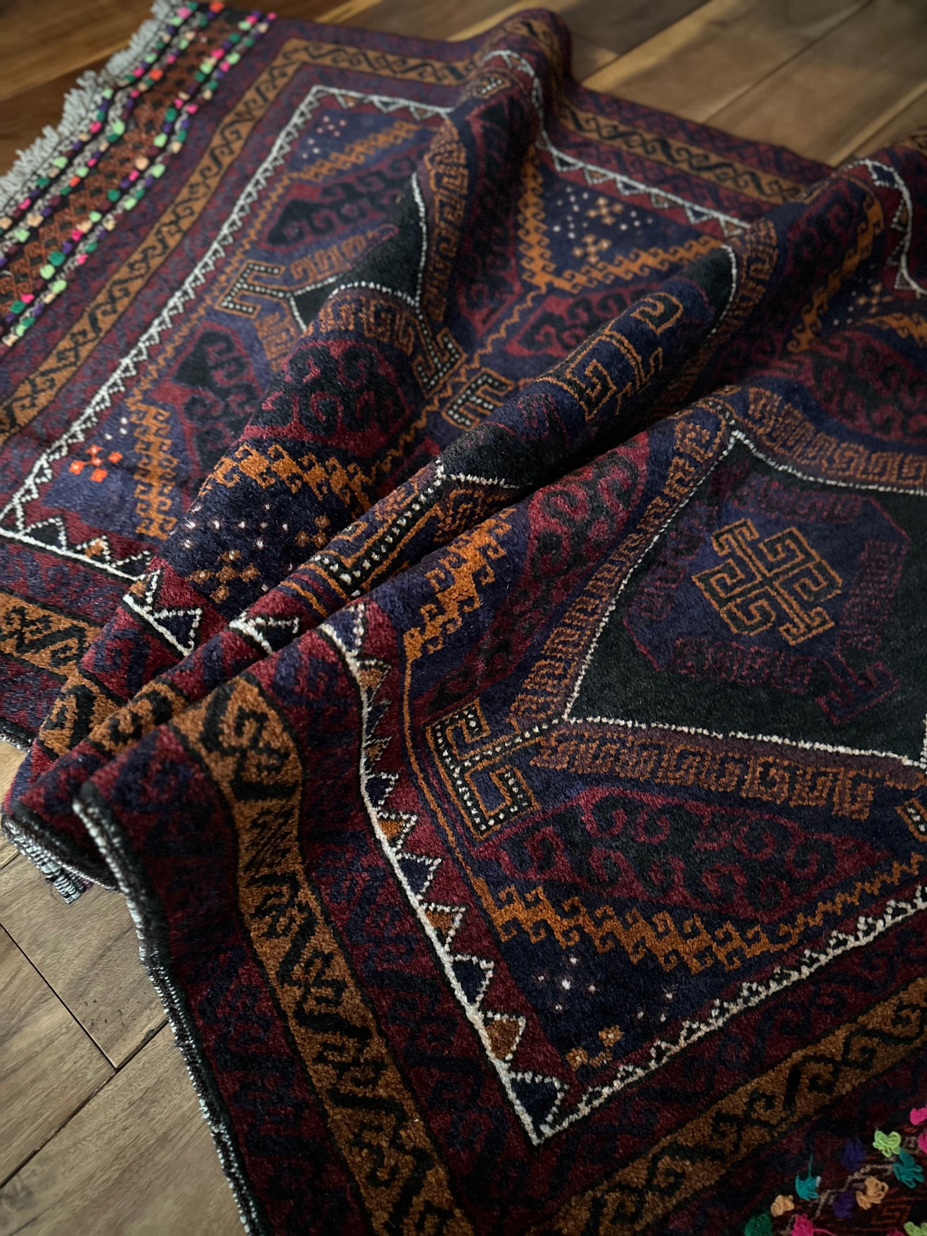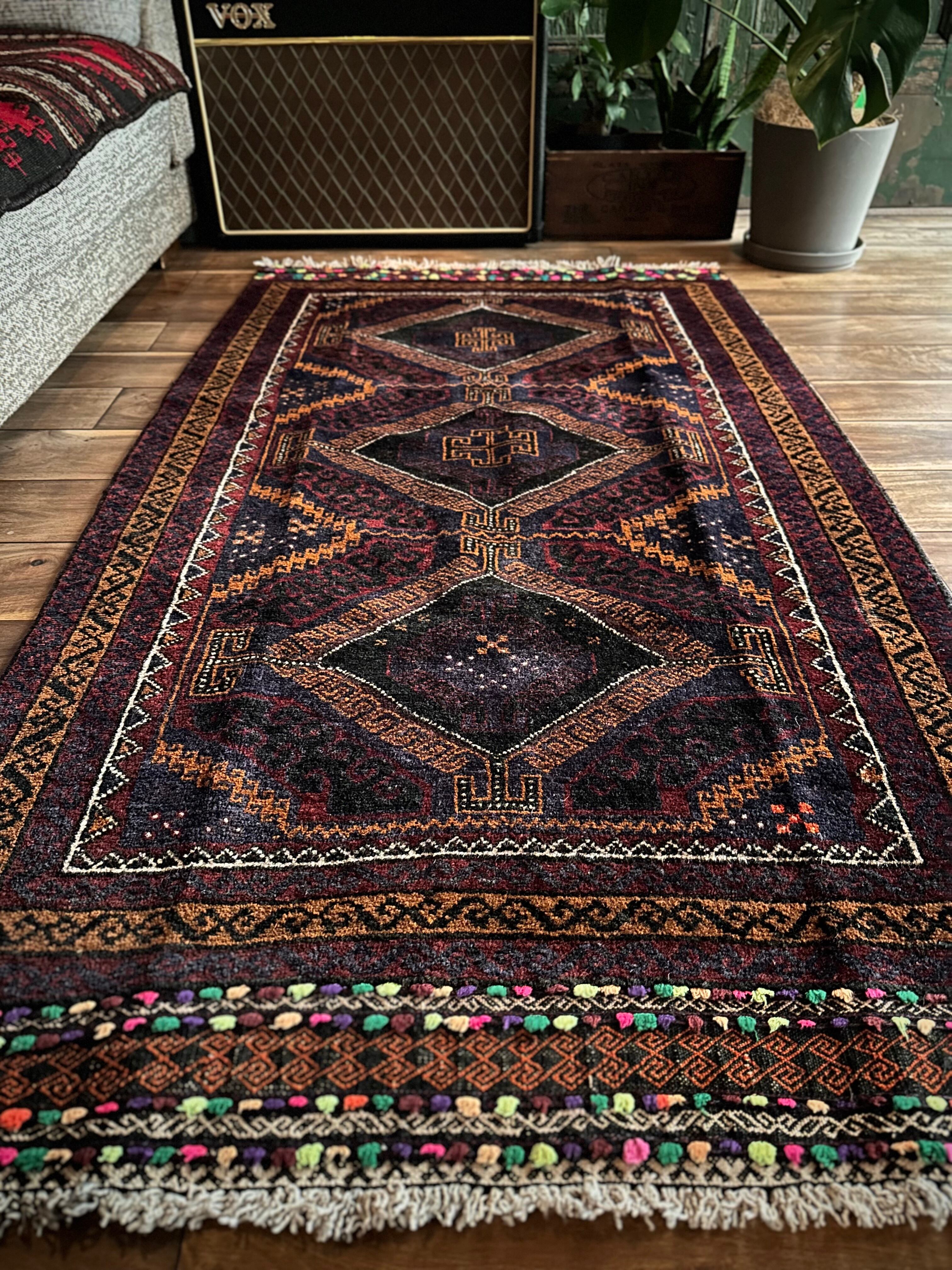 全体的に深みのある色合いにカフェブラウンが浮き彫りにされた"Zinjir gul”と呼ばれる紋様がかっこよく、チェーンの連続模様でミルフィーユされたボーダー部分がバルーチらしいでしょうか。5ミリという薄手になりますのでタペストリーとしても良さげです。