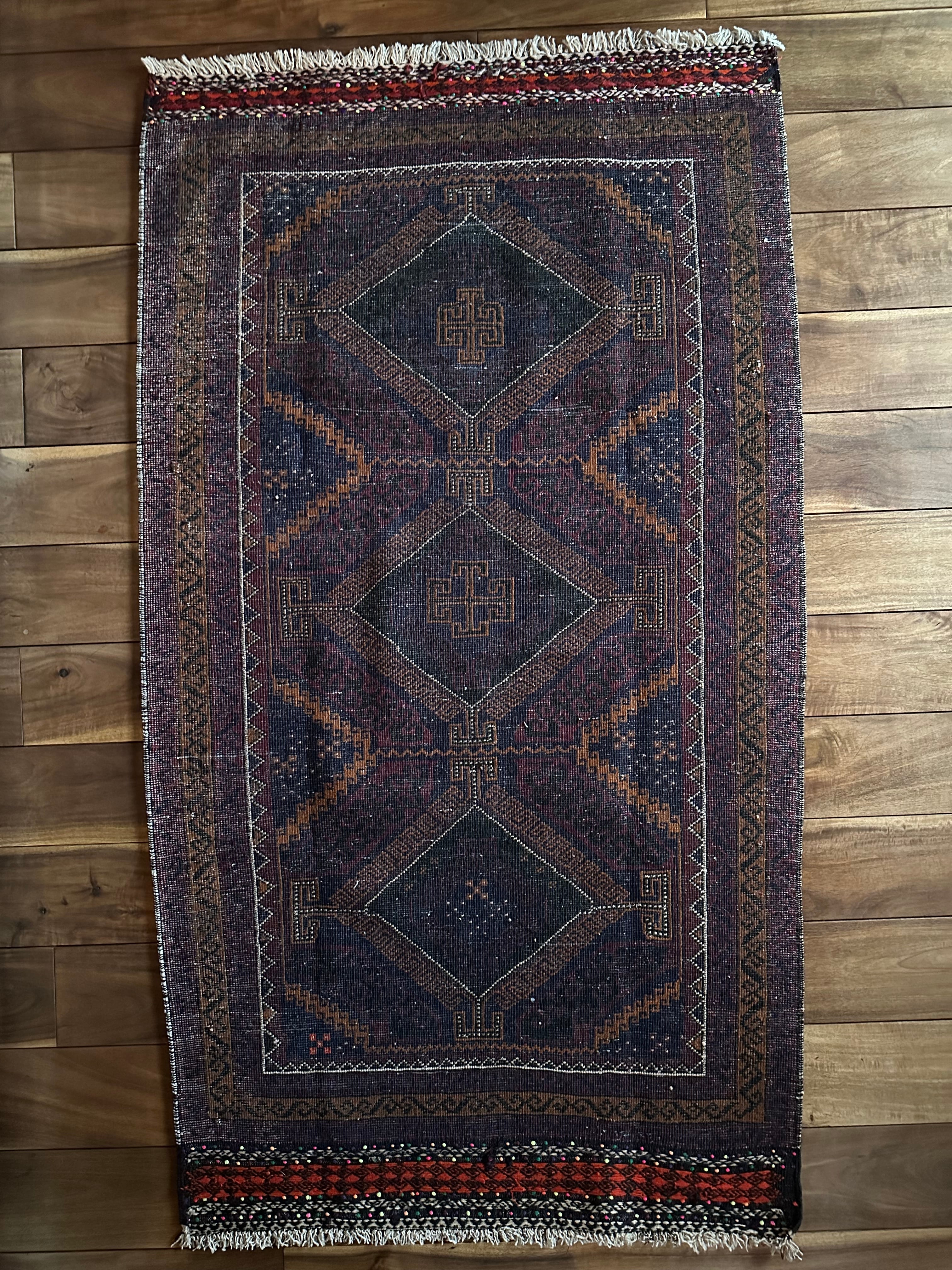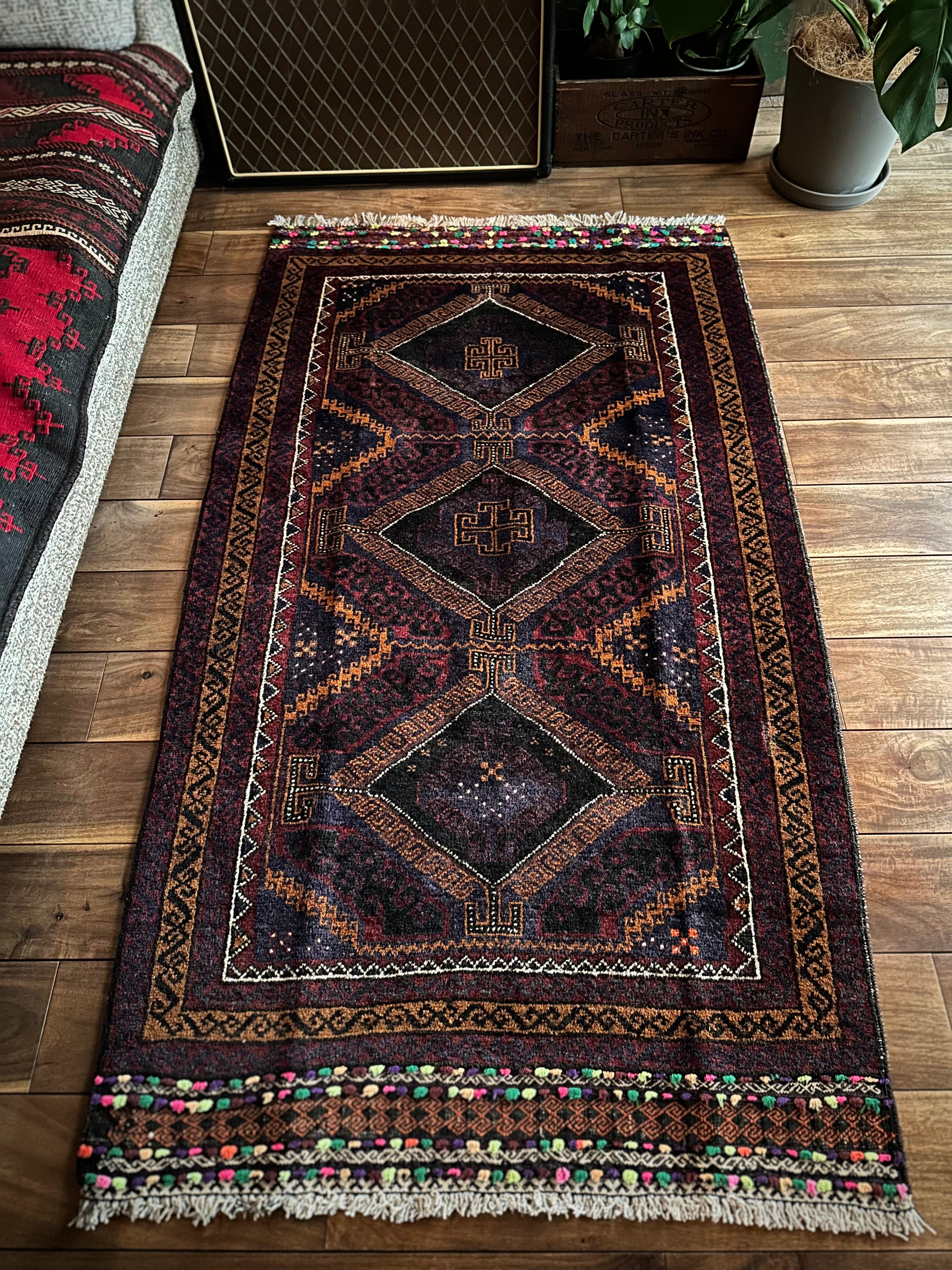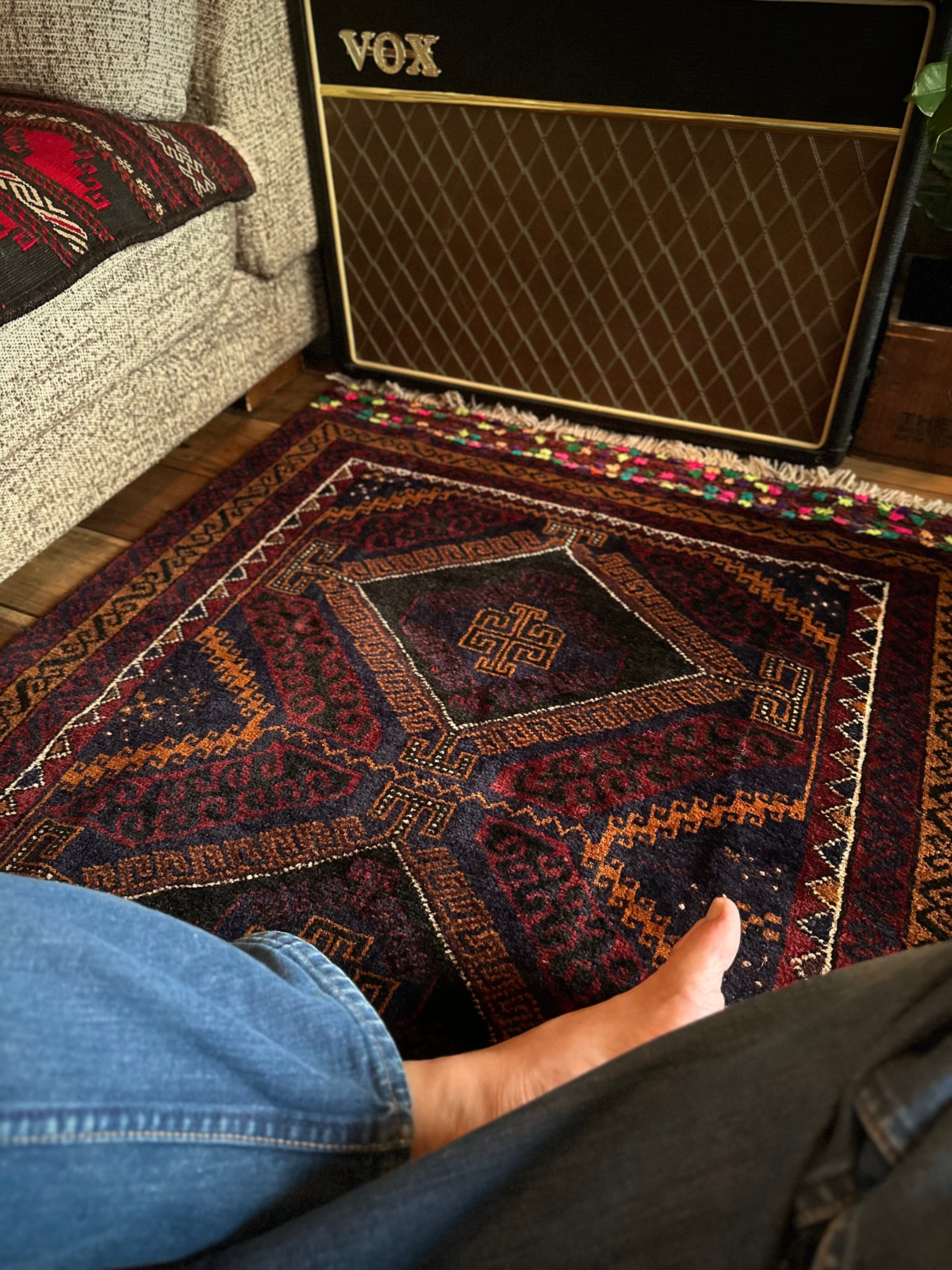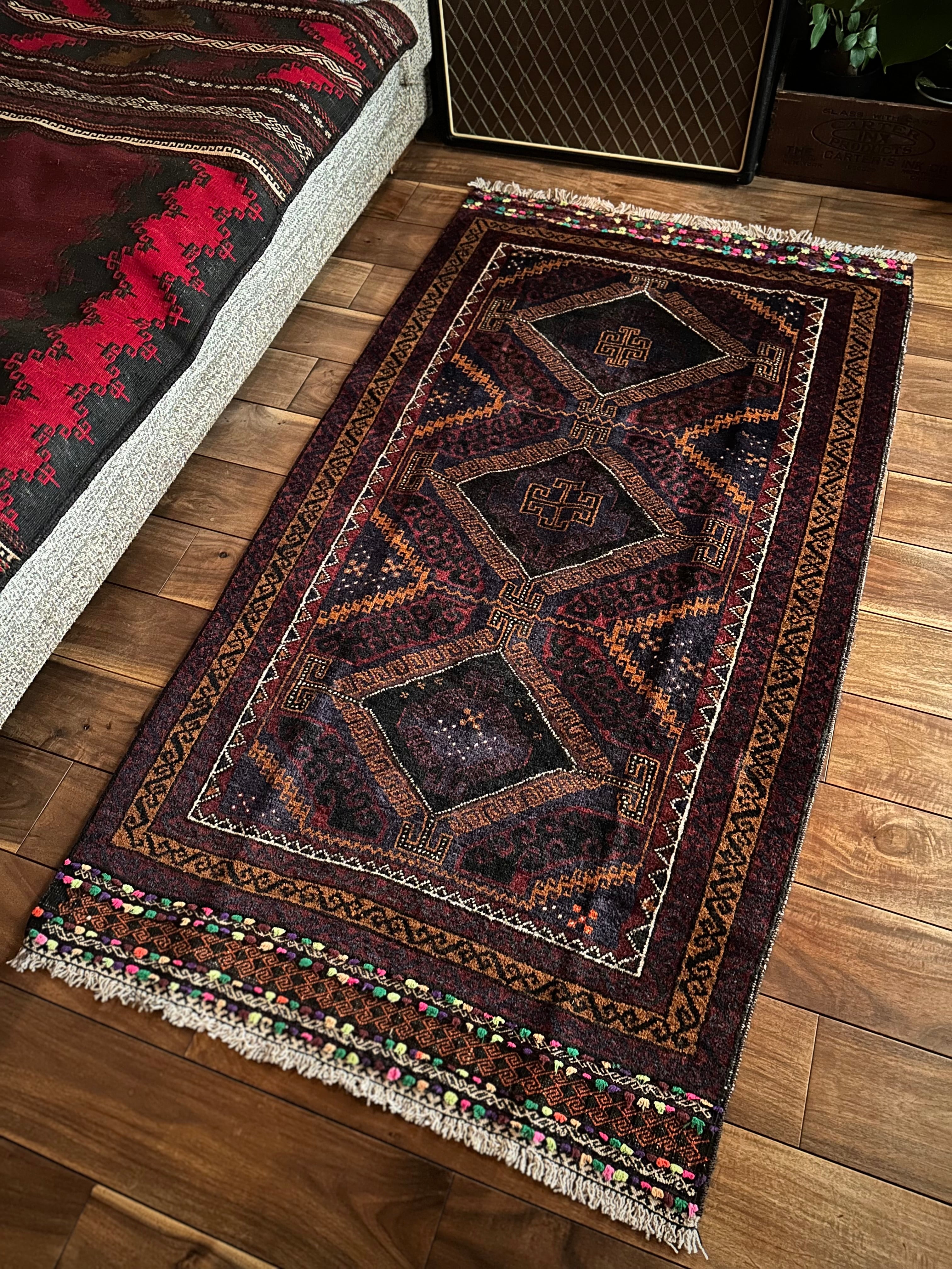 全体的に深みのある色合いにカフェブラウンが浮き彫りにされた"Zinjir gul”と呼ばれる紋様がかっこよく、チェーンの連続模様でミルフィーユされたボーダー部分がバルーチらしいでしょうか。5ミリという薄手になりますのでタペストリーとしても良さげです。