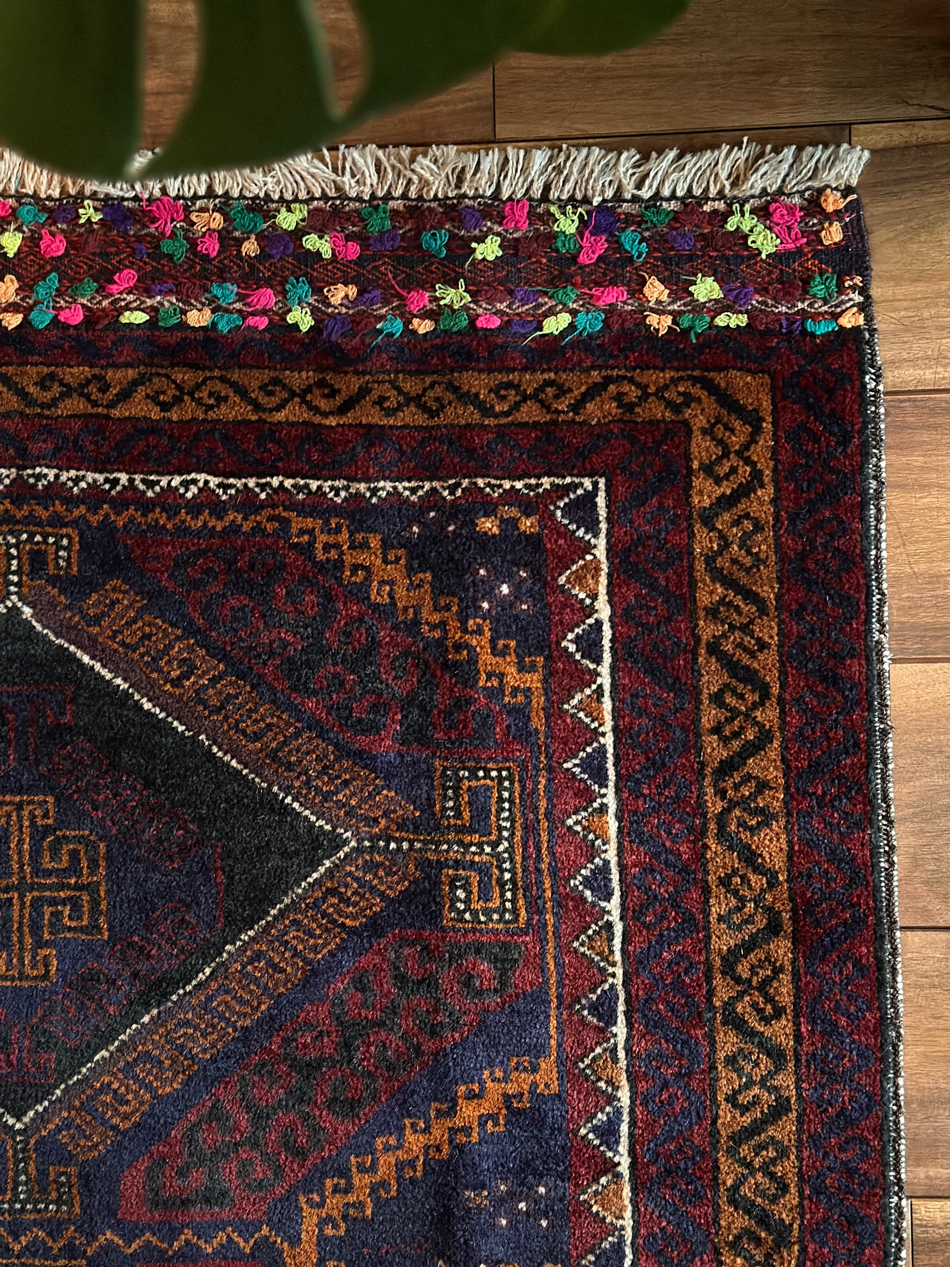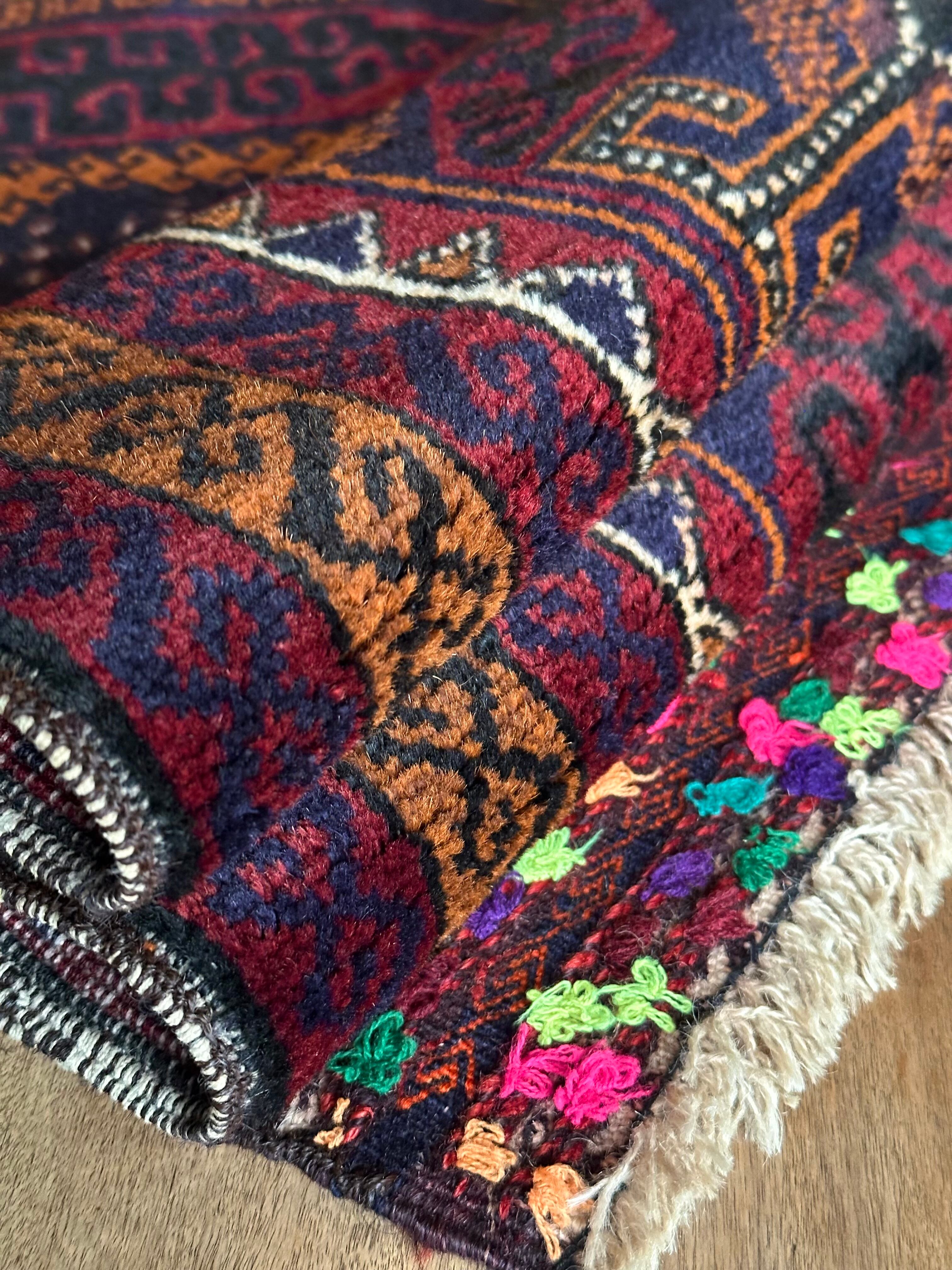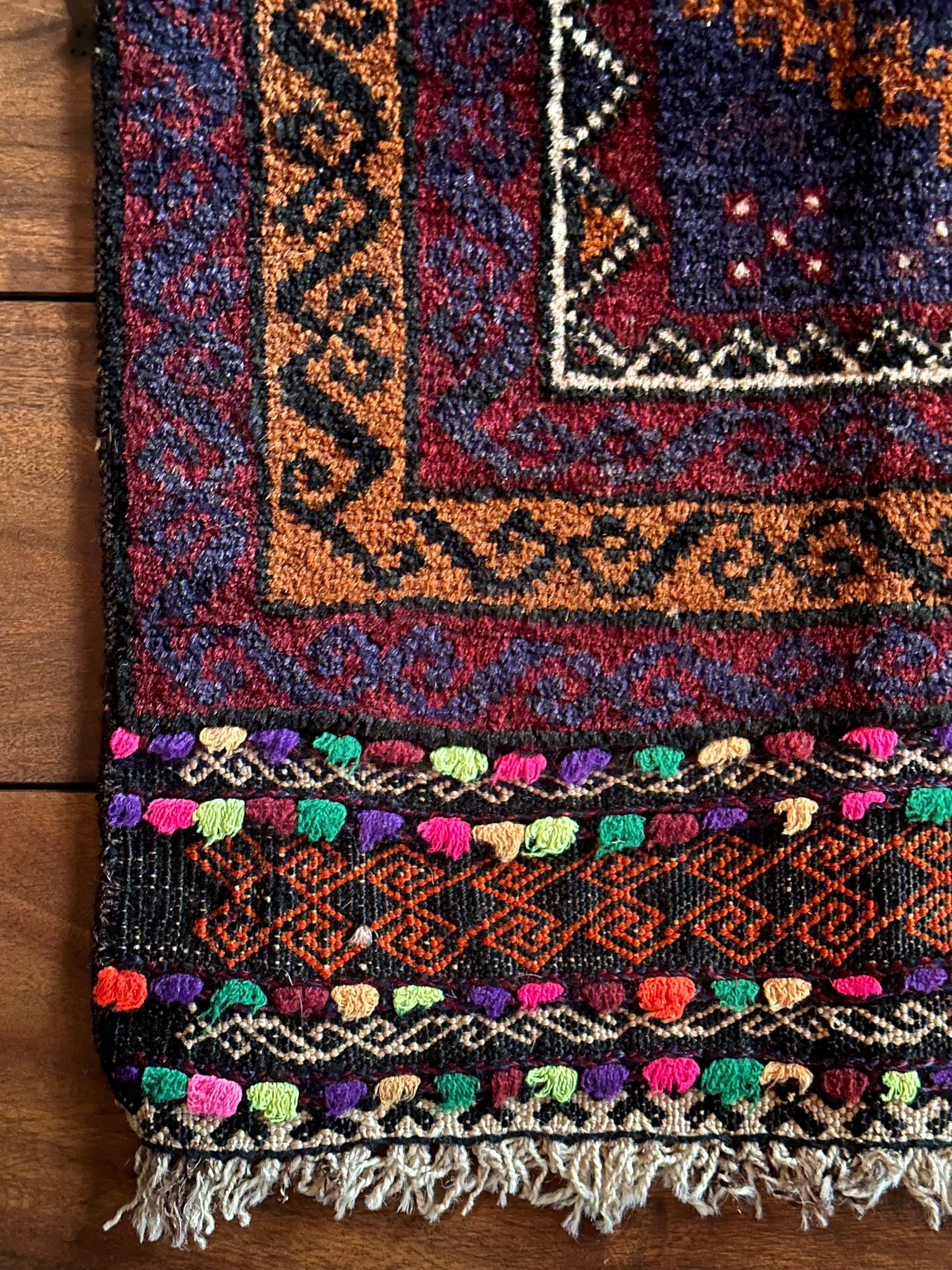 キリムエンドに飾られた蛍光の刺繍が目を惹くバルーチ族のトライバルラグになります。袋物のバーリシトにしてはやや大きいかと思いますが、派手な装飾のキリムエンドからしてお祝いなどの祭り事に織られた1枚かと推測します。