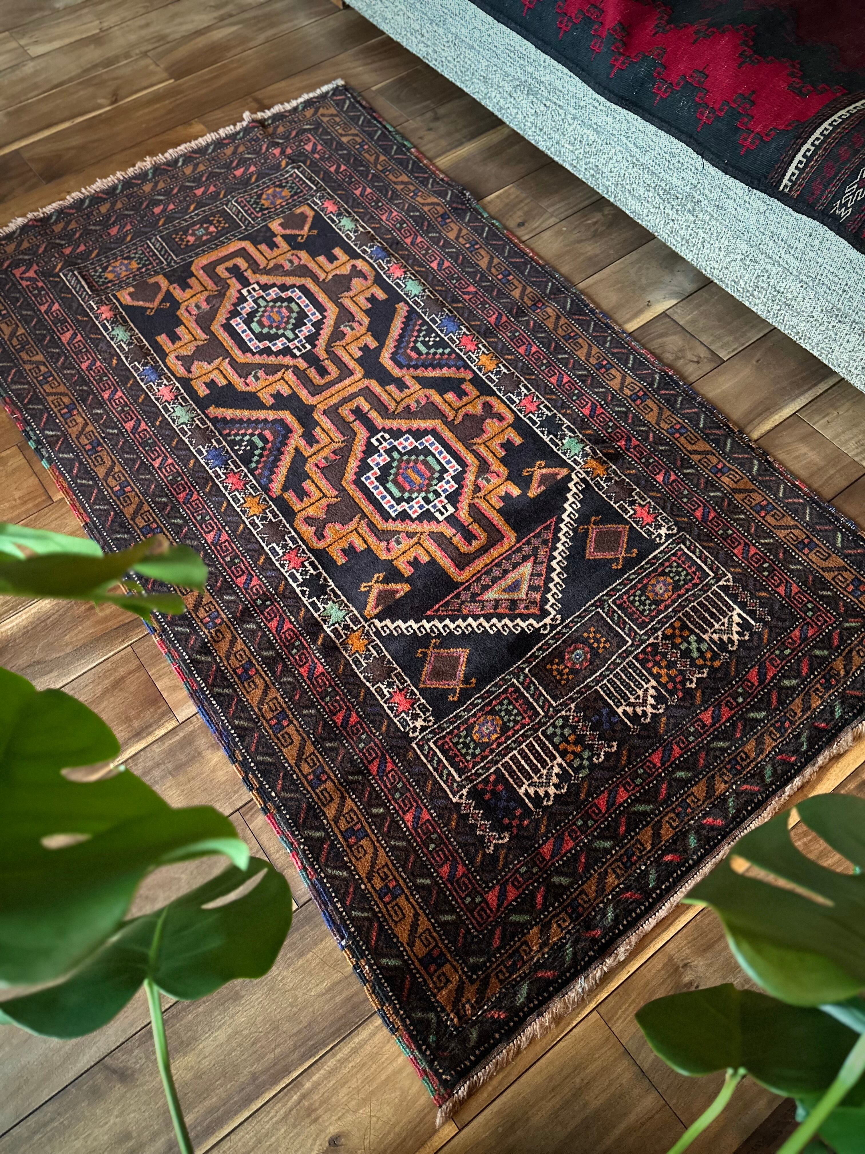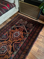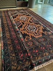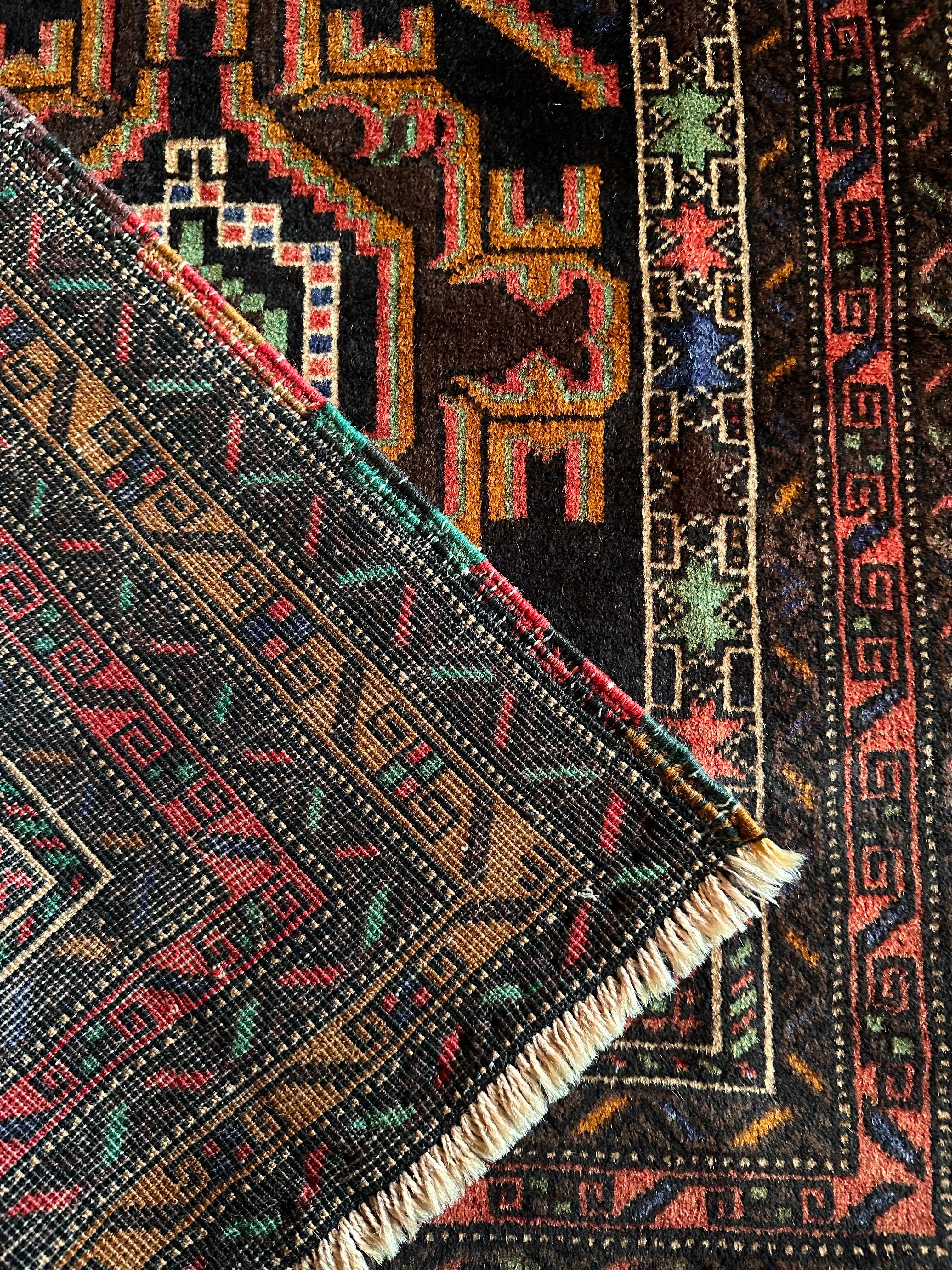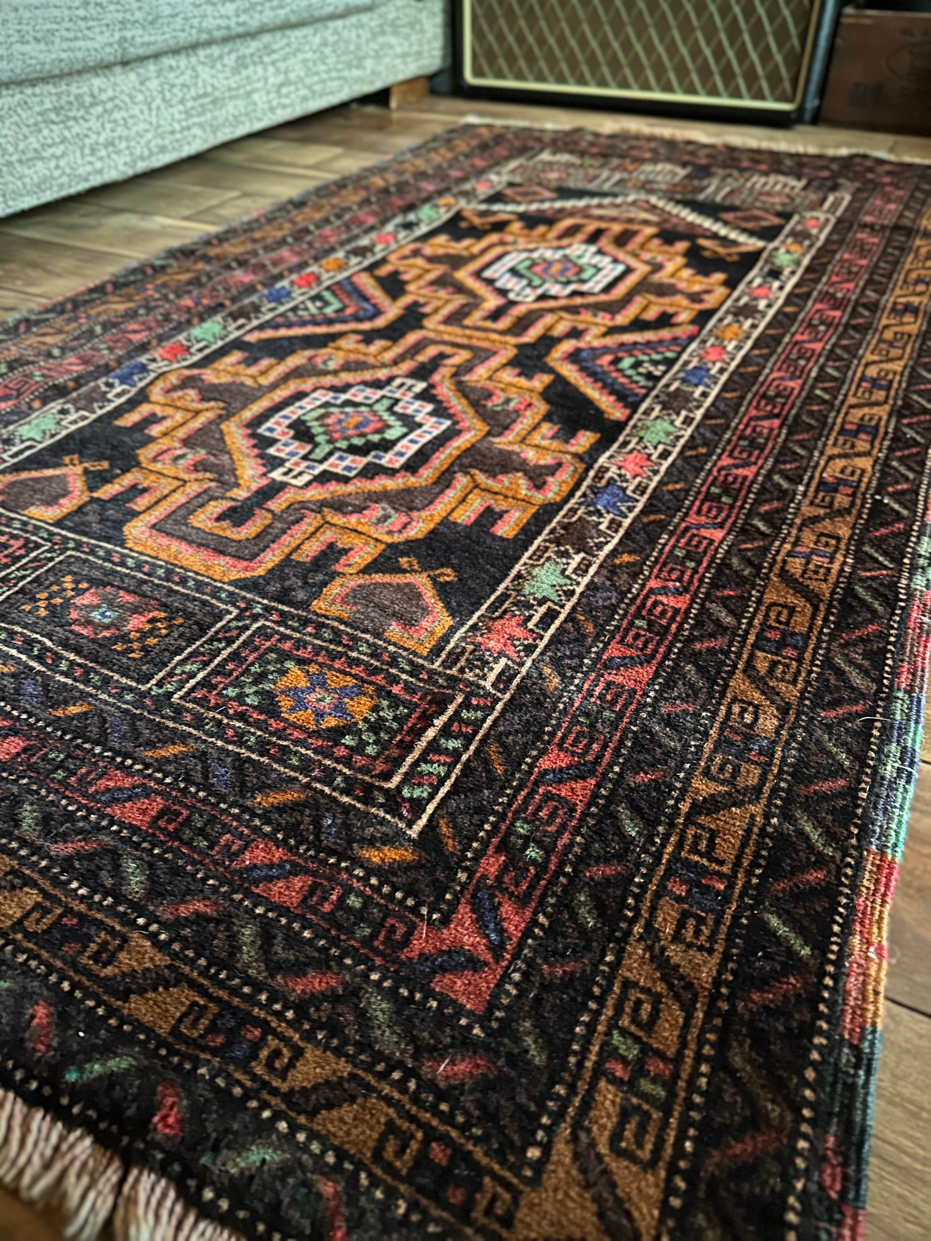 モザイクアートの様なメダリオンにウネウネとした蛇が巻き付いた奇妙な絵柄に目を奪われる、アフガニスタン西部はヘラート州に居住するバルーチ族のトライバルラグになります。