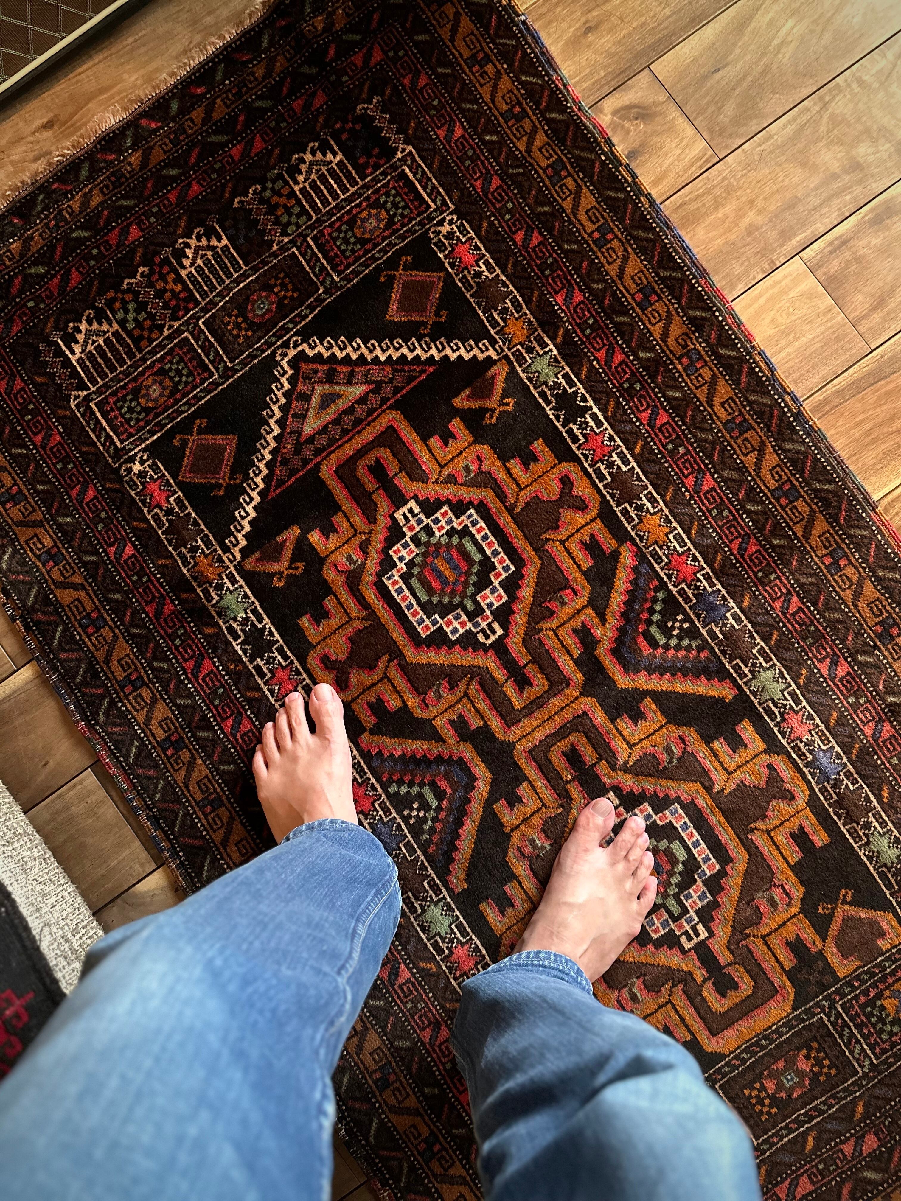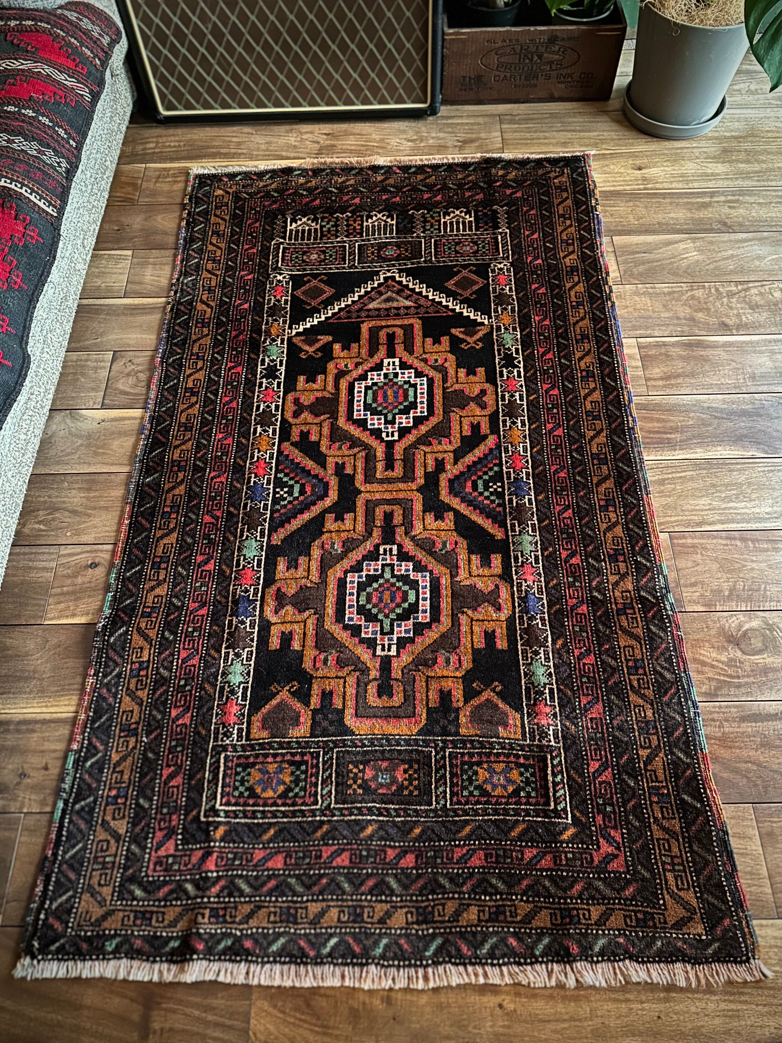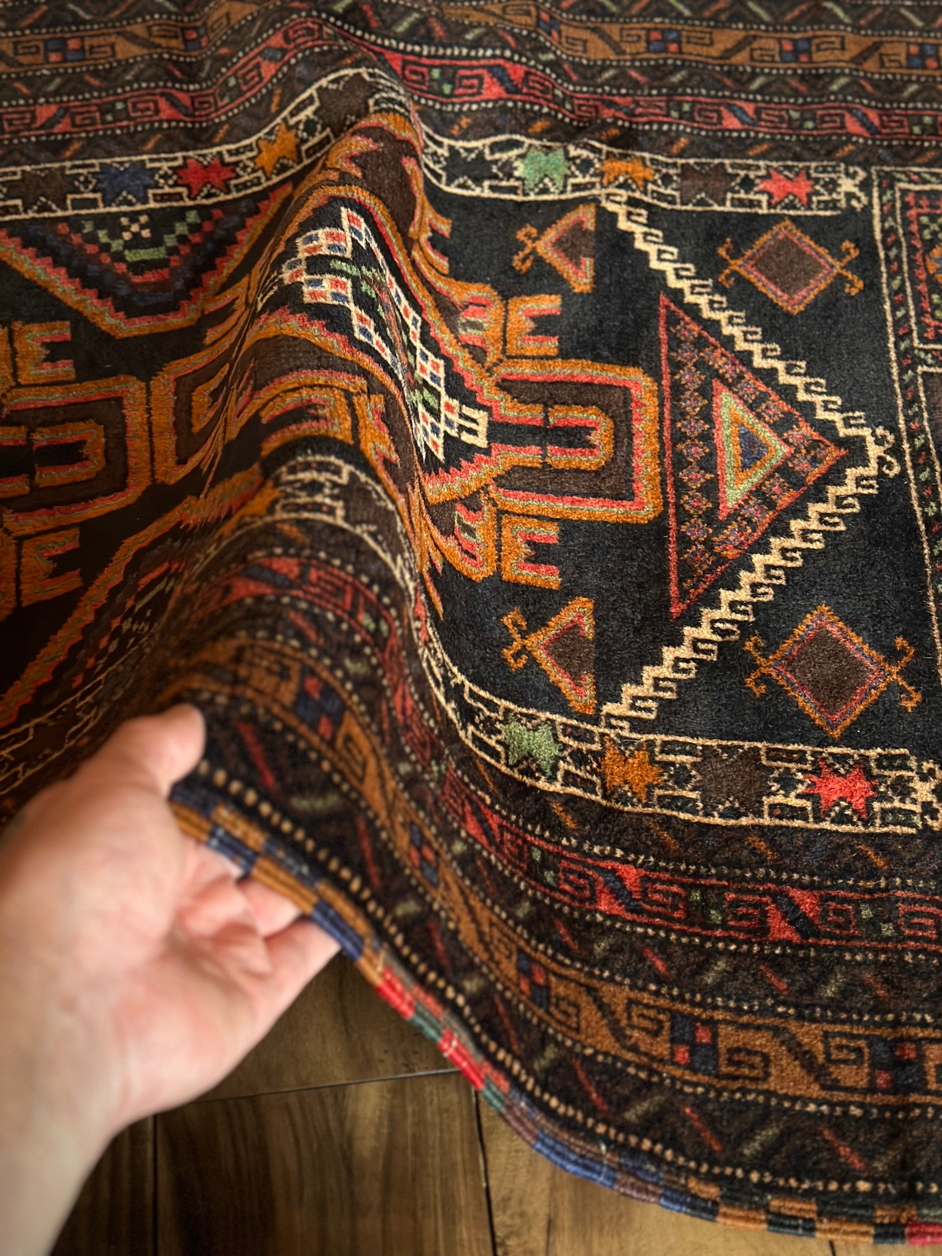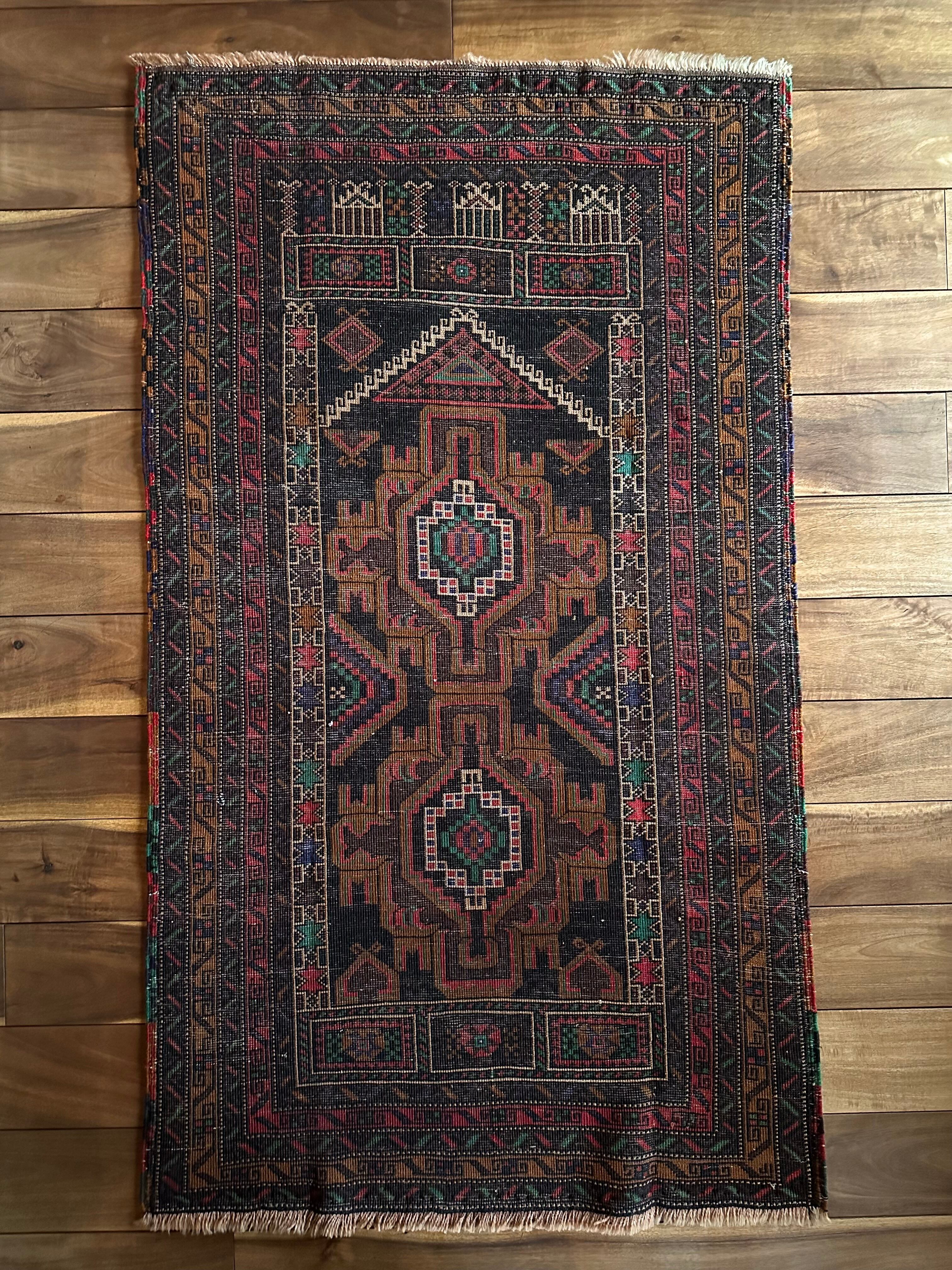 モザイクアートの様なメダリオンにウネウネとした蛇が巻き付いた奇妙な絵柄に目を奪われる、アフガニスタン西部はヘラート州に居住するバルーチ族のトライバルラグになります。