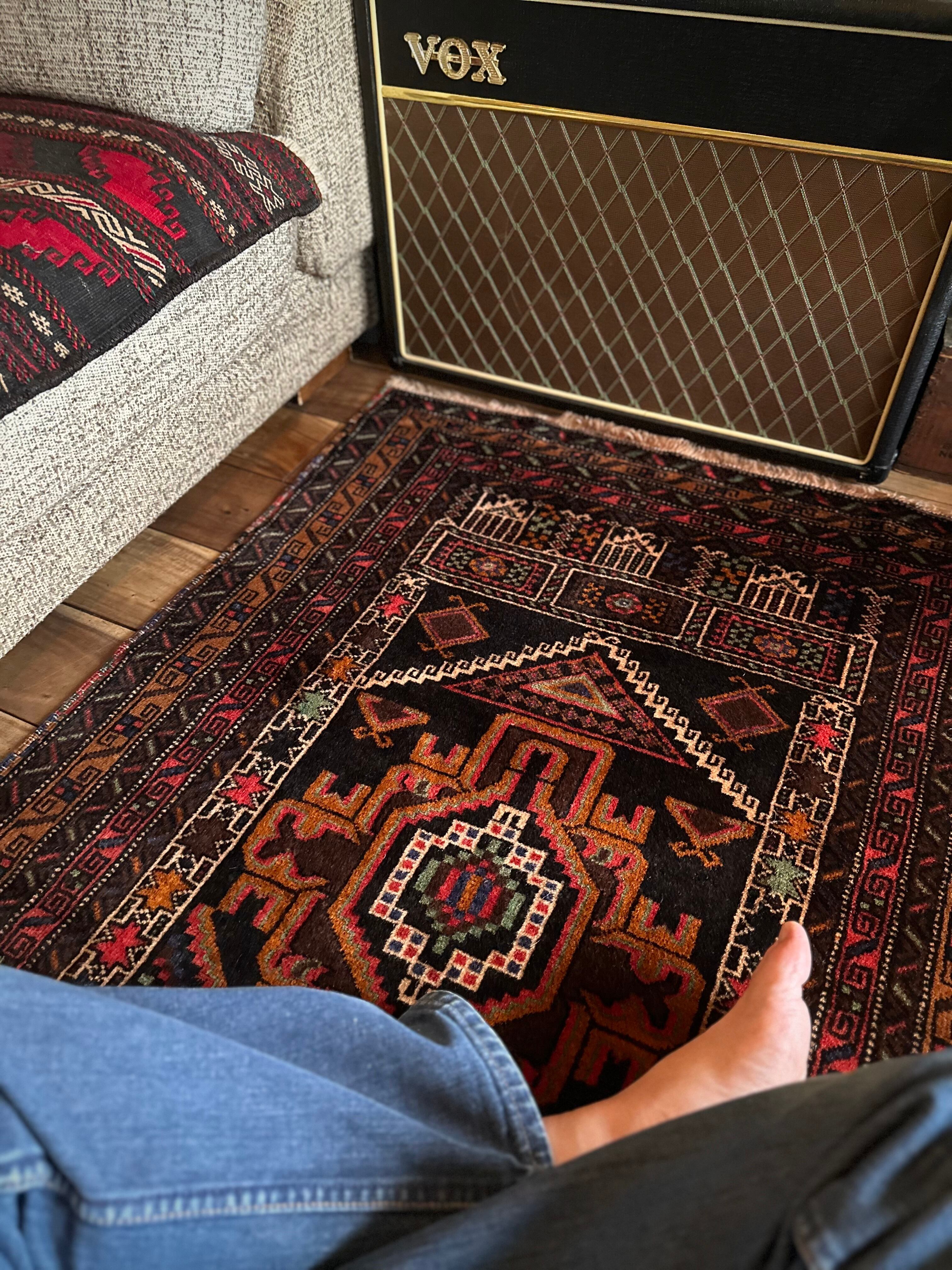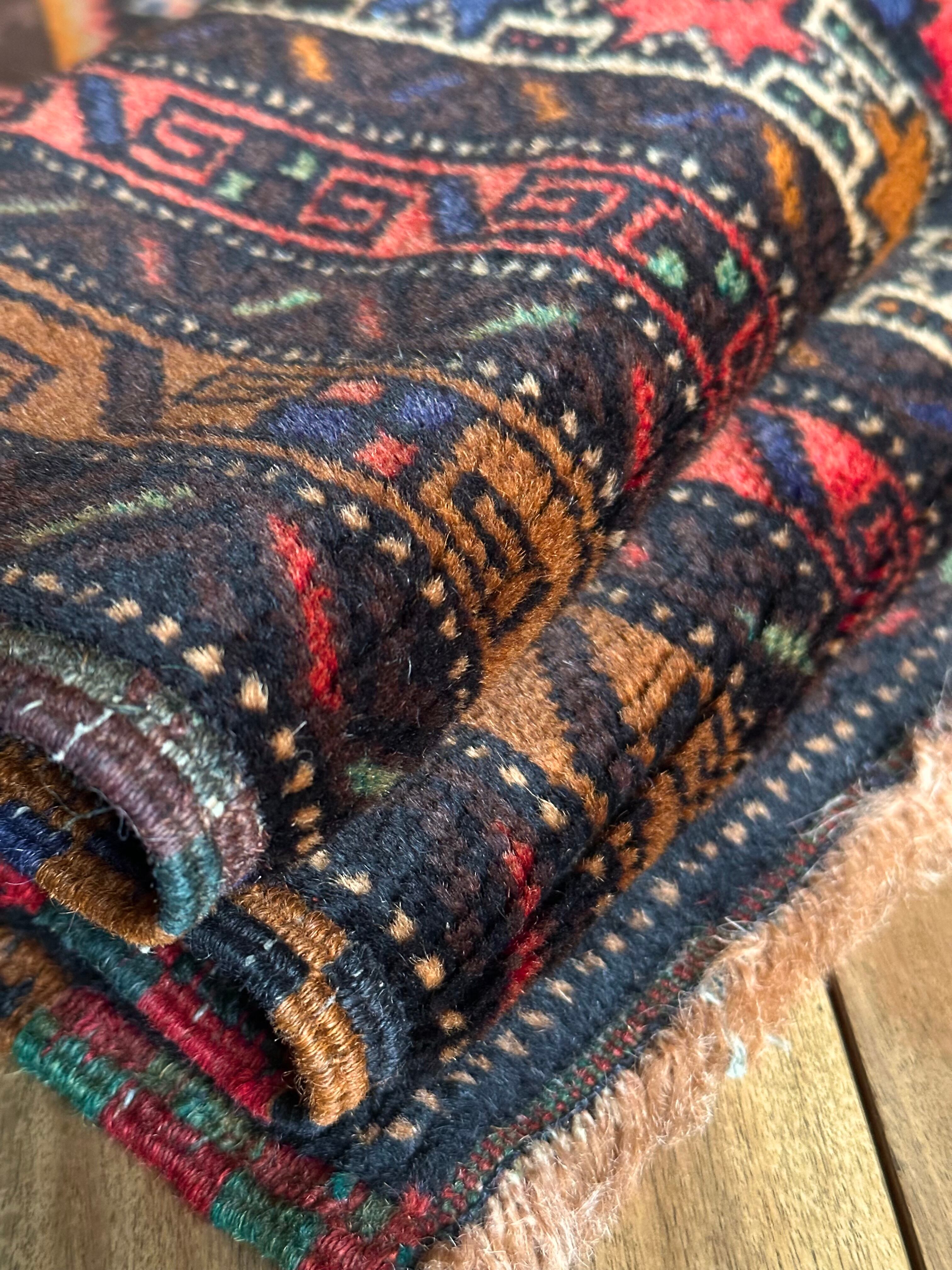 全体的にはダークトーンながらもカラフルな八芒星にセルベッチが際立った祈祷用のプレイヤーラグで、折り重なったミルフィーユ状のボーダーも素晴らしく、なんと言っても密度のある短めなパイルの手触りがアラーへの祈りを深めてくれます。