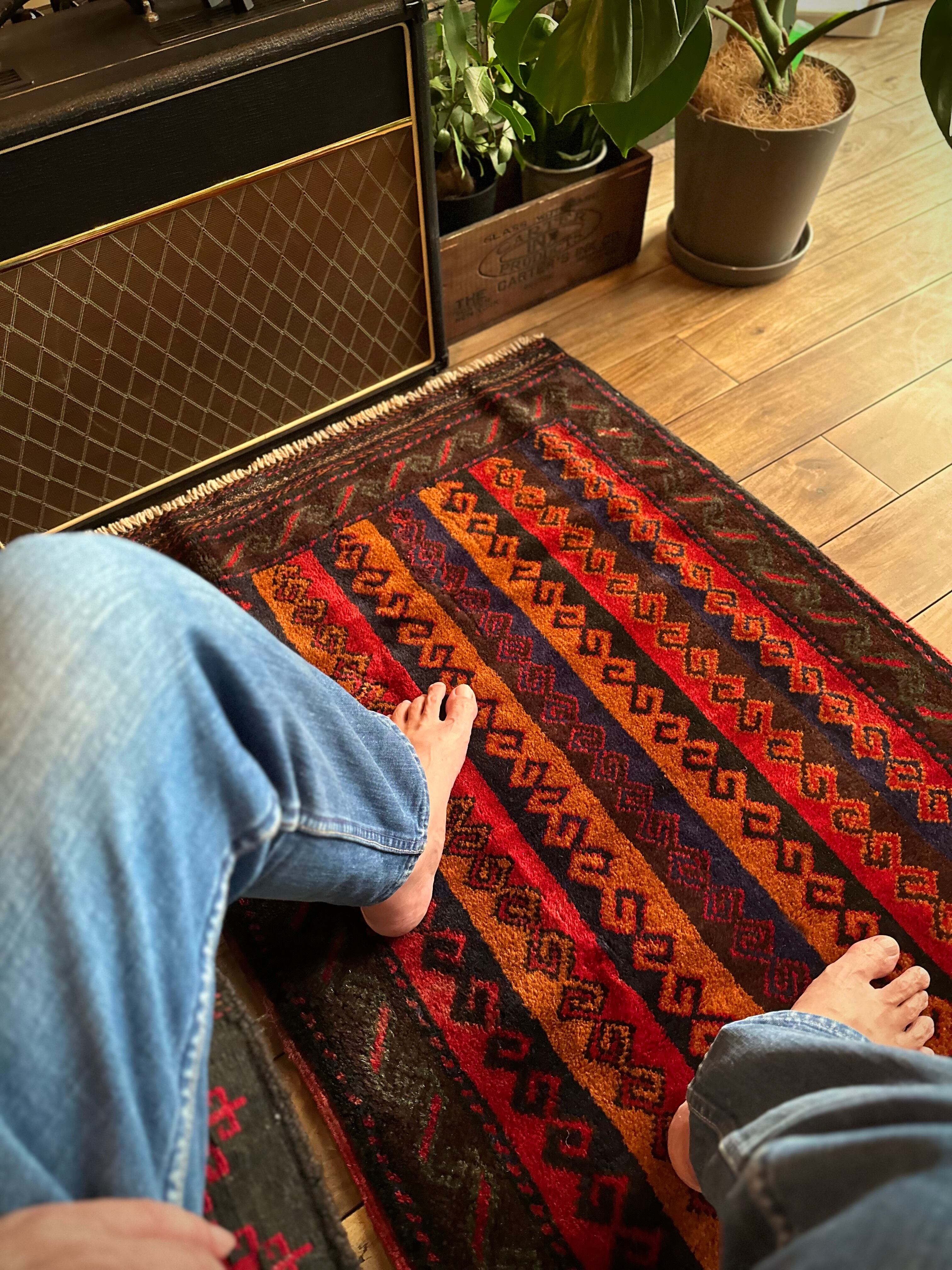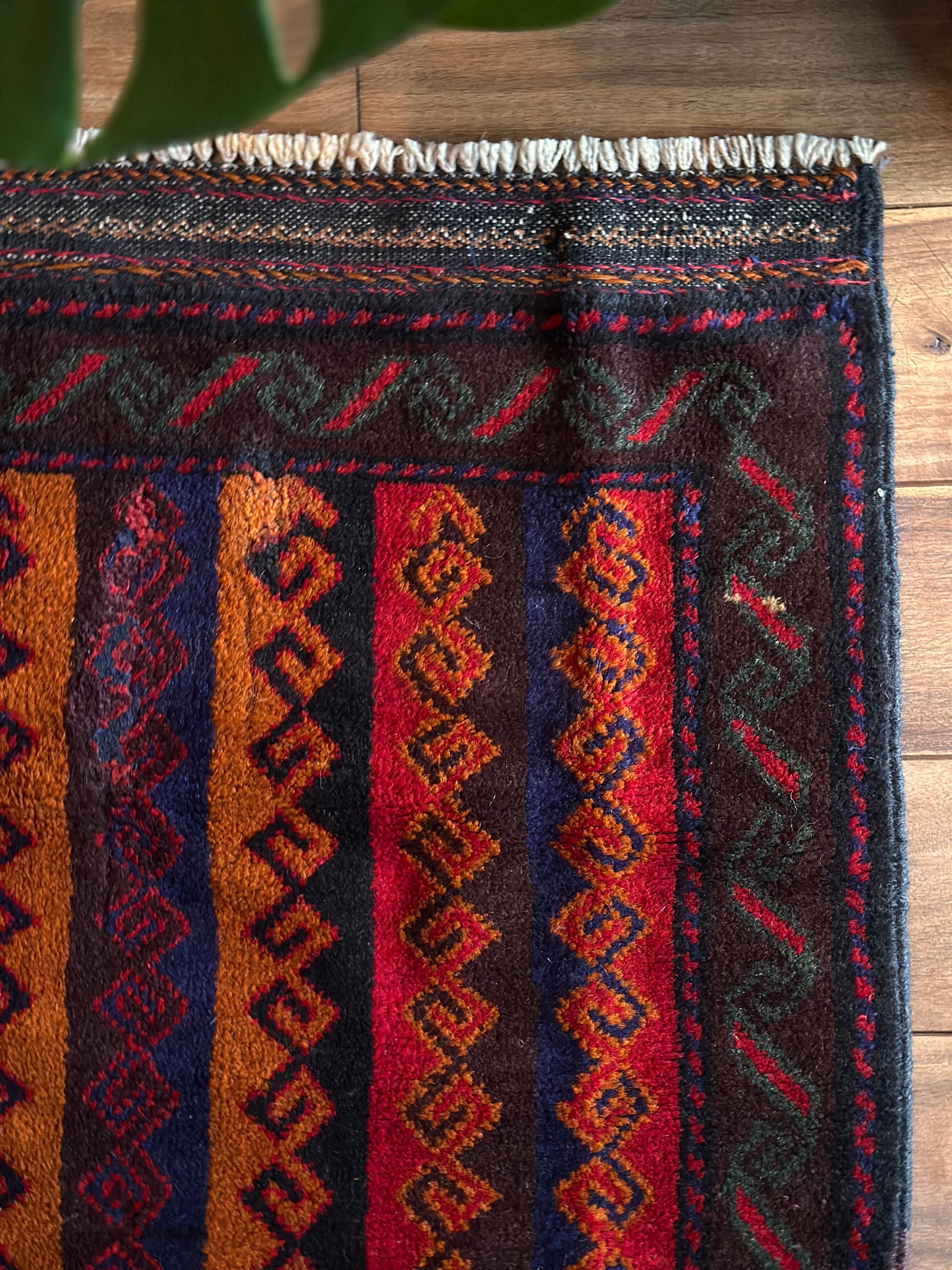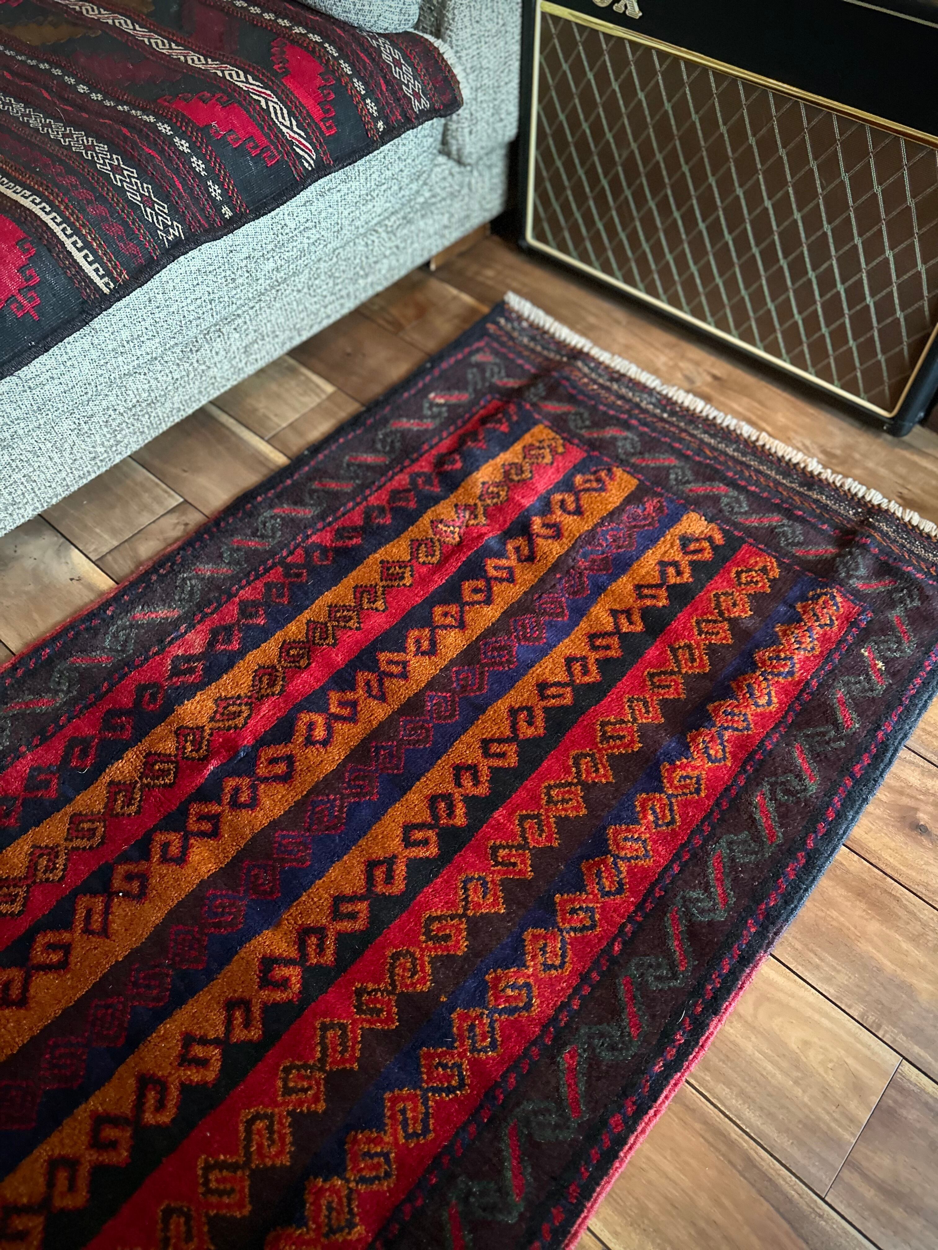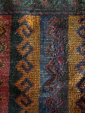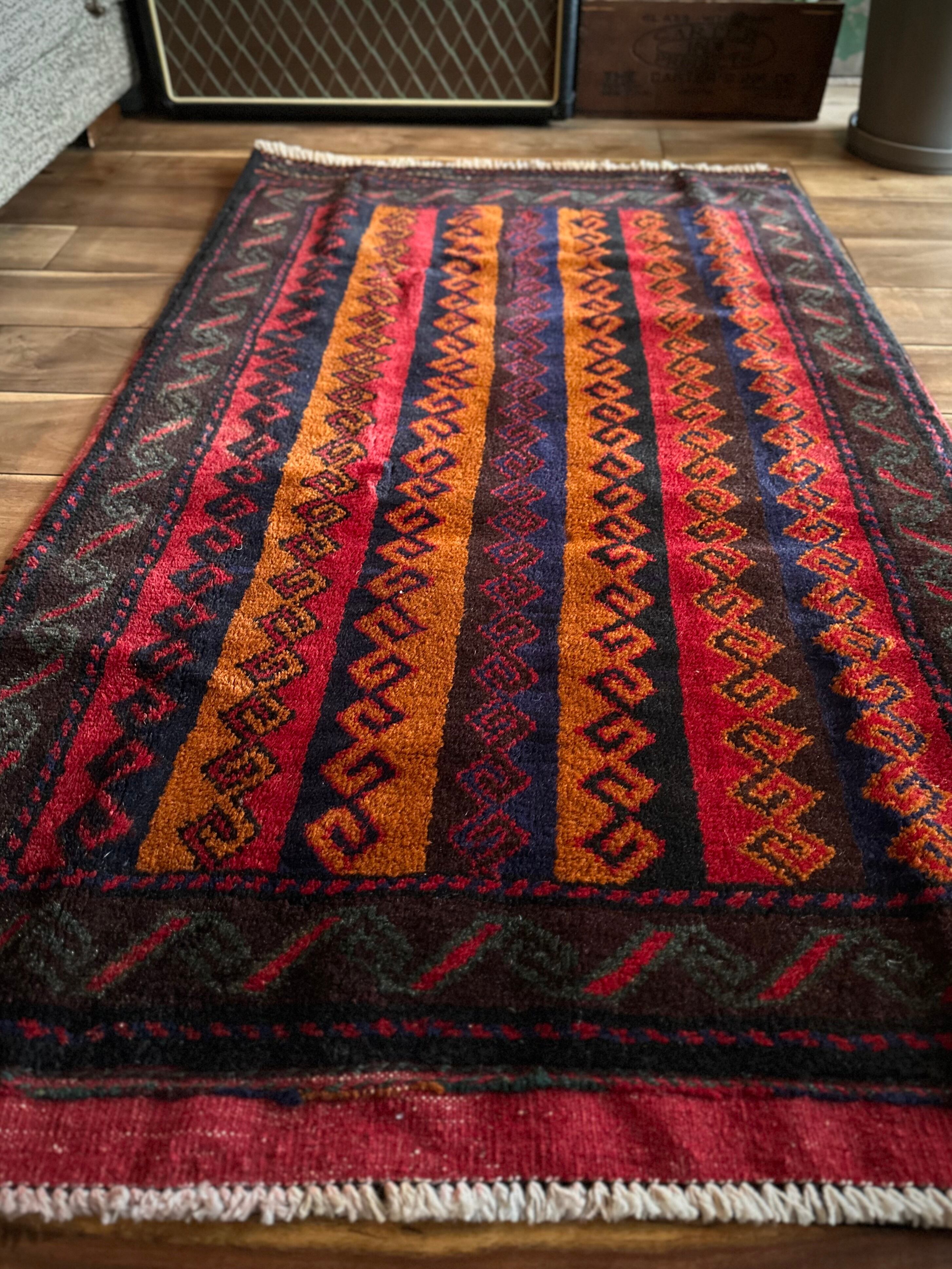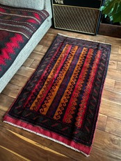 眼を見張るほどの鮮やかな色合いに、バルーチ族らしいランニングドッグが描かれたトライバルラグで、元々は収納やクッションとして使用されていたバーリシトという袋物の表皮をラグに仕立て直してもらったモノになります。