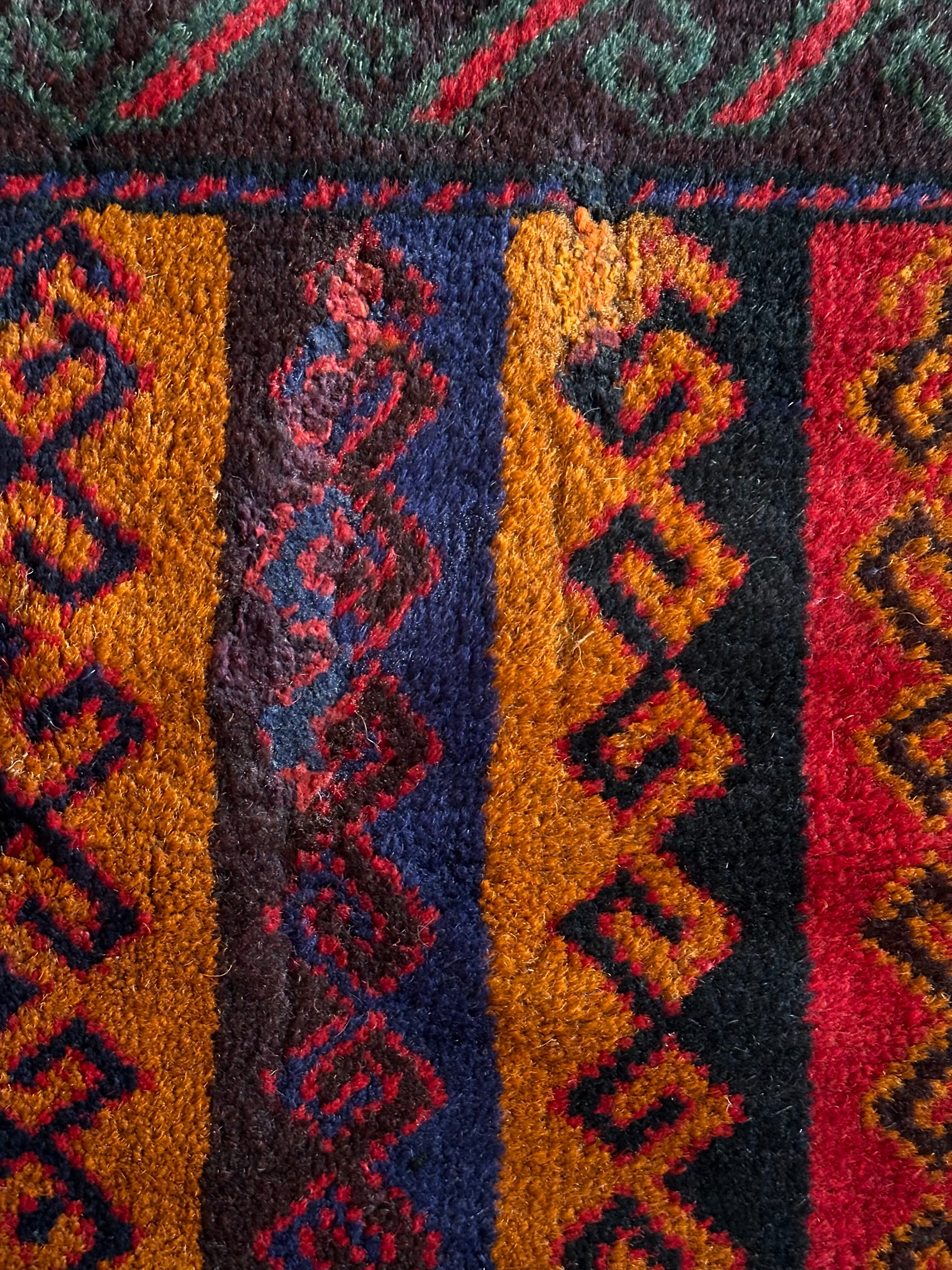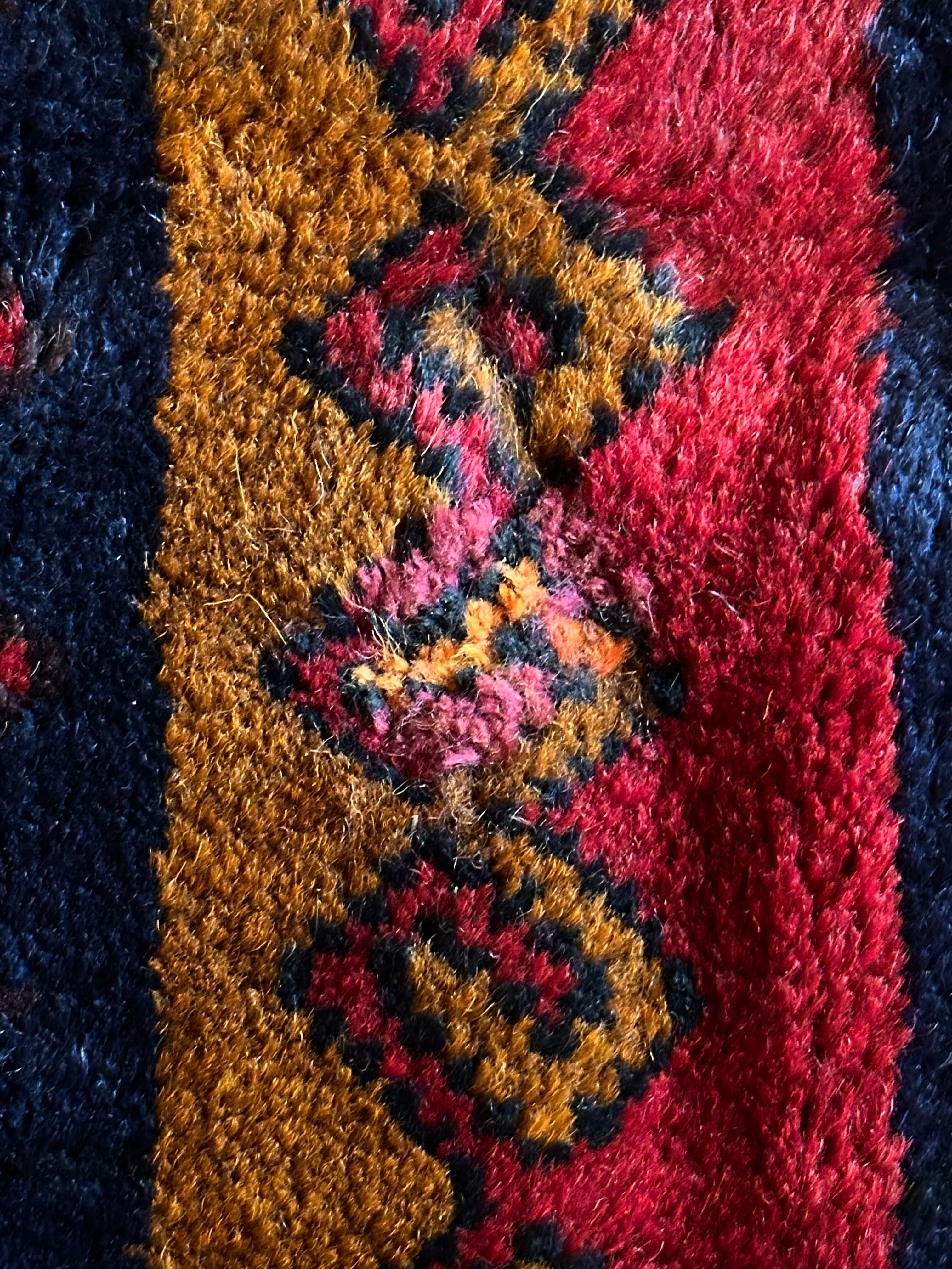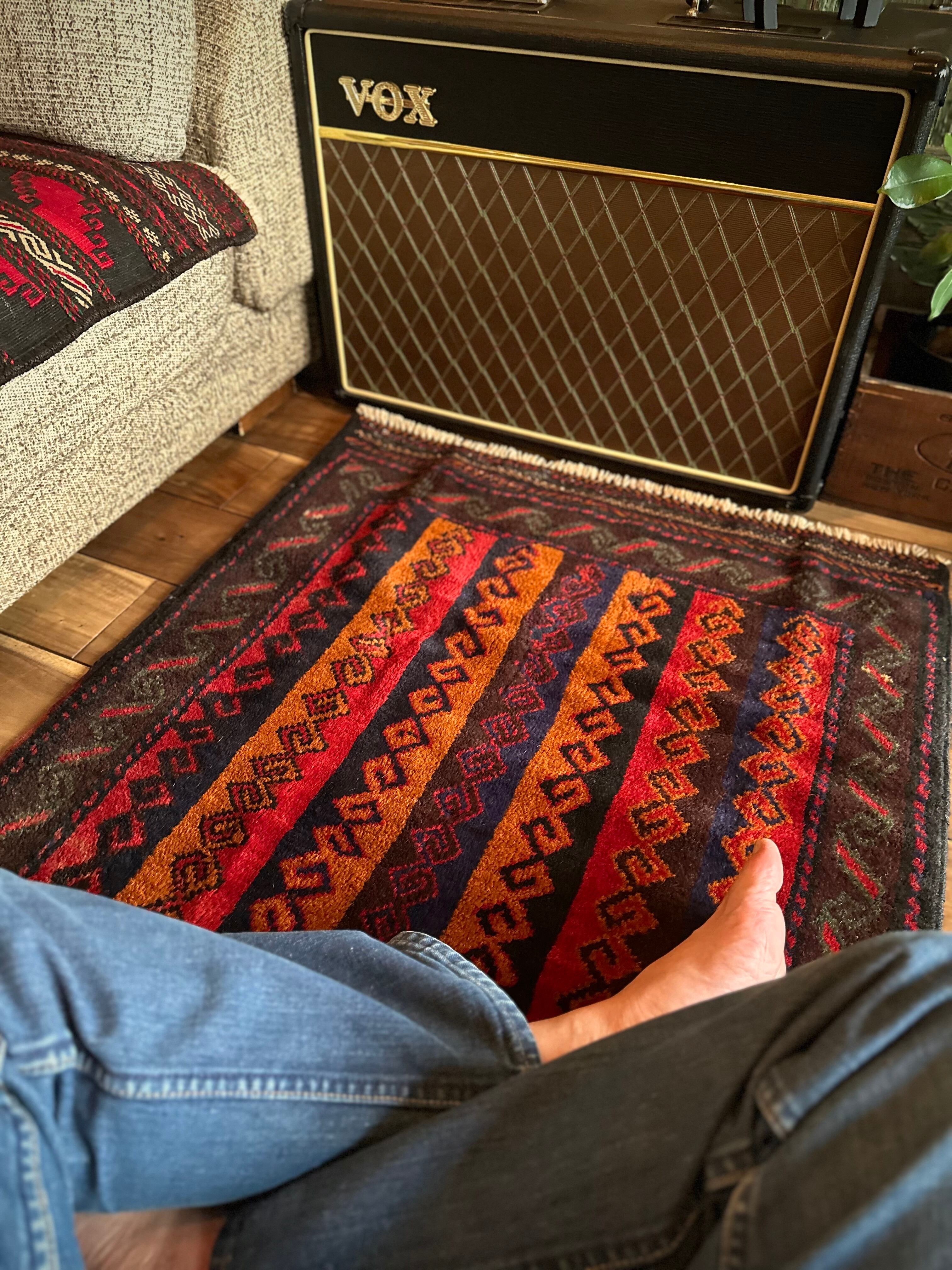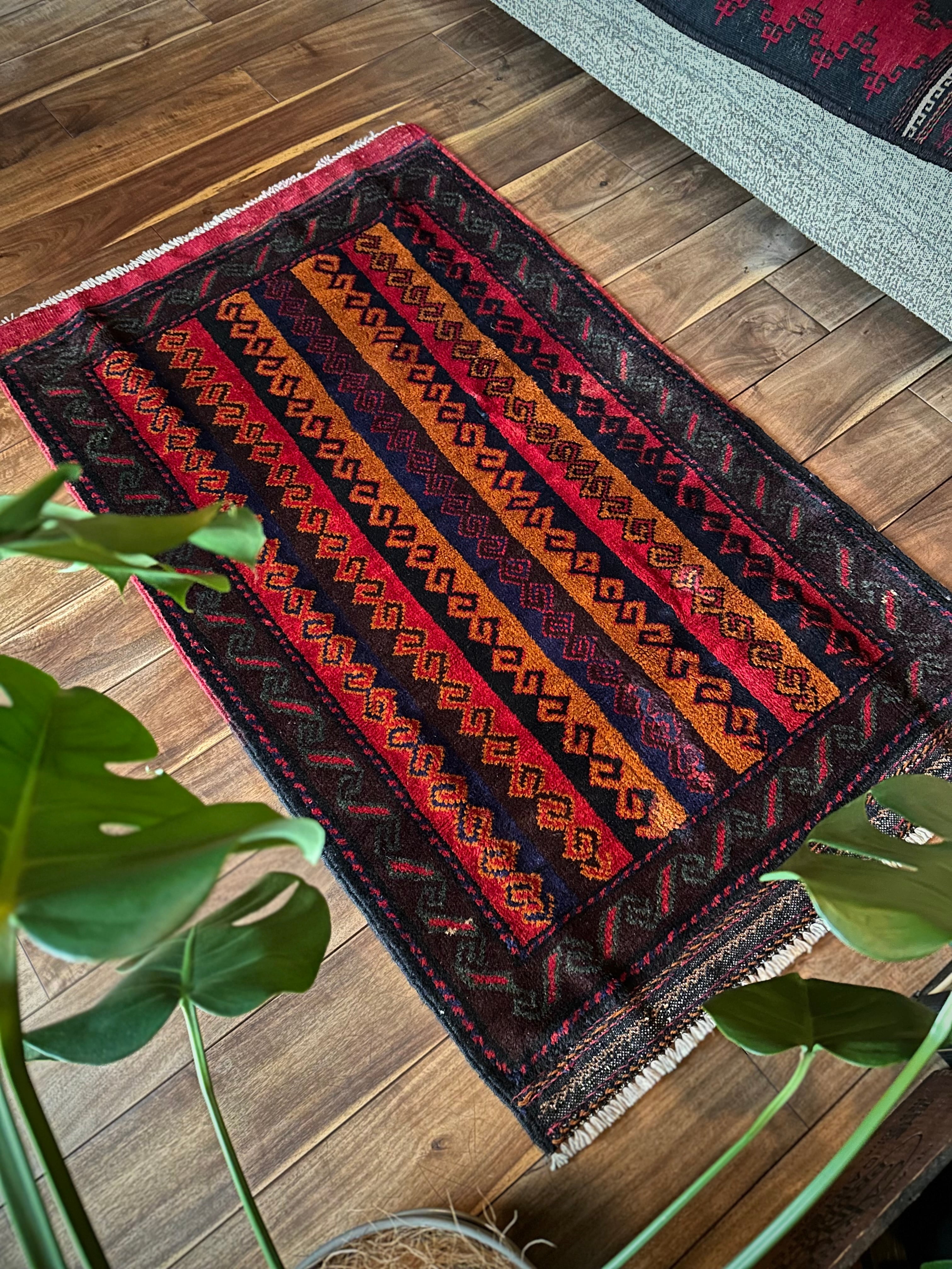 眼を見張るほどの鮮やかな色合いに、バルーチ族らしいランニングドッグが描かれたトライバルラグで、元々は収納やクッションとして使用されていたバーリシトという袋物の表皮をラグに仕立て直してもらったモノになります。