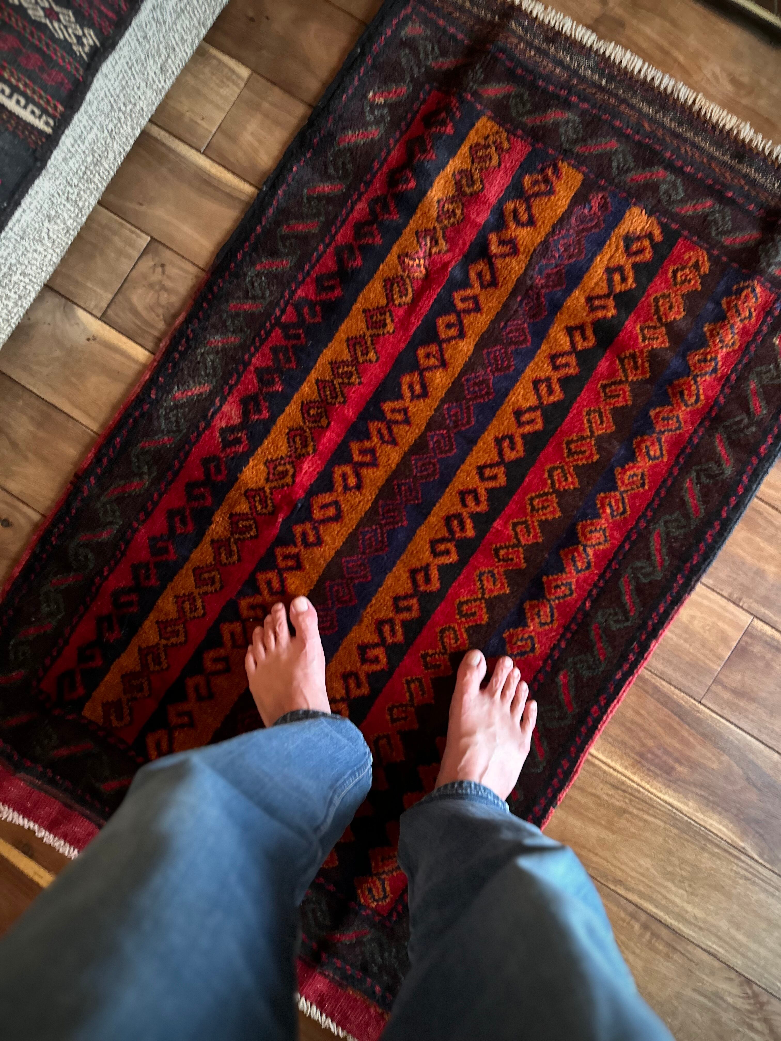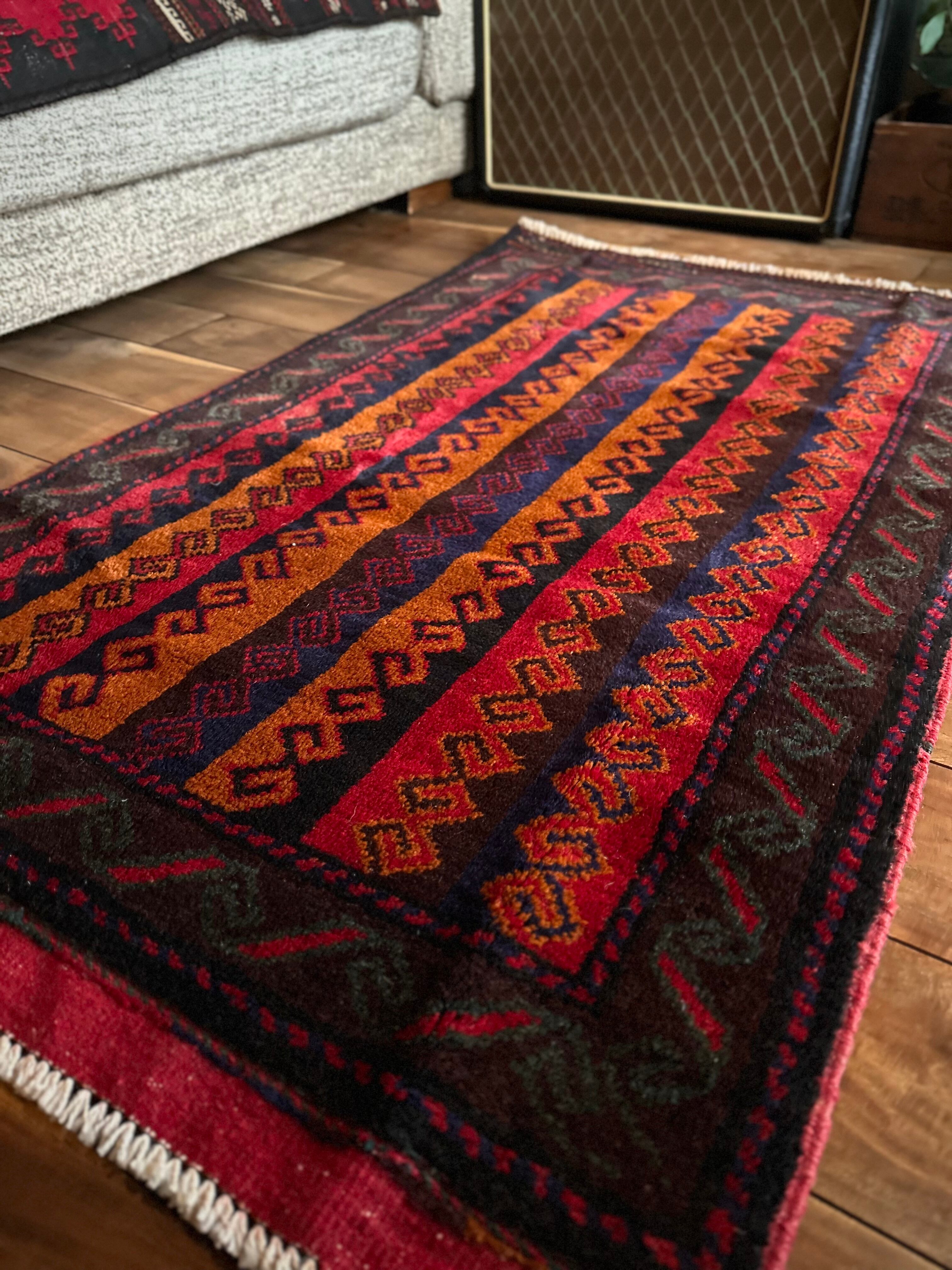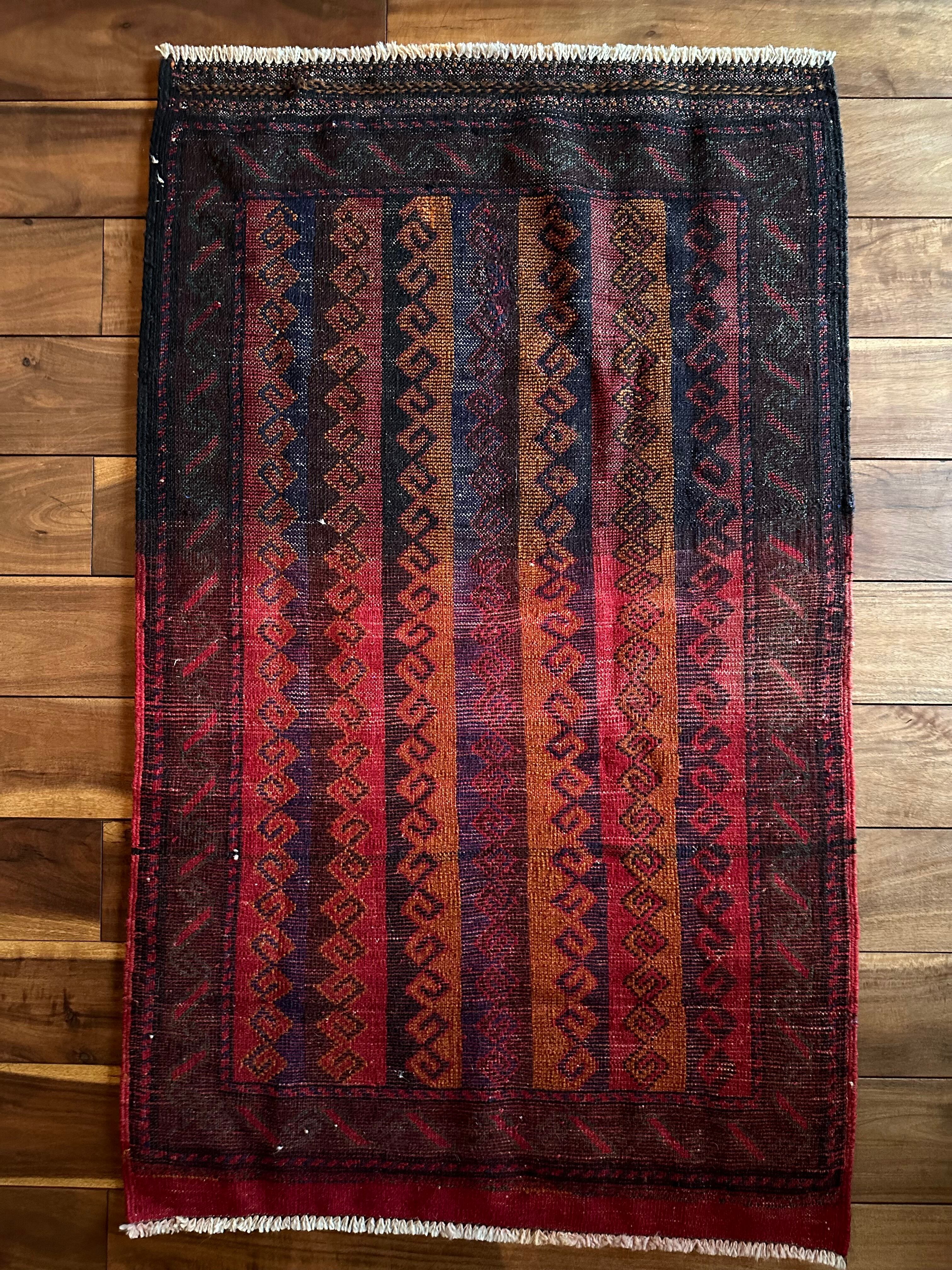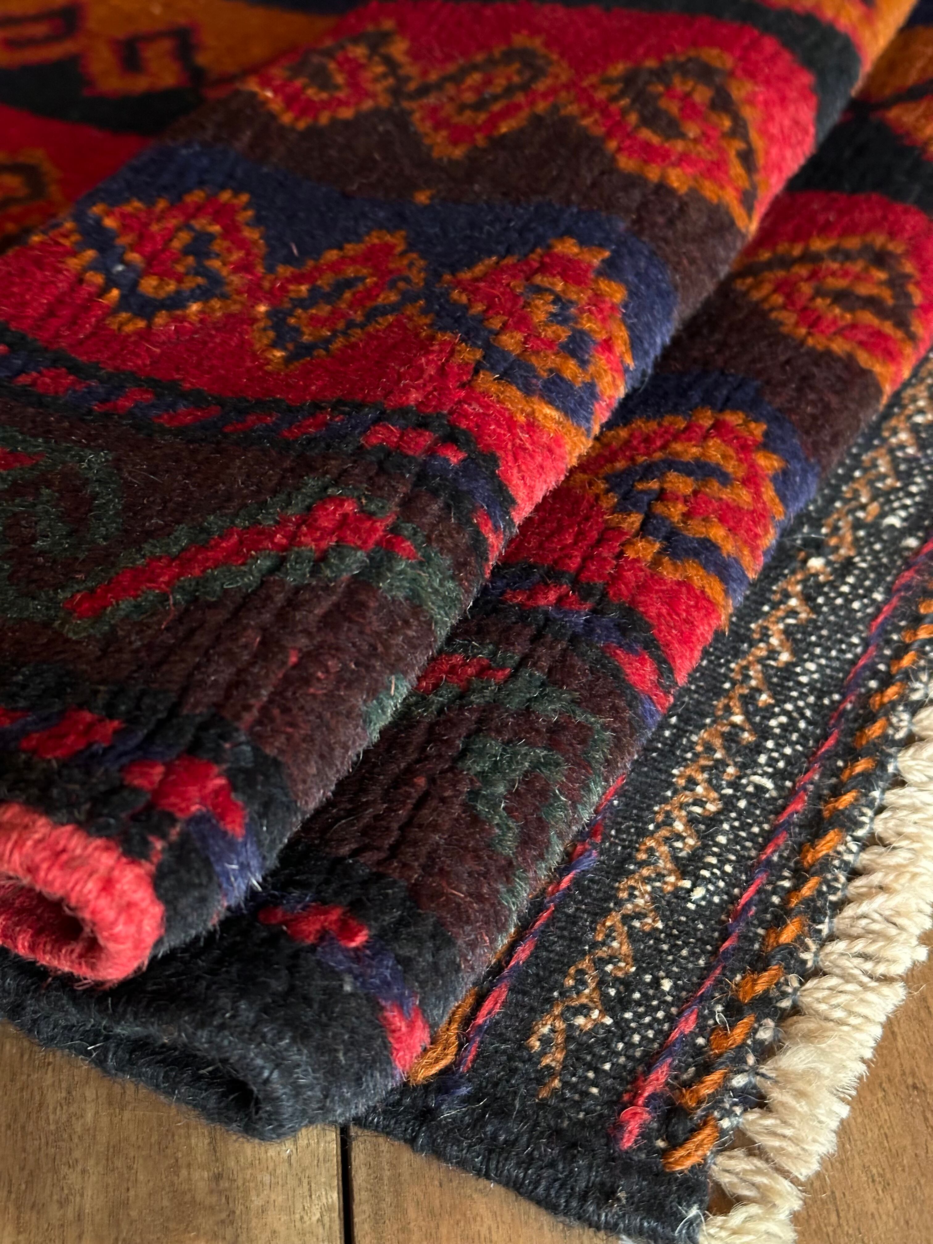 眼を見張るほどの鮮やかな色合いに、バルーチ族らしいランニングドッグが描かれたトライバルラグで、元々は収納やクッションとして使用されていたバーリシトという袋物の表皮をラグに仕立て直してもらったモノになります。