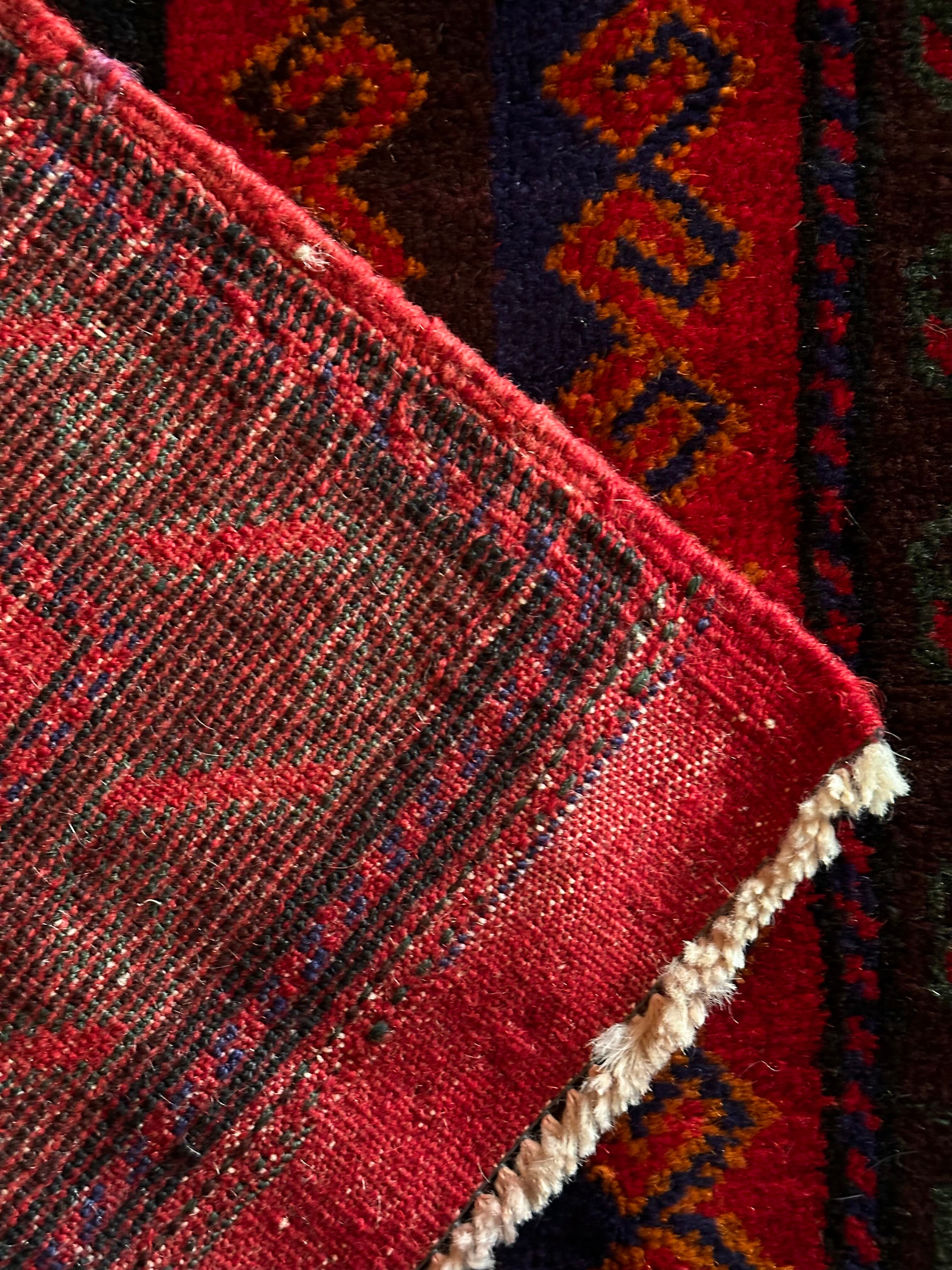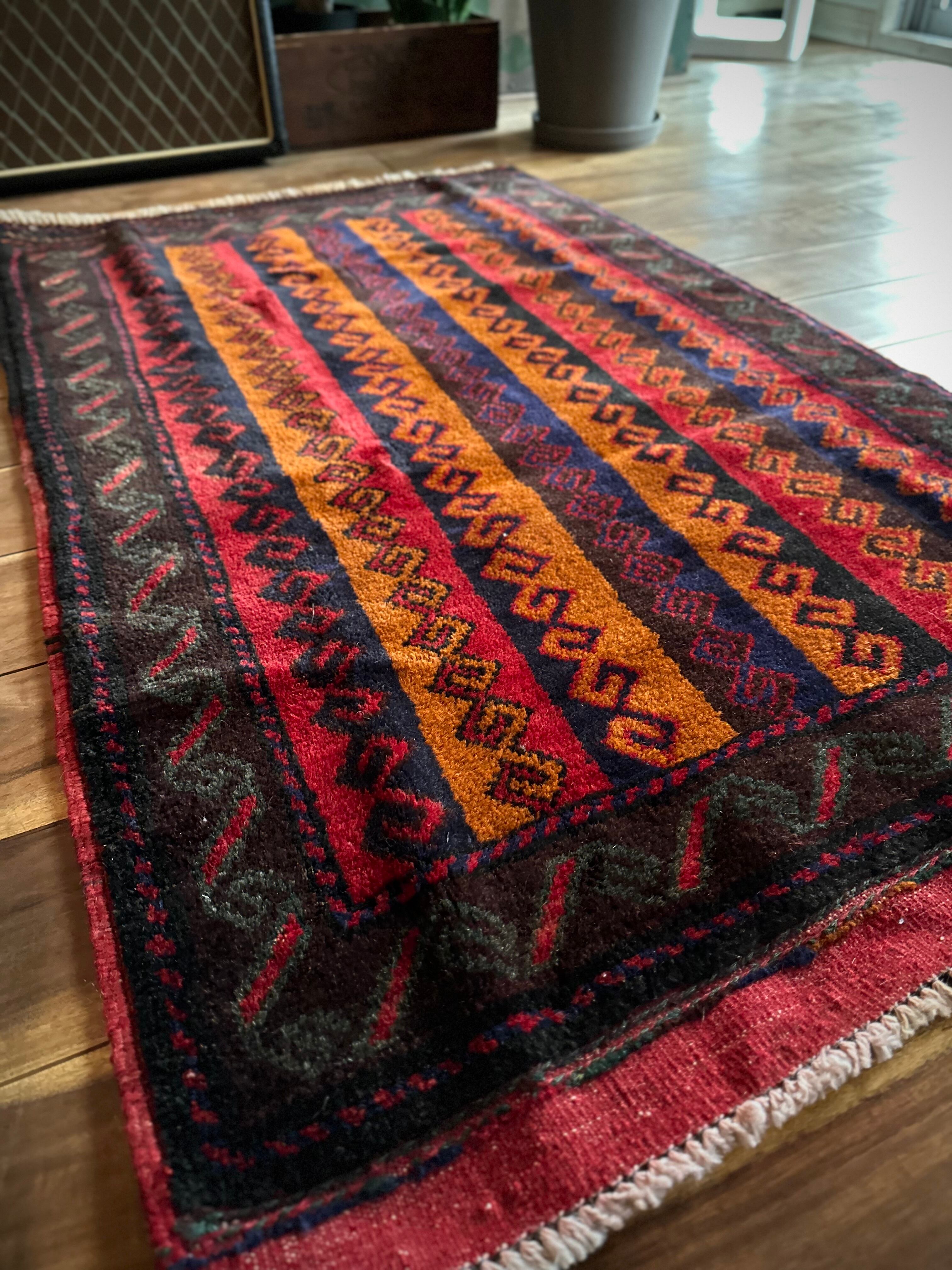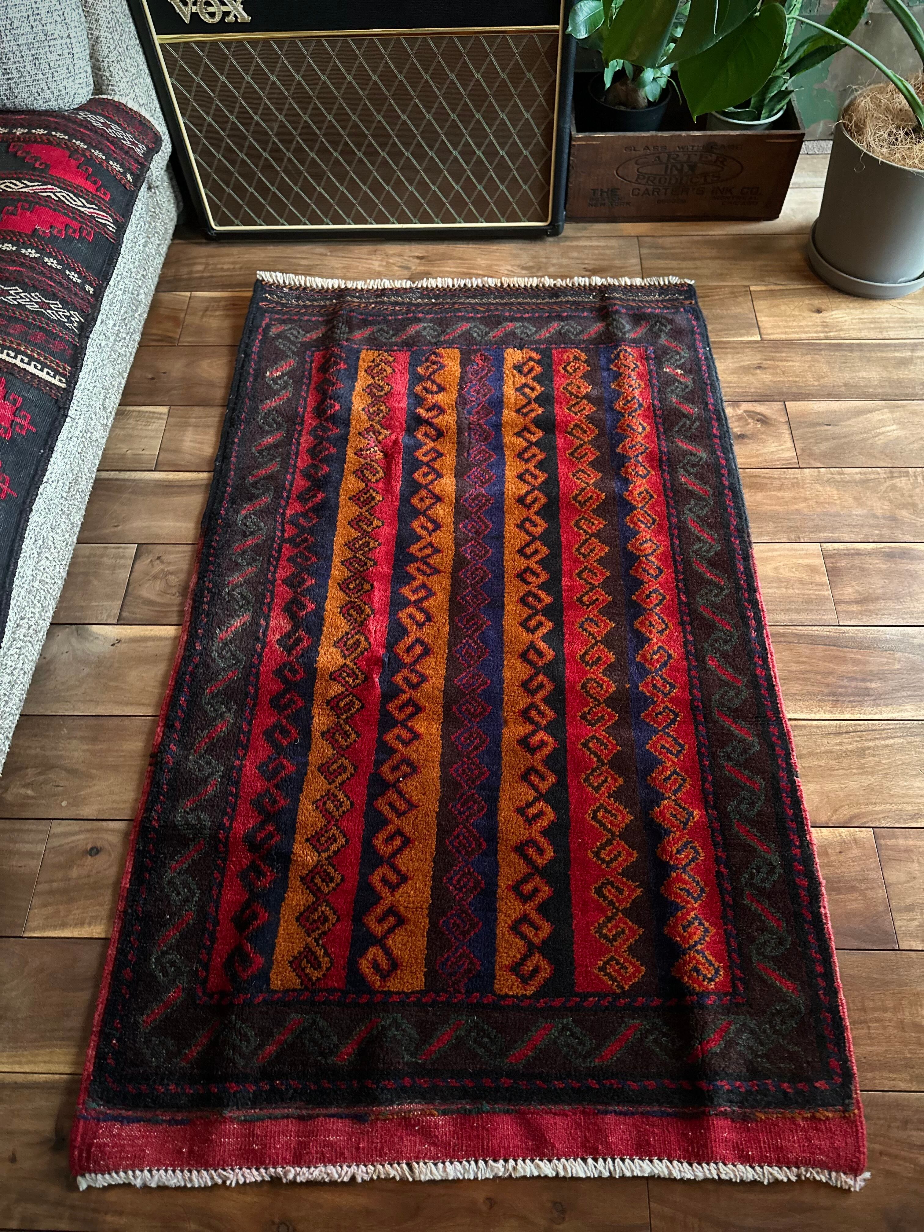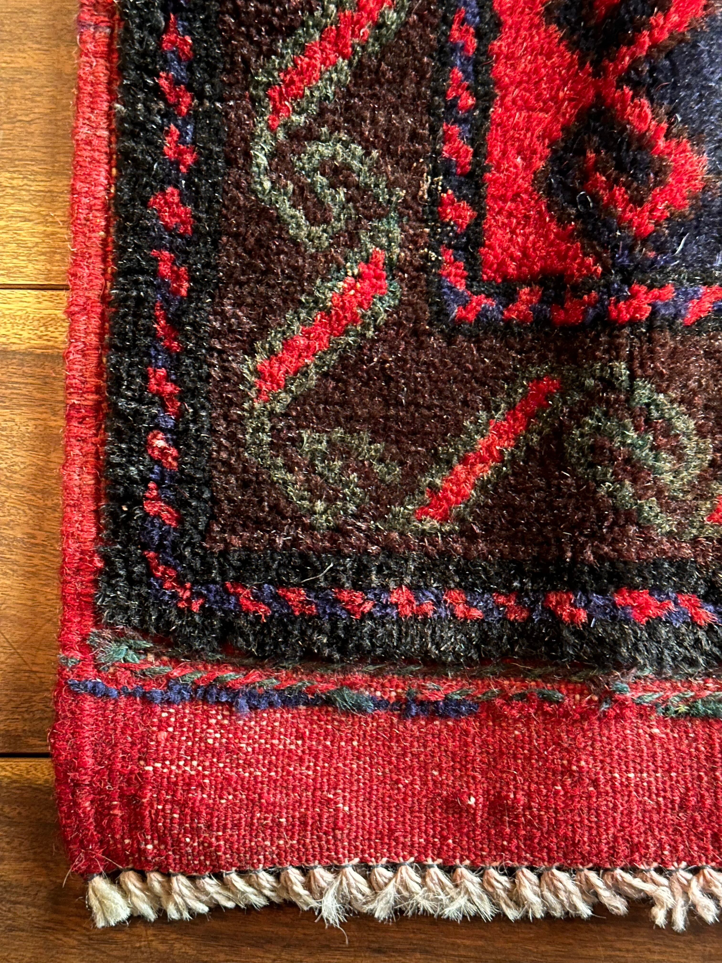 眼を見張るほどの鮮やかな色合いに、バルーチ族らしいランニングドッグが描かれたトライバルラグで、元々は収納やクッションとして使用されていたバーリシトという袋物の表皮をラグに仕立て直してもらったモノになります。