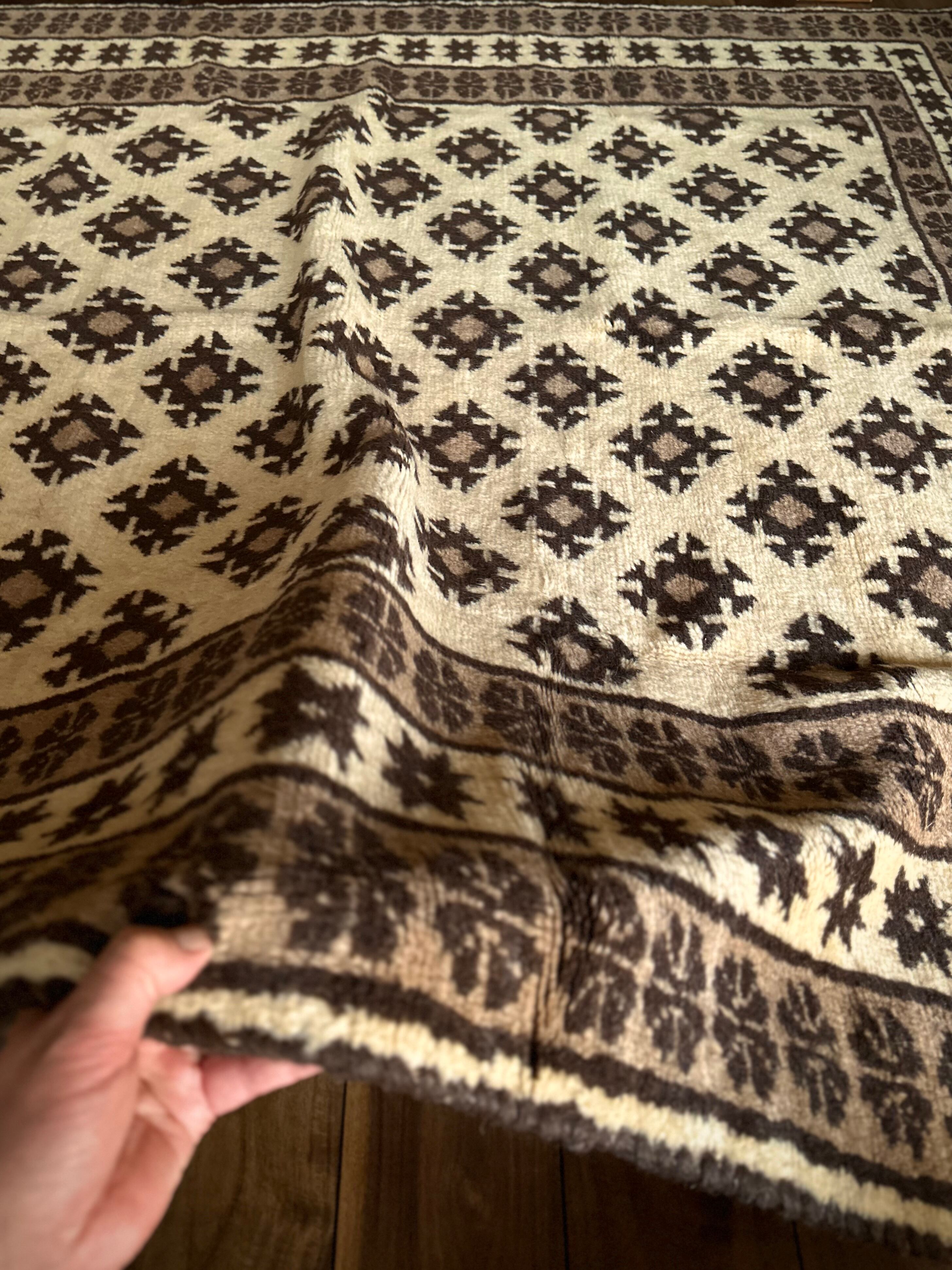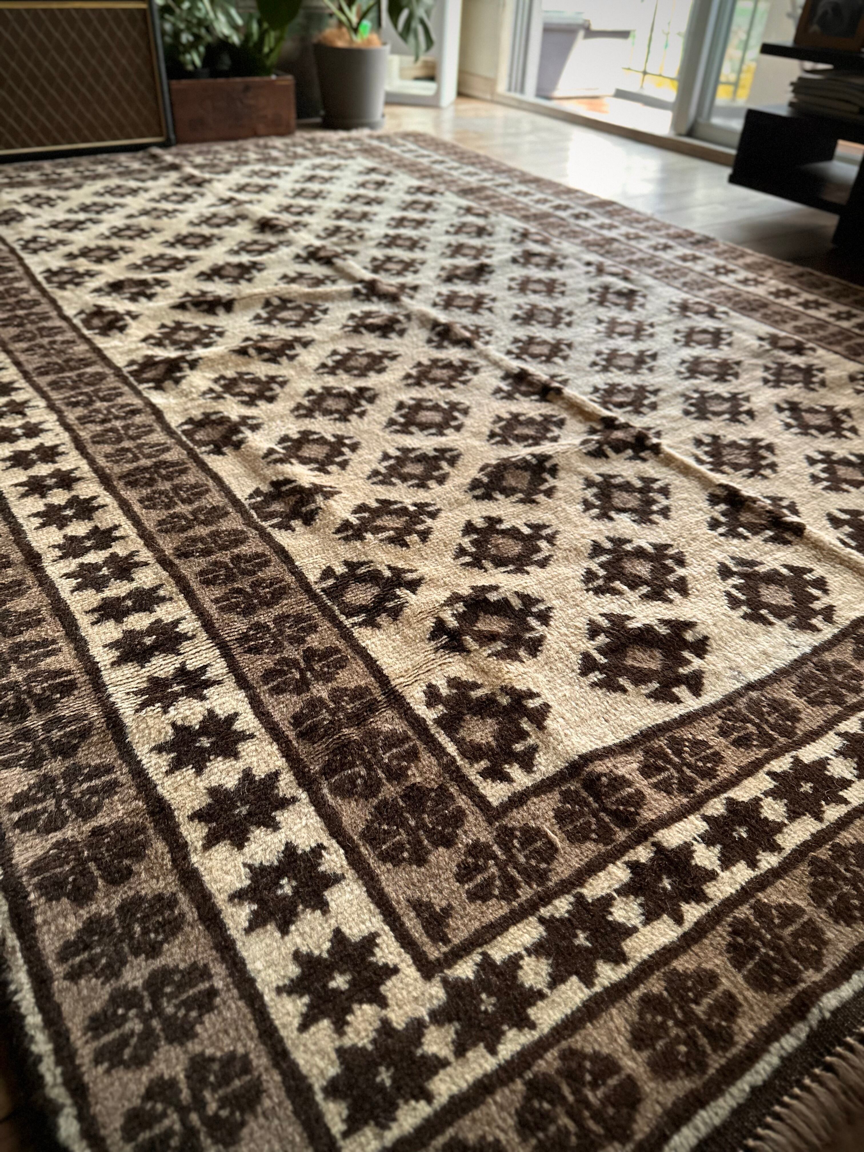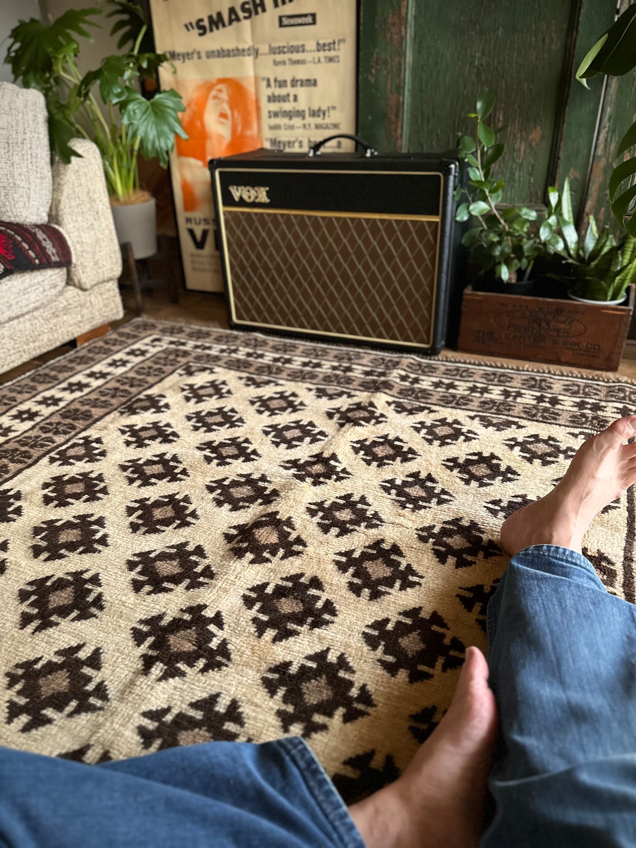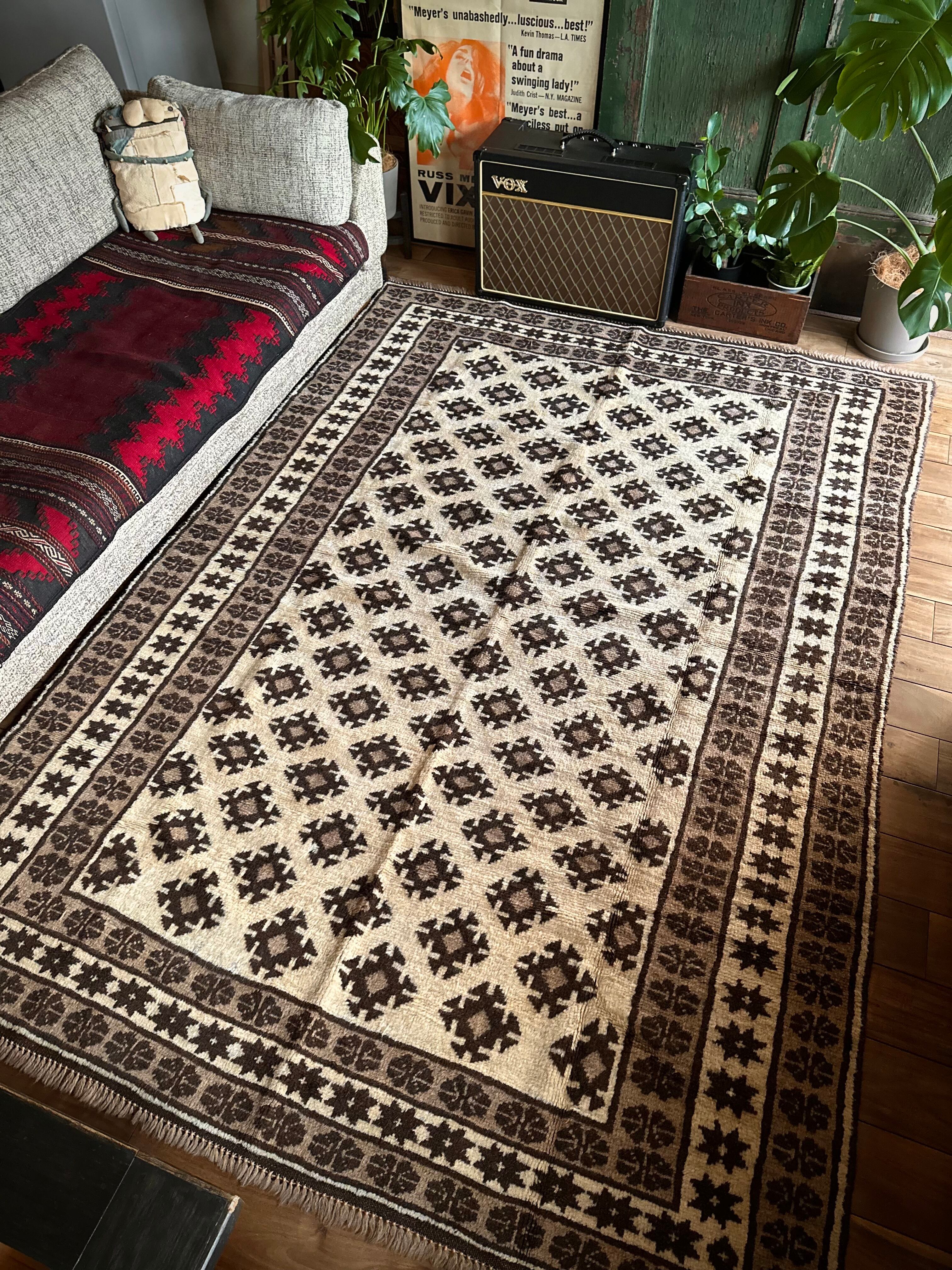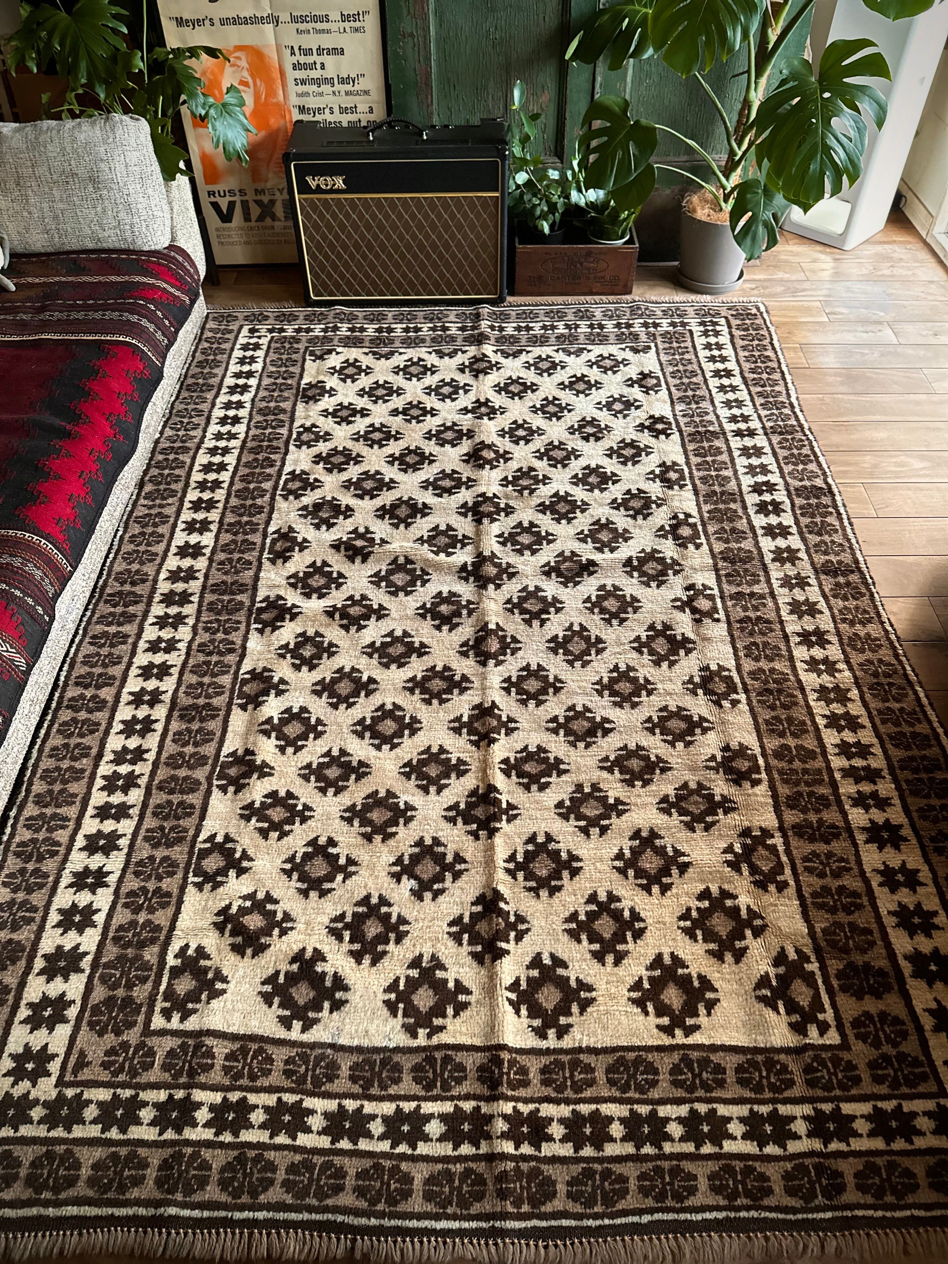 経年としては40年となりヴィンテージラグとして息が掛かった頃合いで、さほどの経年劣化もなく生成りがかった色合いがよい風合いかと。特に目立つダメージやリペア箇所は見当たらないグッドなコンディションで、大きさもリビングを余裕で埋め尽くせる大判サイズが魅力的な1枚になります。