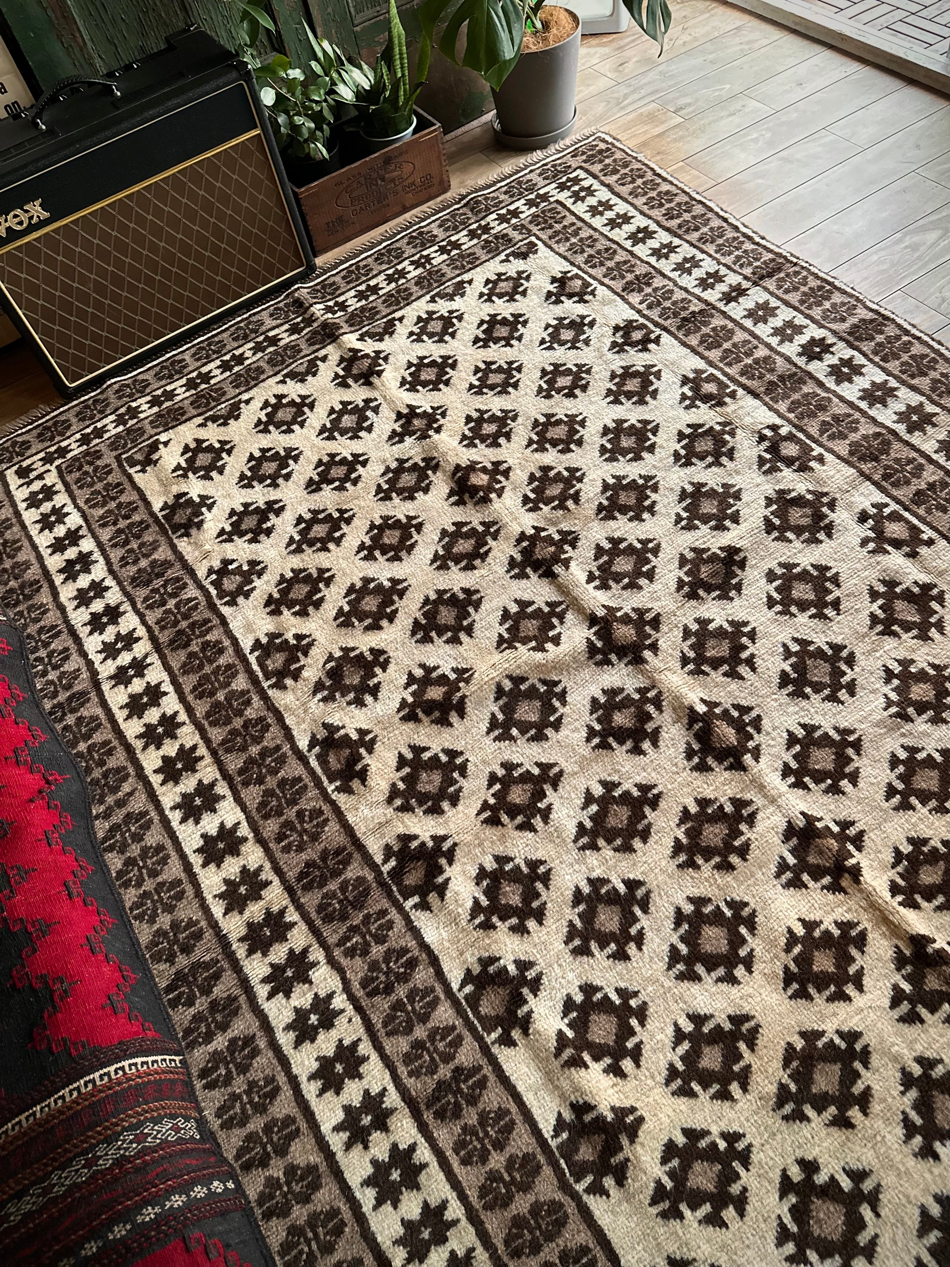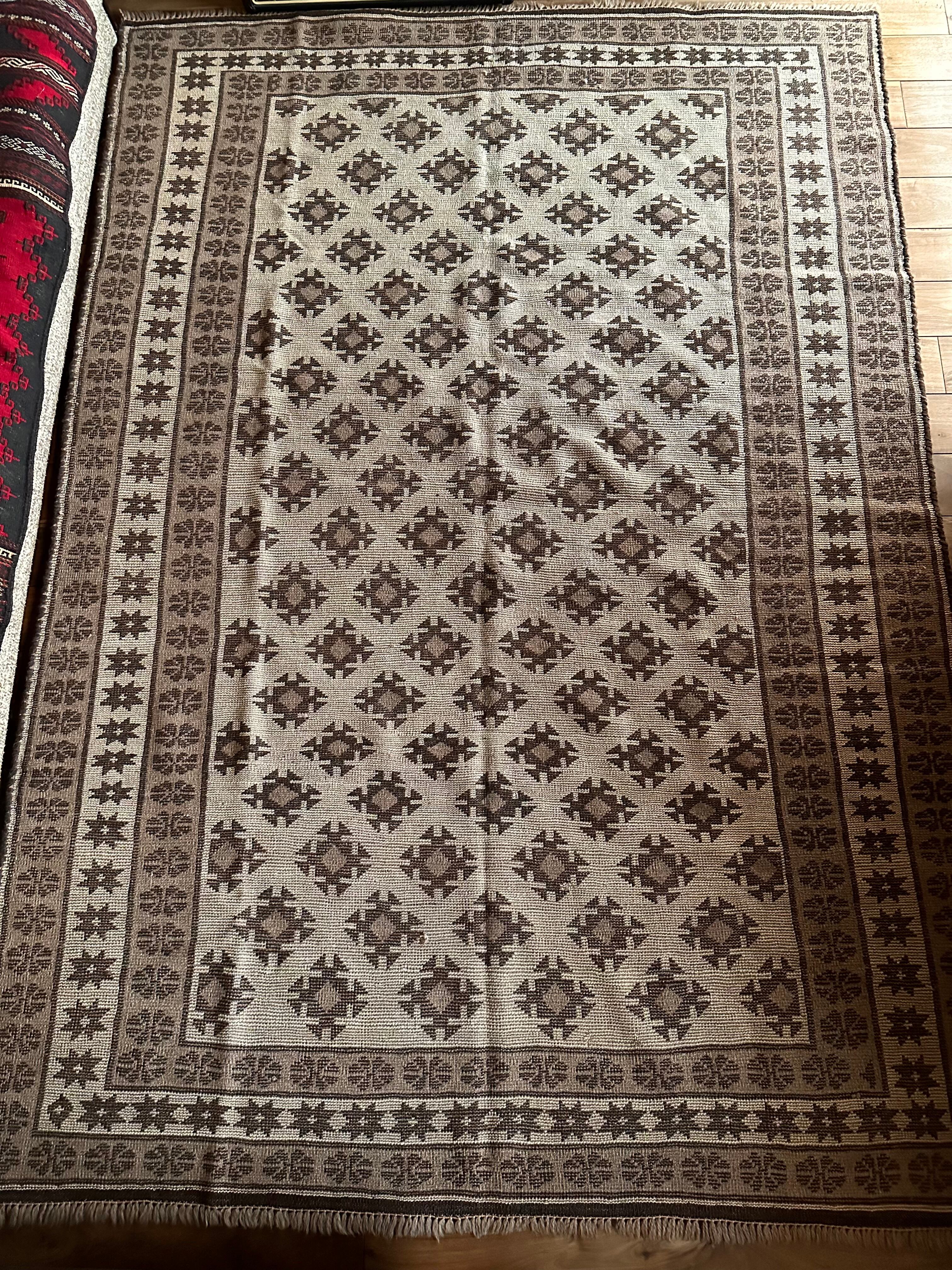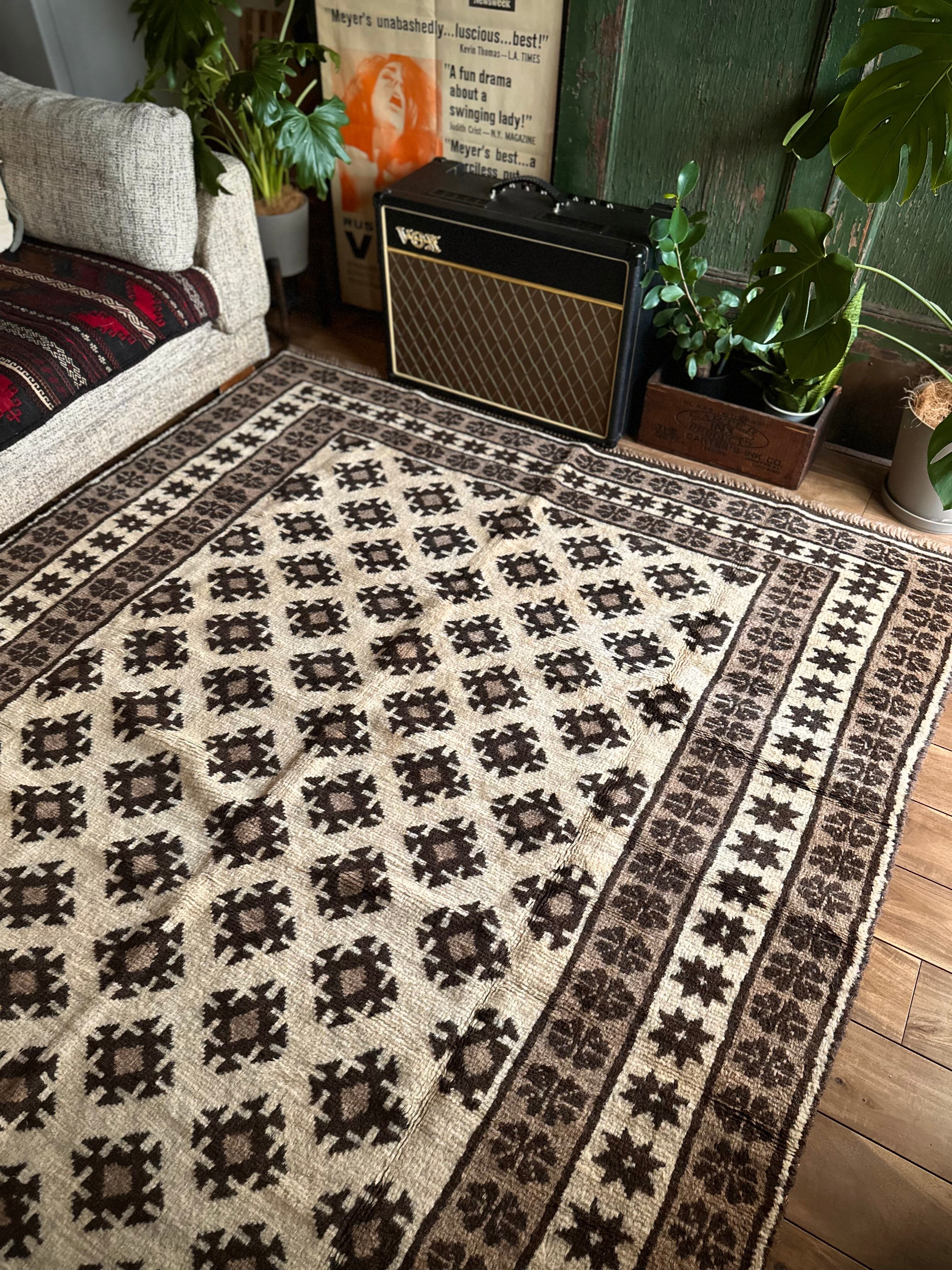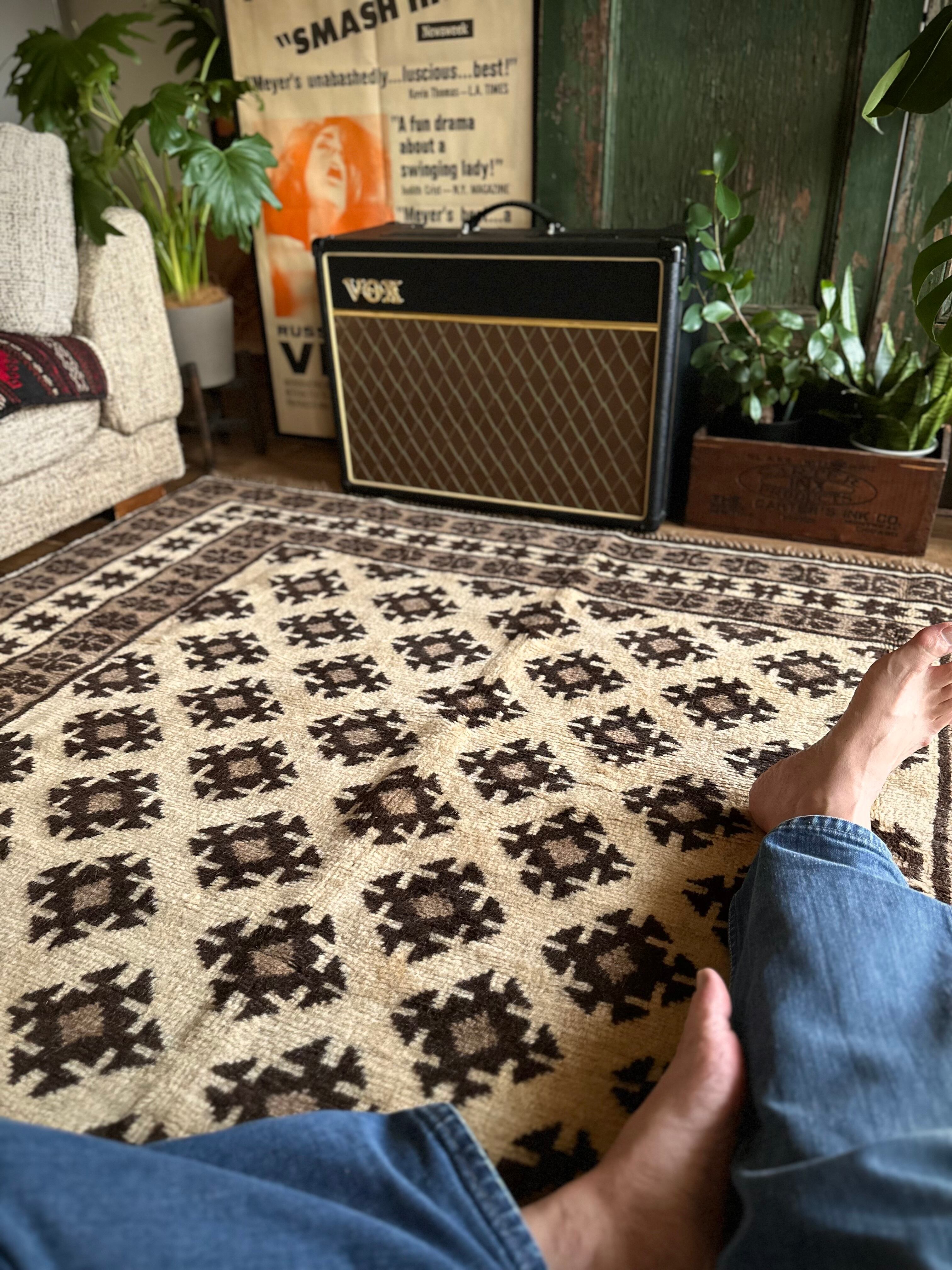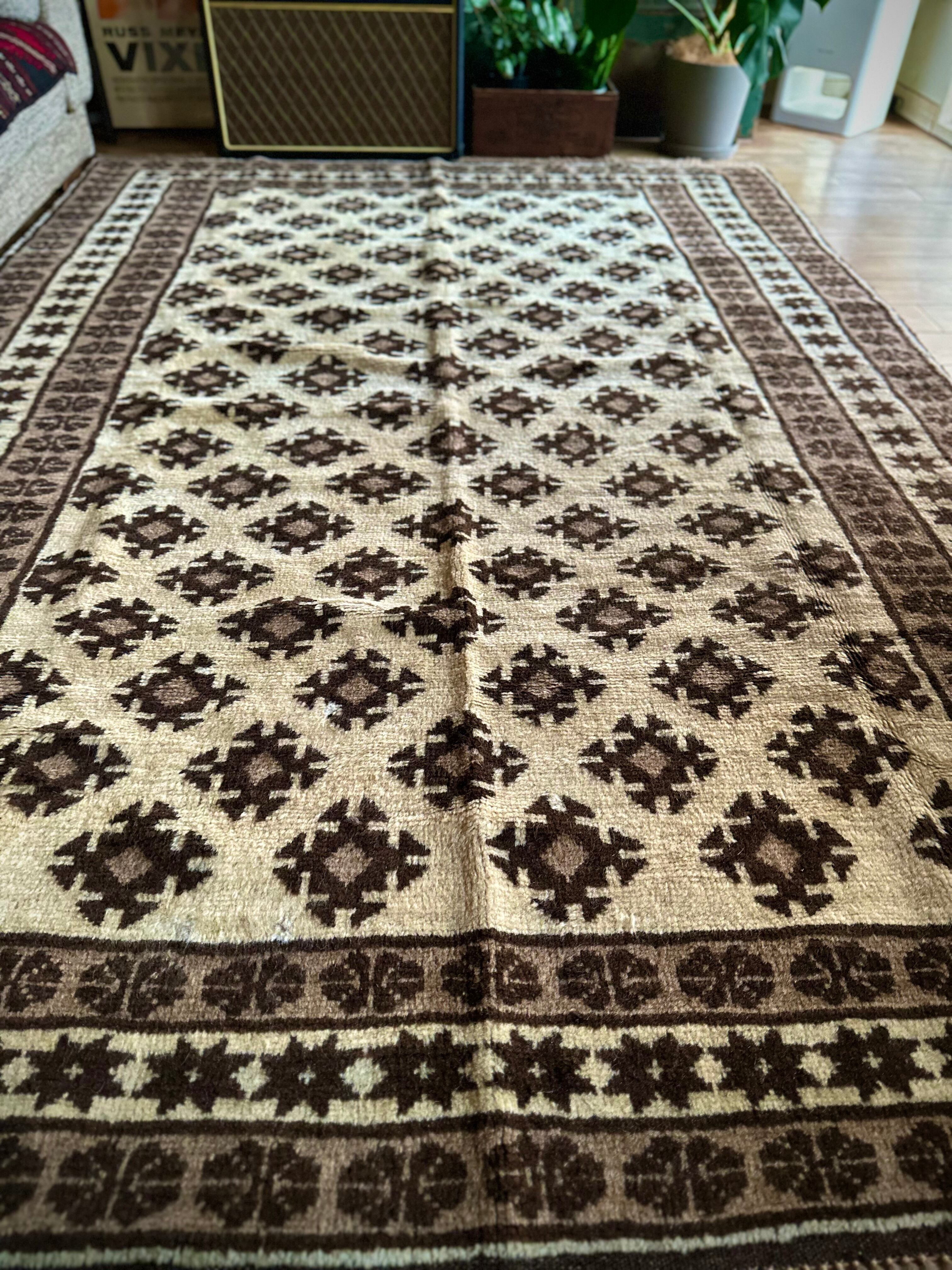 経年としては40年となりヴィンテージラグとして息が掛かった頃合いで、さほどの経年劣化もなく生成りがかった色合いがよい風合いかと。特に目立つダメージやリペア箇所は見当たらないグッドなコンディションで、大きさもリビングを余裕で埋め尽くせる大判サイズが魅力的な1枚になります。