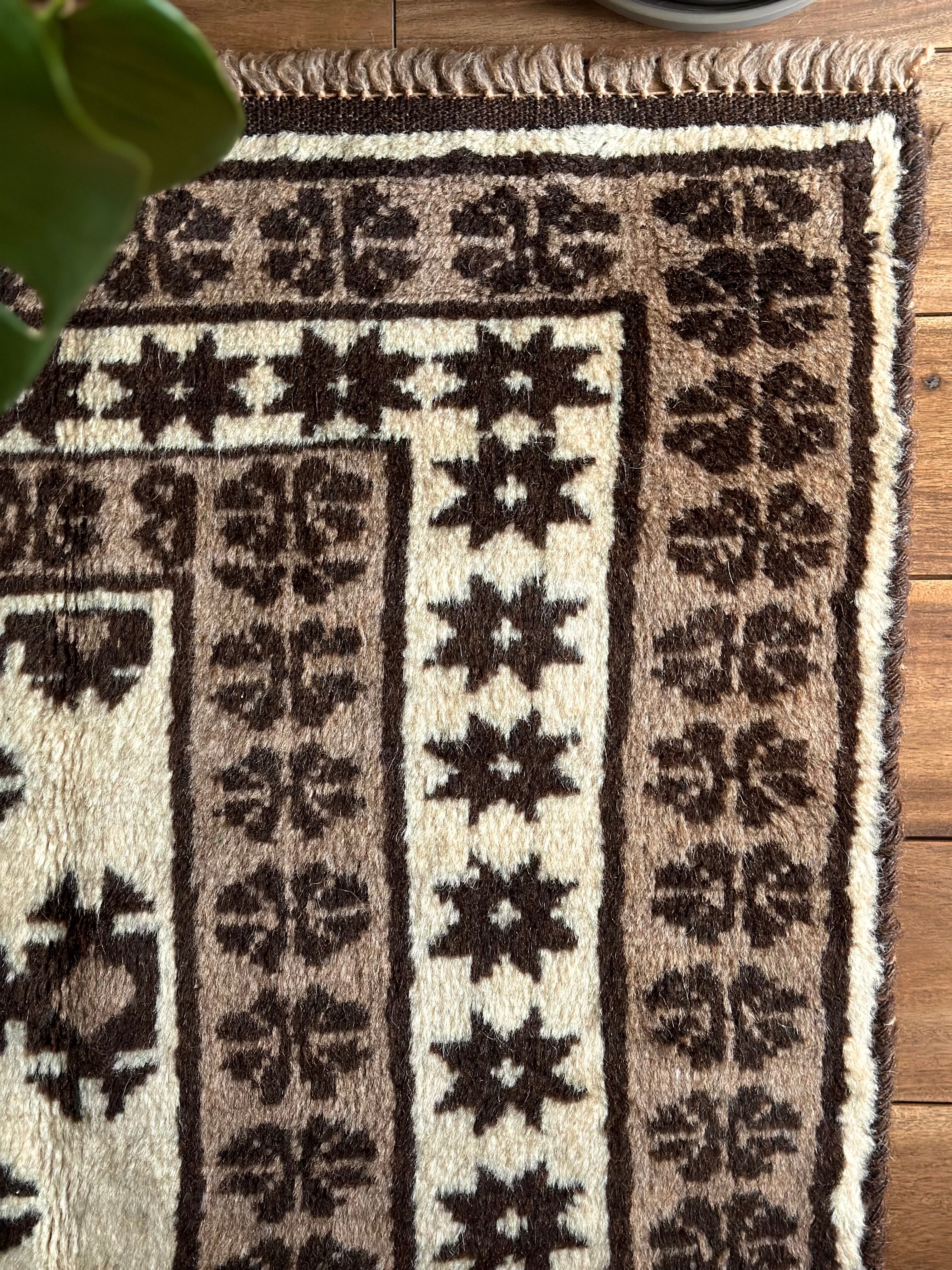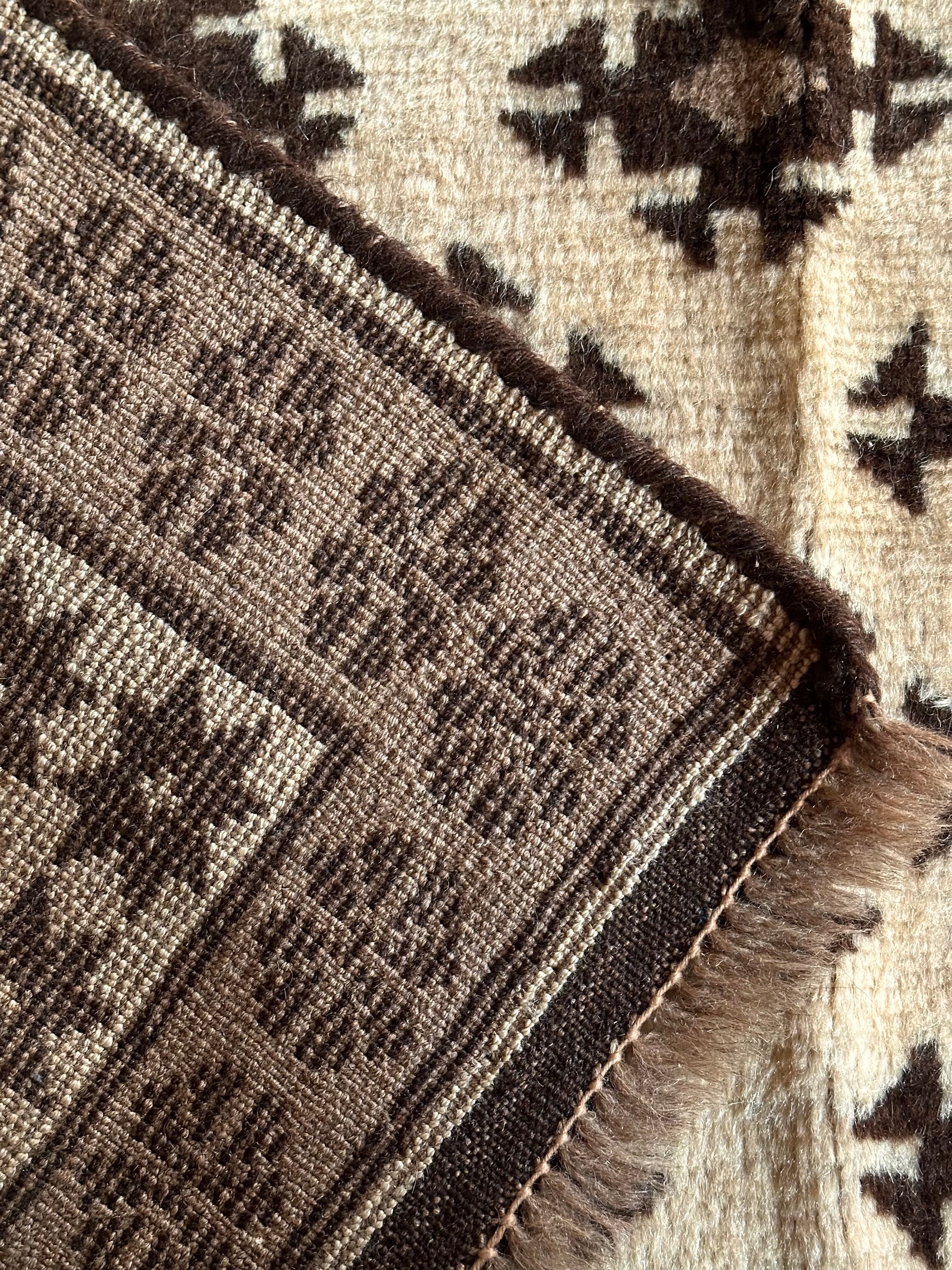 無染色のナチュラルウールな風合いが優しく感じるヘラート州に居住するタイマニ族のトライバルラグで、イラン南東部のロリ族のワイルドなラグにも引けを取らない毛足の長いざっくりとした織りが、まさにプリミティブアートと言わんばかりの印象を与えてくれます。