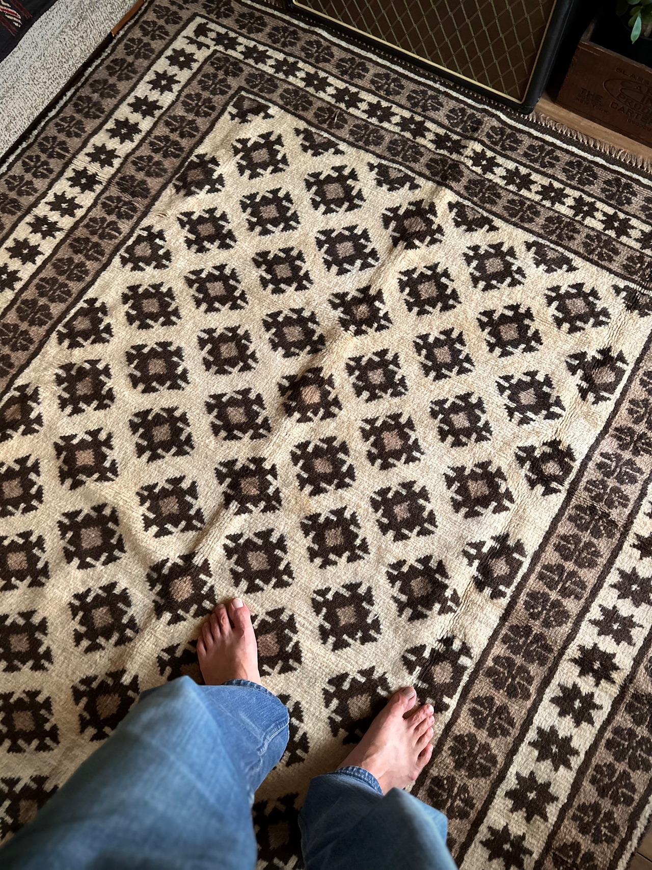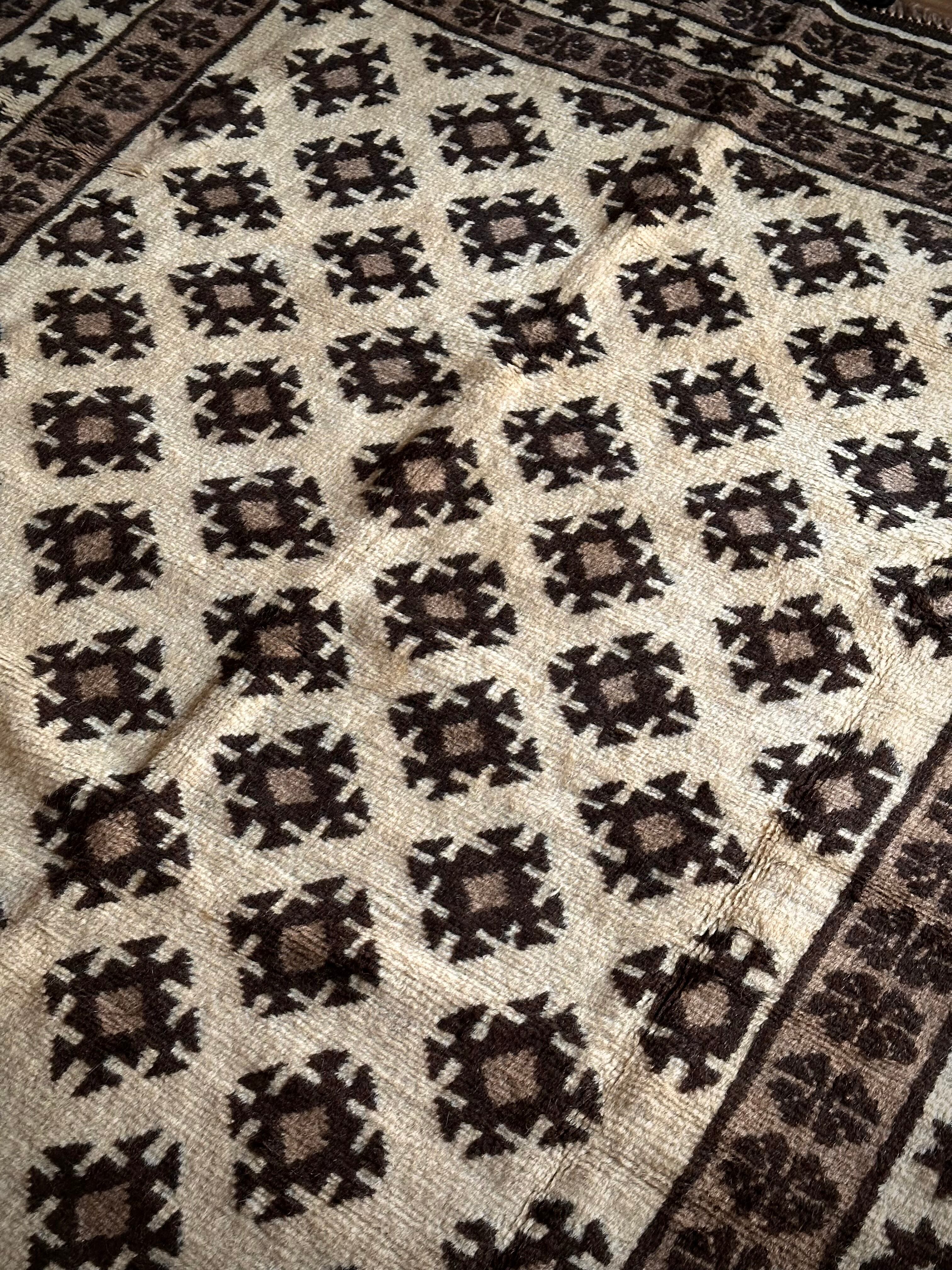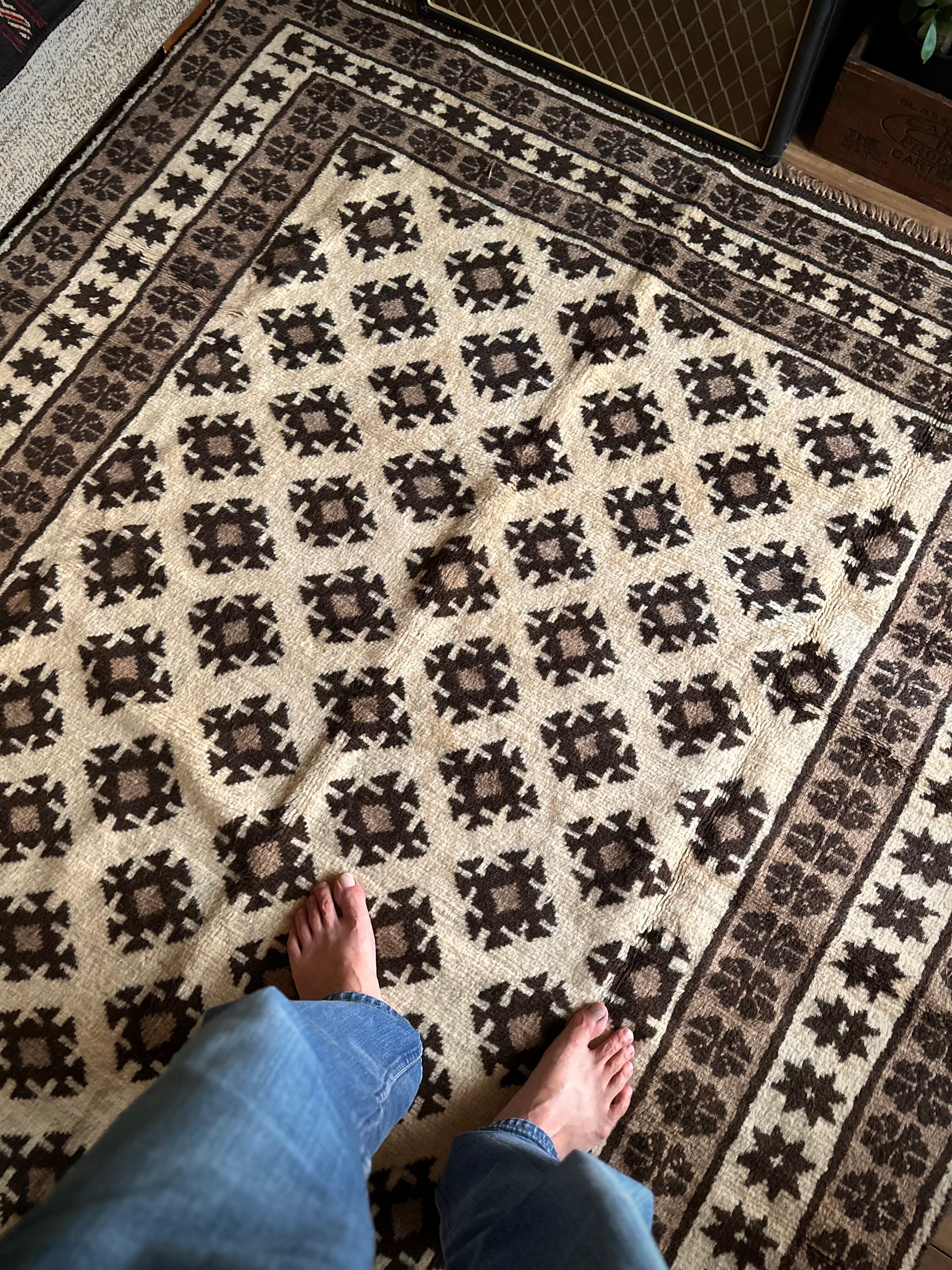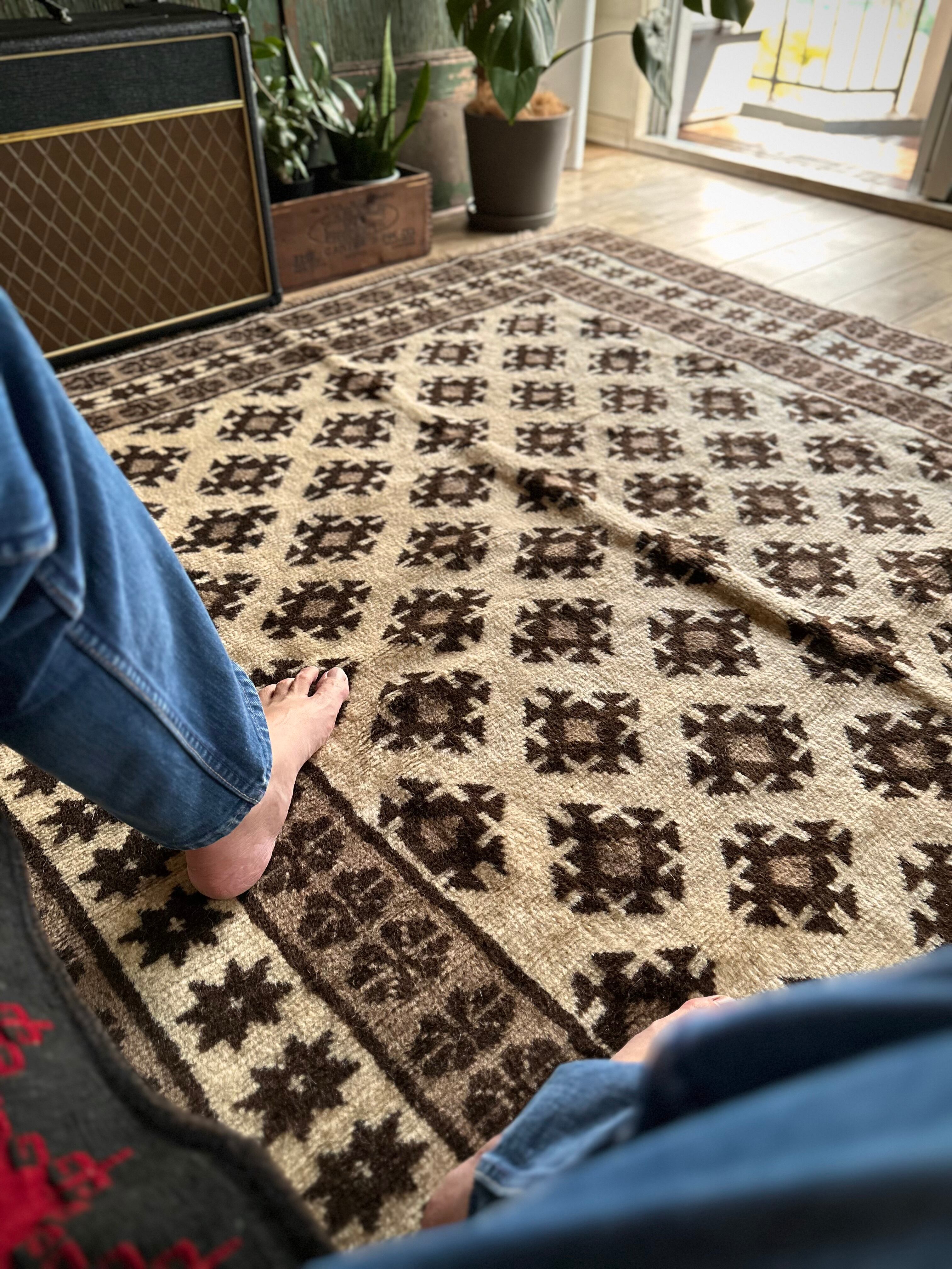 原毛を使用したラグではモロッコのベルベル人が織るベニワレンんが有名ですが、こちら無染色のタイマニラグも近年は人気で、やはりインテリアへの馴染みやすさが魅力のひとつでしょうか。長いパイルのフカフカとした毛足の肌触りと幸運を呼ぶ八芒星に囲まれて思わず寝そべりたくなります。