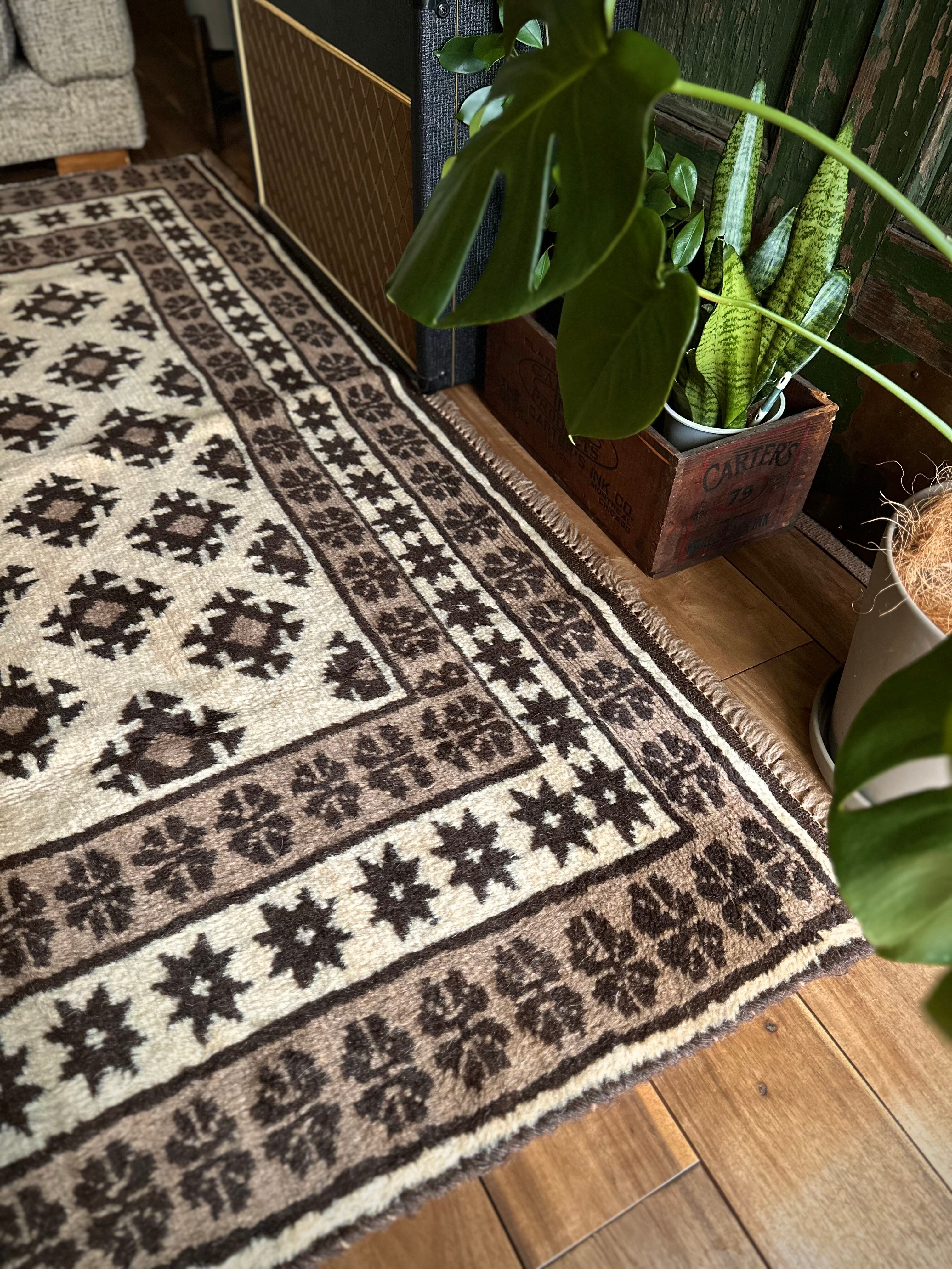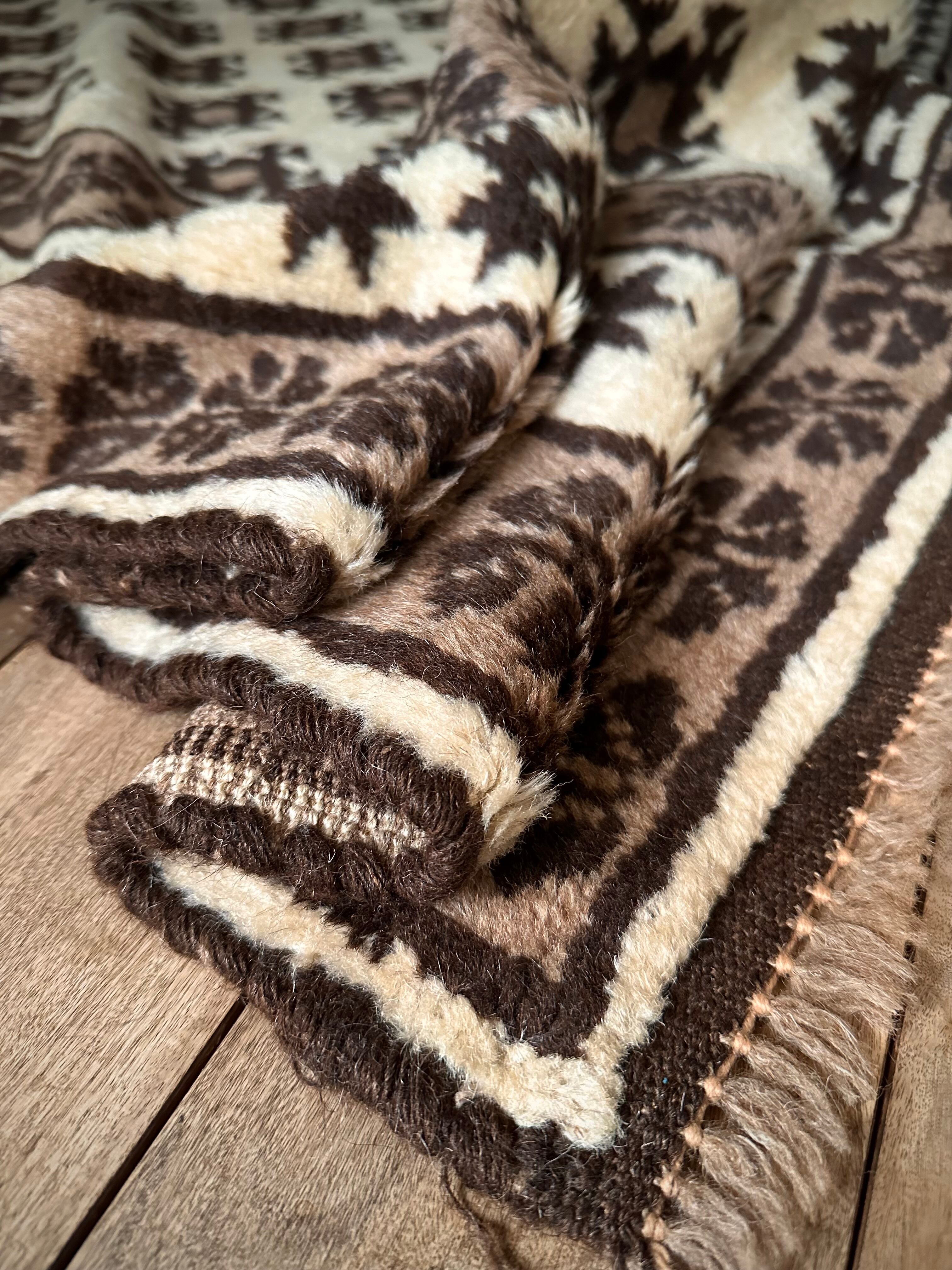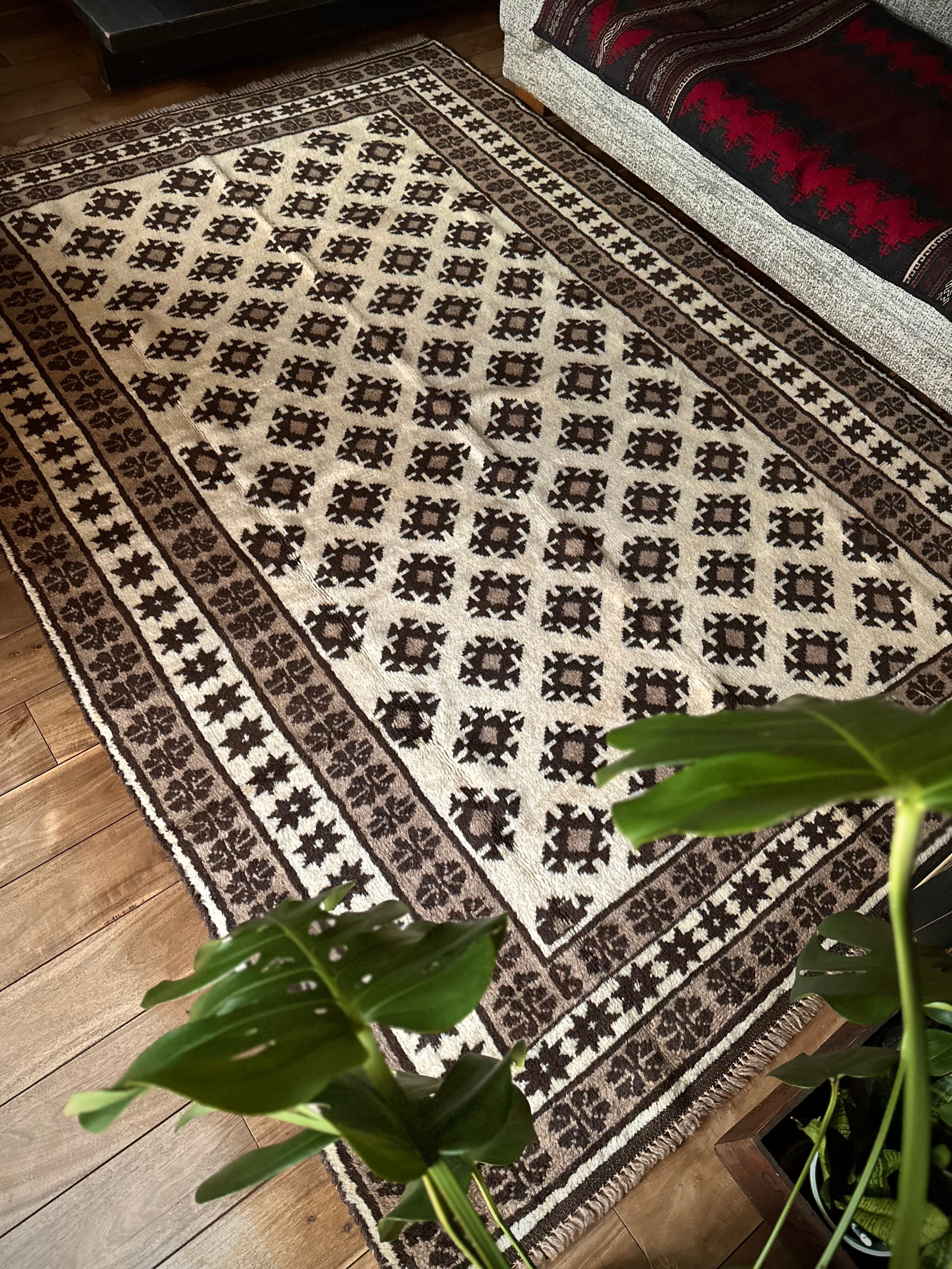最後にラグそのものに関しては羊毛特有の匂いがあり、採寸は中央付近で計測していますが、手織りならではの歪みによる誤差や水洗いクリーニングによる縮み、また草木染めによる経年劣化の色ムラなどがありますが、それもまたヴィンテージラグの魅力かとご理解ください。
