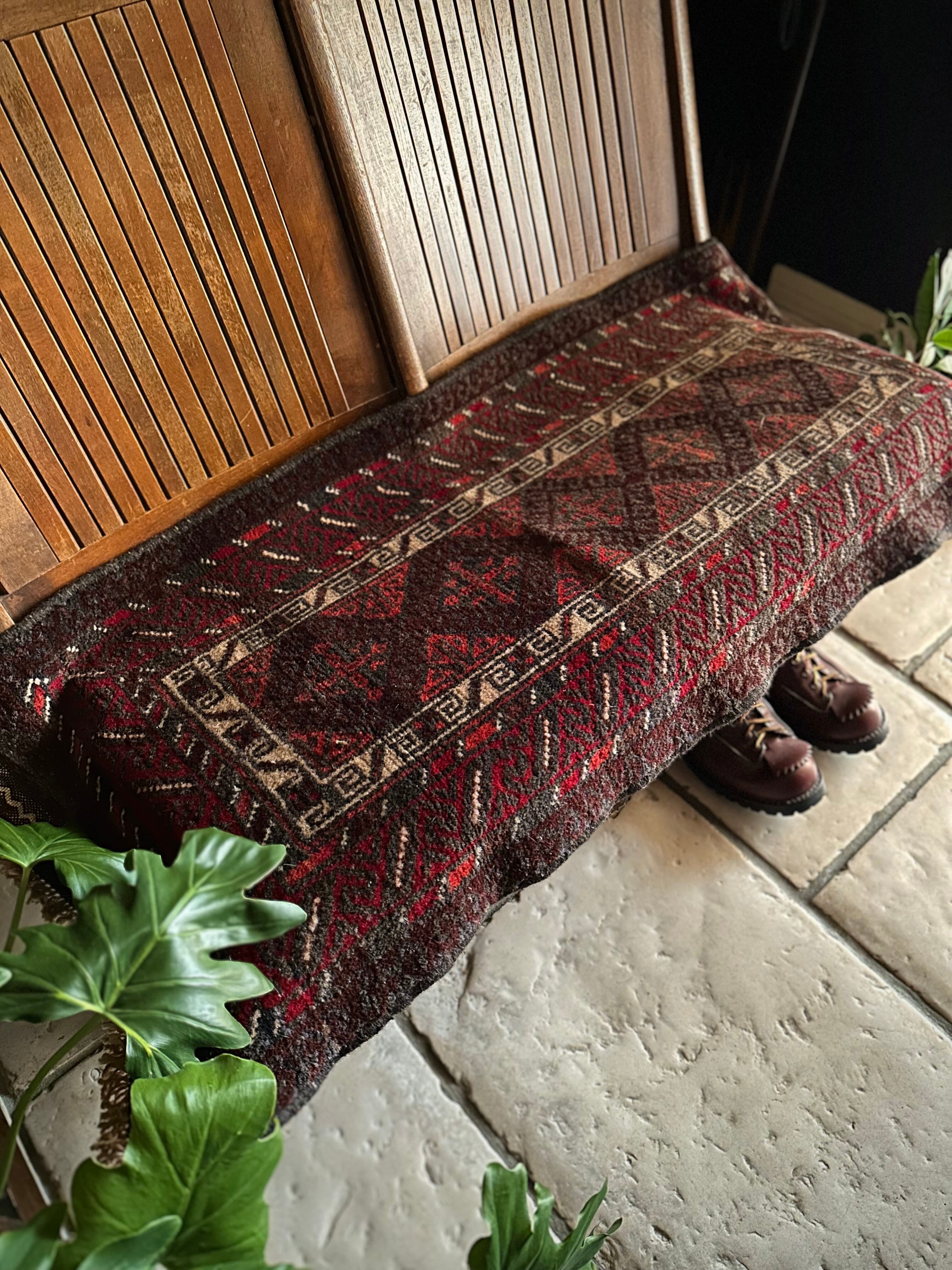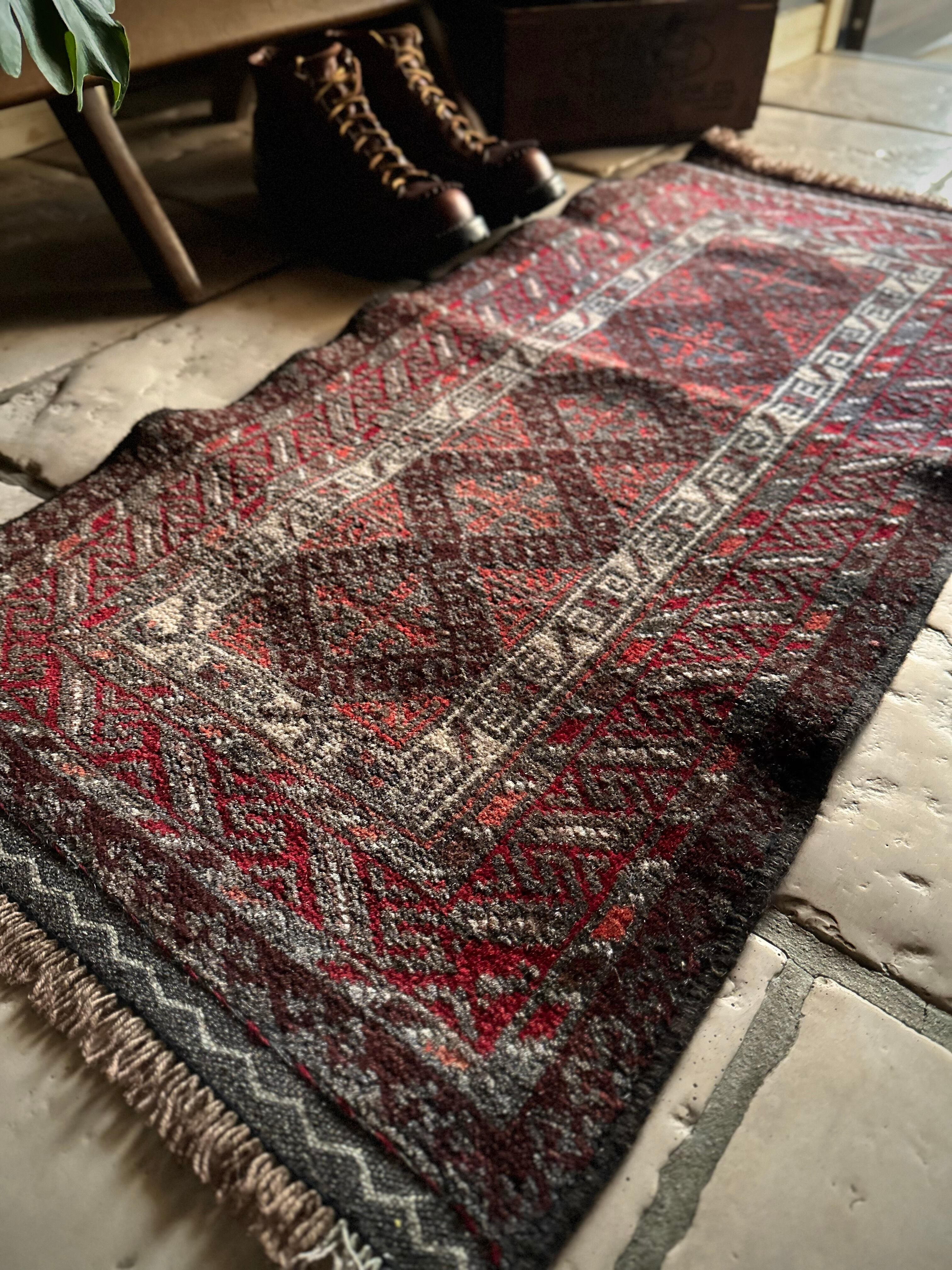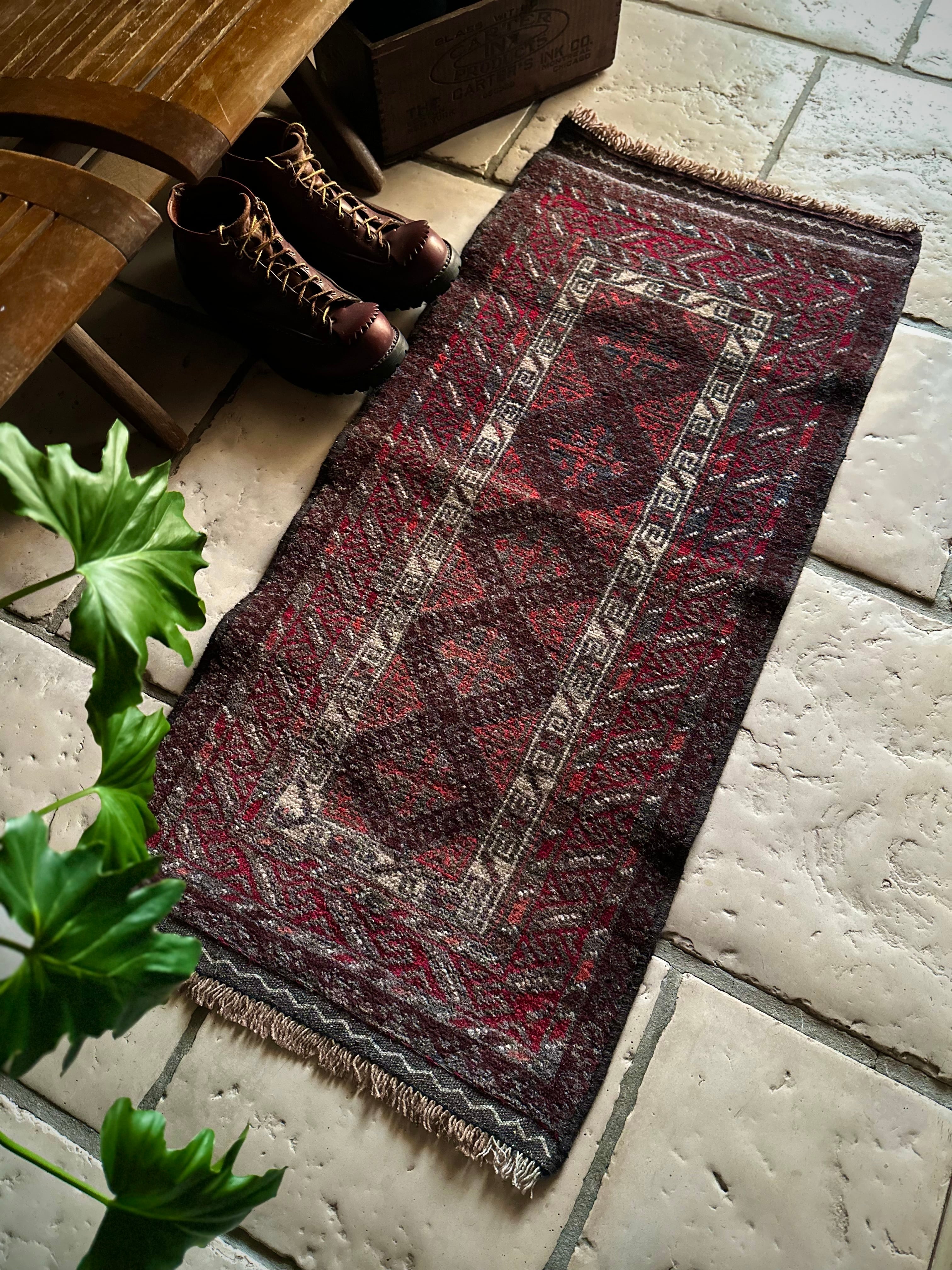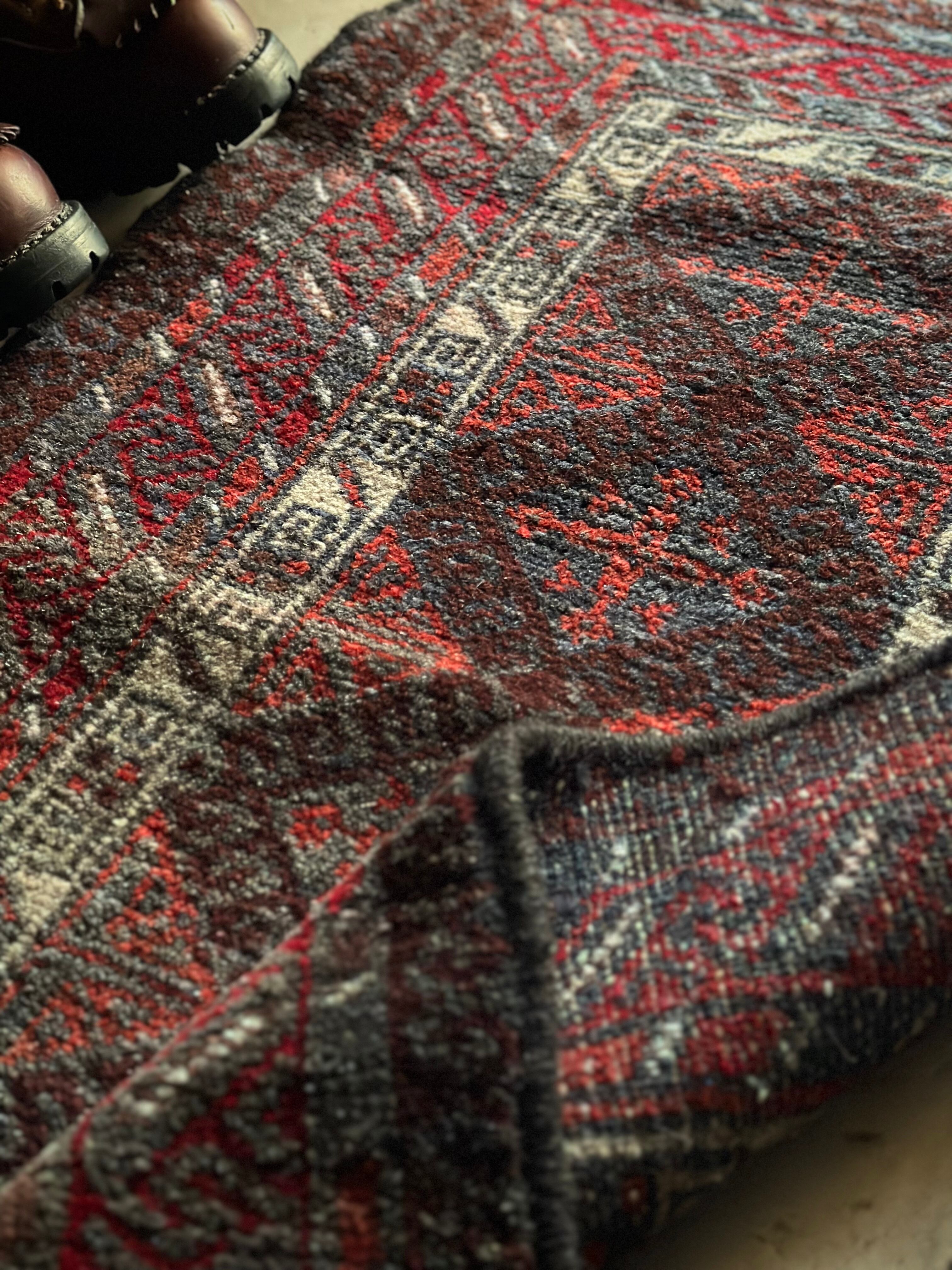シックな赤とグレーのコントラストが落ち着ついた印象を与えてくれるバルーチ族のトライバルラグで、元々は収納やクッションとして使われていたバーリシトと呼ばれる袋物の表皮をラグに仕立て直してもらったモノになります。