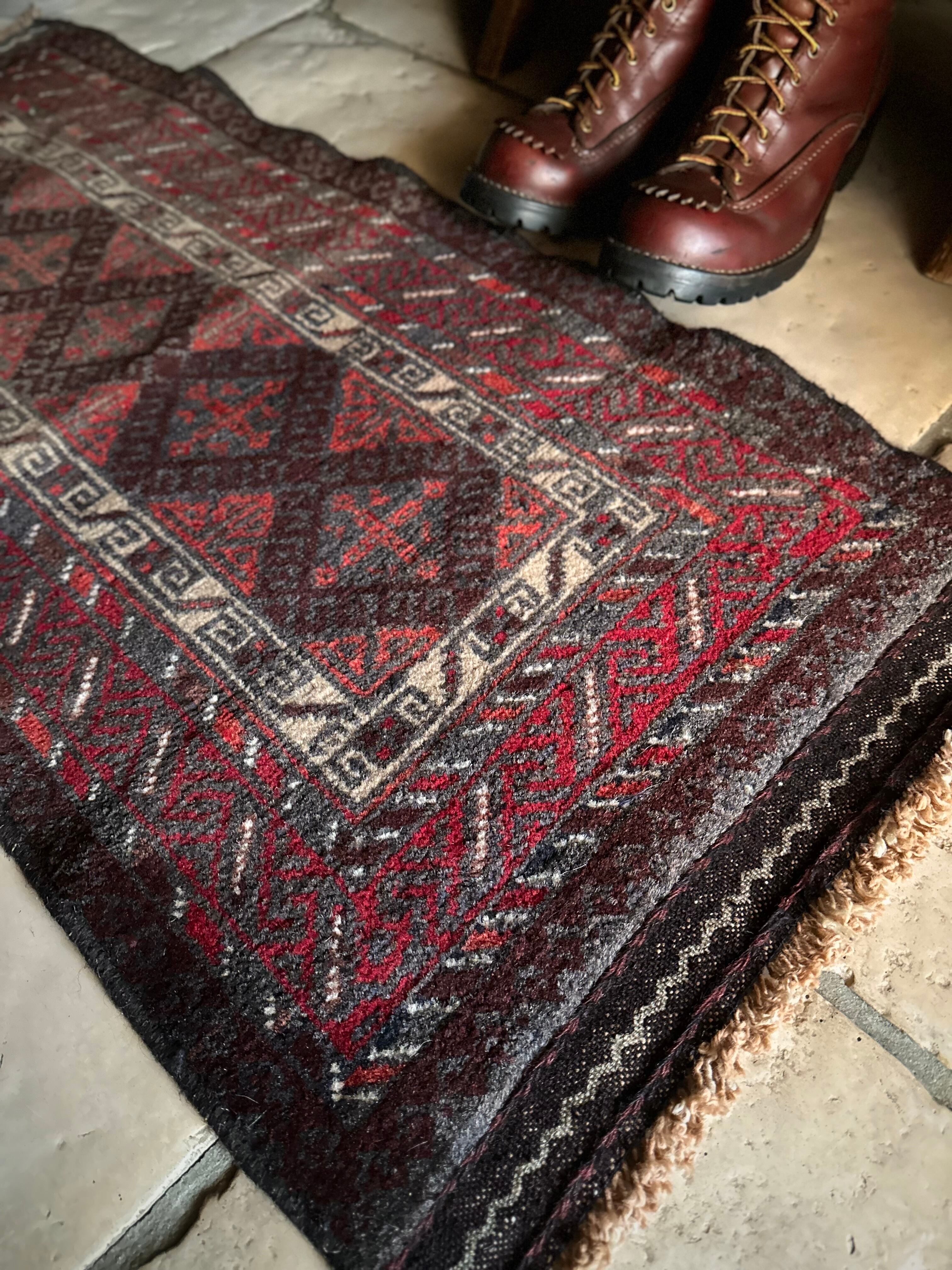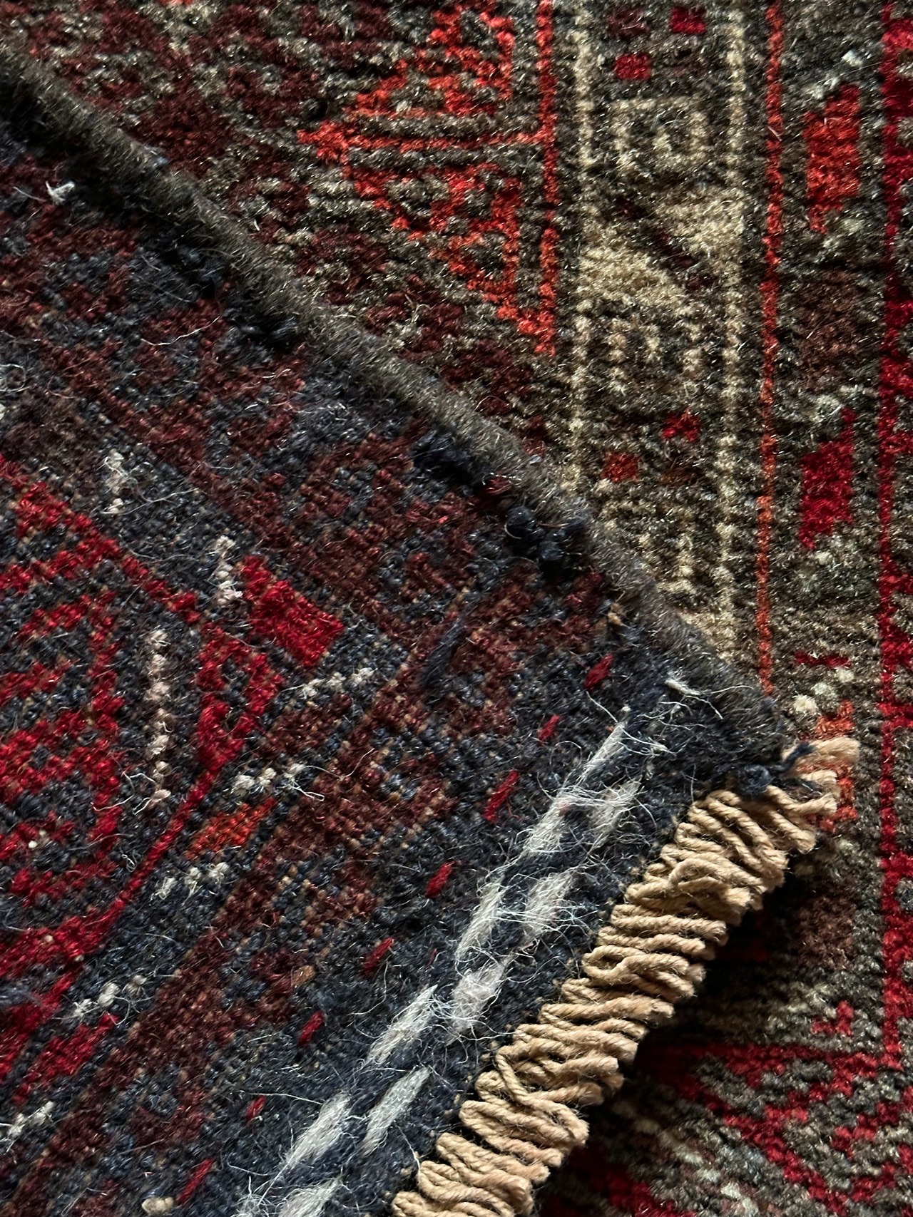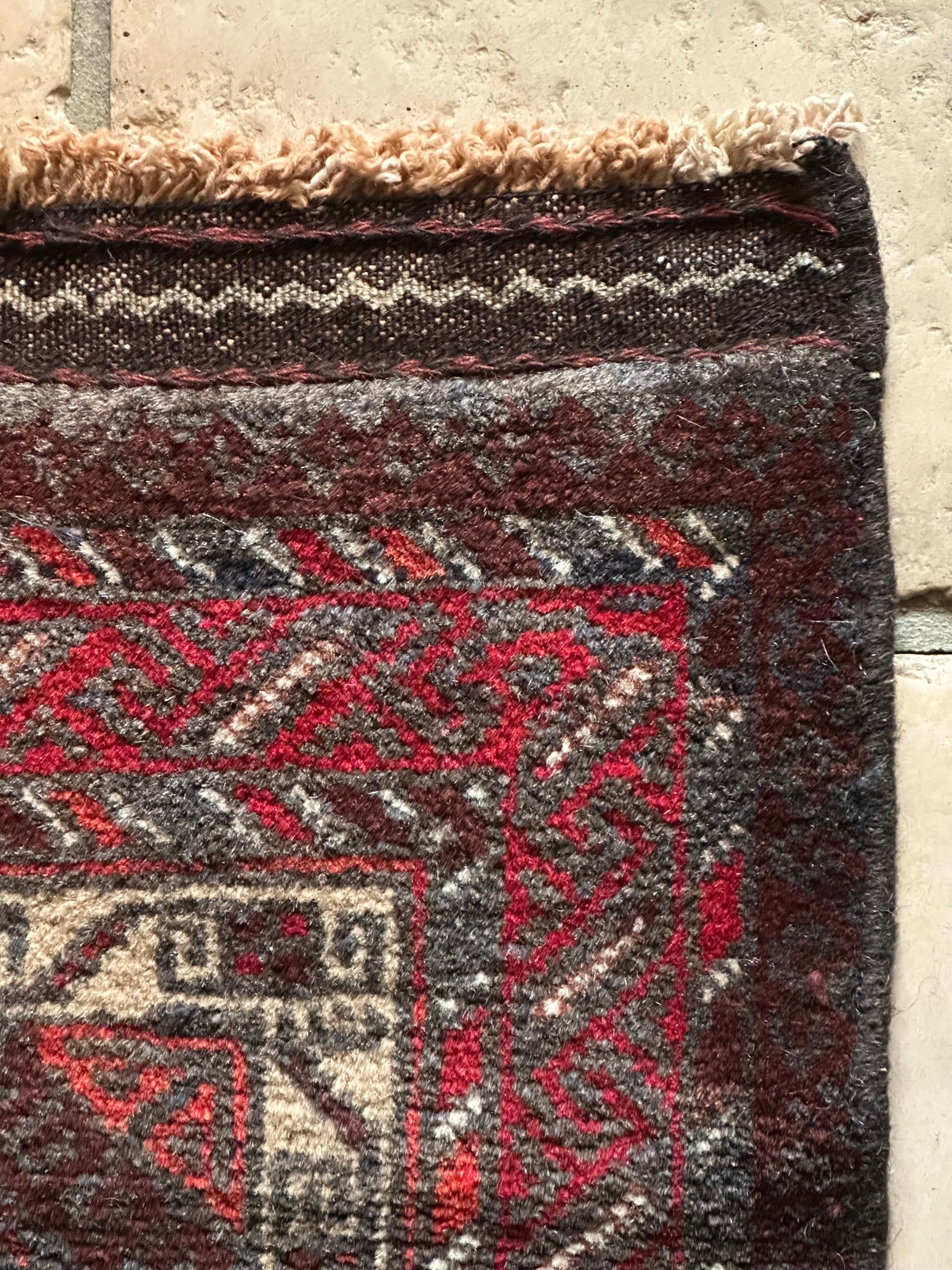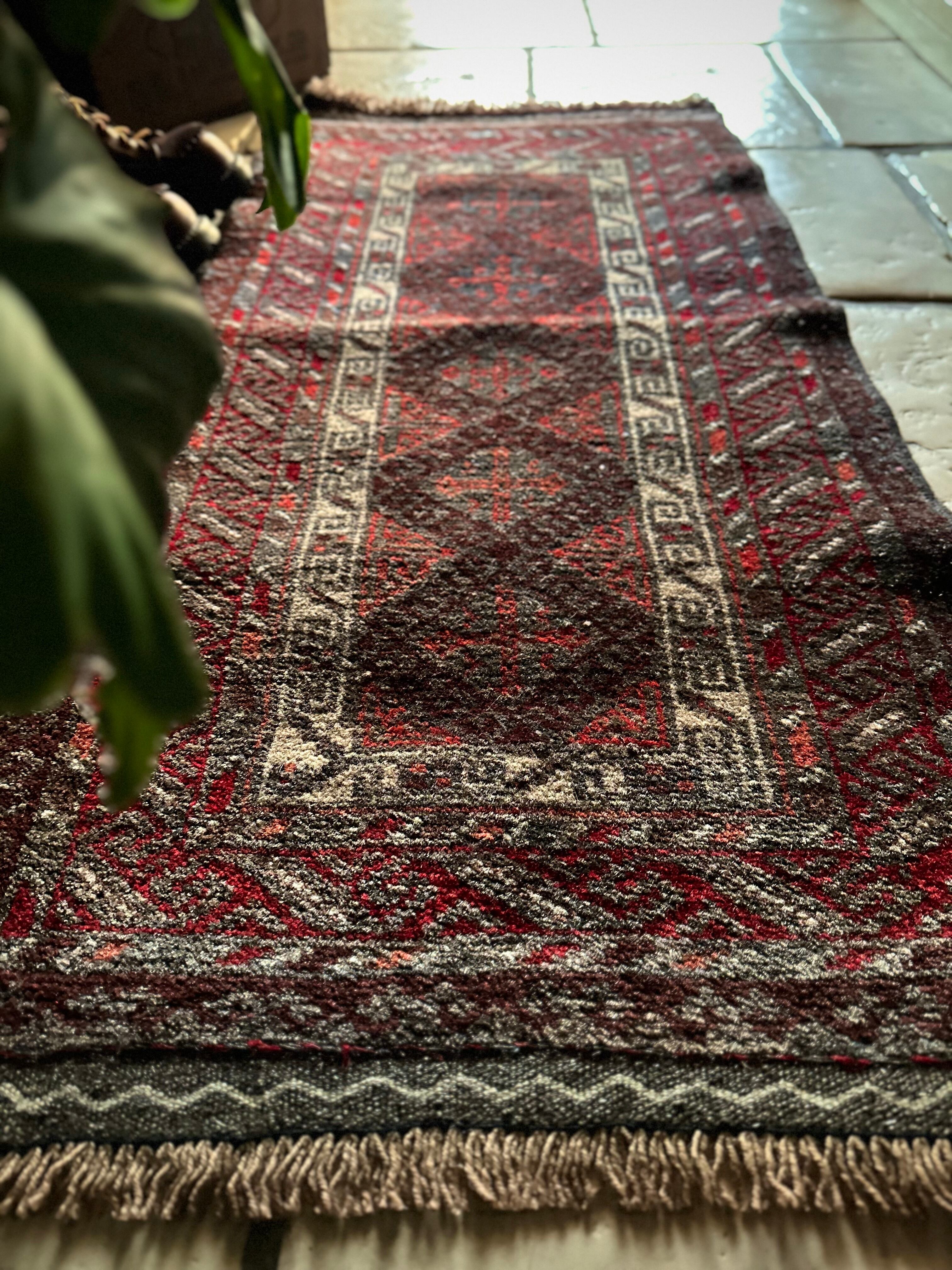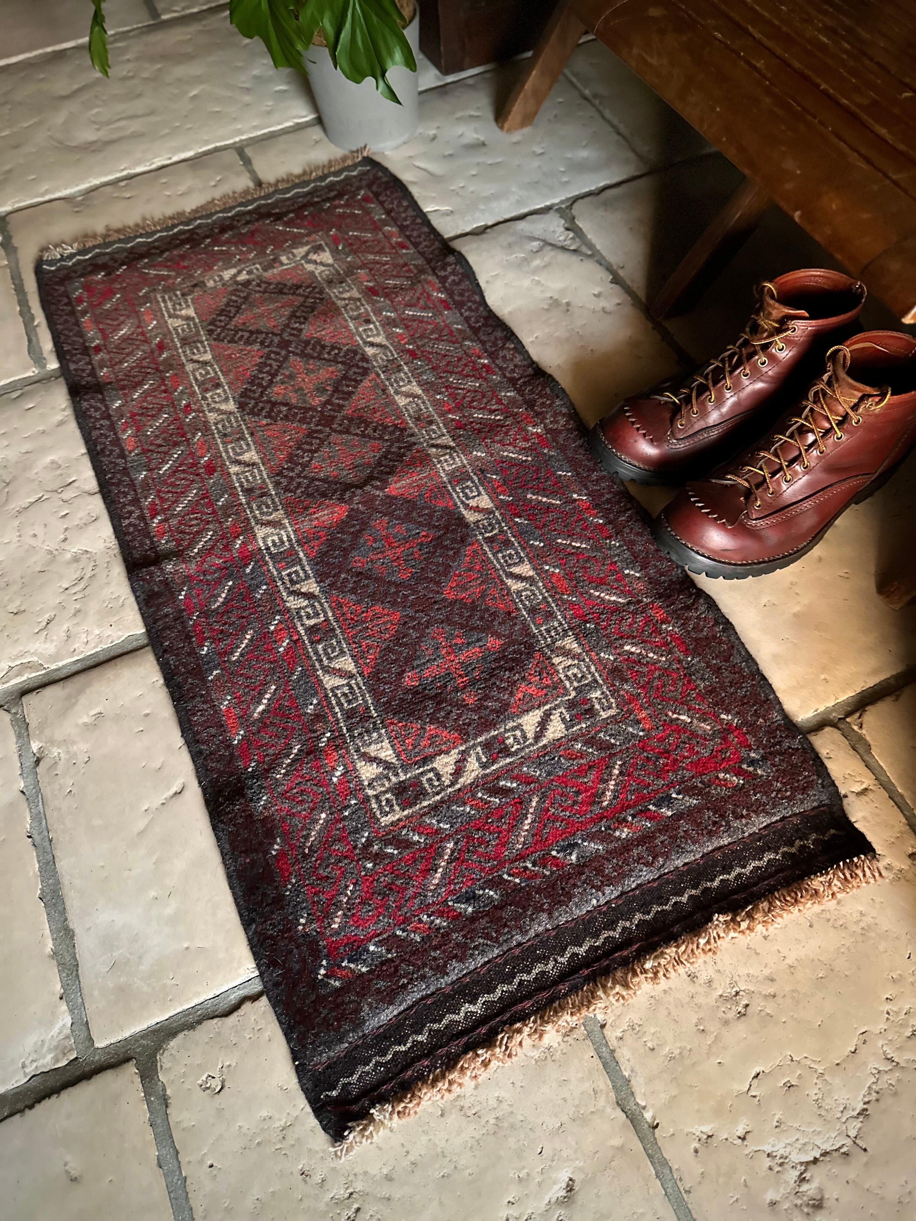 シックな赤とグレーのコントラストが落ち着ついた印象を与えてくれるバルーチ族のトライバルラグで、元々は収納やクッションとして使われていたバーリシトと呼ばれる袋物の表皮をラグに仕立て直してもらったモノになります。