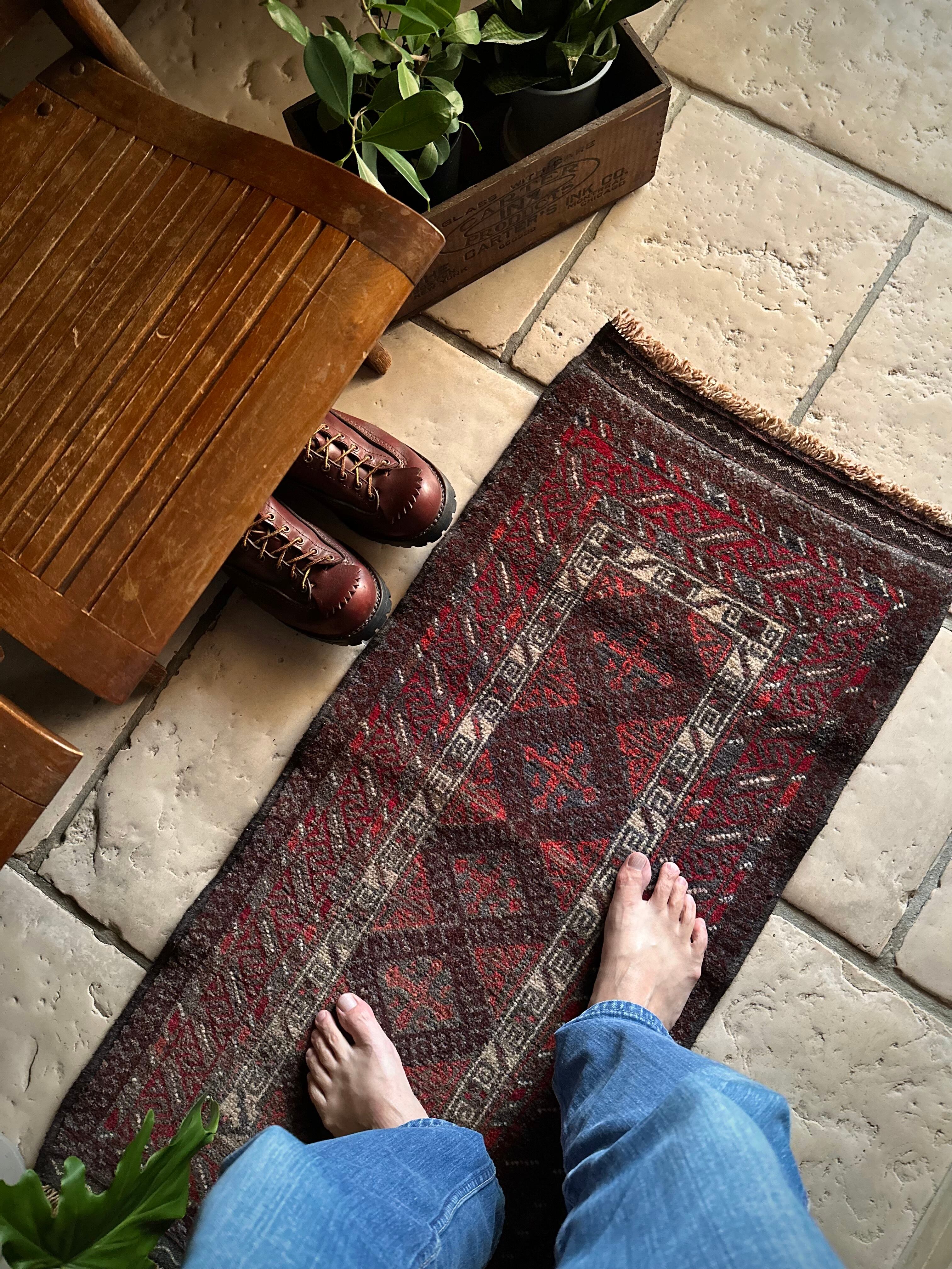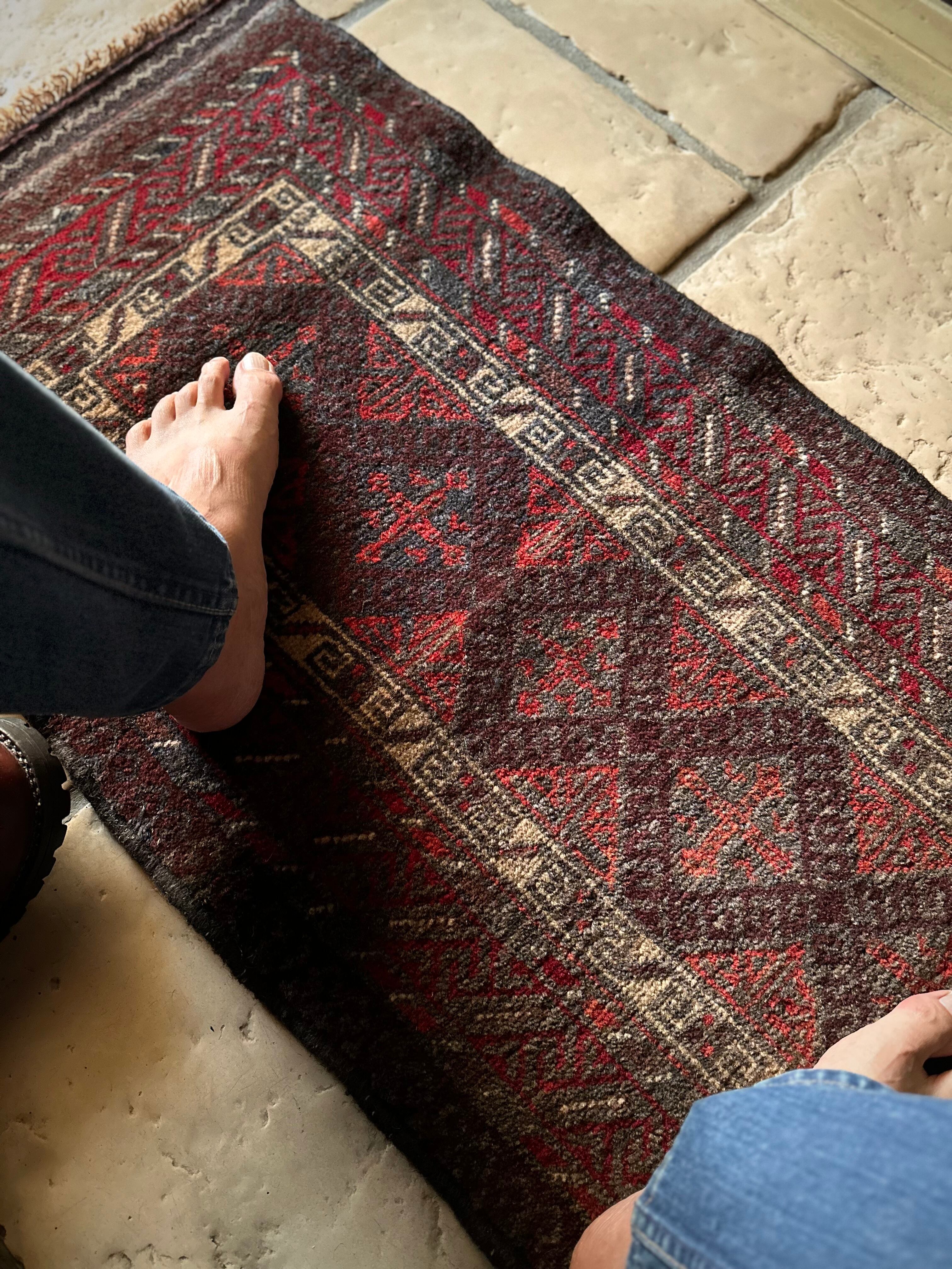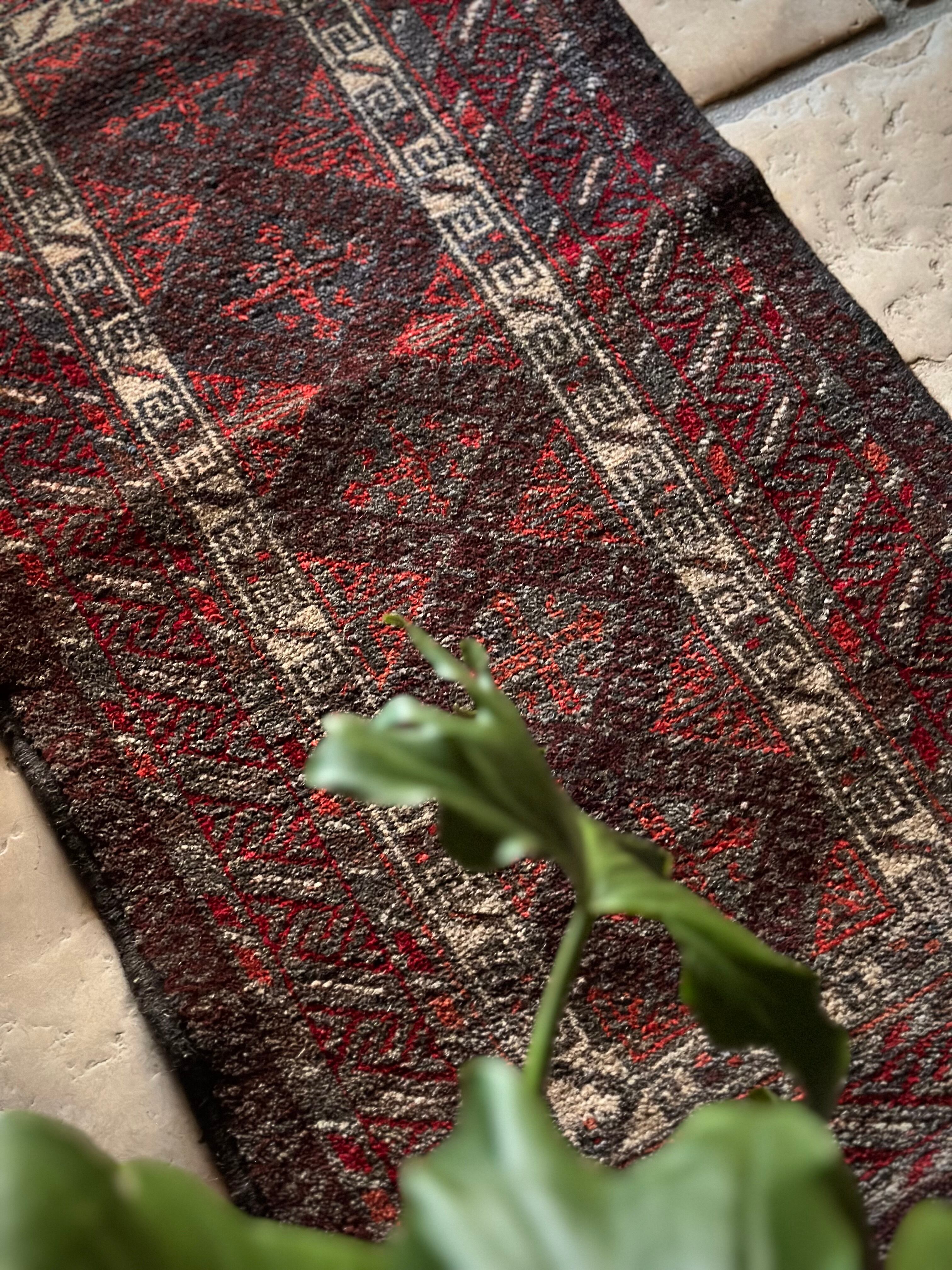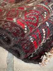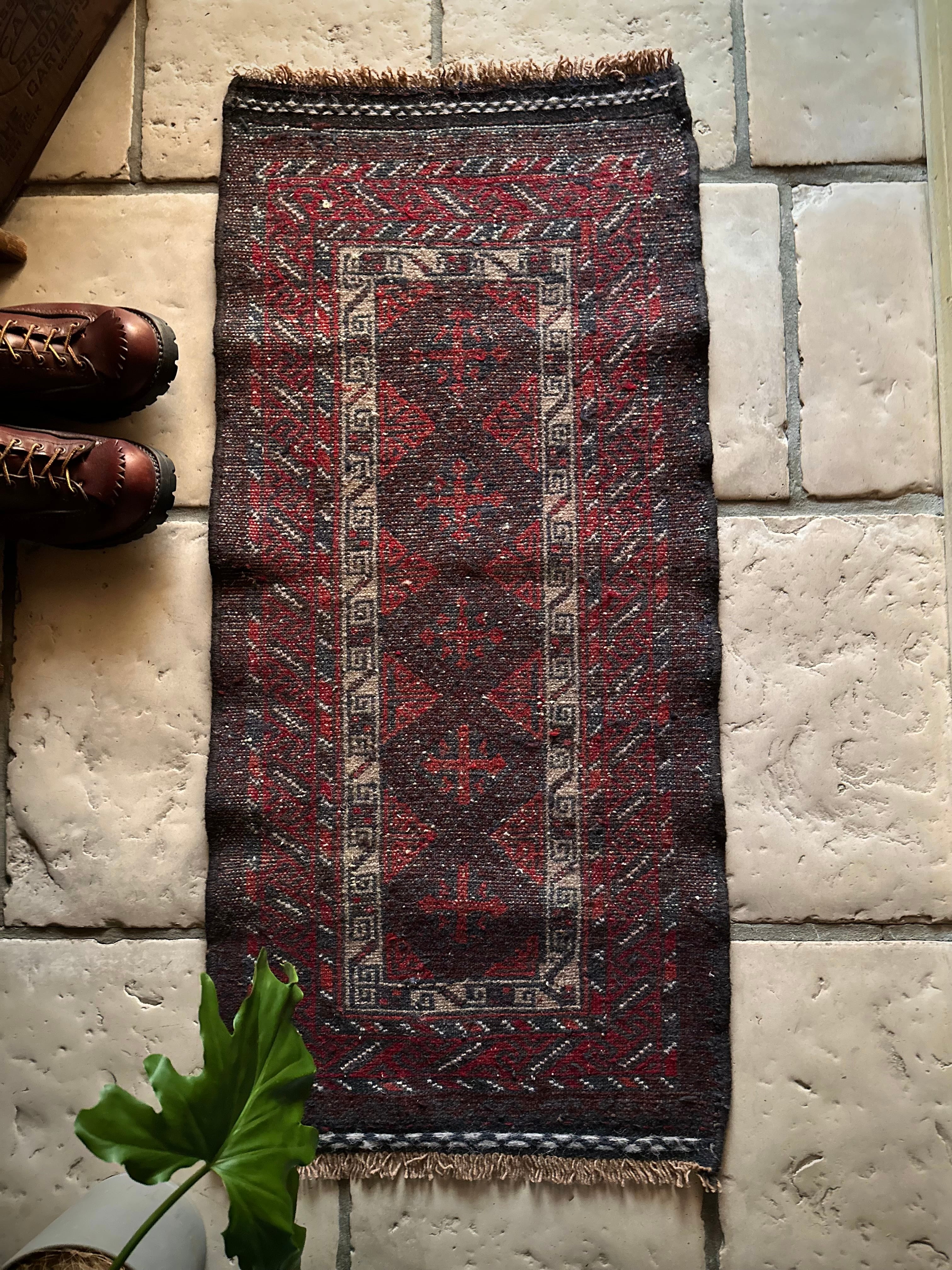 シックな赤とグレーのコントラストが落ち着ついた印象を与えてくれるバルーチ族のトライバルラグで、元々は収納やクッションとして使われていたバーリシトと呼ばれる袋物の表皮をラグに仕立て直してもらったモノになります。