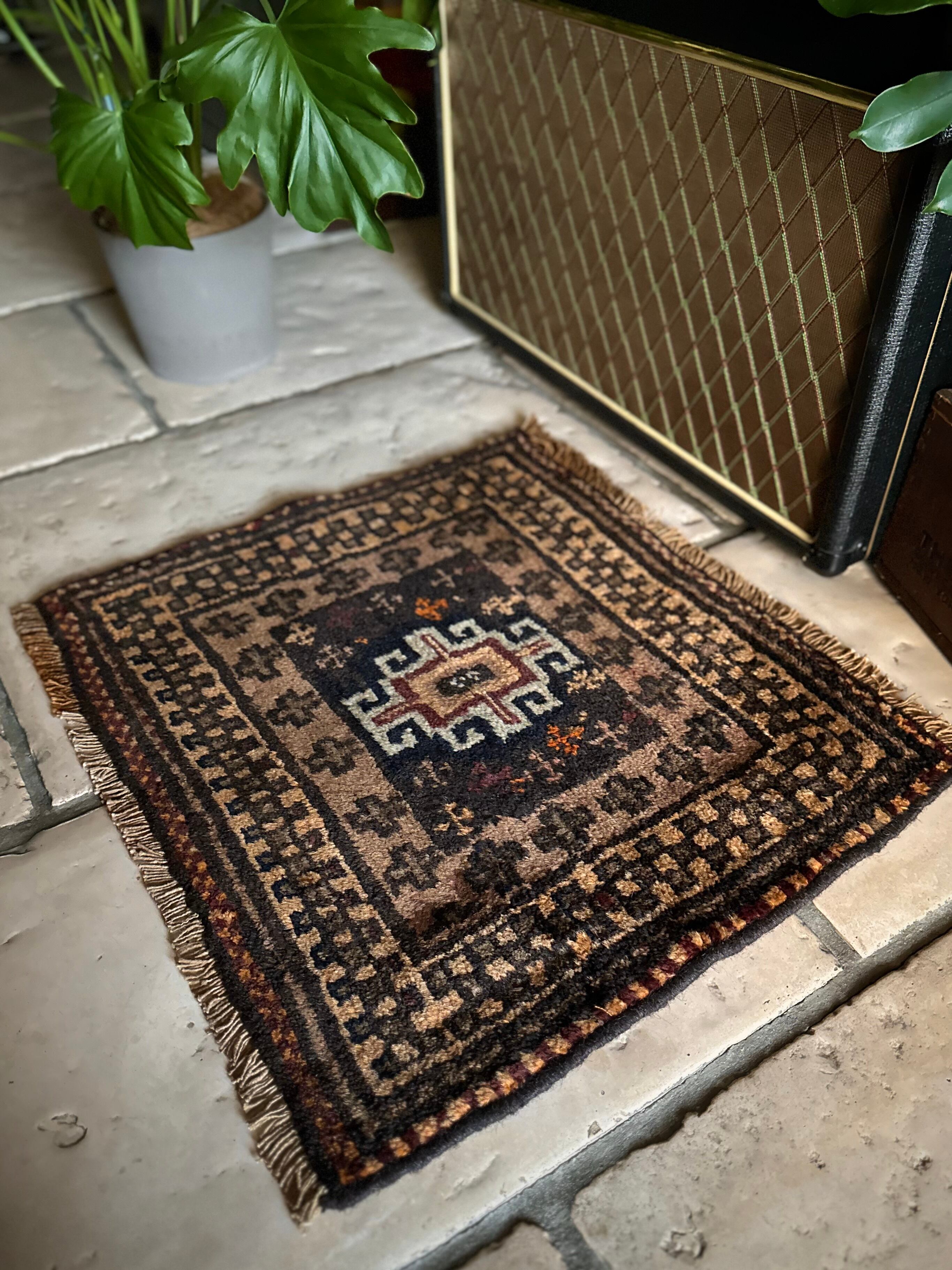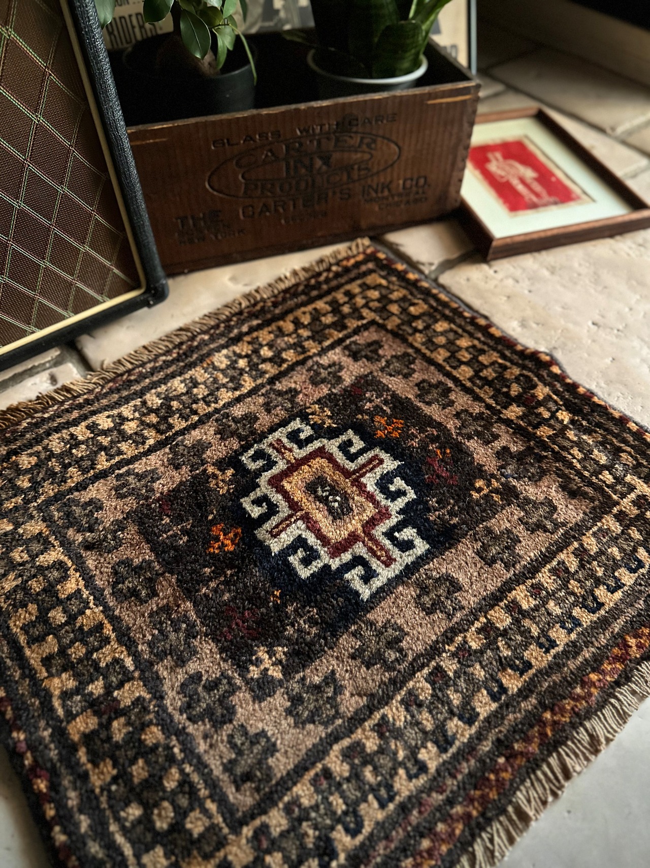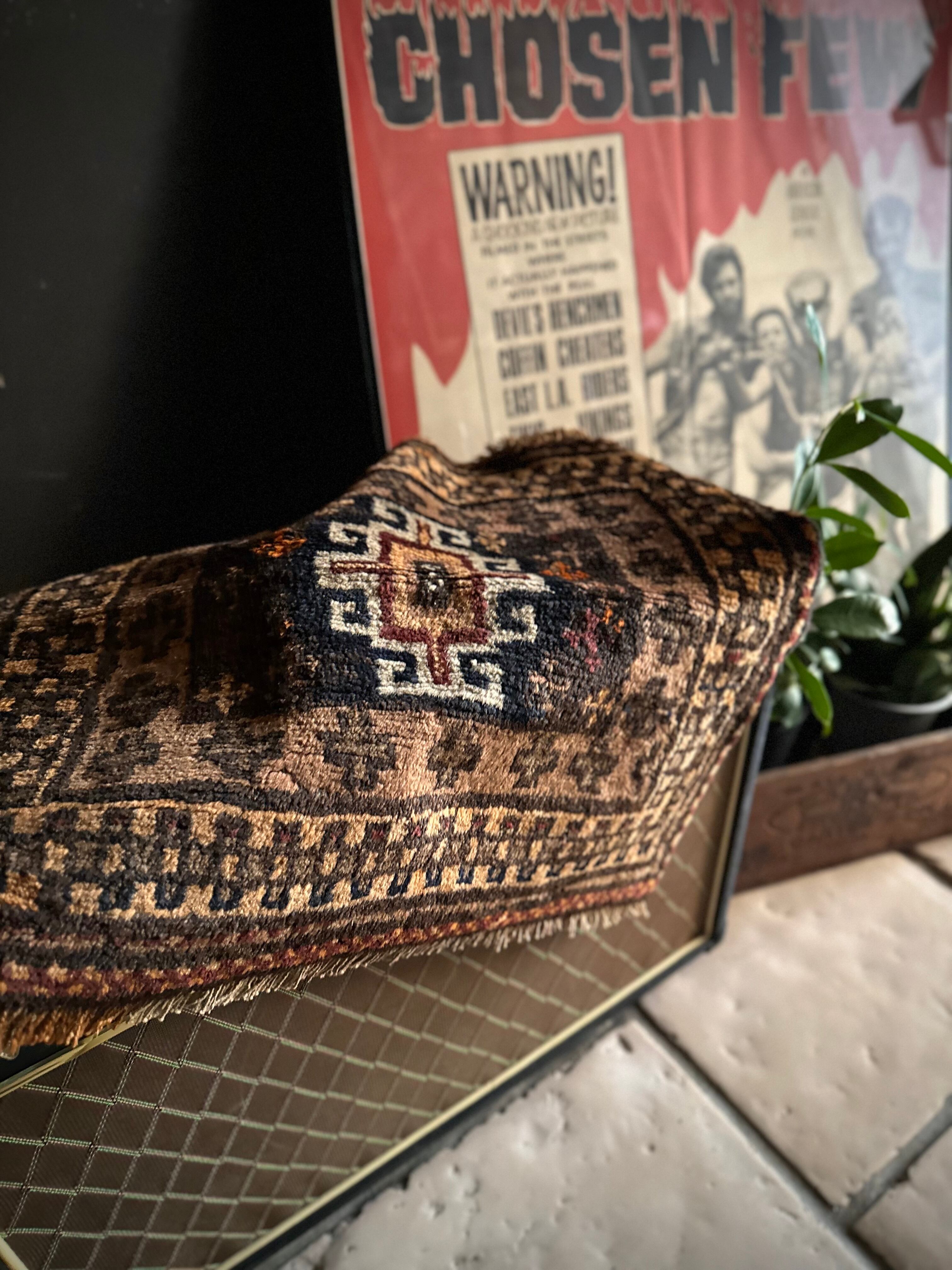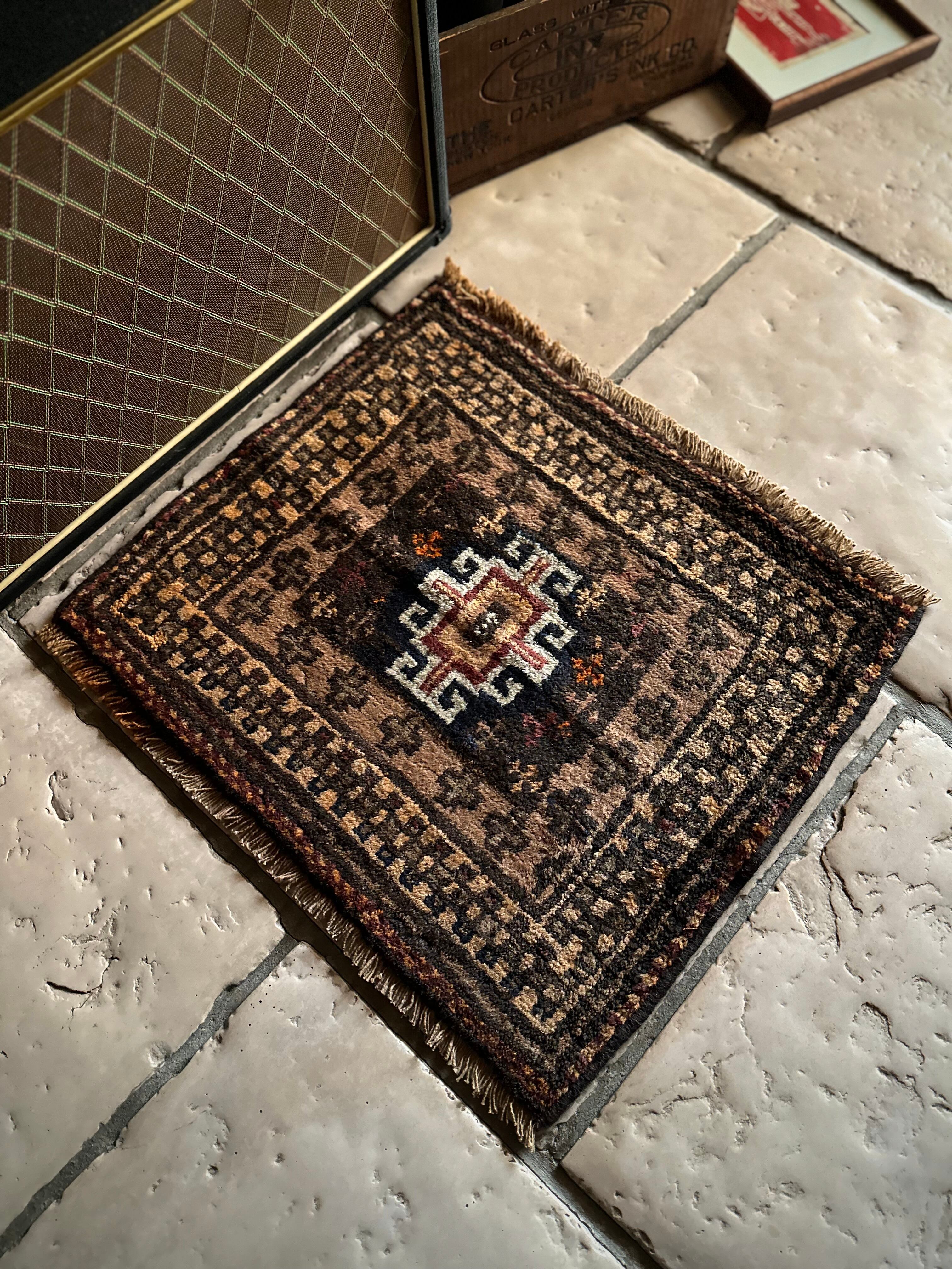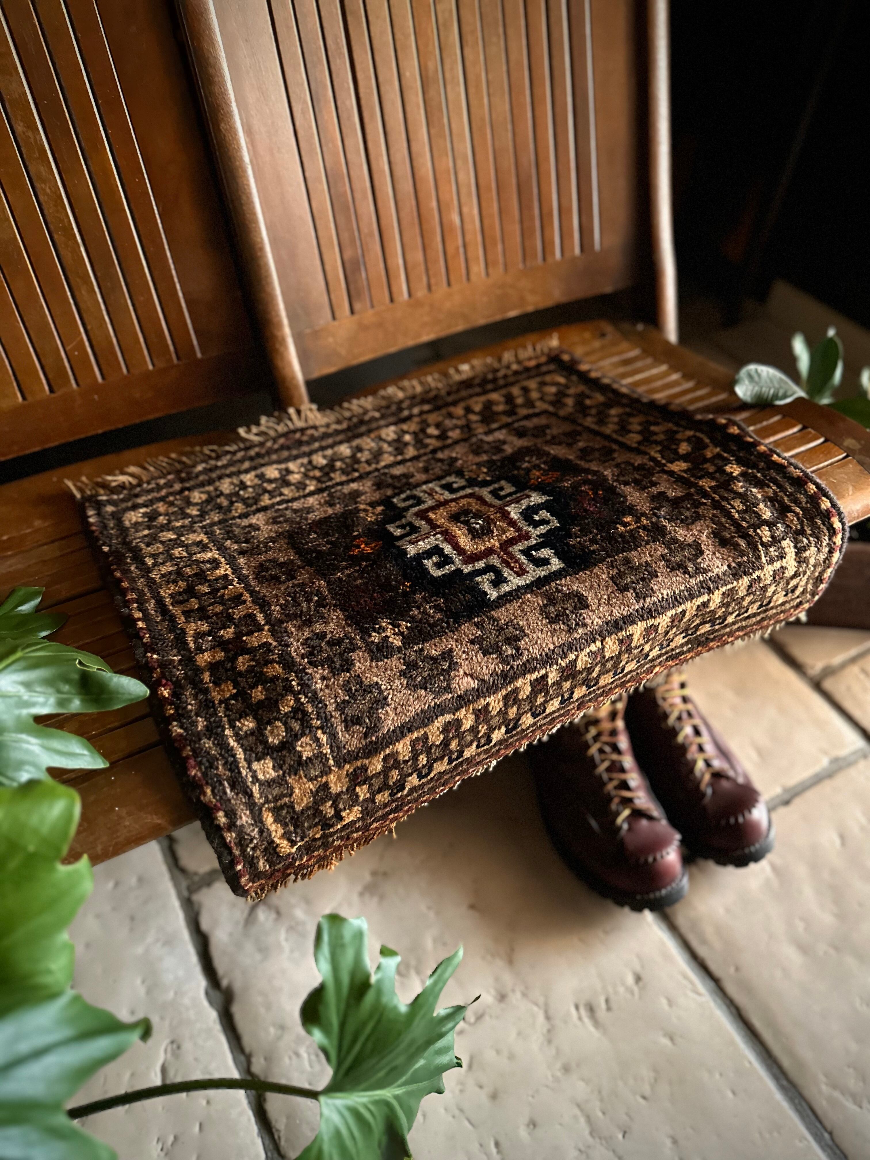 落ち着いた雰囲気のカフェオレをベースカラーに、シンプルな紋様で愛嬌さえ感じてしまうバルーチ族のトライバルラグで、元々はホルジンと呼ばれるラクダやロバの背に跨がせるサドルバッグやトルパと言った袋物の表皮をラグに仕立て直したモノになります。