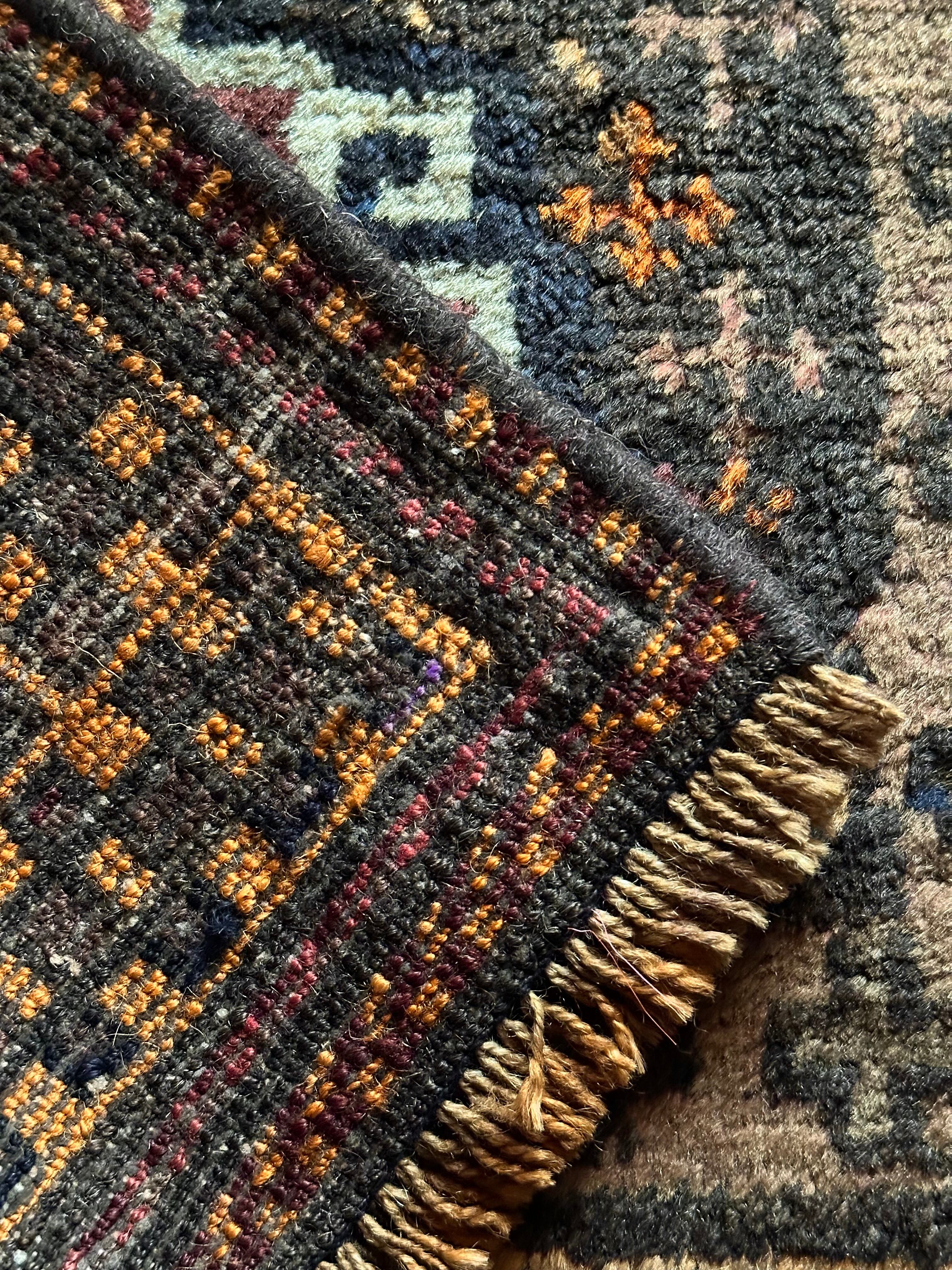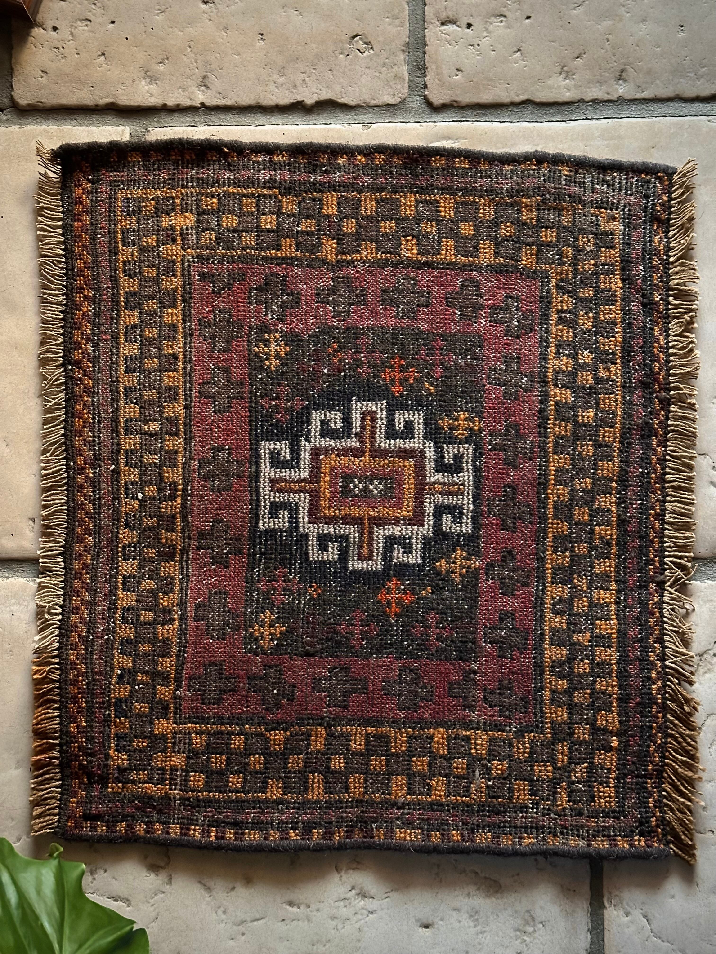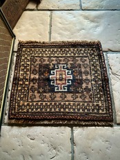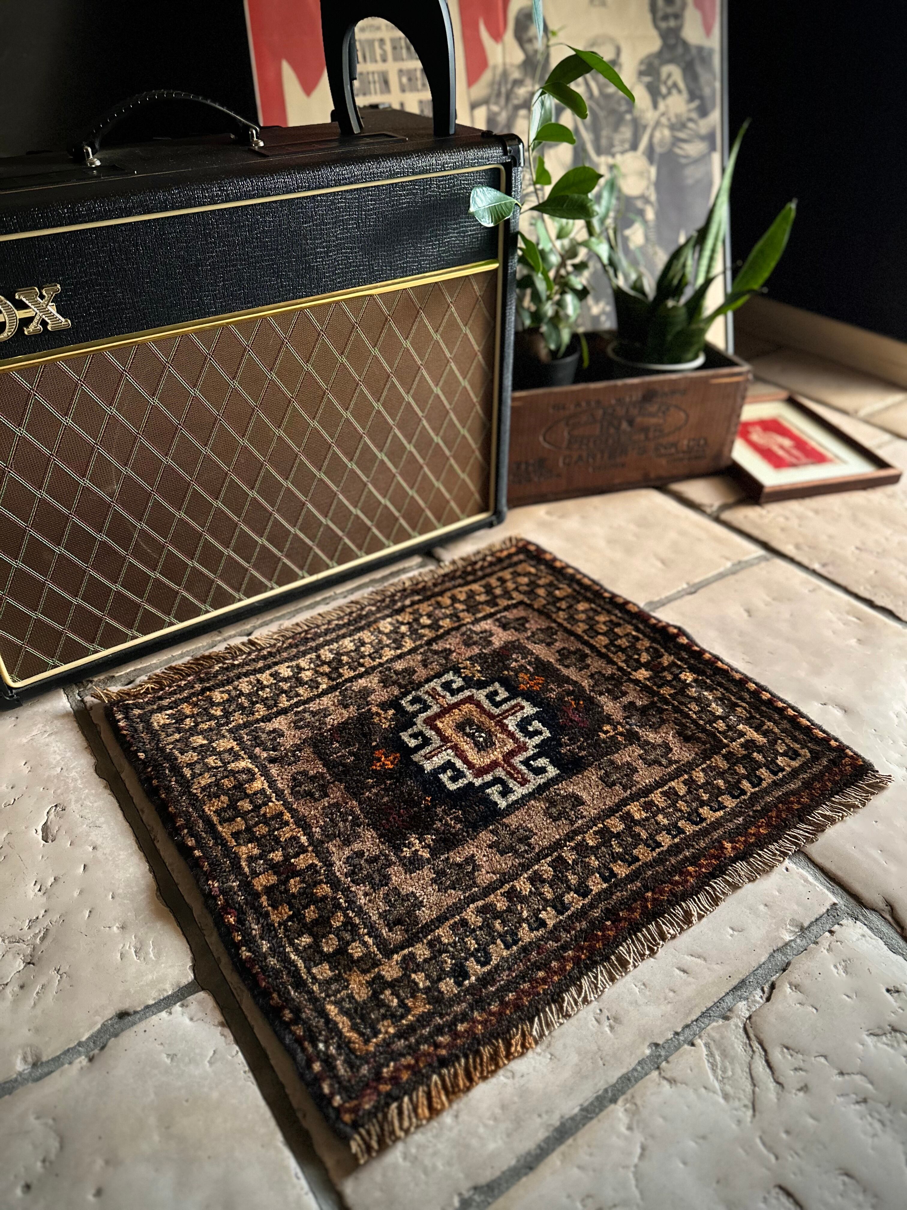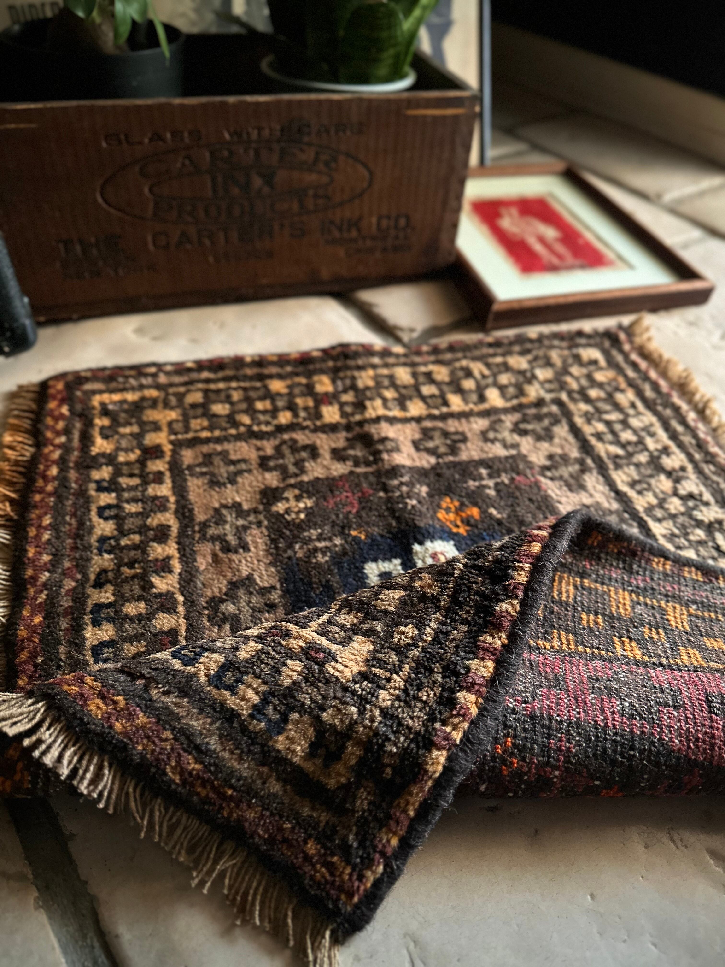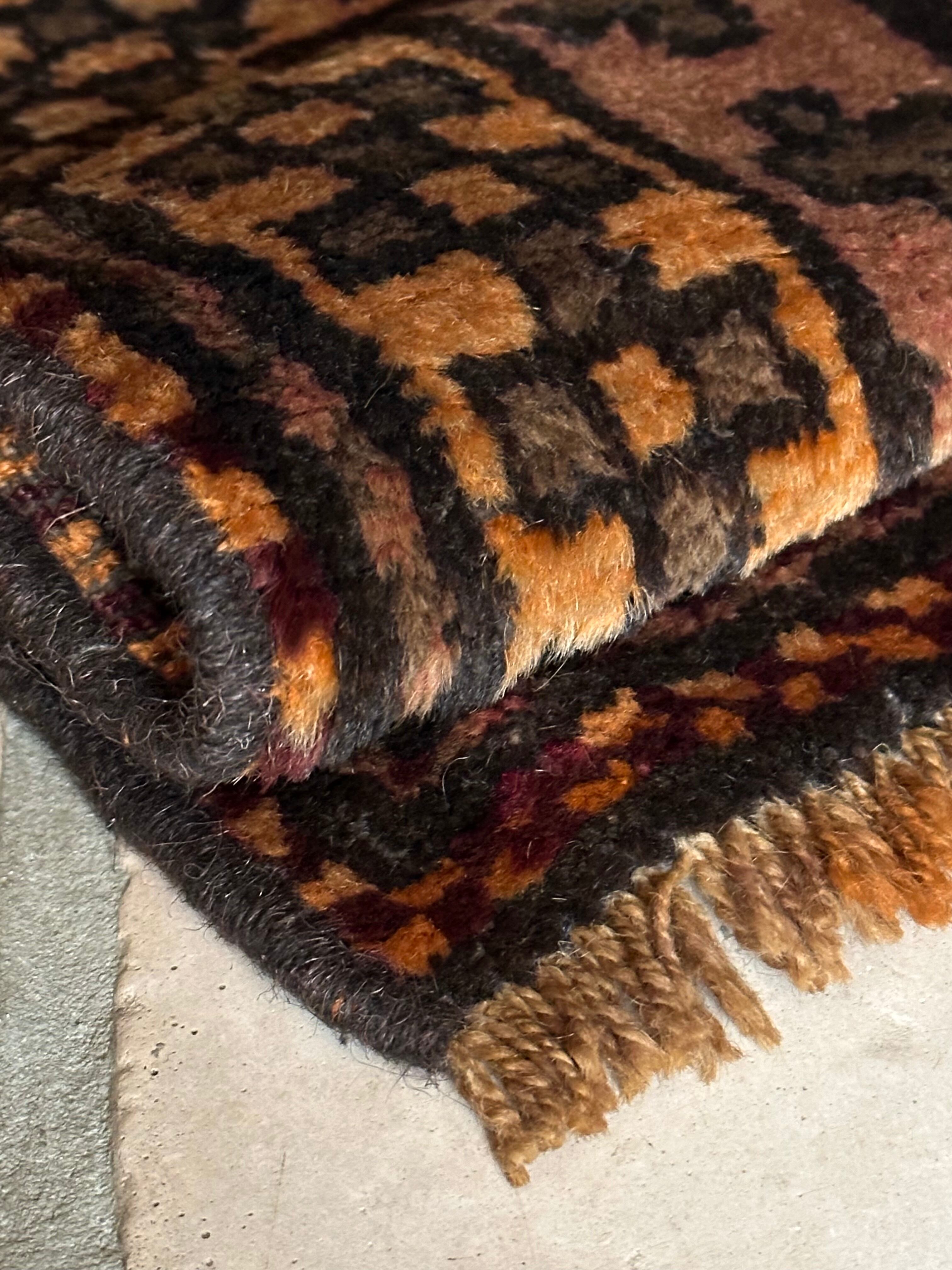 落ち着いた雰囲気のカフェオレをベースカラーに、シンプルな紋様で愛嬌さえ感じてしまうバルーチ族のトライバルラグで、元々はホルジンと呼ばれるラクダやロバの背に跨がせるサドルバッグやトルパと言った袋物の表皮をラグに仕立て直したモノになります。