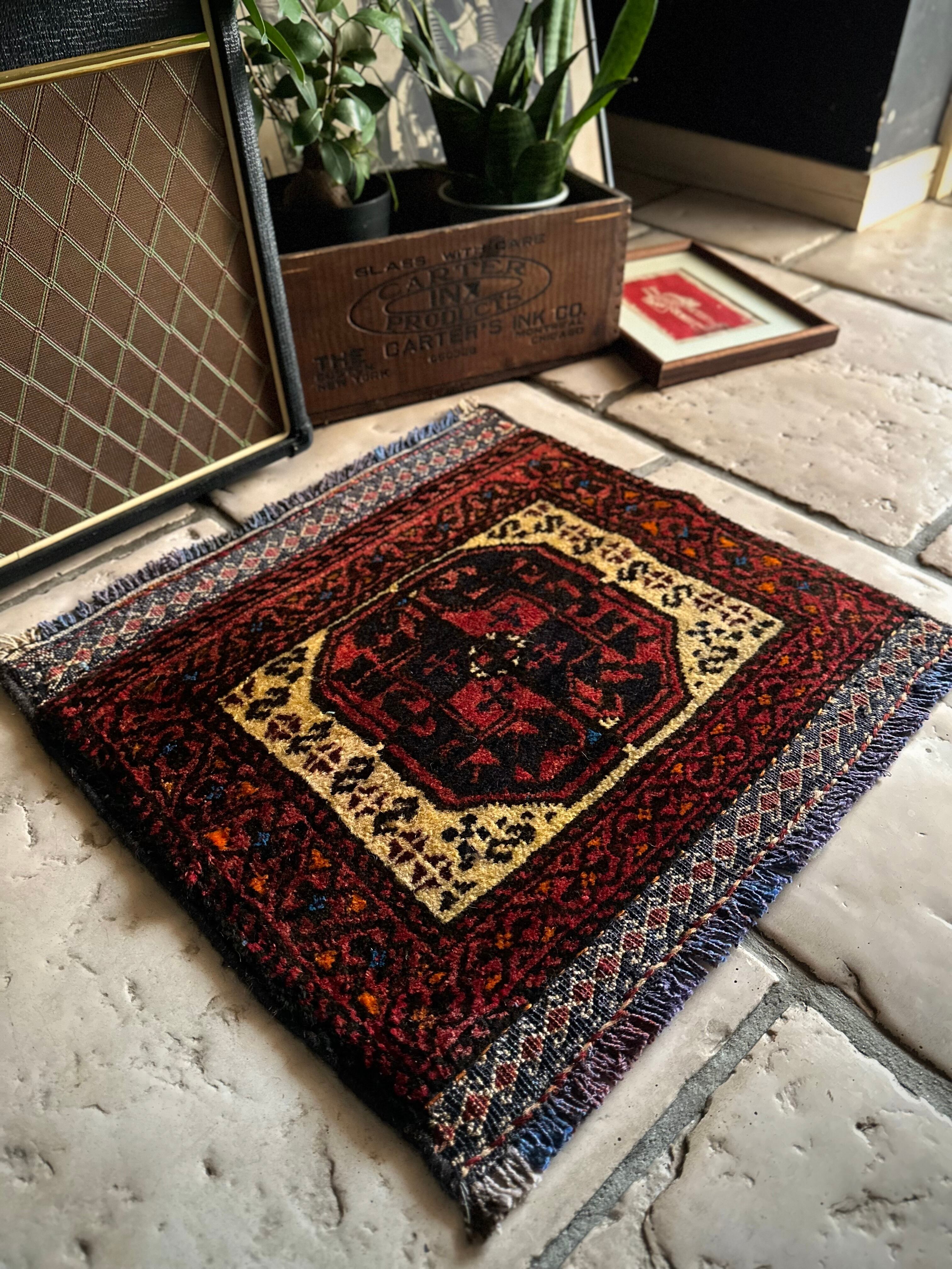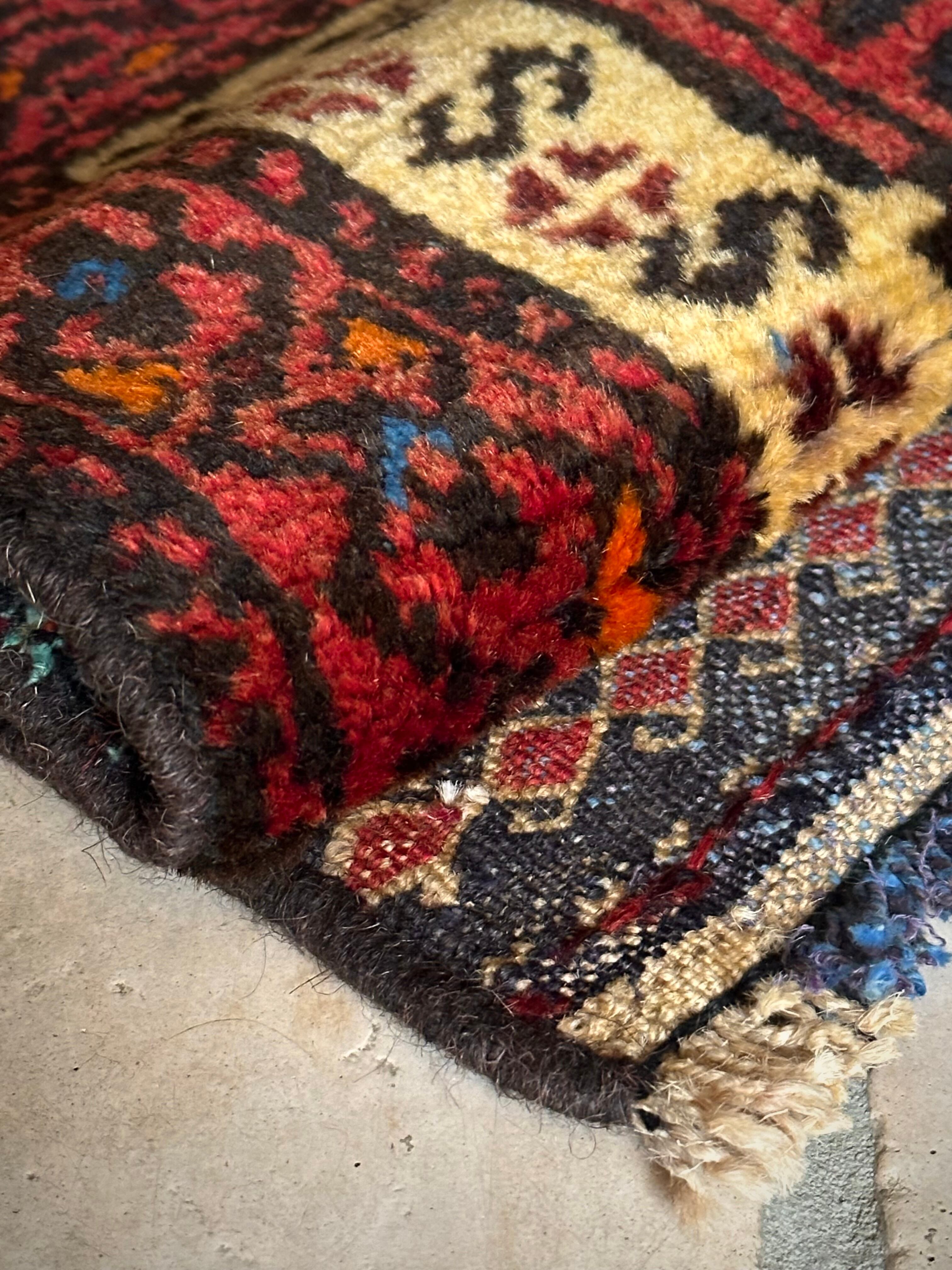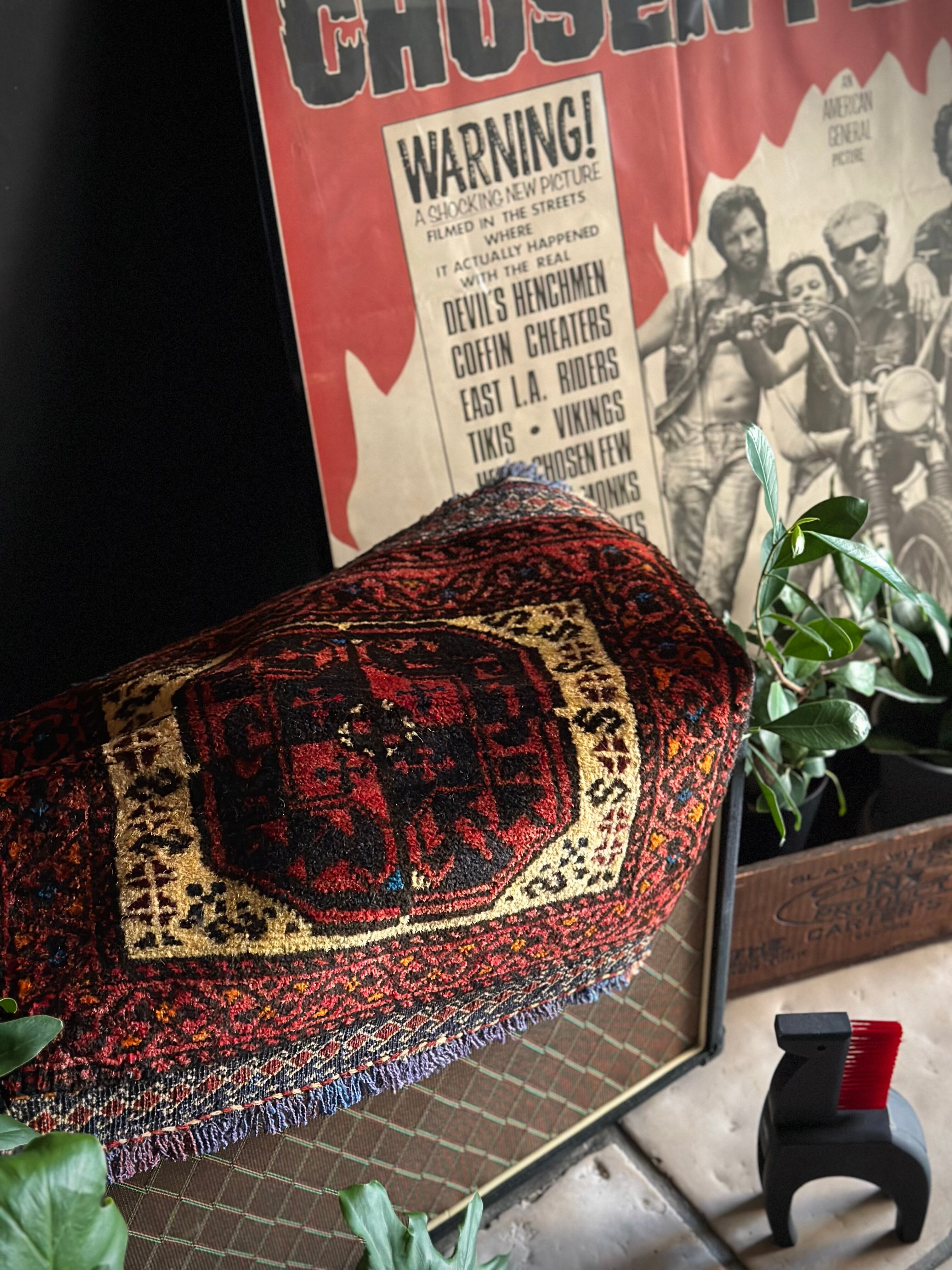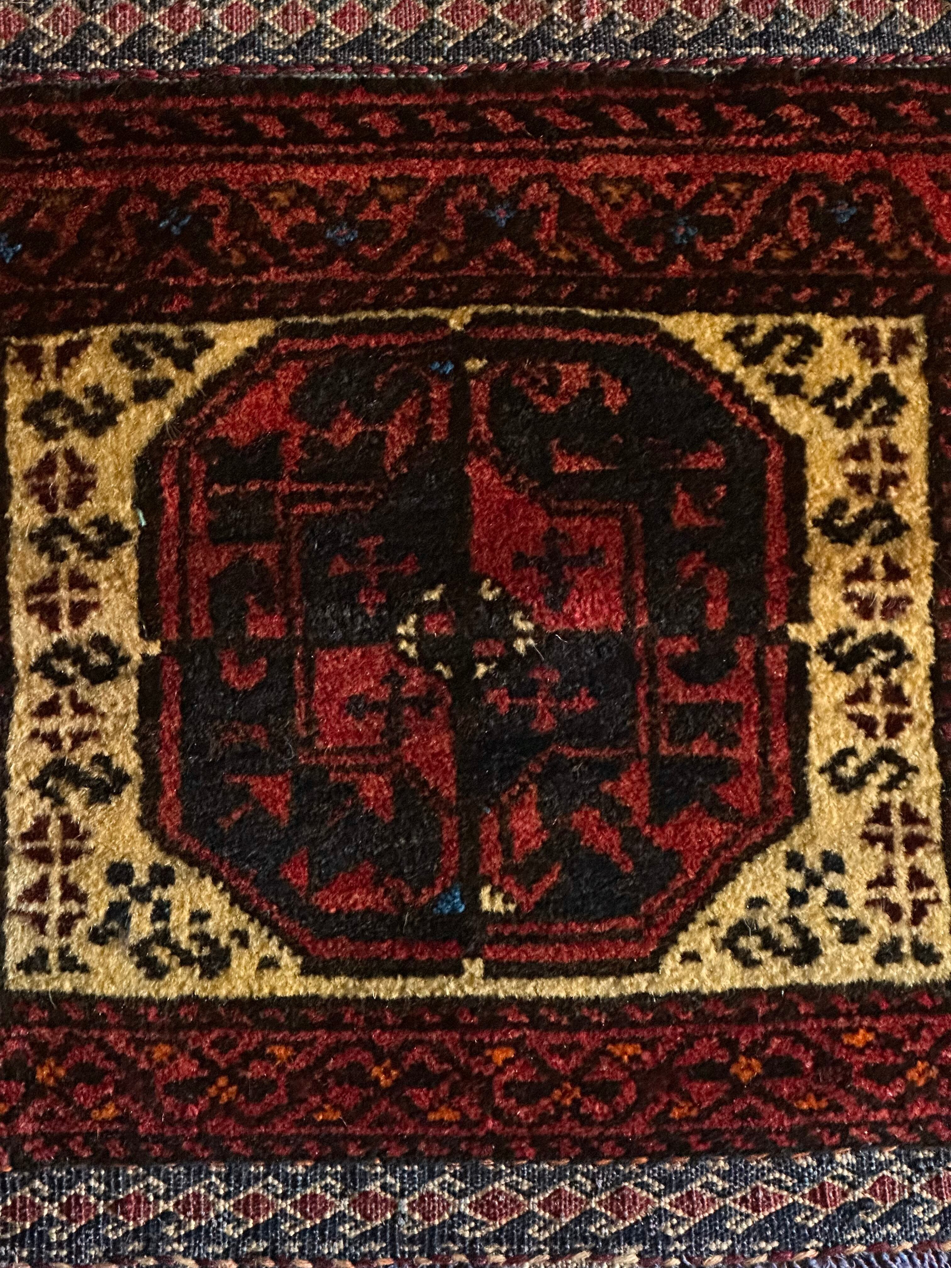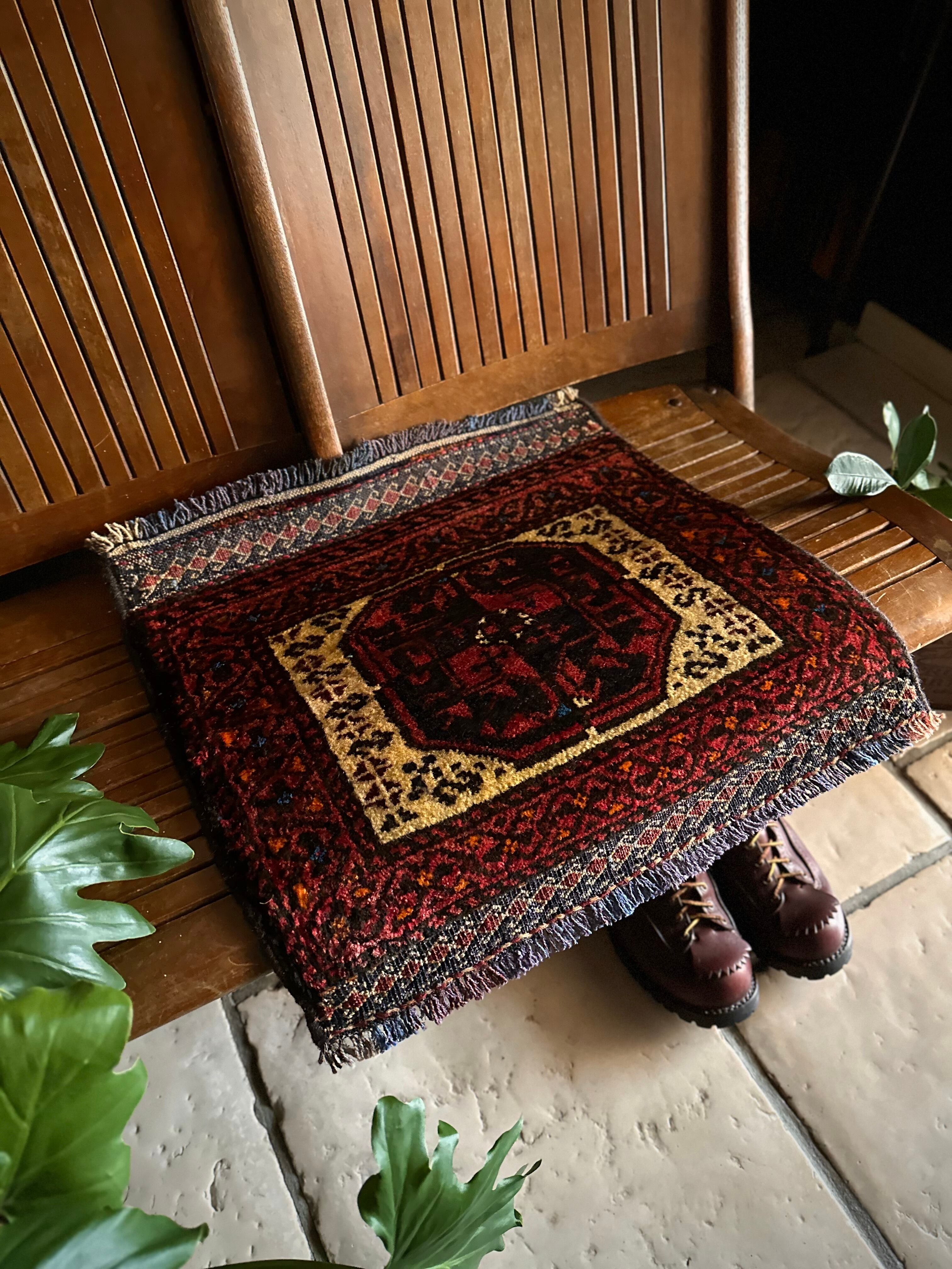 部族の誇りを感じさせる大きなテッケギュルがこれ見よがしに描かれいて、ベージュとボルドーのコントラストがかっこいいバルーチ族のトライバルラグになります。元々はホルジンと呼ばれるラクダやロバの背に跨がせるサドルバッグやトルパと言った袋物の表皮をラグに仕立て直したモノになります。