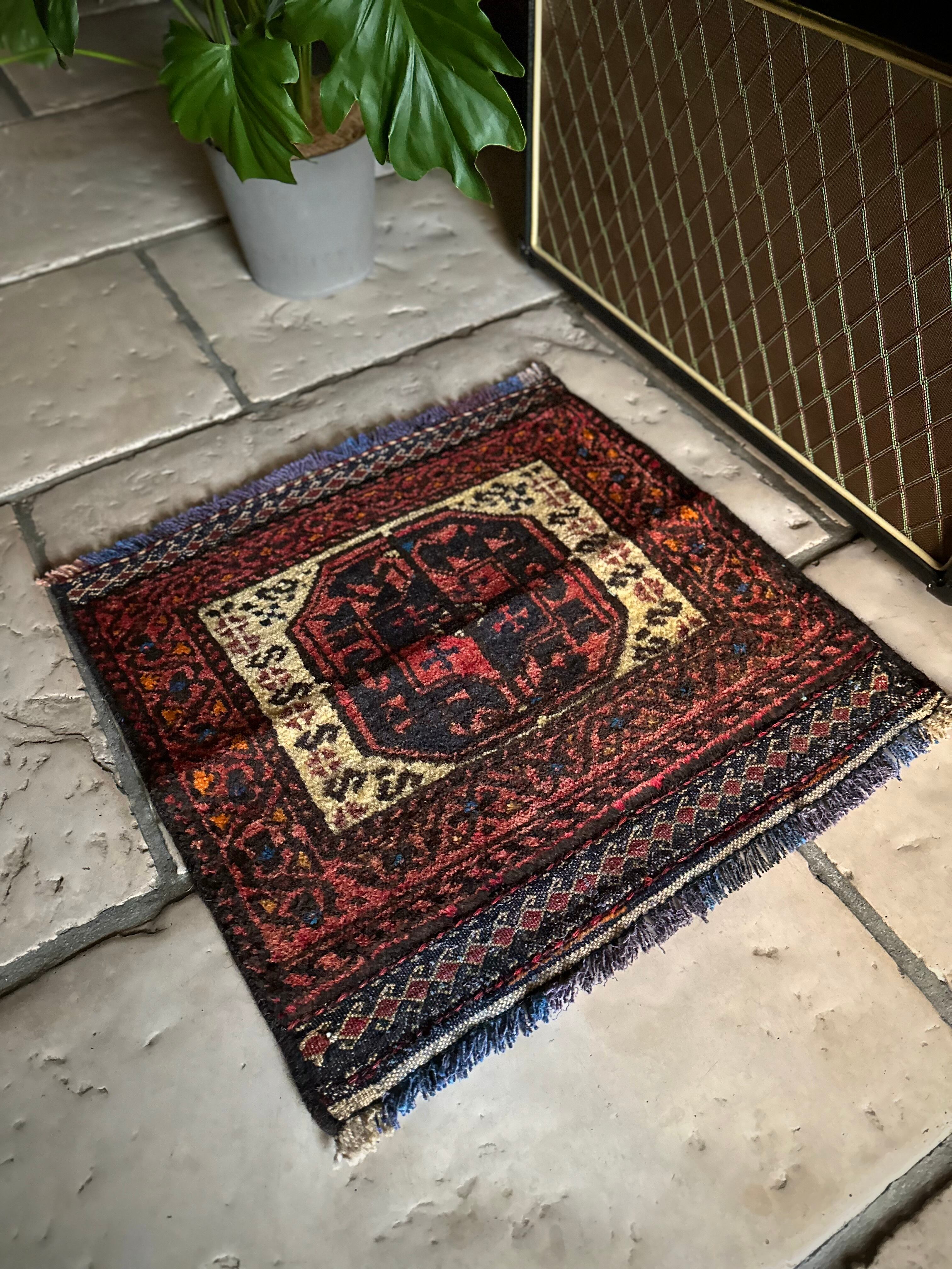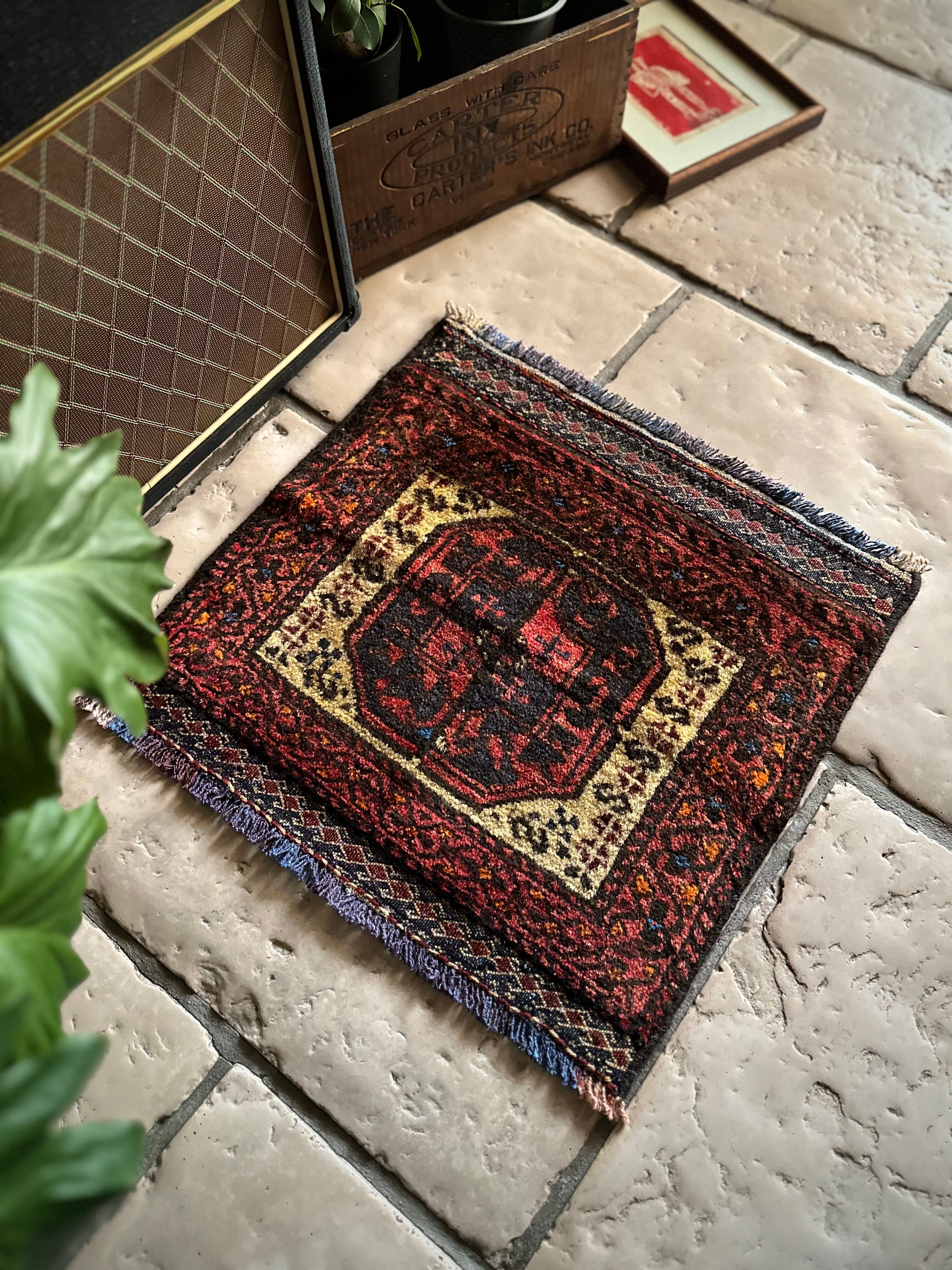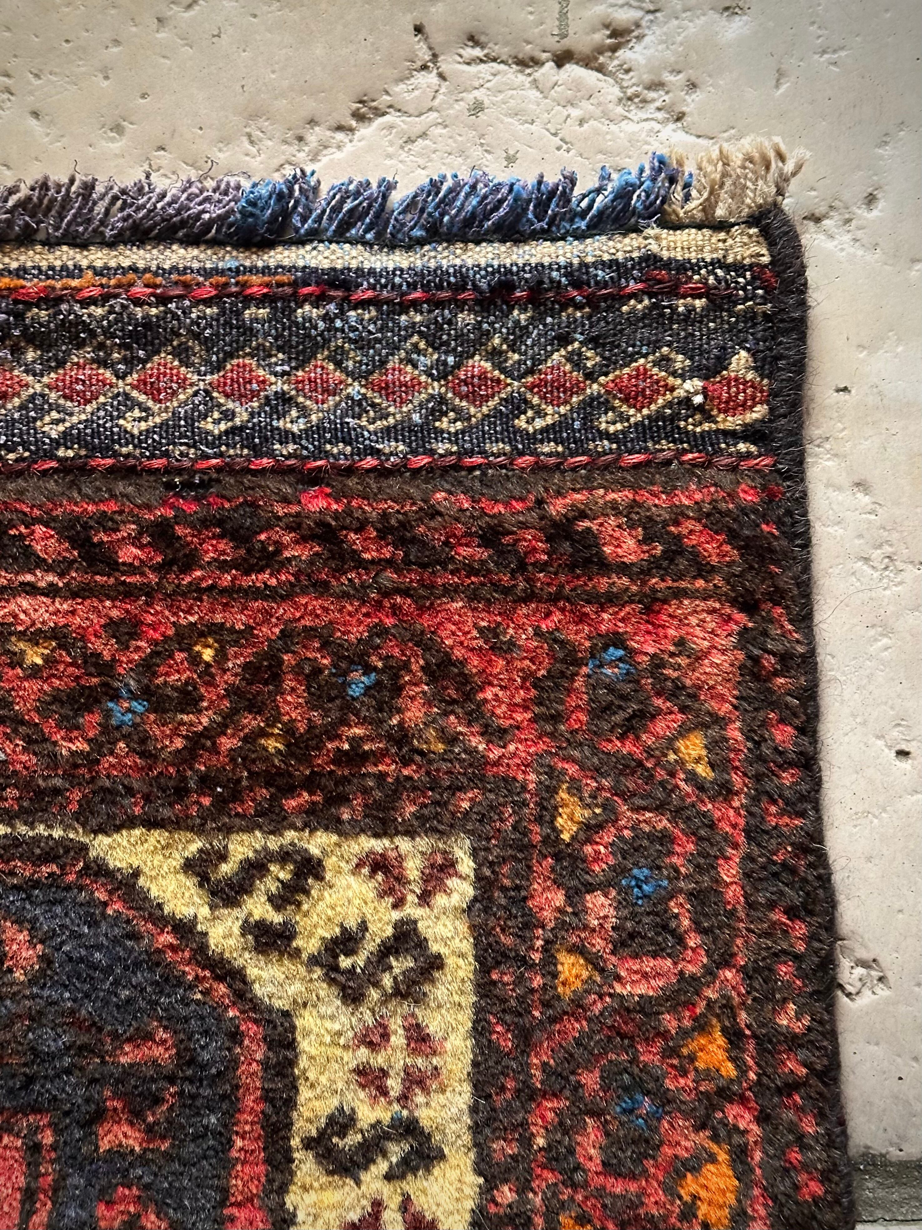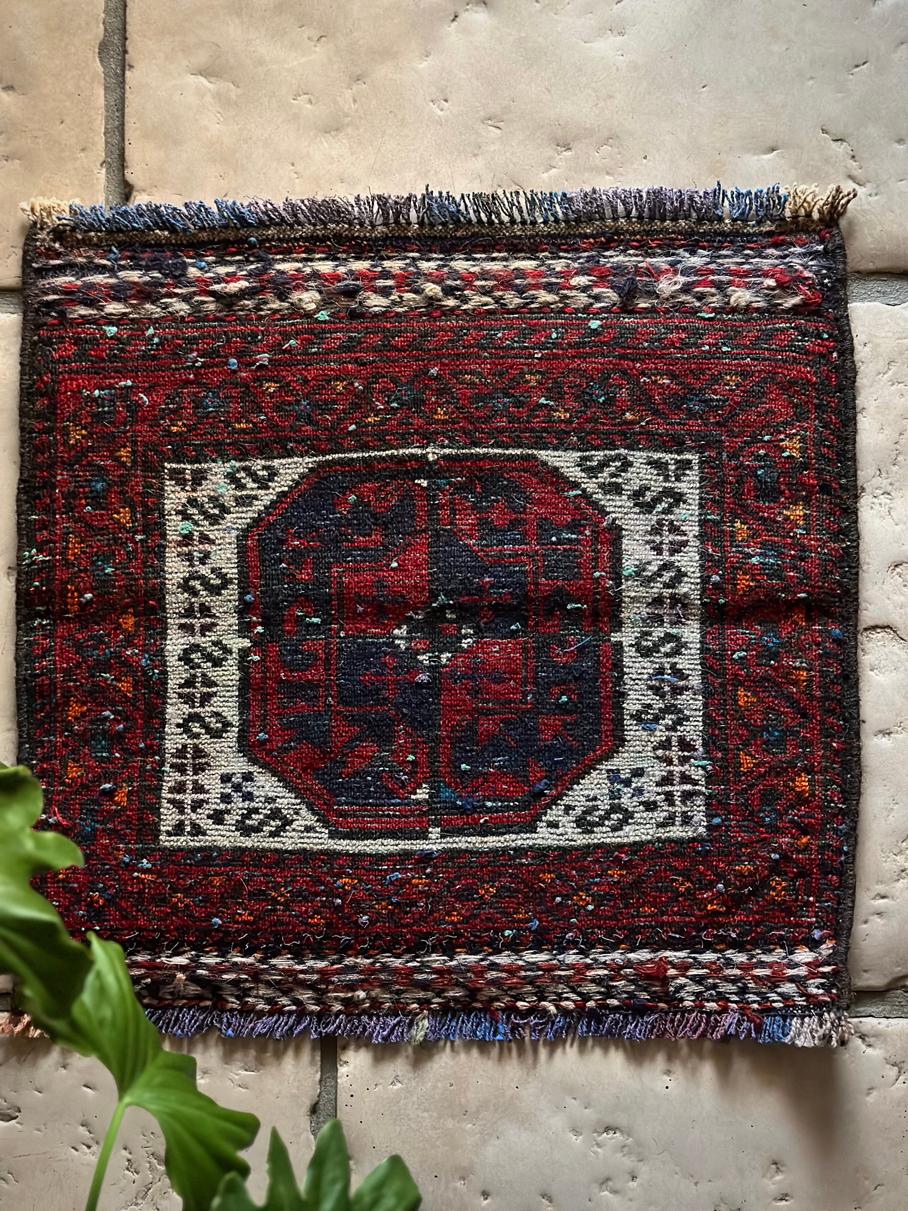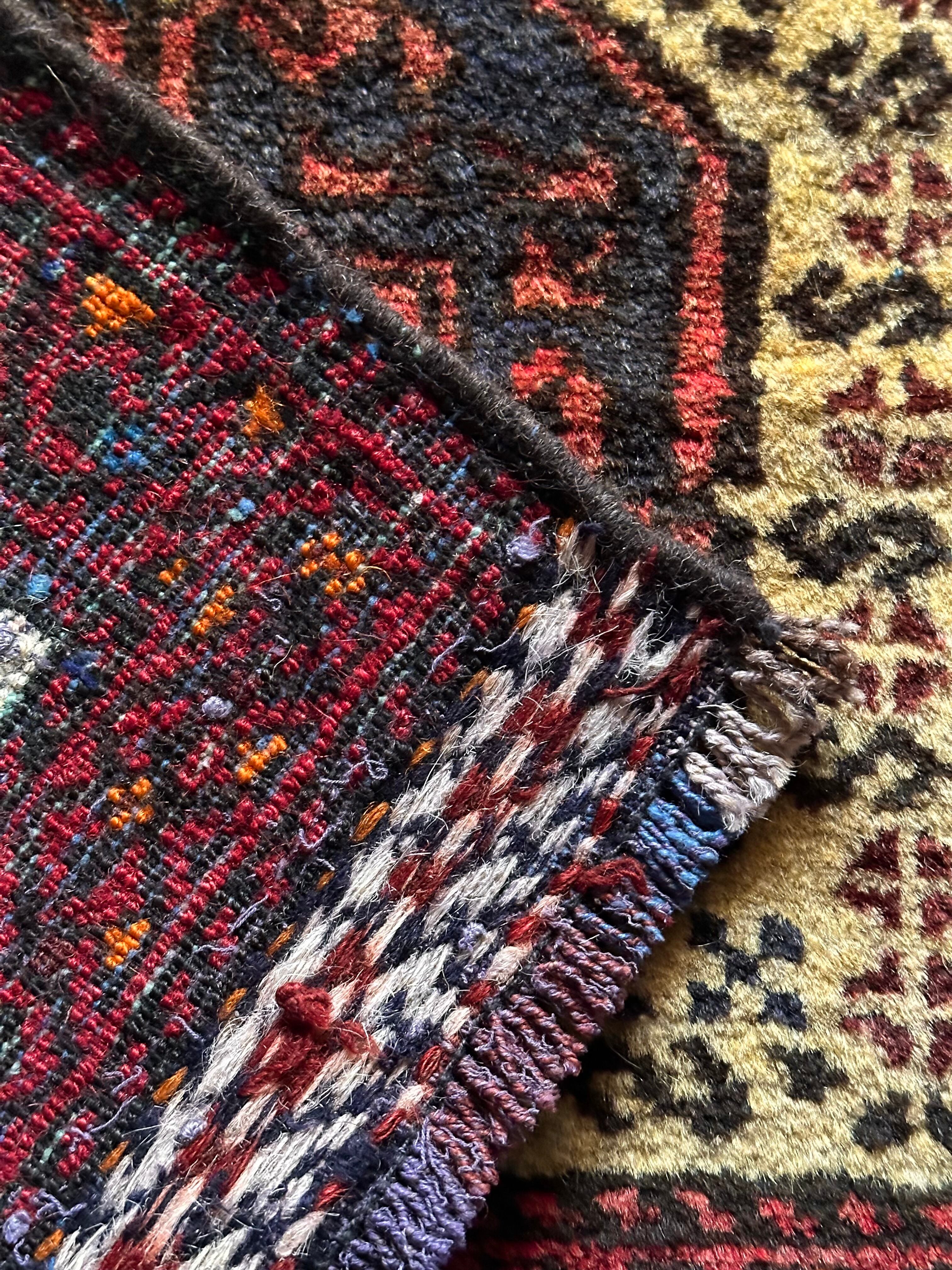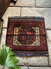 部族の誇りを感じさせる大きなテッケギュルがこれ見よがしに描かれいて、ベージュとボルドーのコントラストがかっこいいバルーチ族のトライバルラグになります。元々はホルジンと呼ばれるラクダやロバの背に跨がせるサドルバッグやトルパと言った袋物の表皮をラグに仕立て直したモノになります。