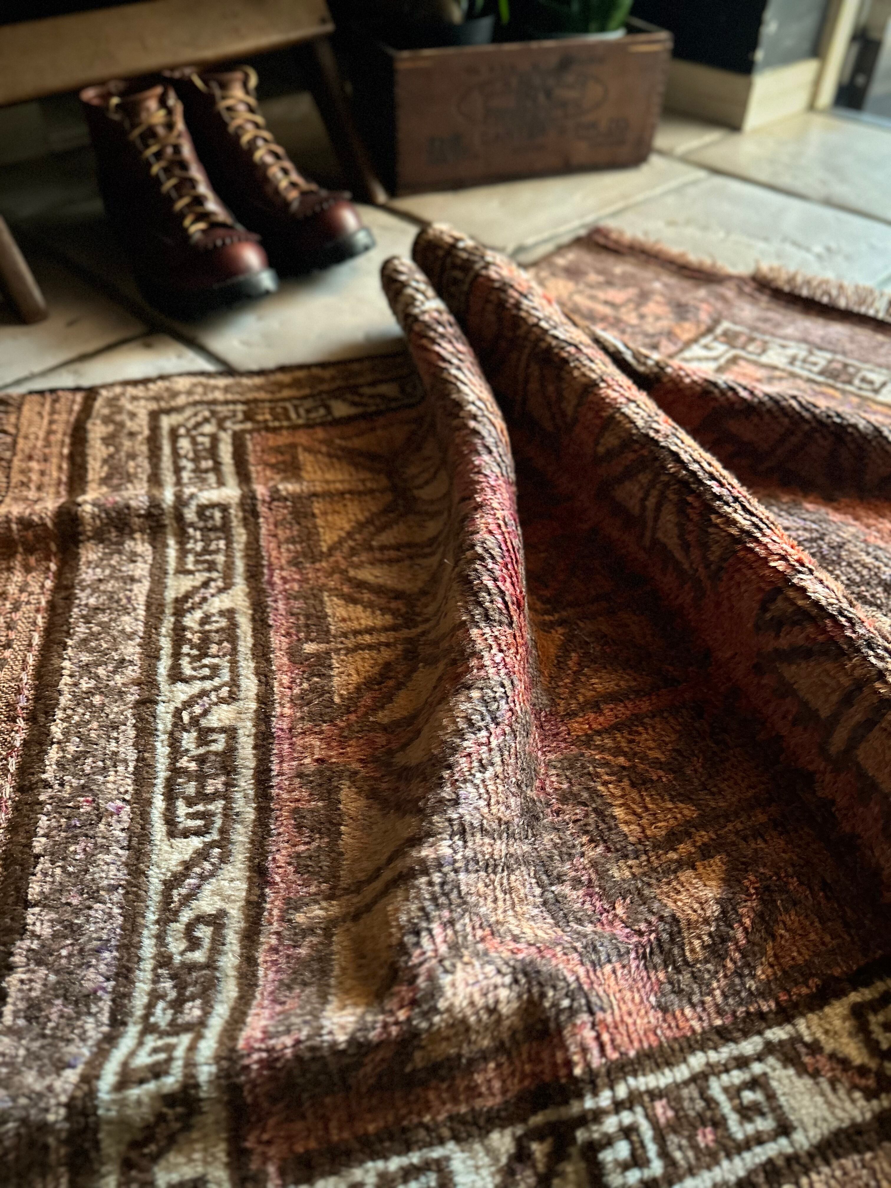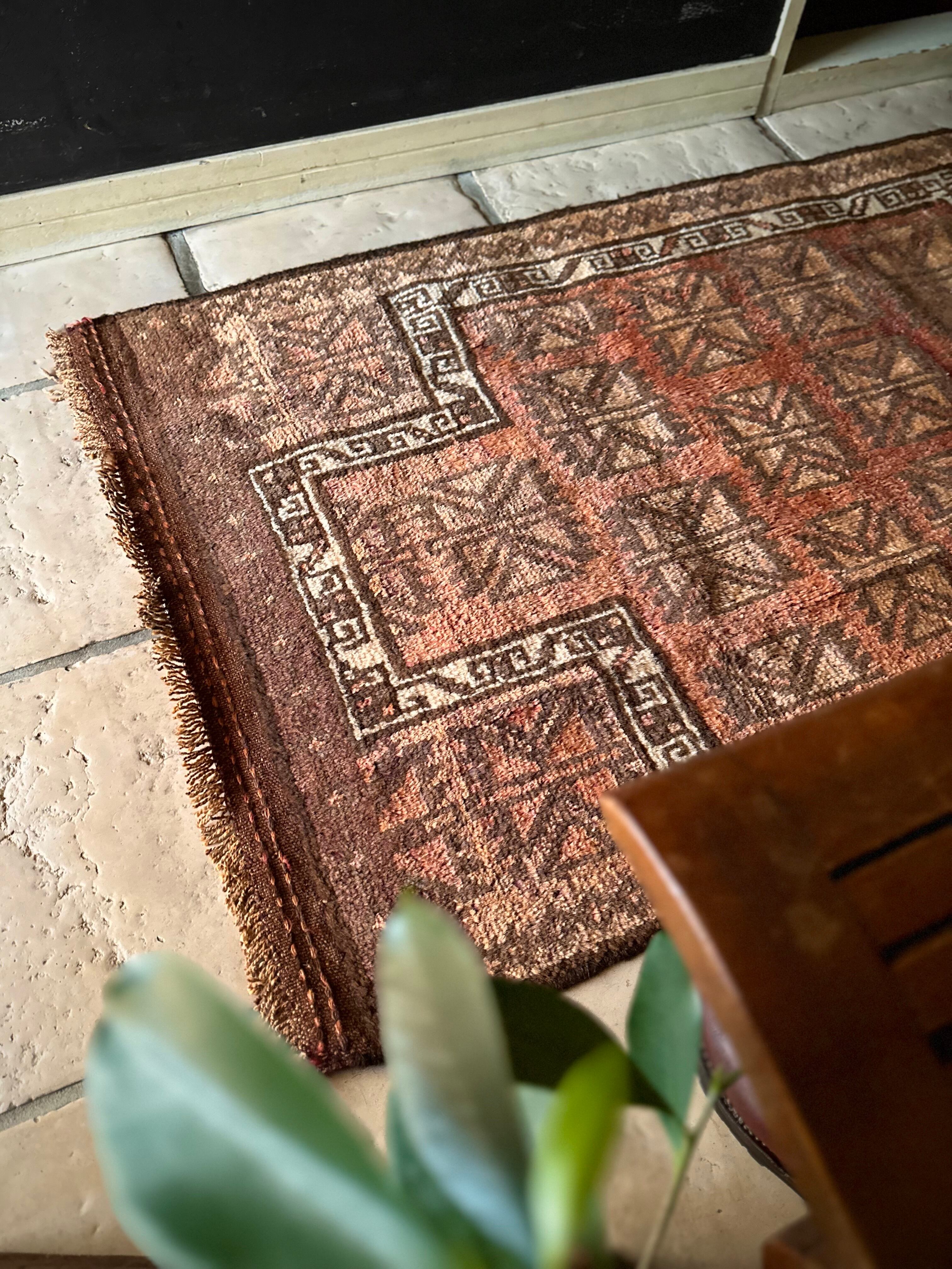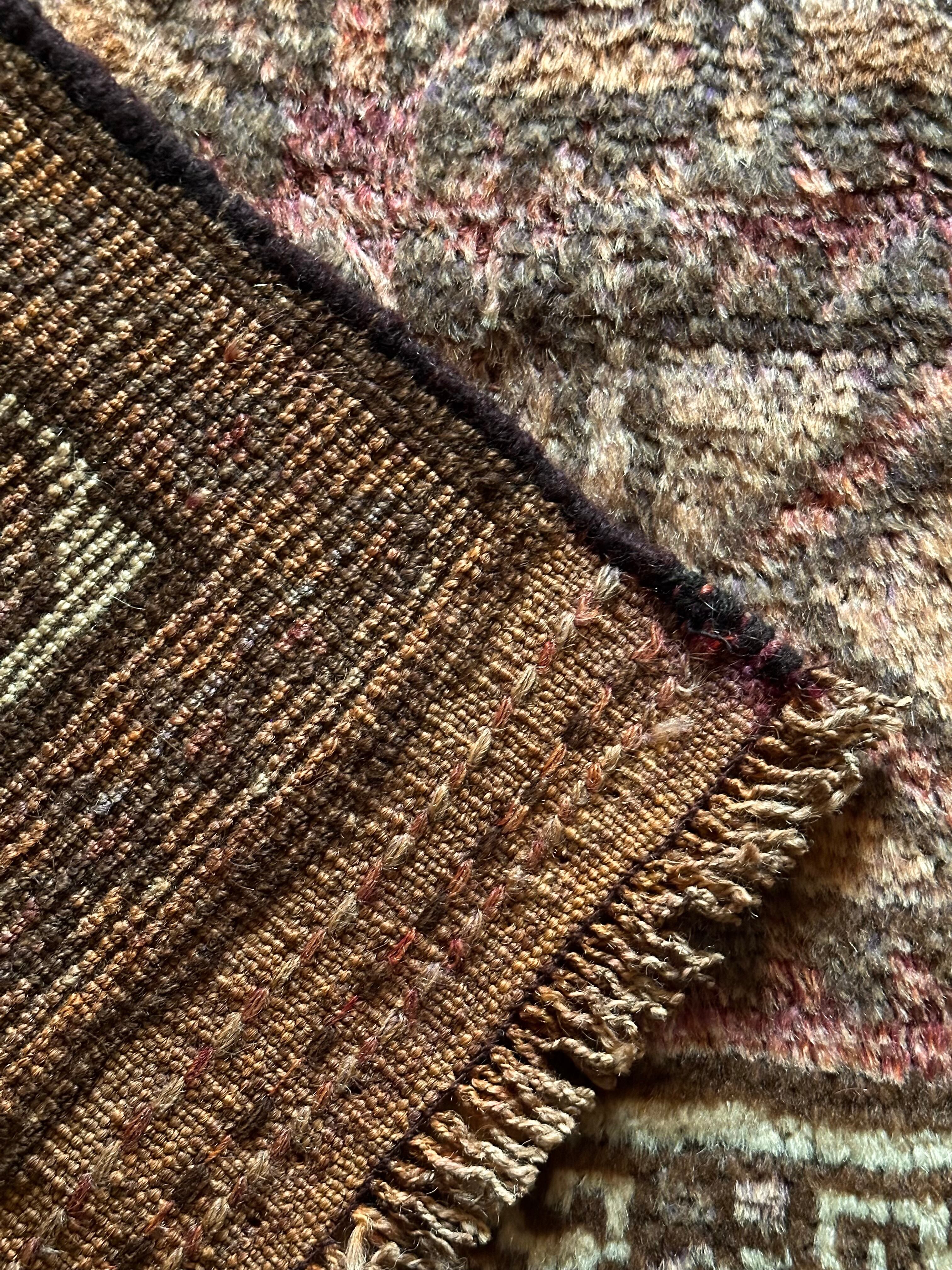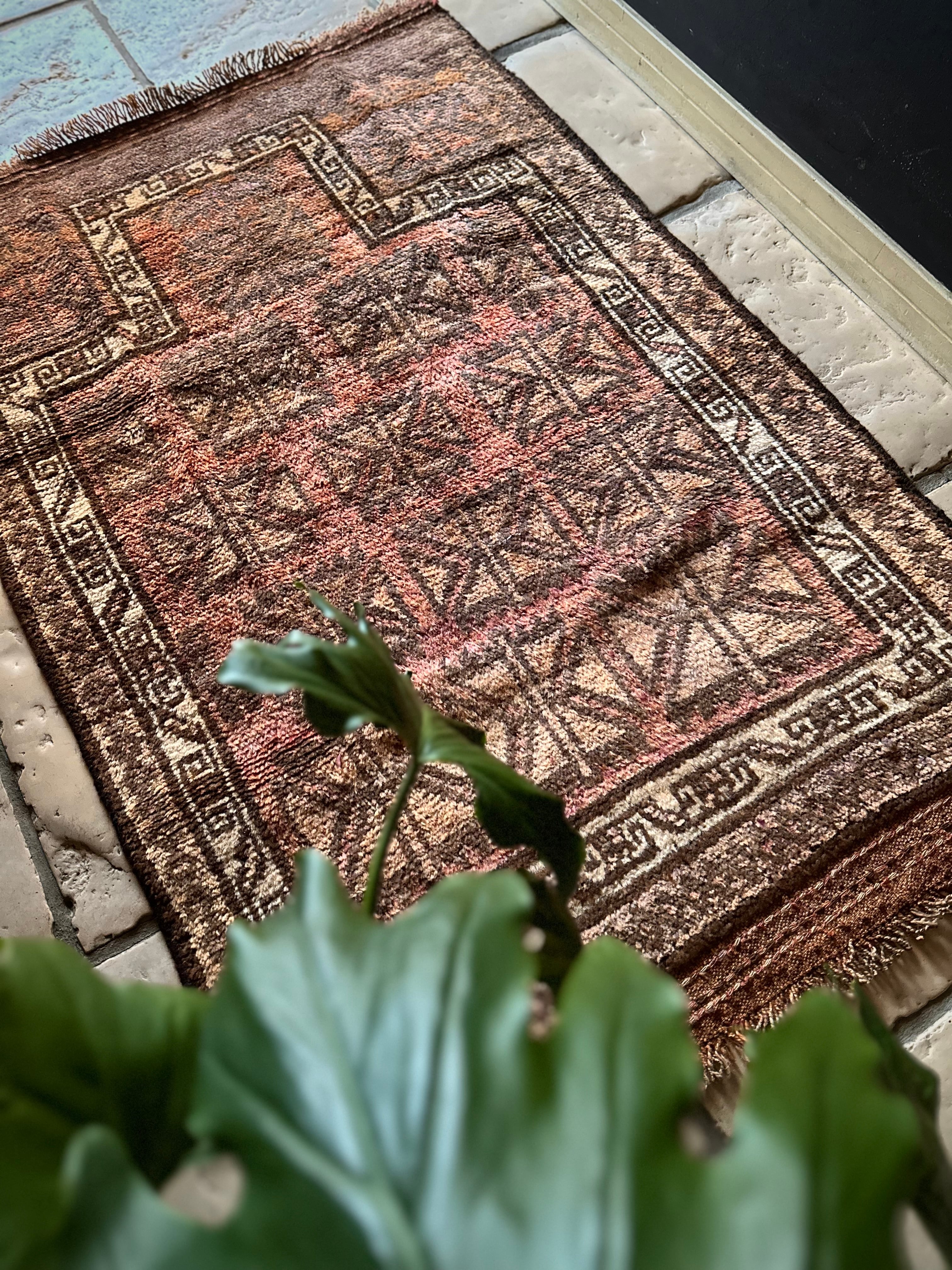 最後にラグそのものに関しては羊毛特有の匂いがあり、採寸は中央付近で計測していますが、手織りならではの歪みによる誤差や水洗いクリーニングによる縮み、また草木染めによる経年劣化の色ムラなどがありますが、それもまたヴィンテージラグの魅力かとご理解ください。