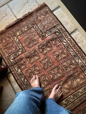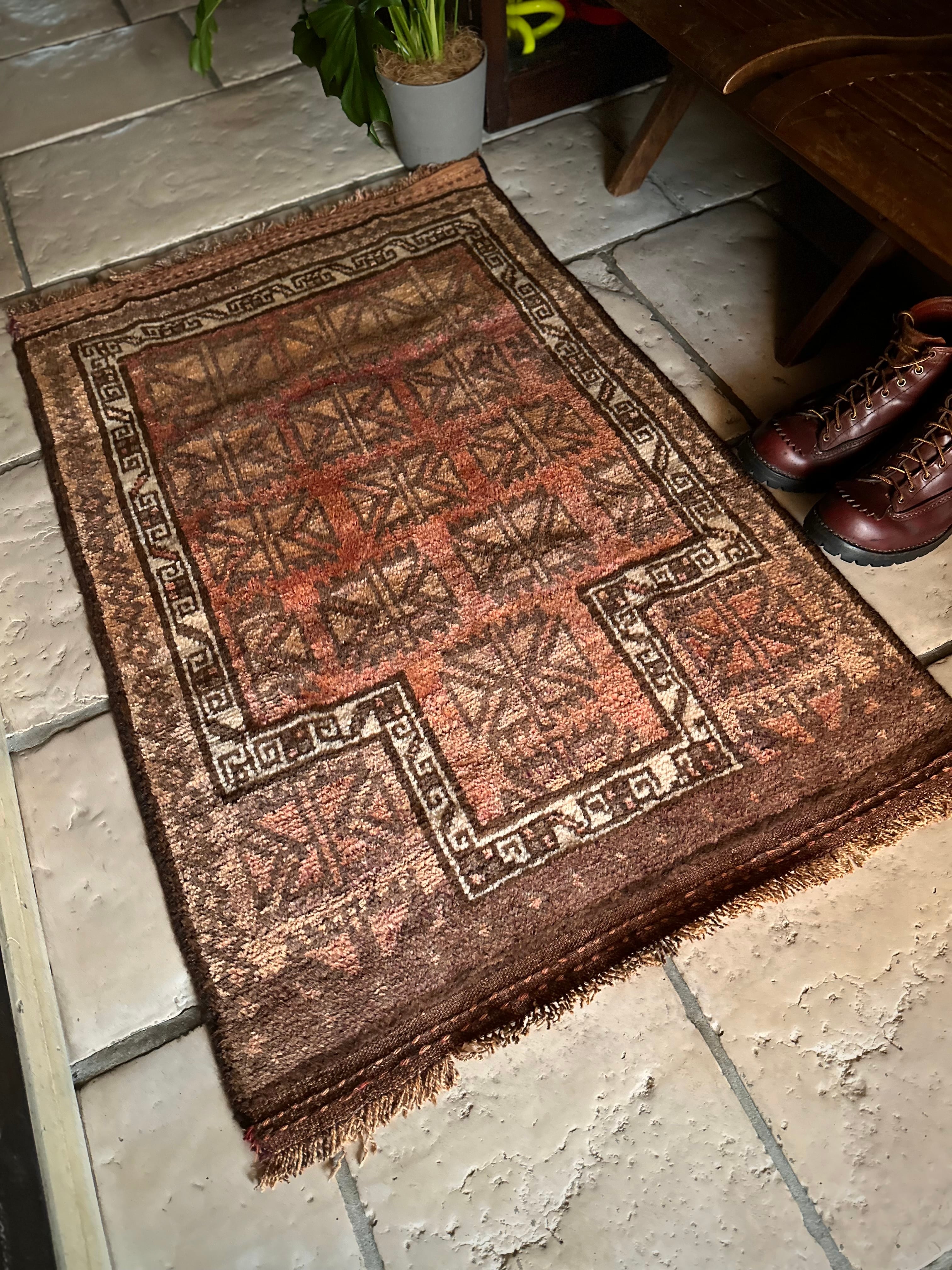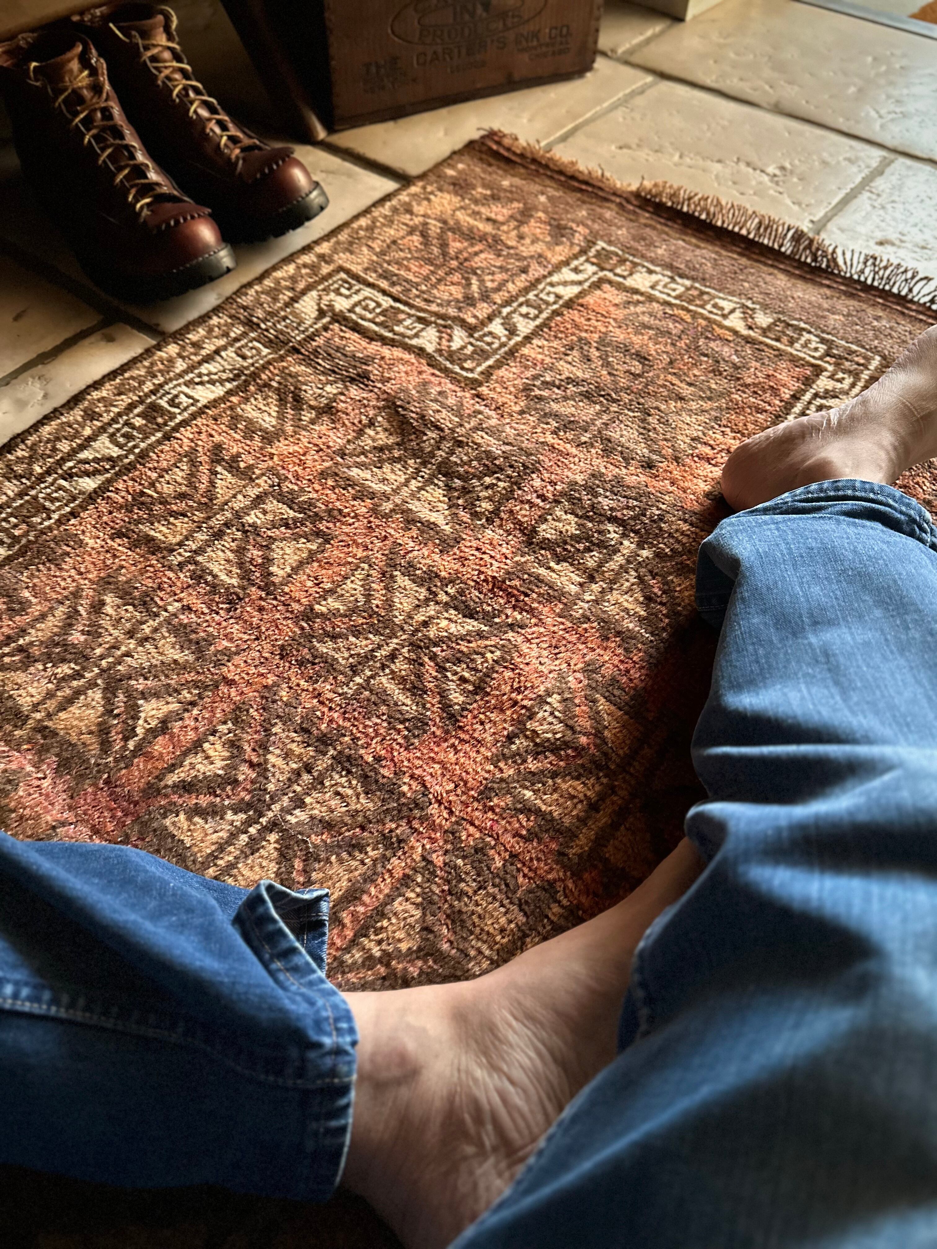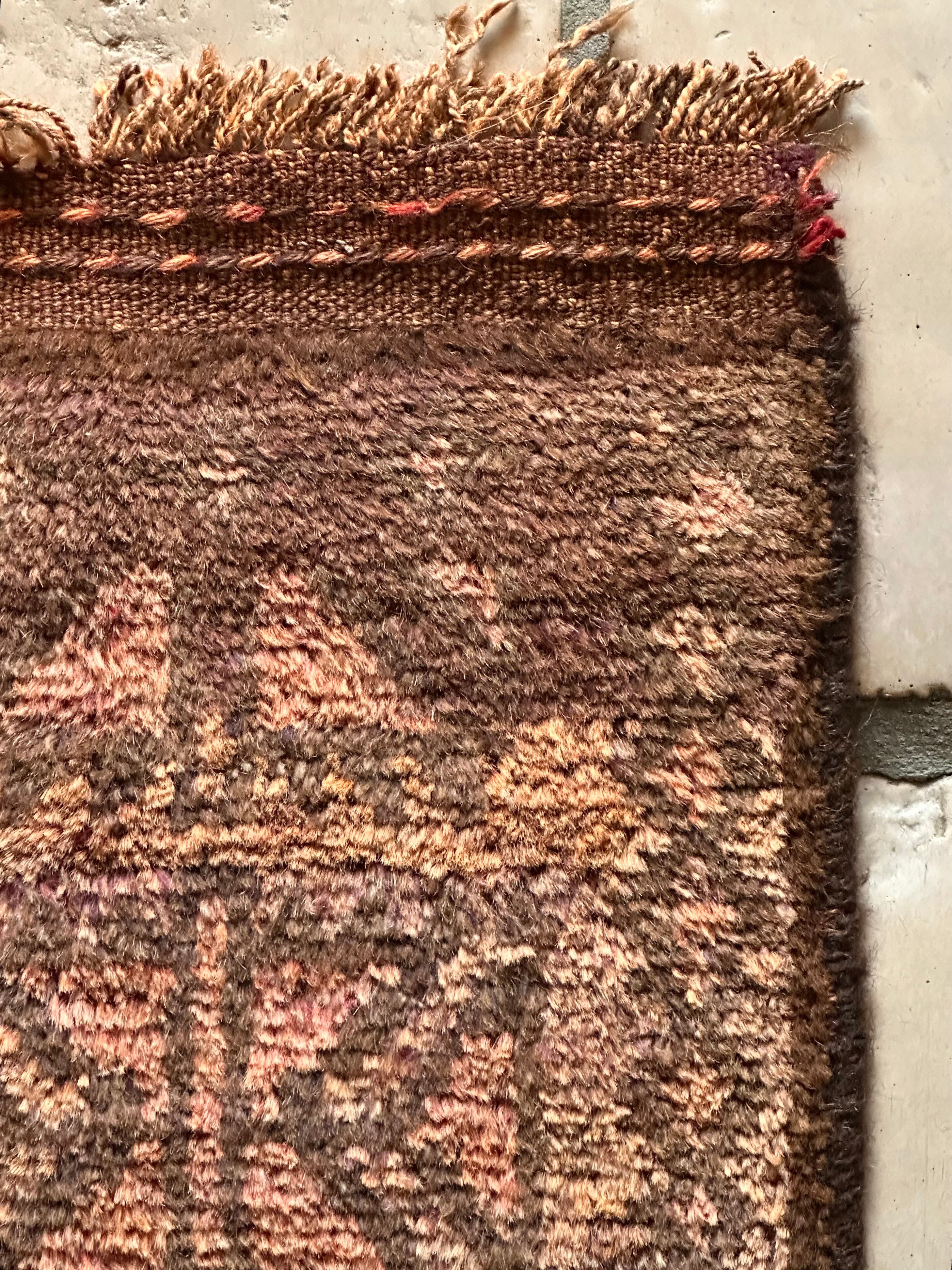 最後にラグそのものに関しては羊毛特有の匂いがあり、採寸は中央付近で計測していますが、手織りならではの歪みによる誤差や水洗いクリーニングによる縮み、また草木染めによる経年劣化の色ムラなどがありますが、それもまたヴィンテージラグの魅力かとご理解ください。