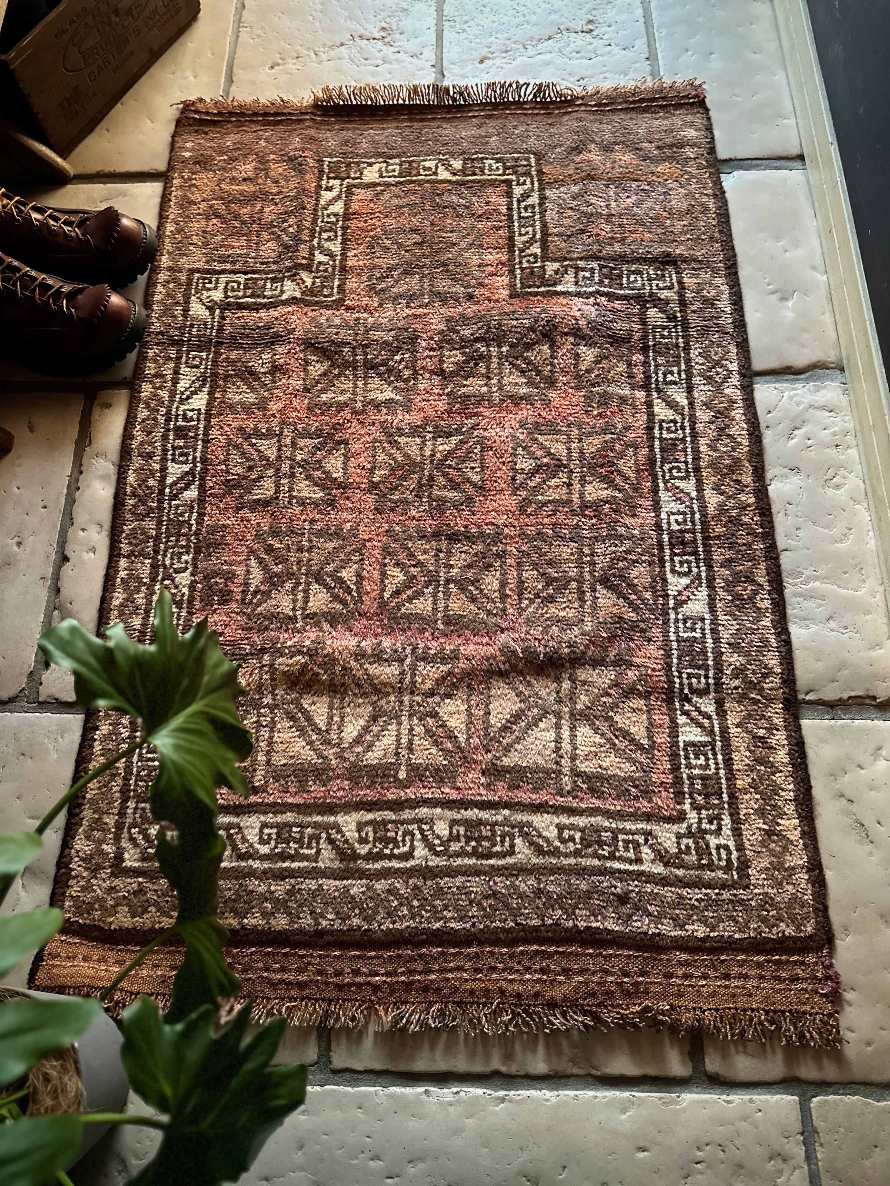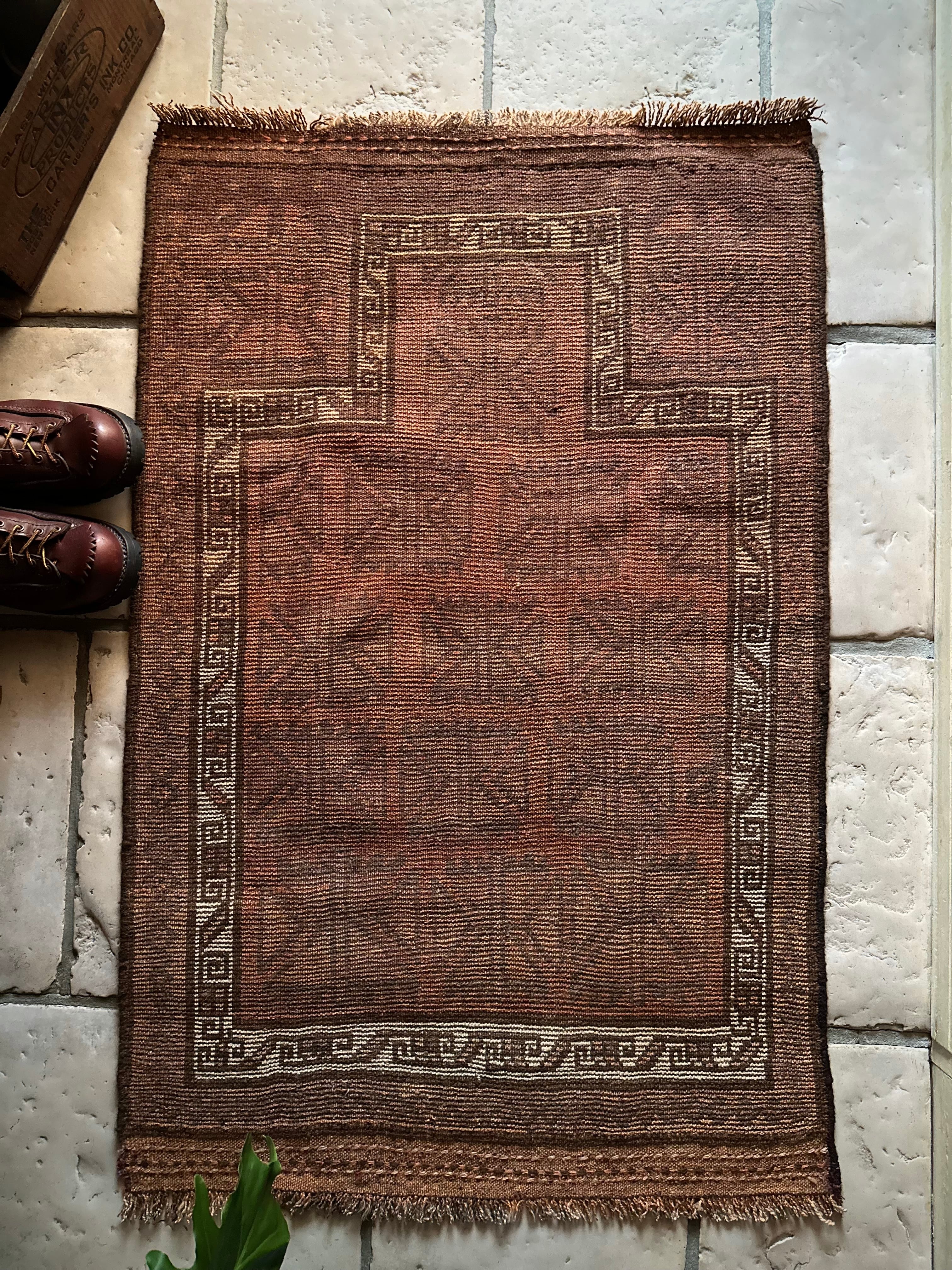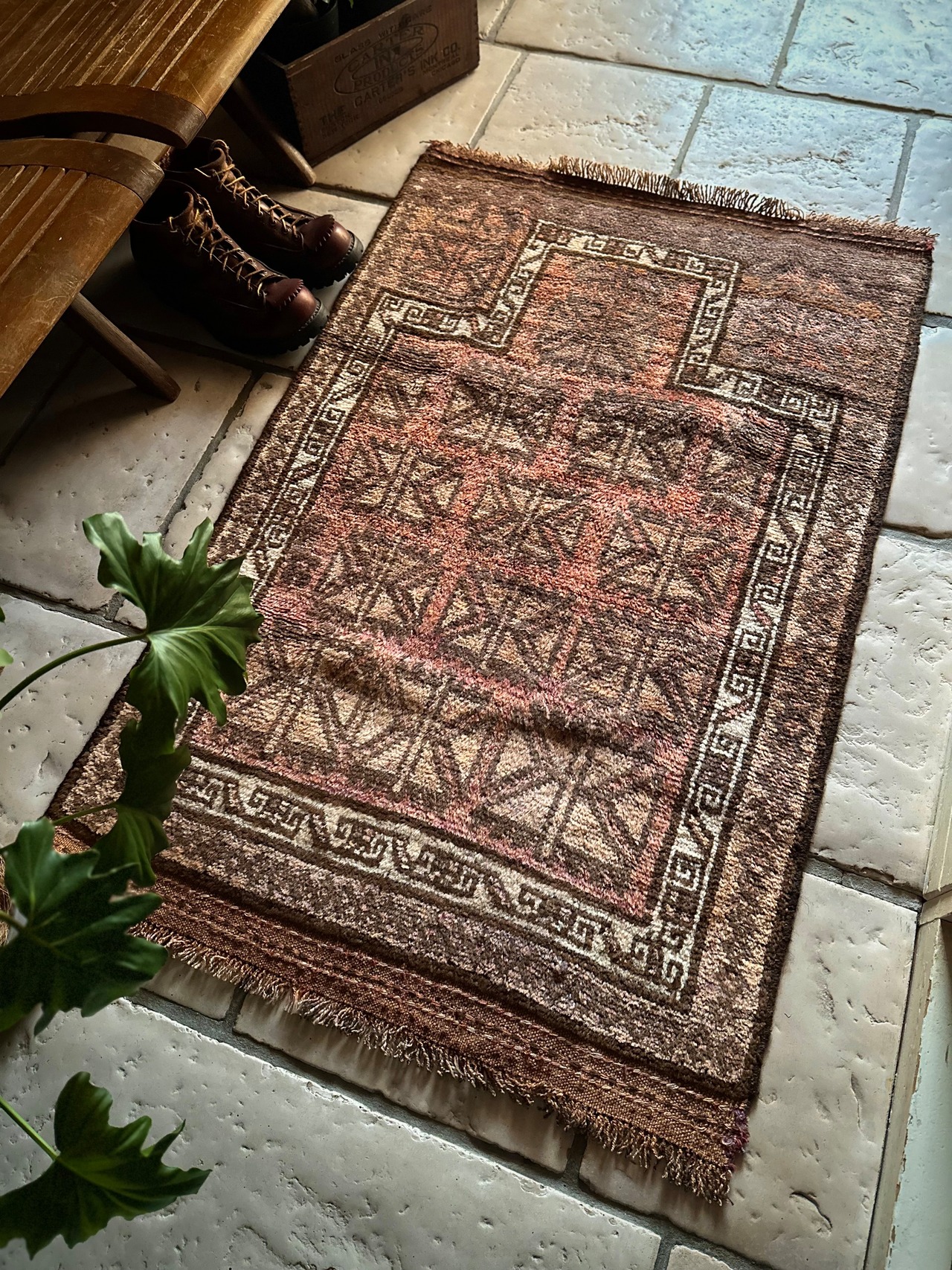 バルーチによく見られる葉っぱをモチーフにした一風変わったチナール紋様に、祈祷する為のミフラープが描かれたプレイヤーラグ仕様と、その大雑把な発想こそがプリミティブさを醸し出しているタイマニ族のトライバルラグになります。