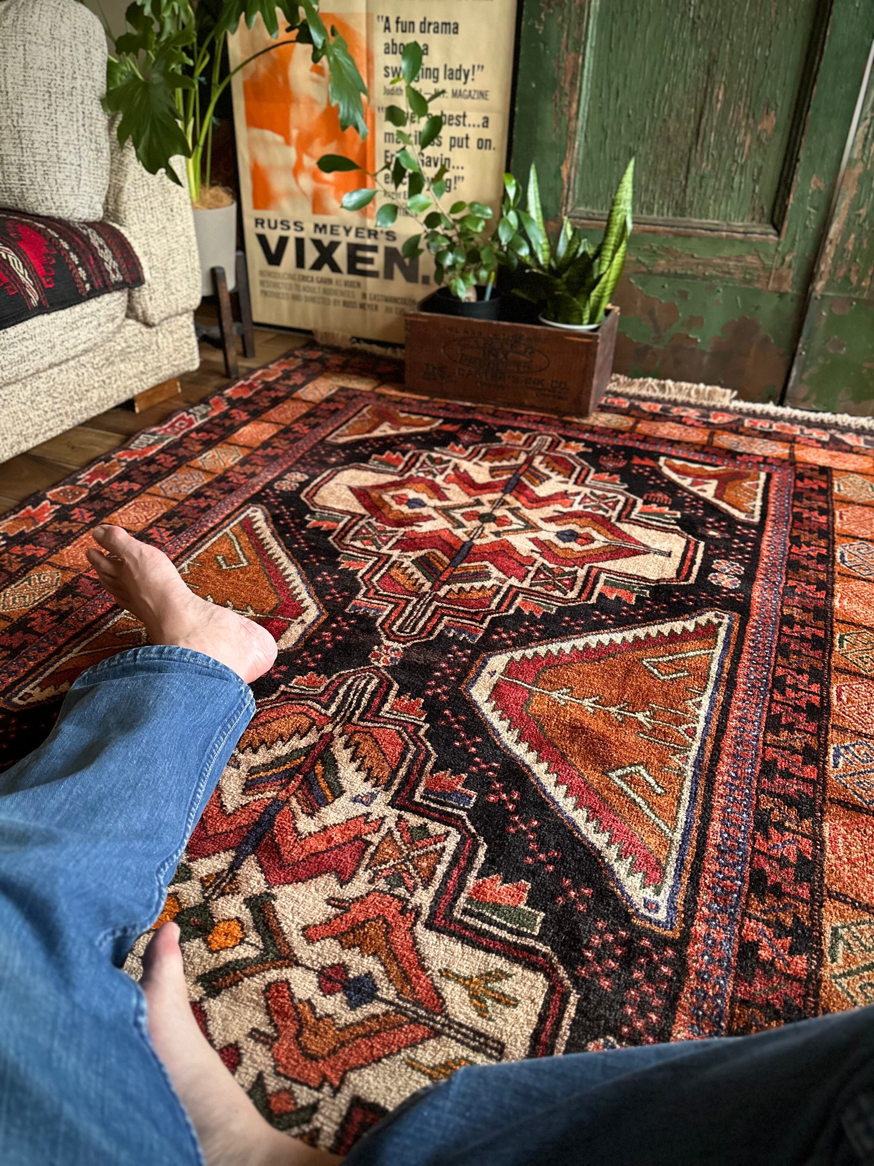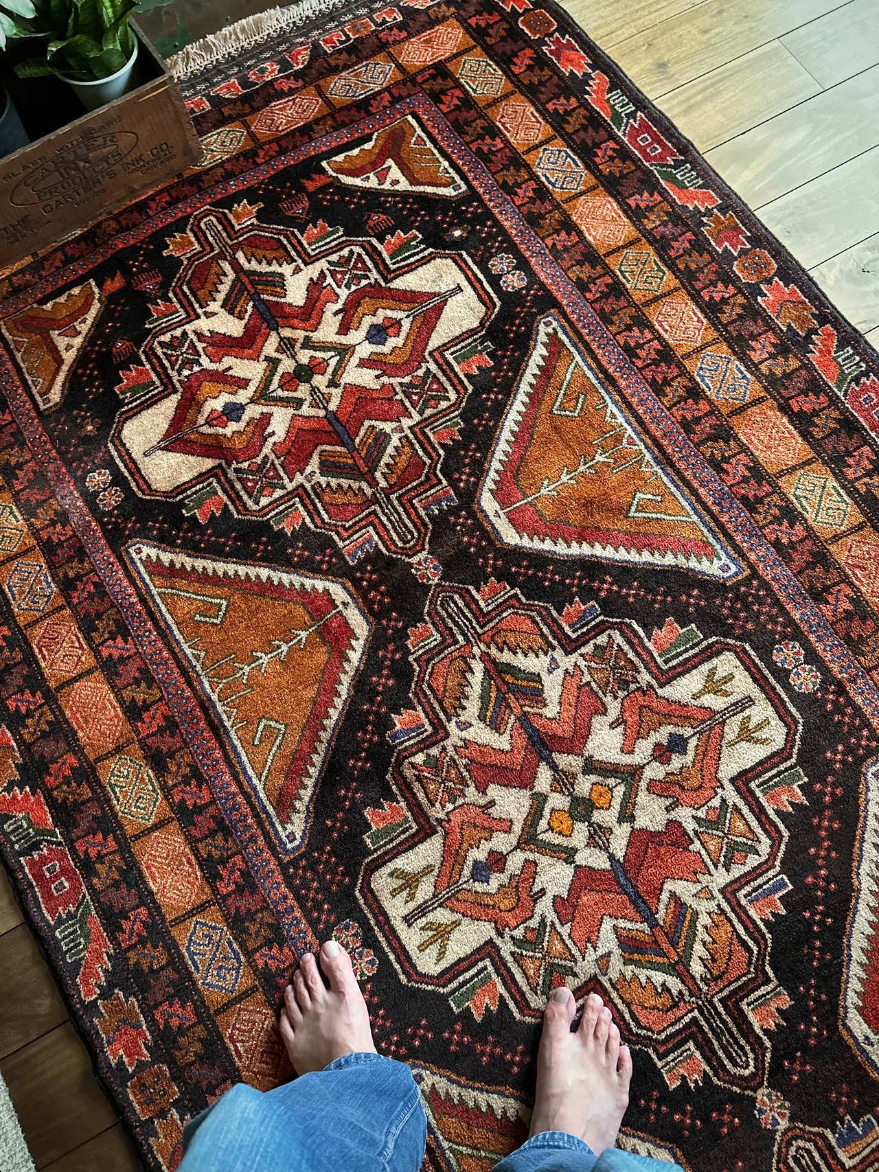 最後にラグそのものに関しては羊毛特有の匂いがあり、採寸は中央付近で計測していますが、手織りならではの歪みによる誤差や水洗いクリーニングによる縮み、また草木染めによる経年劣化の色ムラなどがありますが、それもまたヴィンテージラグの魅力かとご理解ください。
