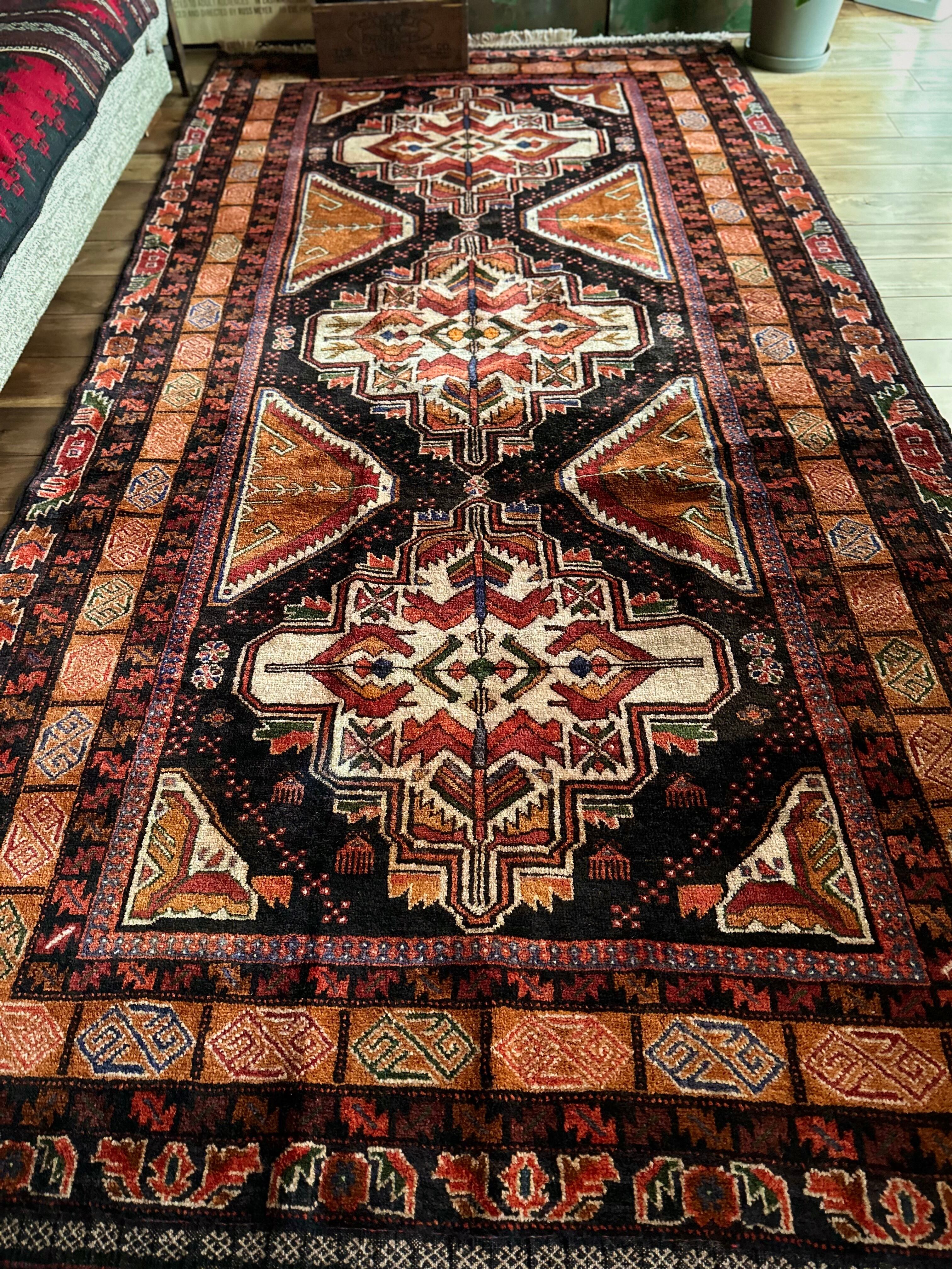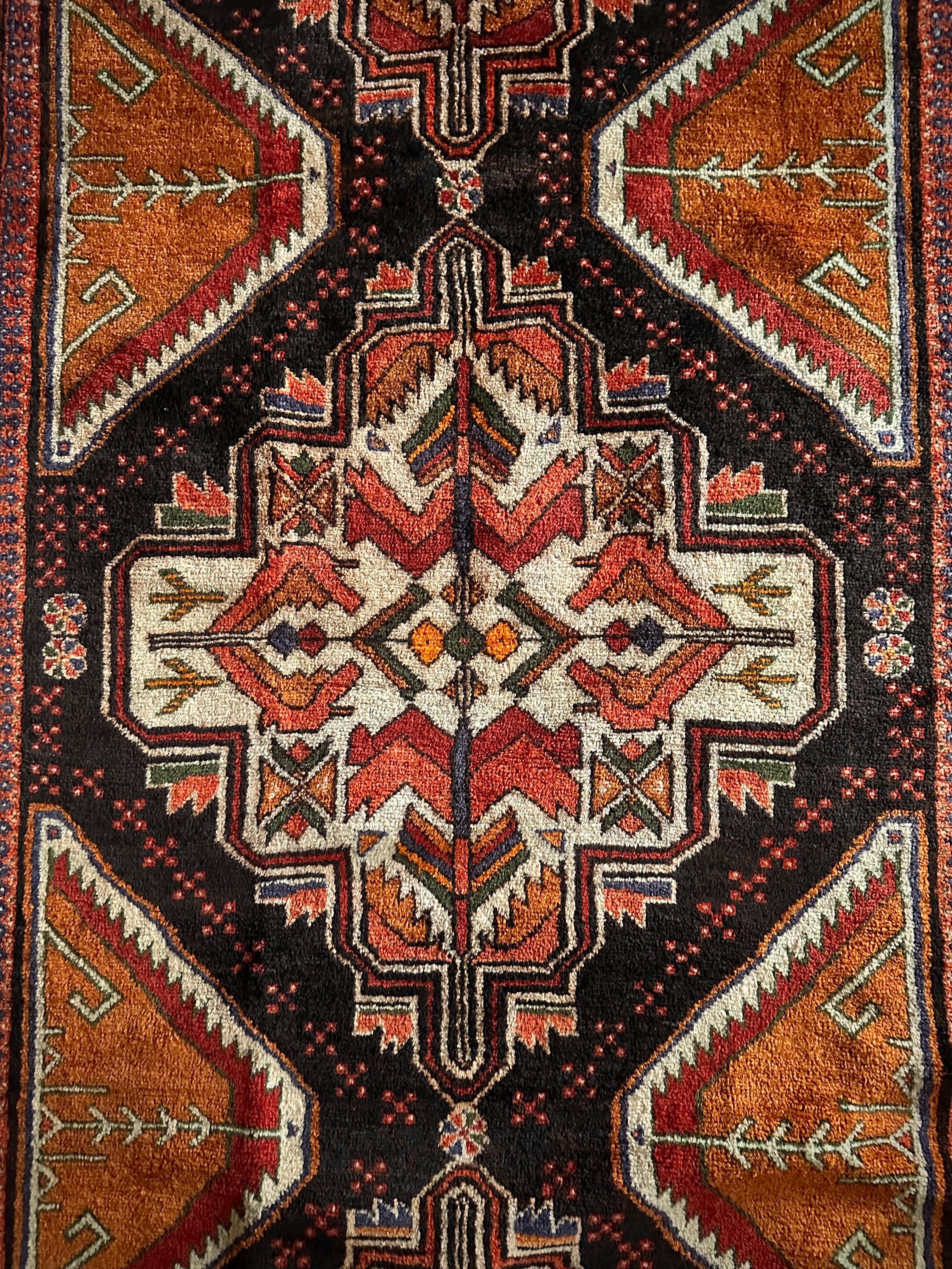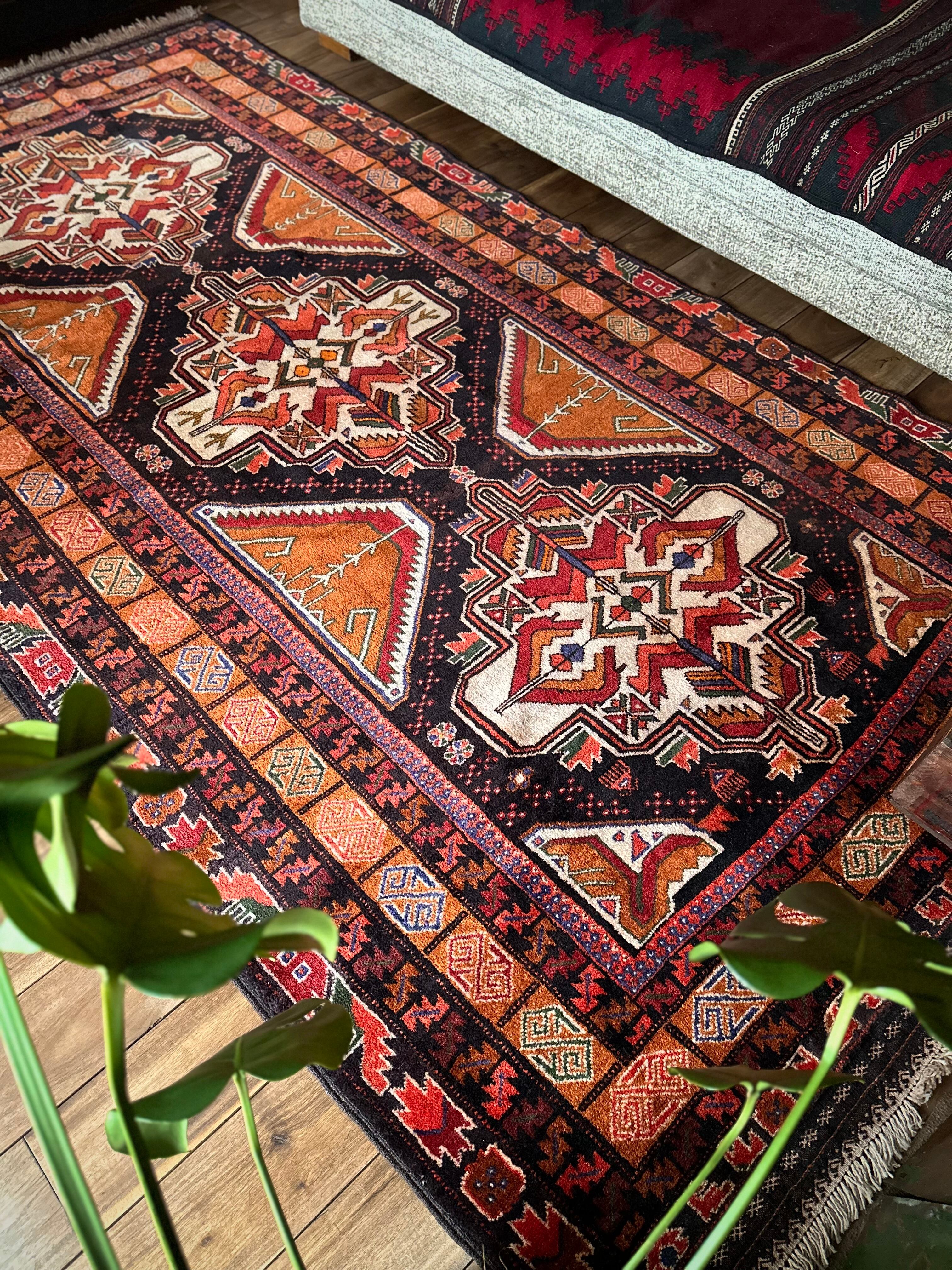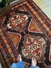 全体的に均等が取れた素晴らしい配色に、パキッとした絵柄がイランのアルダビールやコーカサス地方のラグを連想させる、アフガニスタン西部のヘラート州に居住するバルーチ族のトライバルラグになります。