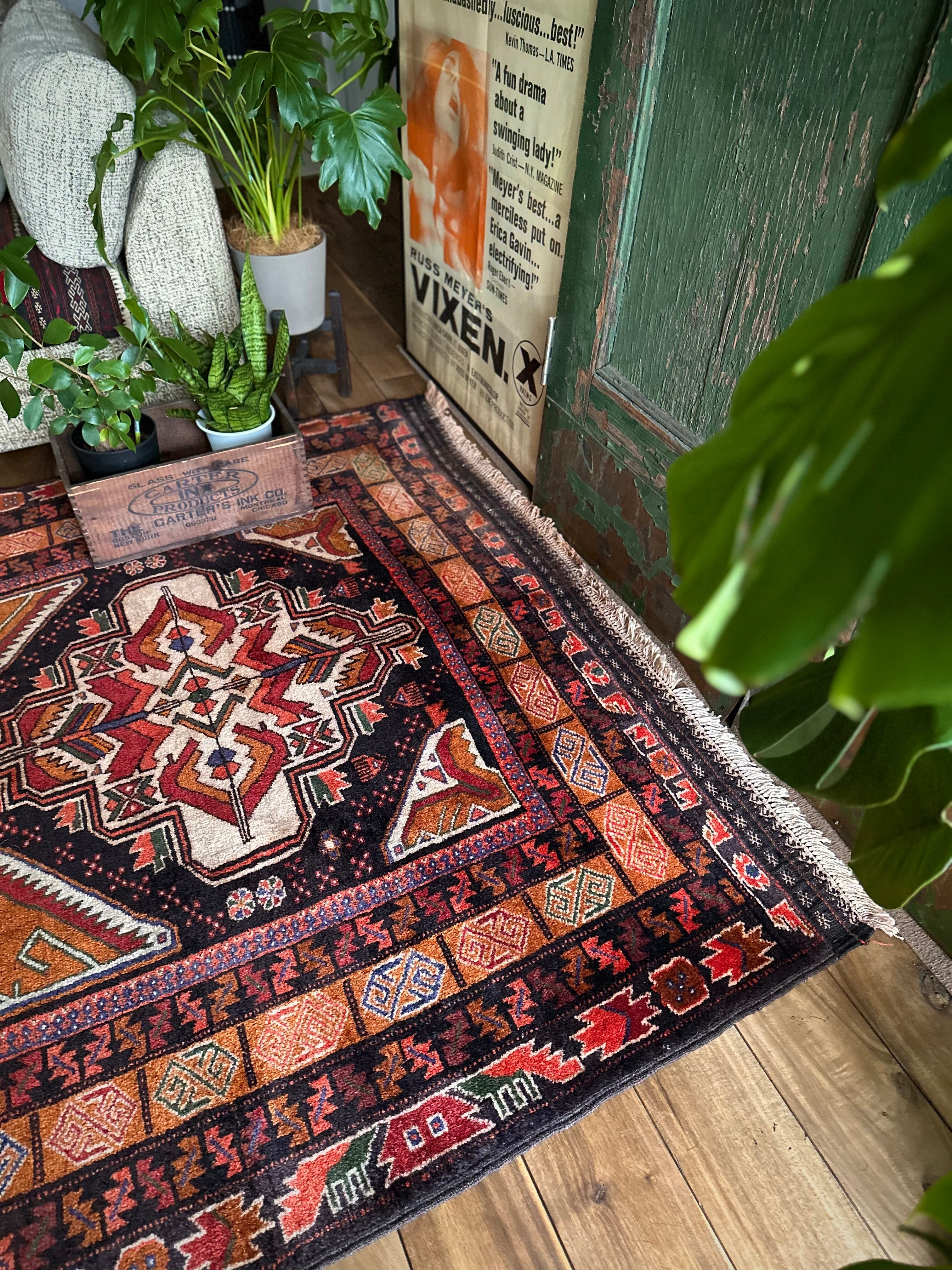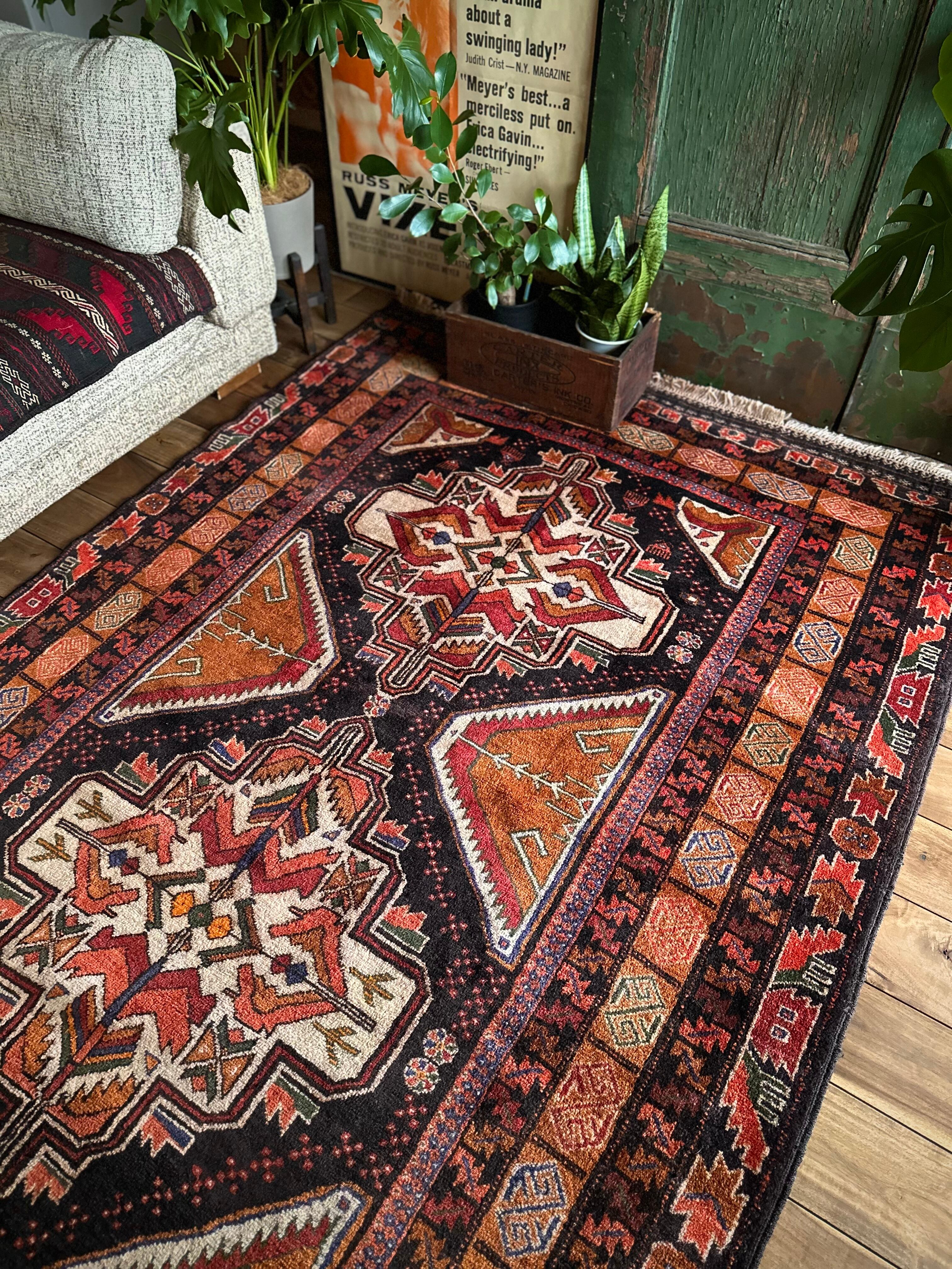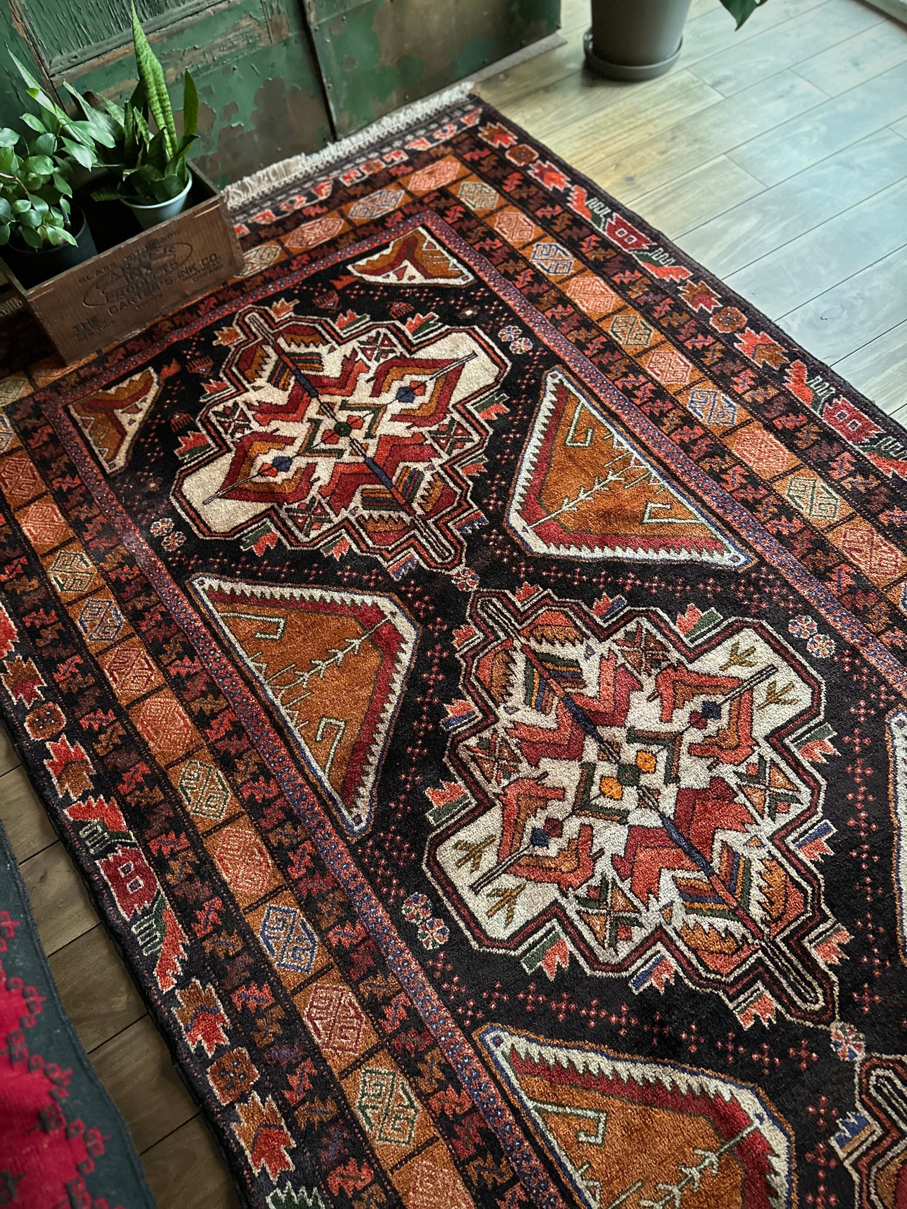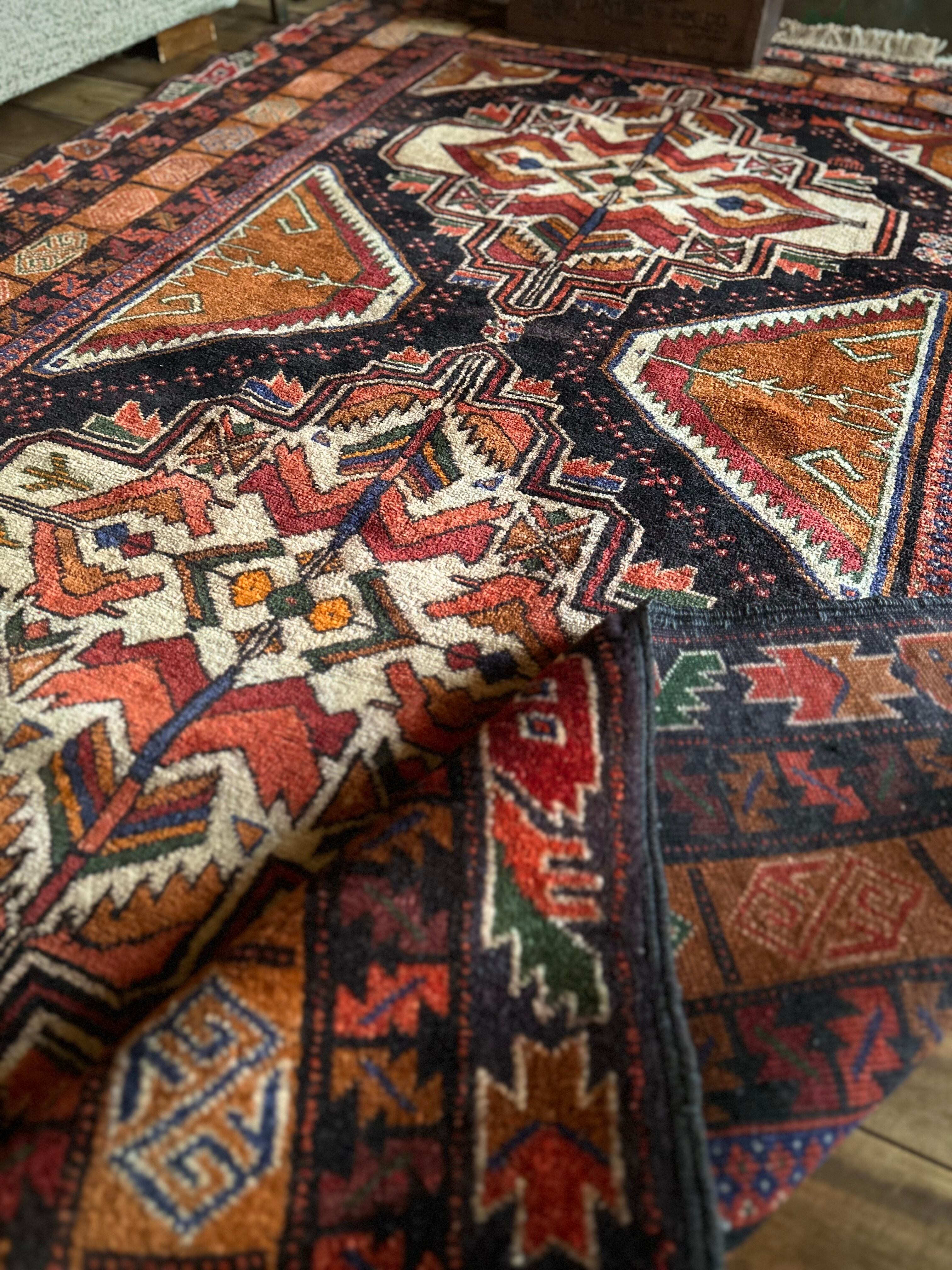 全体的に均等が取れた素晴らしい配色に、パキッとした絵柄がイランのアルダビールやコーカサス地方のラグを連想させる、アフガニスタン西部のヘラート州に居住するバルーチ族のトライバルラグになります。