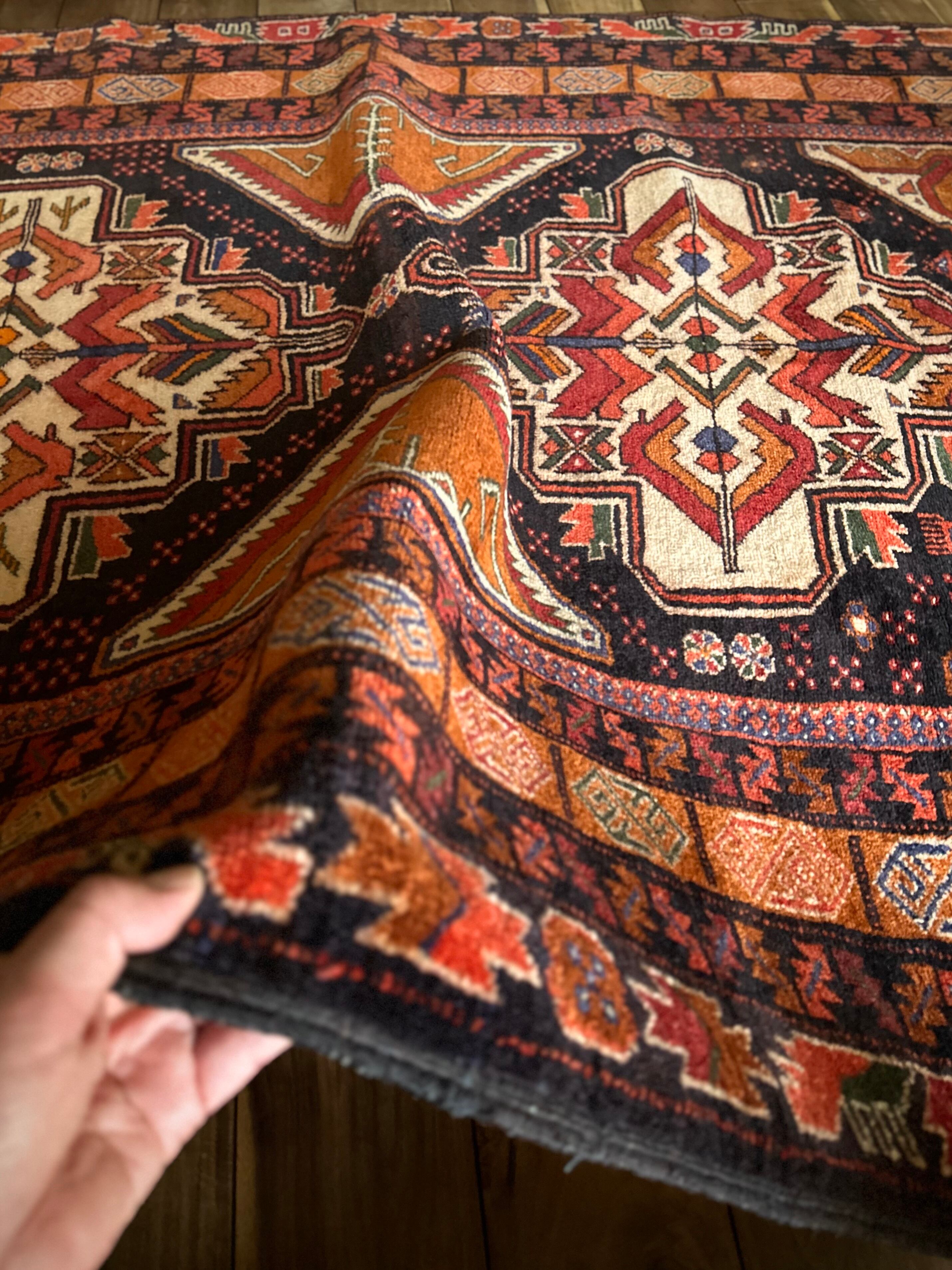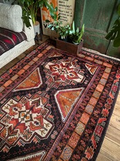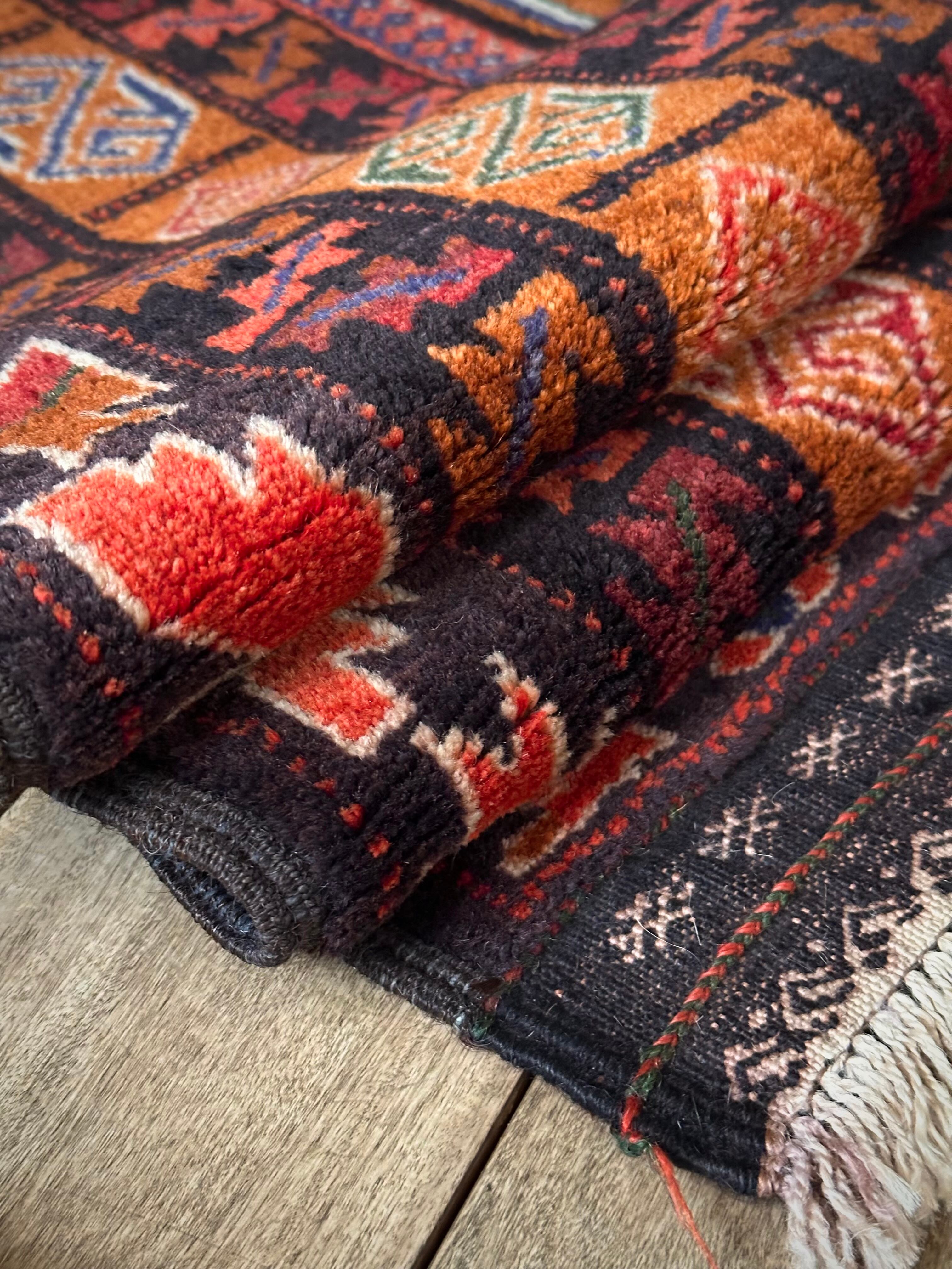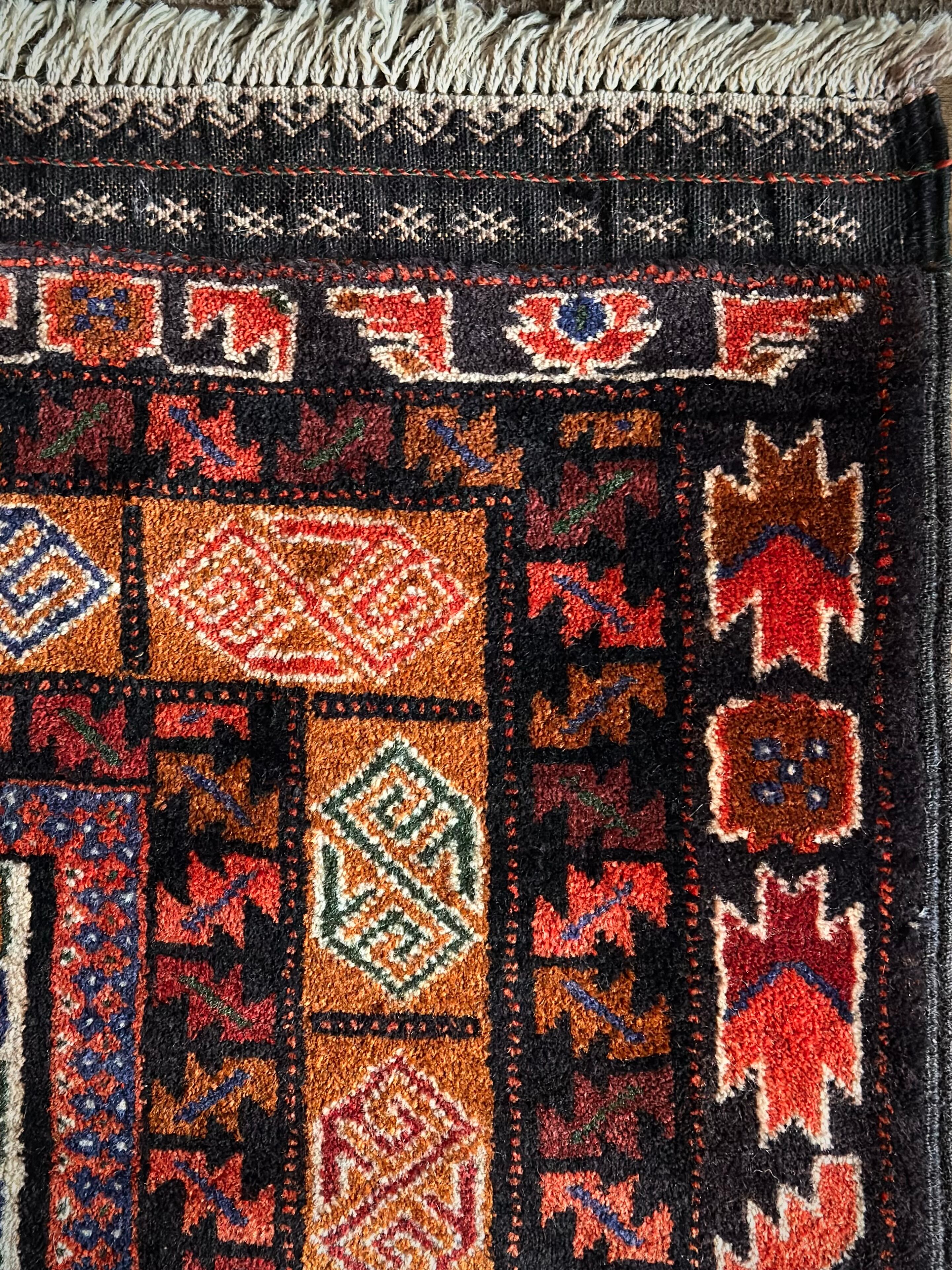ブラックとオレンジを基本としながらも、どこか男らしさを感じさせる1枚で、かなりの大判サイズ故に自宅では収まりきれないほどの迫力があり、細かな絵柄に配色、はたまたかっこいいキリムエンドの装飾にも目が奪われてしまい、改めてヘラート産バルーチの自由奔放な一面を垣間見た気にさえなります。