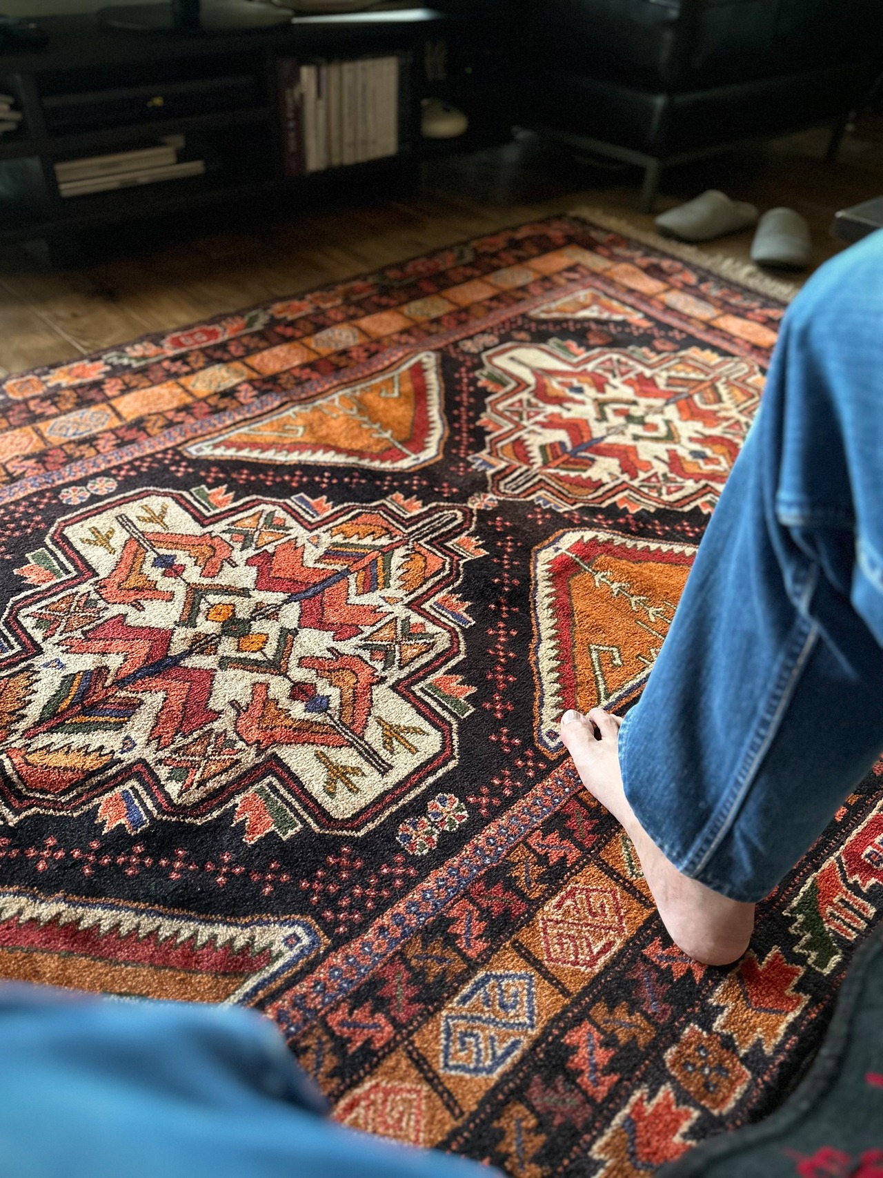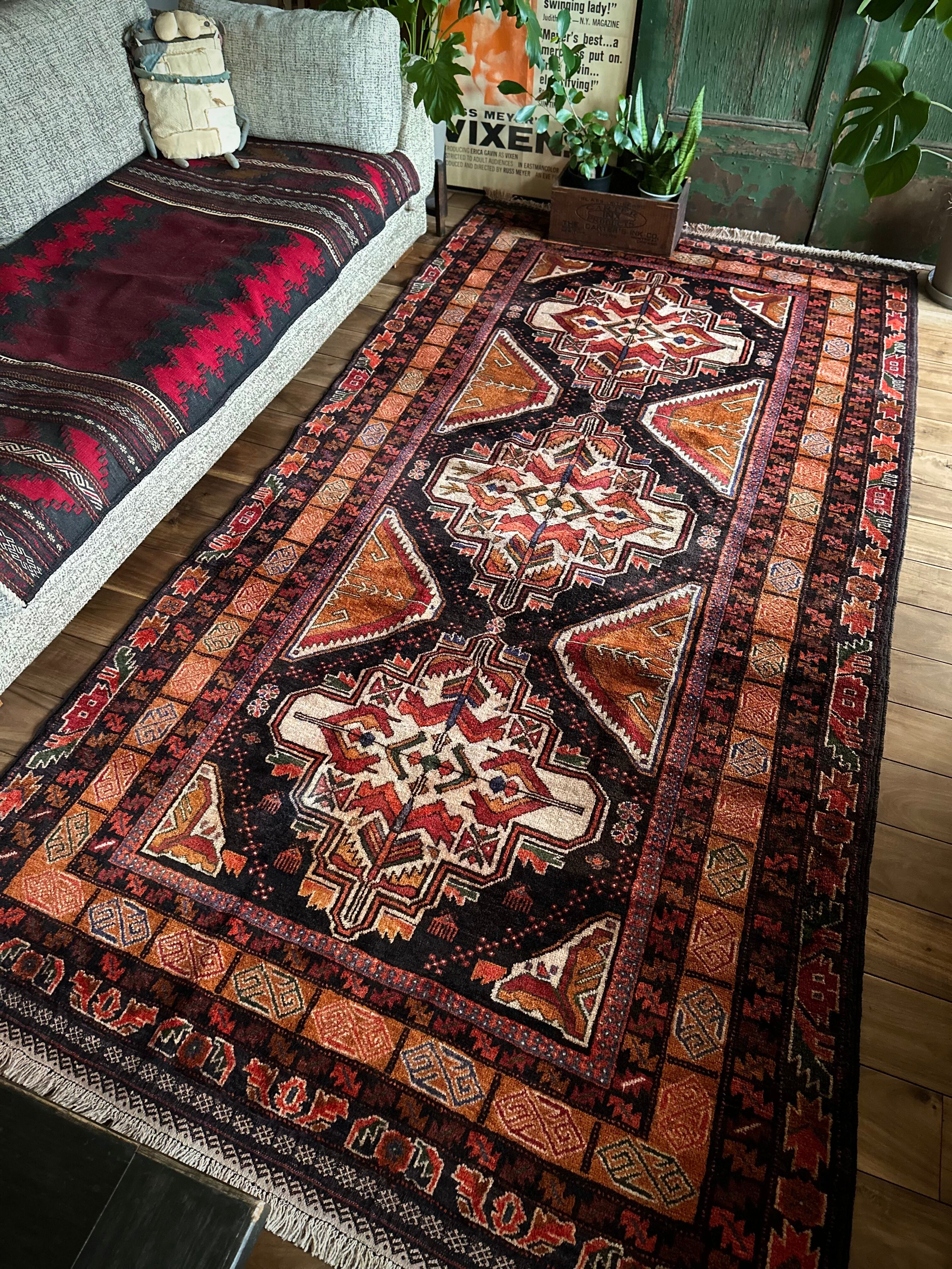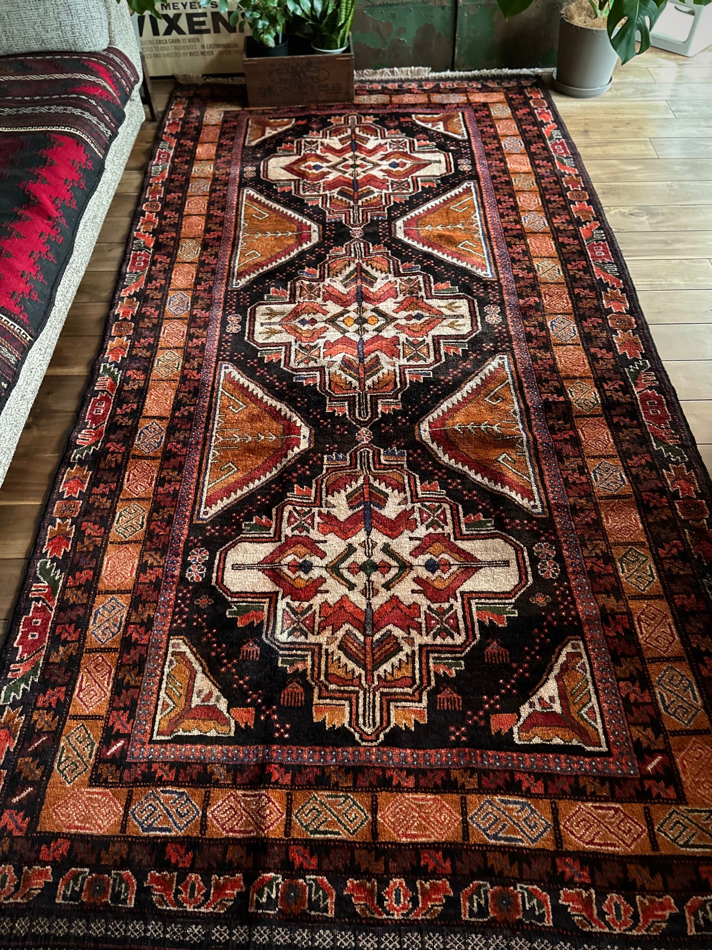 ブラックとオレンジを基本としながらも、どこか男らしさを感じさせる1枚で、かなりの大判サイズ故に自宅では収まりきれないほどの迫力があり、細かな絵柄に配色、はたまたかっこいいキリムエンドの装飾にも目が奪われてしまい、改めてヘラート産バルーチの自由奔放な一面を垣間見た気にさえなります。