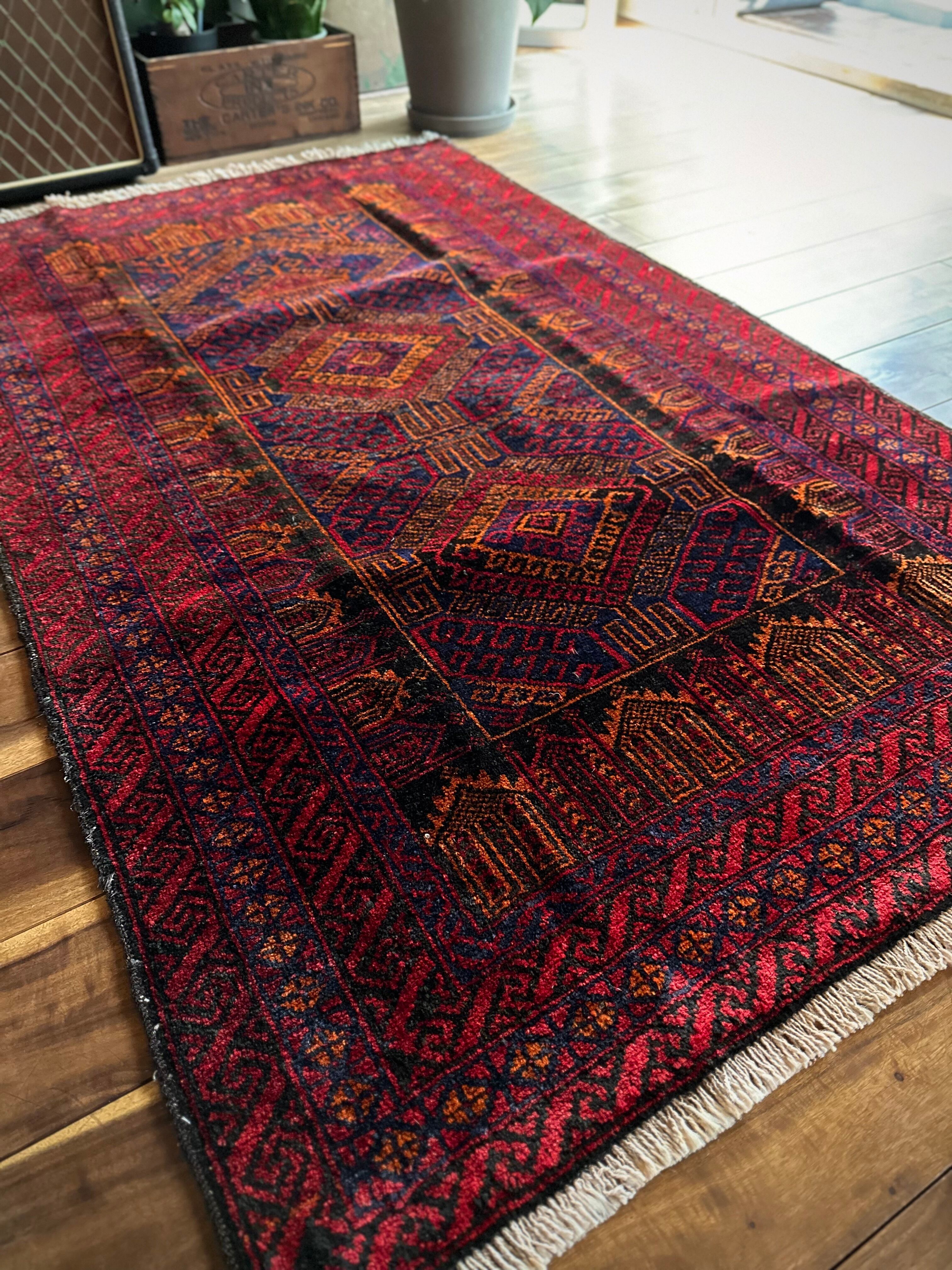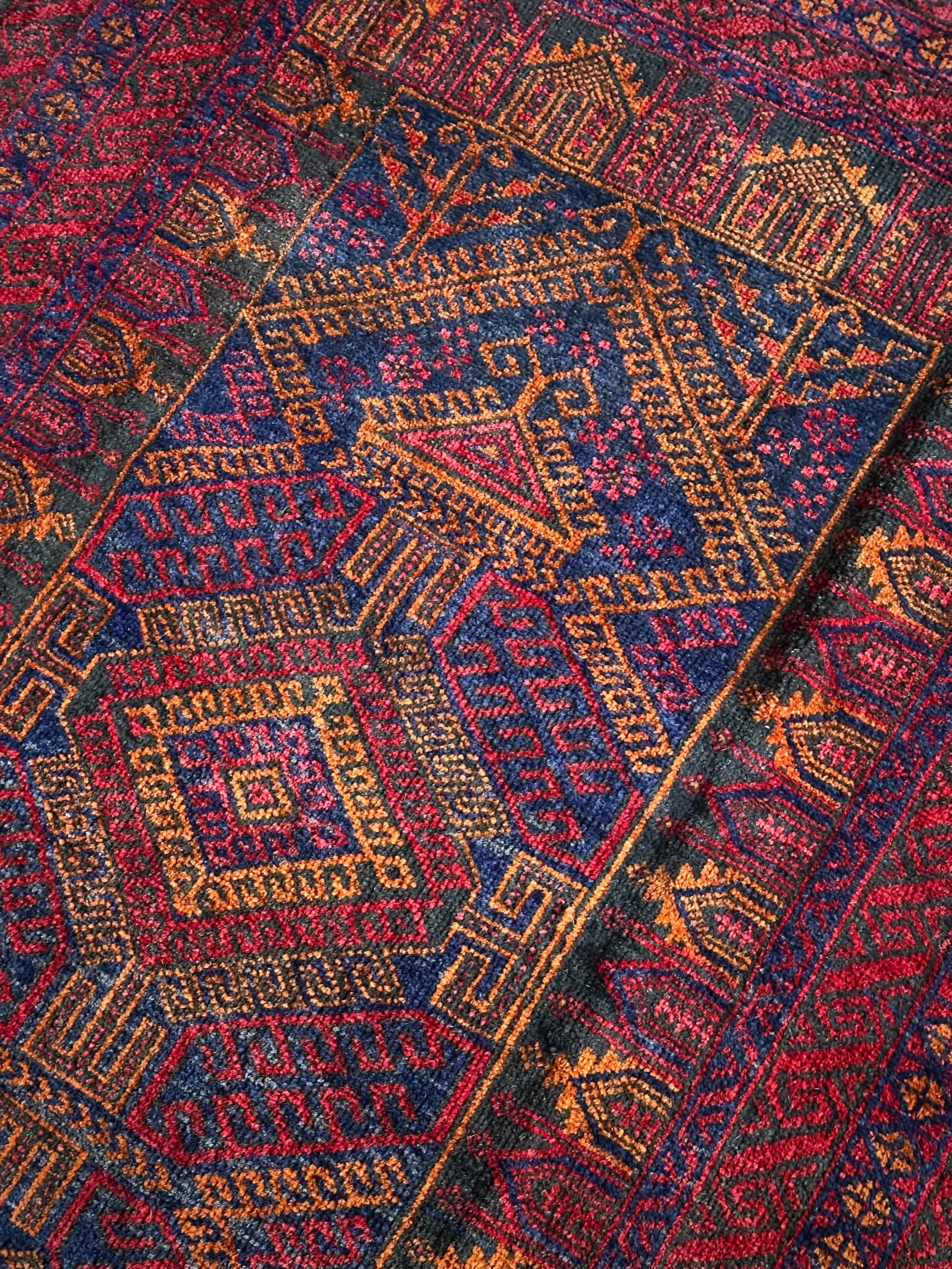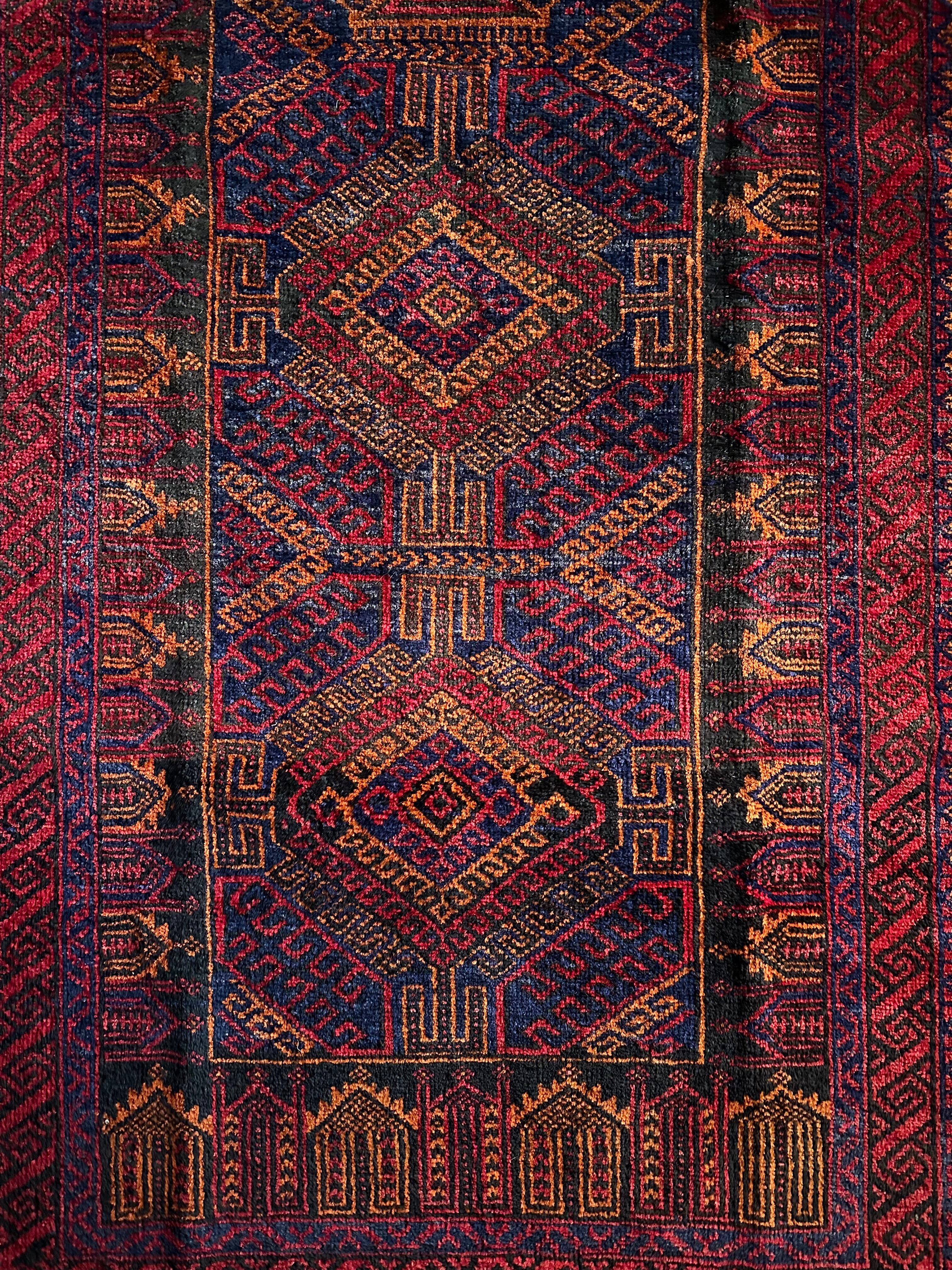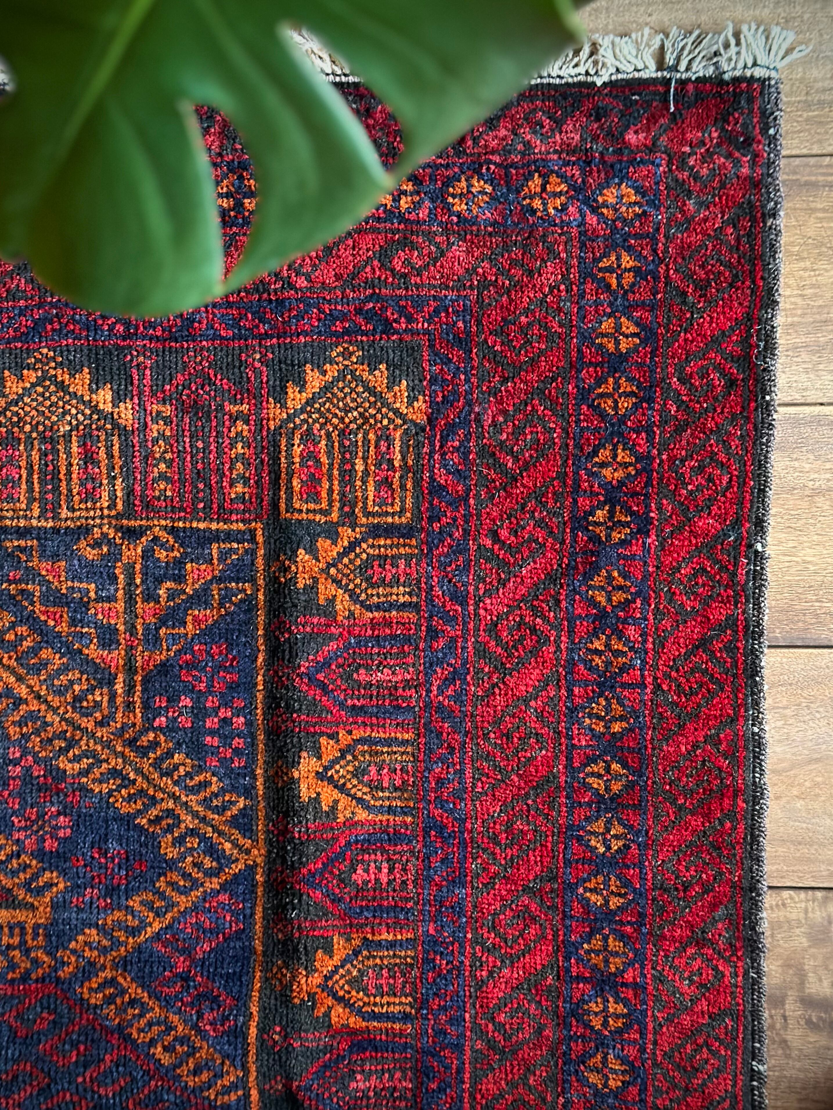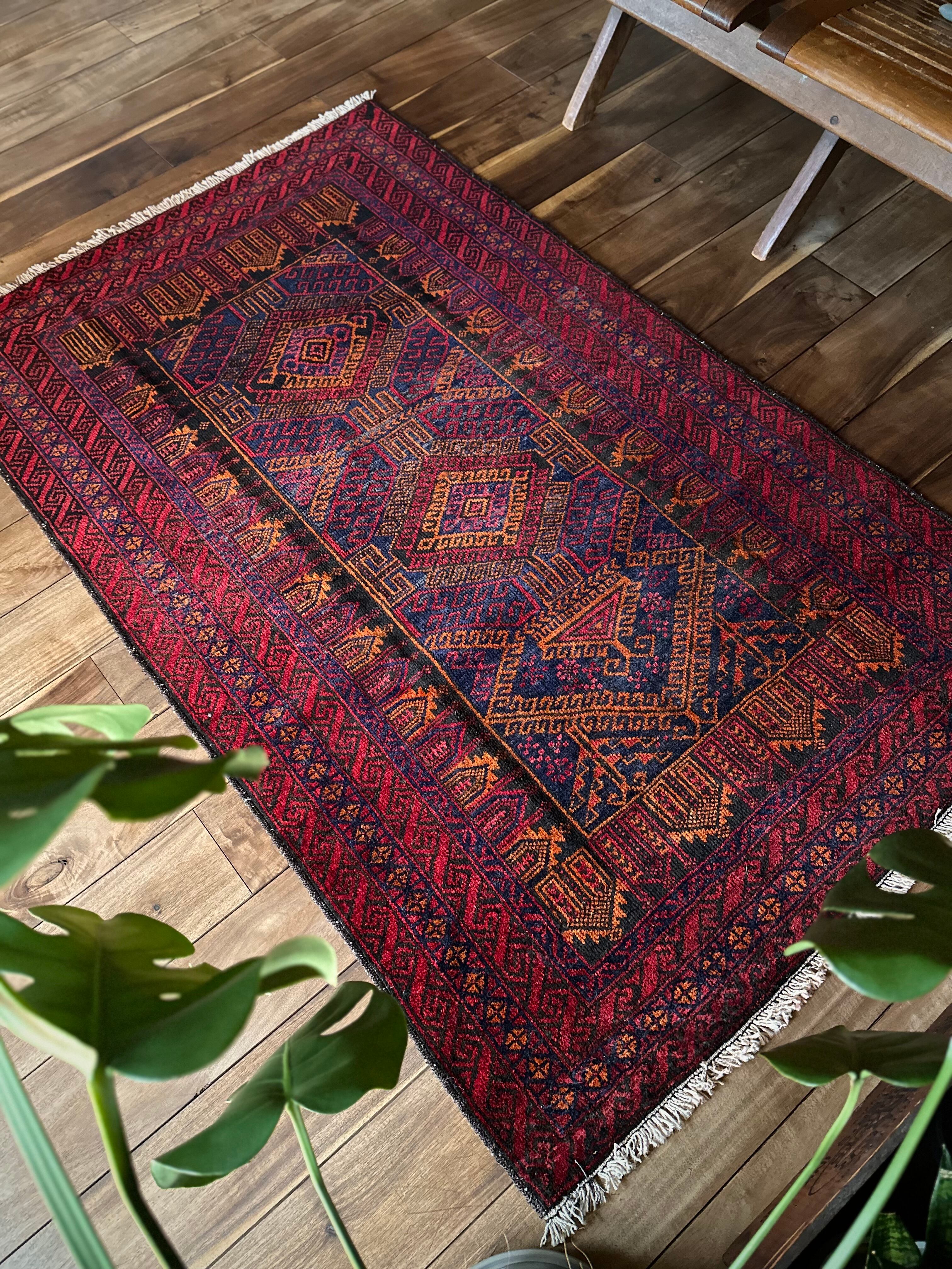 深海のような赤のグラデーションにブラックとオレンジがよりダークな印象を与えるヘラート州に住むバルーチ族のトライバルラグで、現地では”Zinjir gul”と呼ばれるフックドメダリオンが並んだ祈祷用のプレイヤーラグになります。