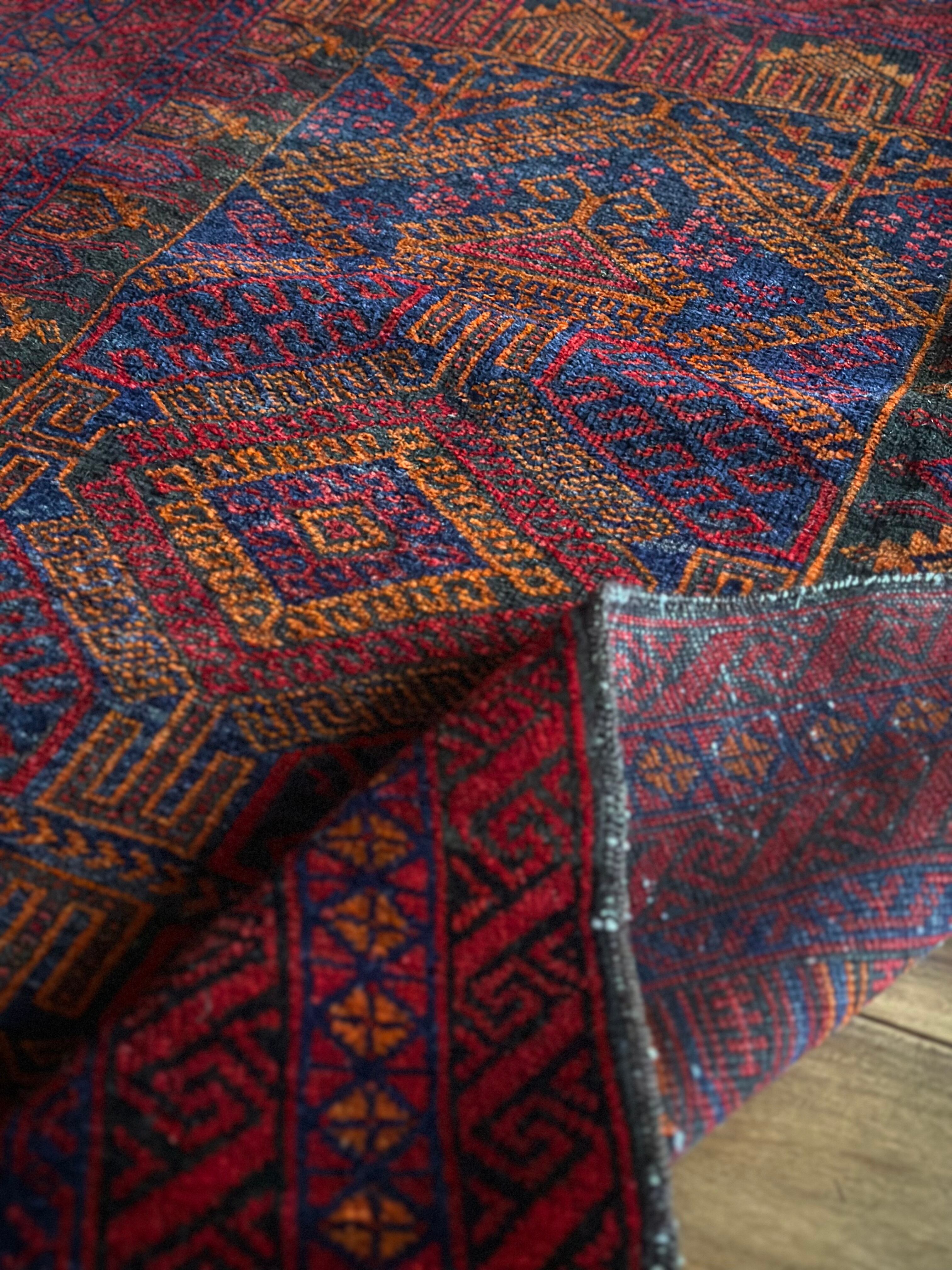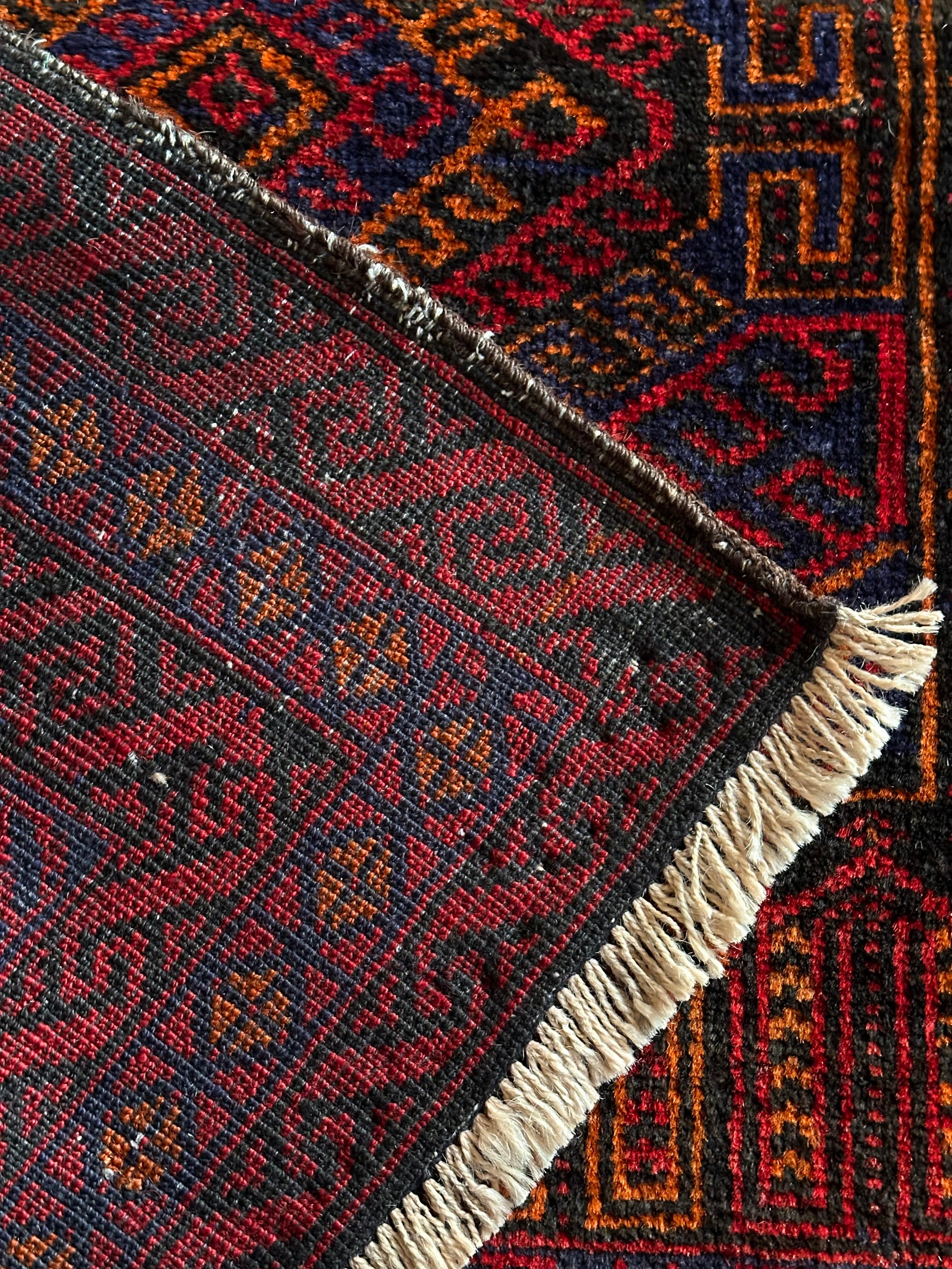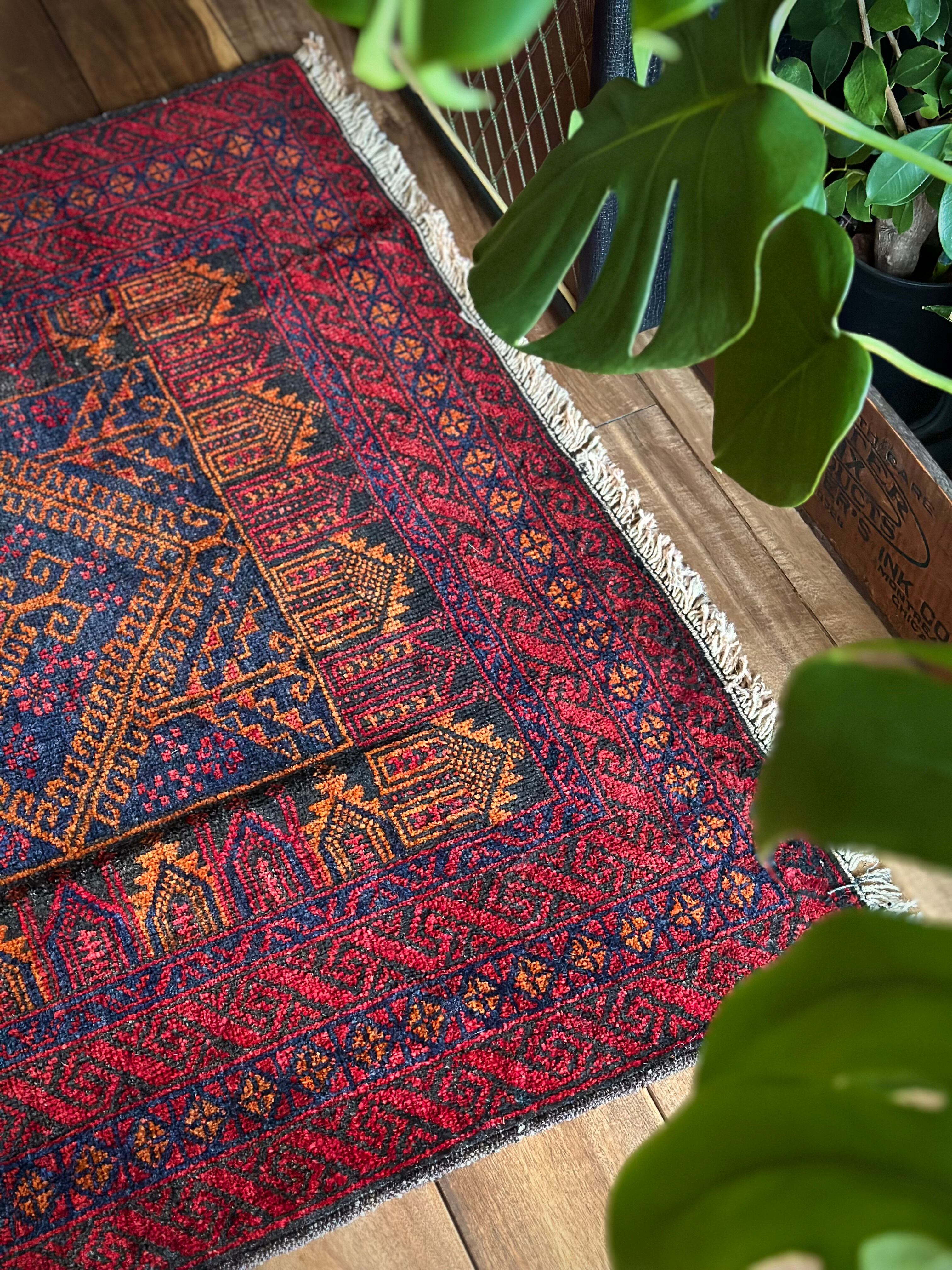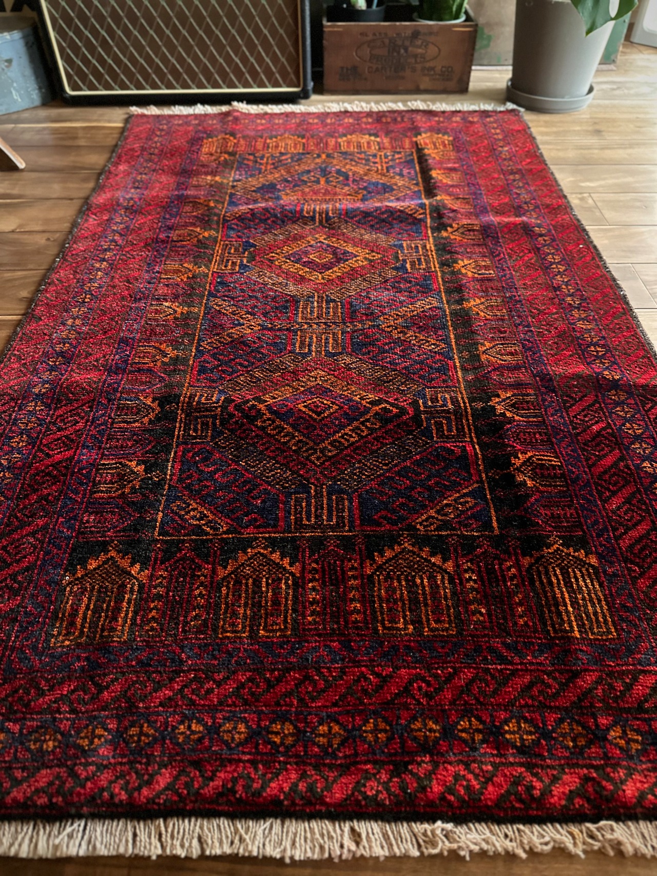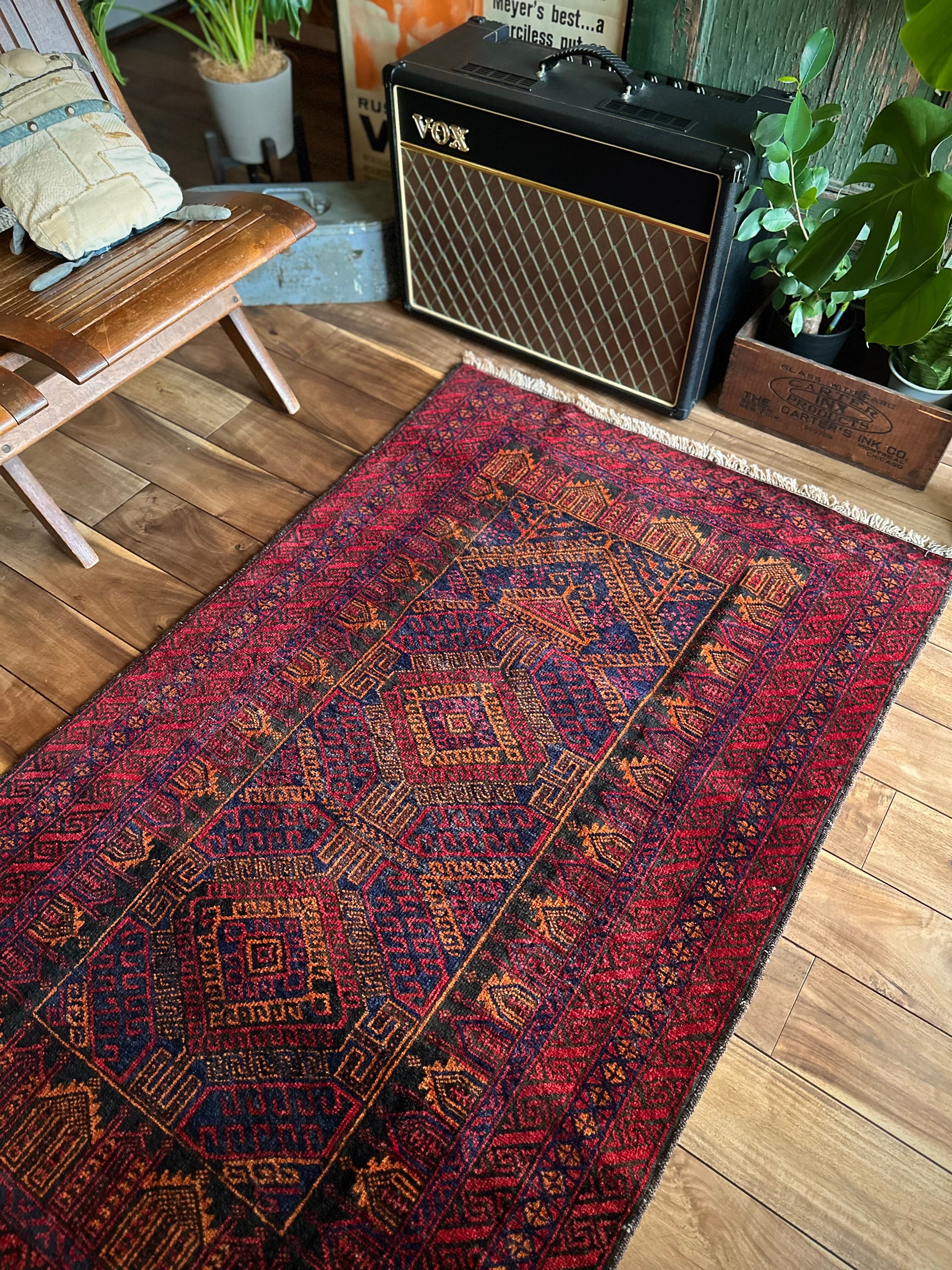 深海のような赤のグラデーションにブラックとオレンジがよりダークな印象を与えるヘラート州に住むバルーチ族のトライバルラグで、現地では”Zinjir gul”と呼ばれるフックドメダリオンが並んだ祈祷用のプレイヤーラグになります。