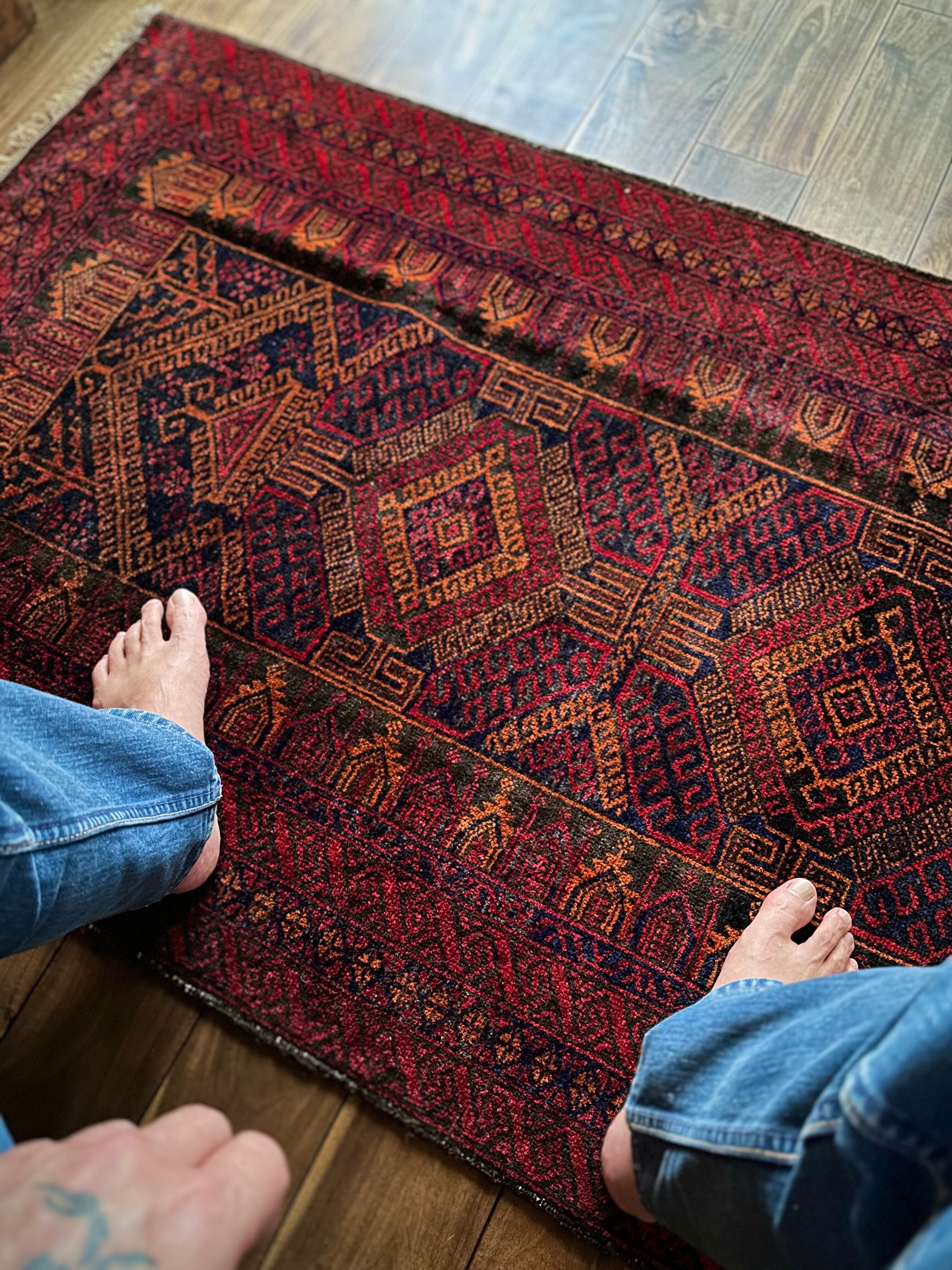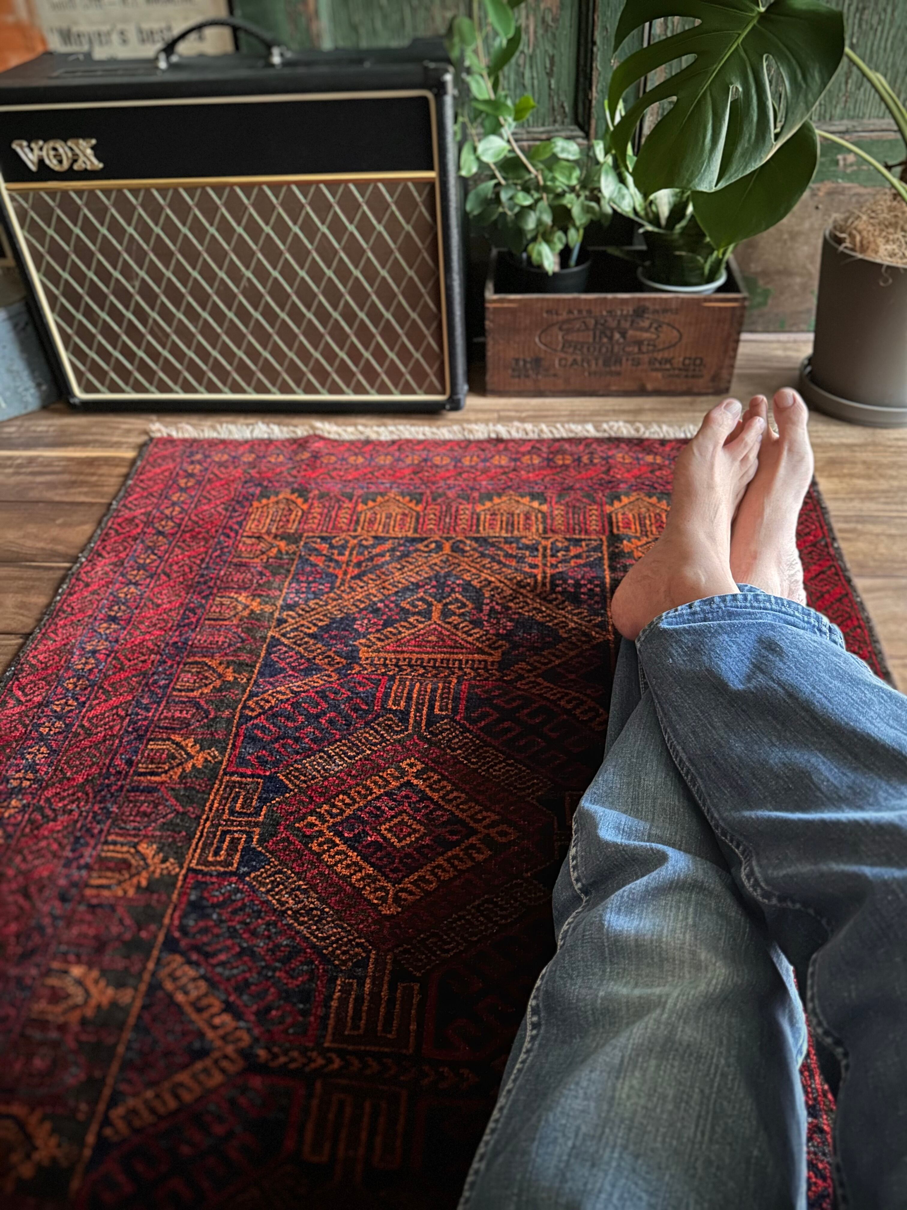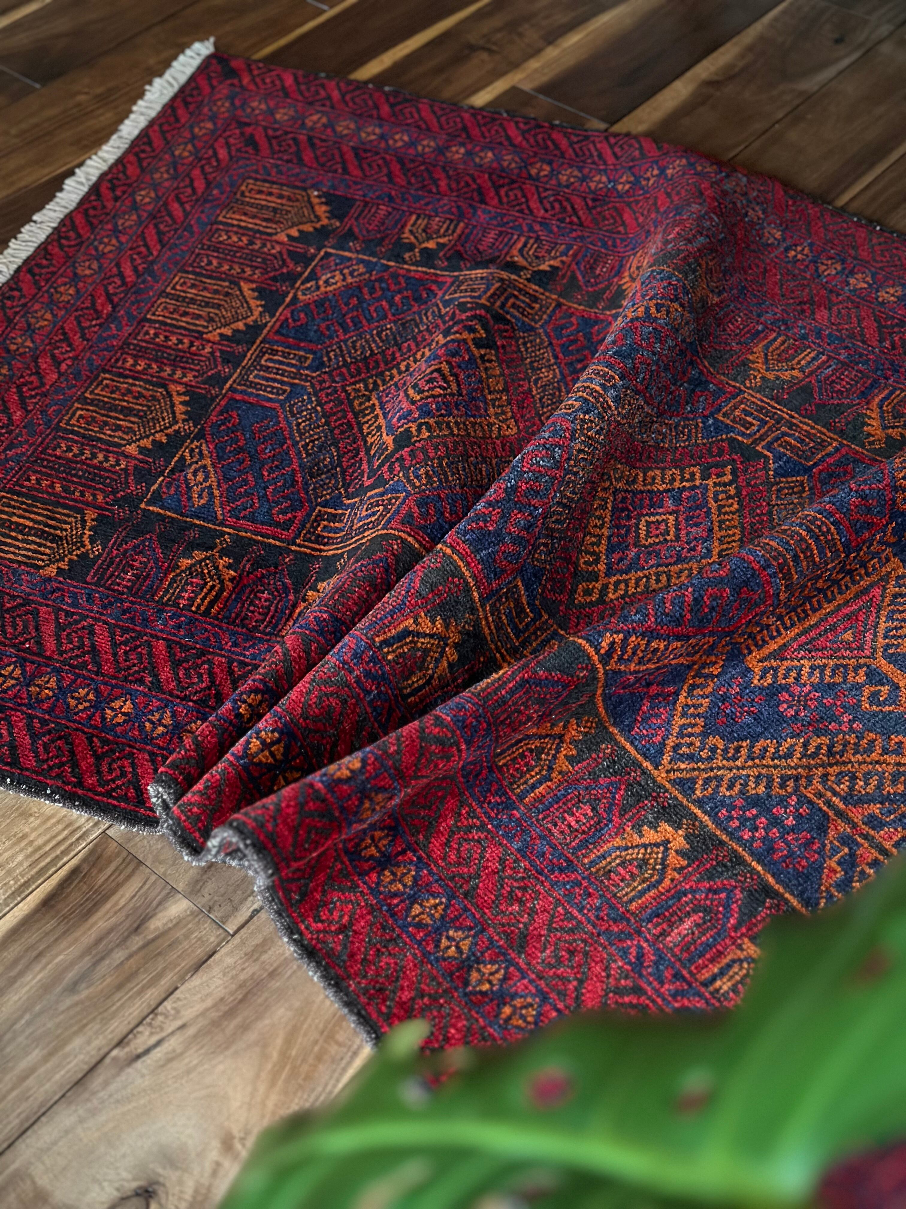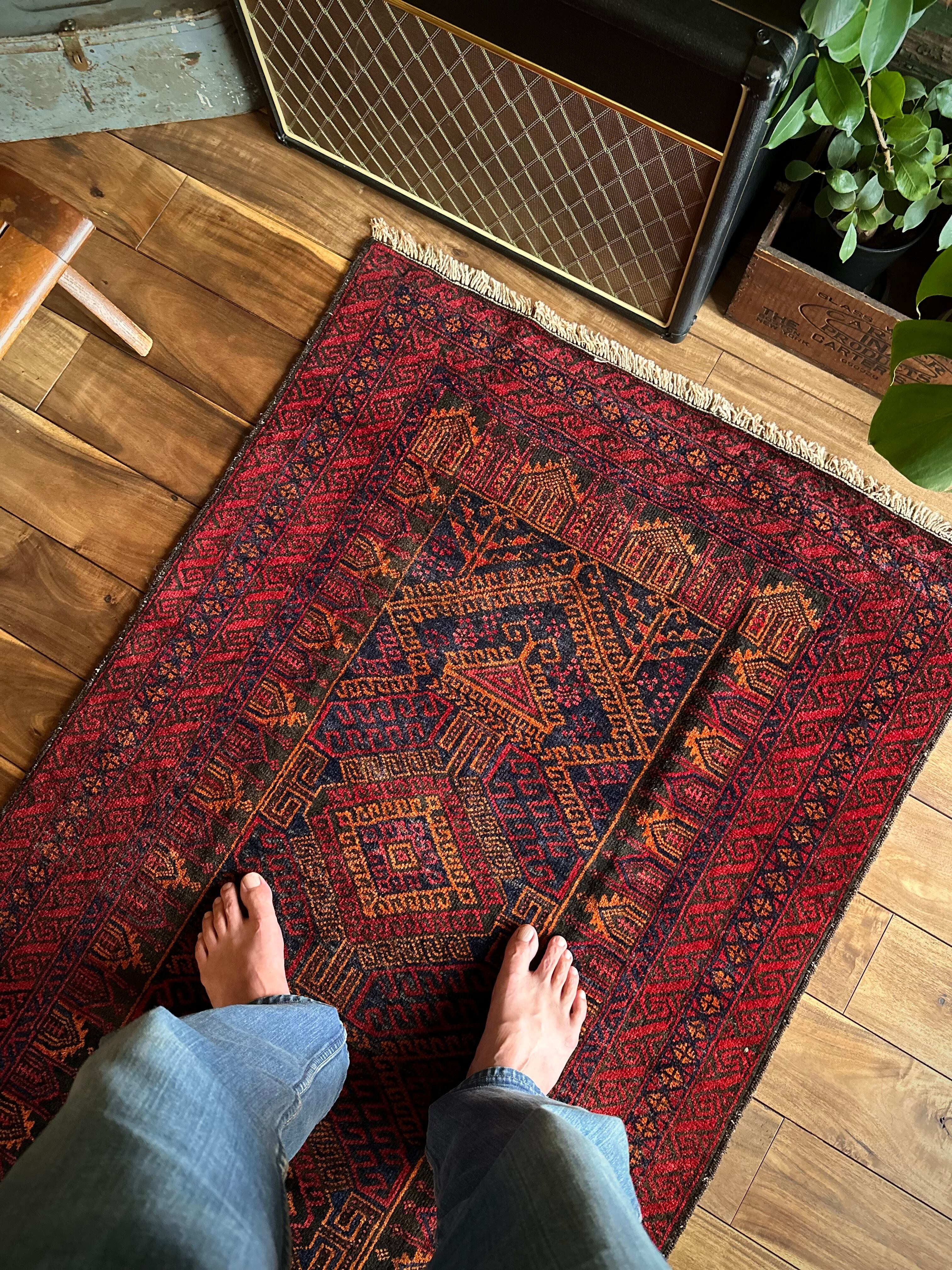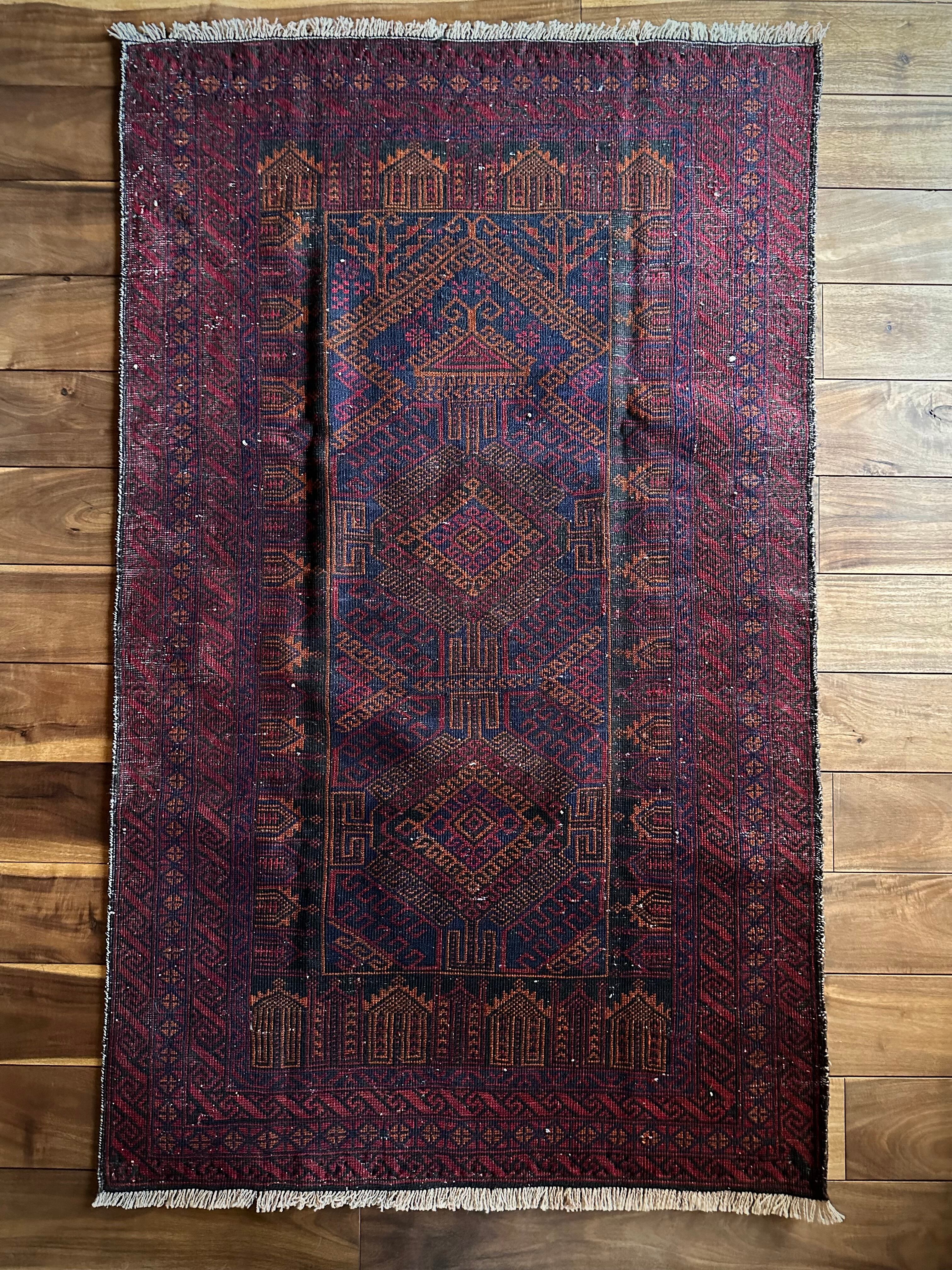 深海のような赤のグラデーションにブラックとオレンジがよりダークな印象を与えるヘラート州に住むバルーチ族のトライバルラグで、現地では”Zinjir gul”と呼ばれるフックドメダリオンが並んだ祈祷用のプレイヤーラグになります。