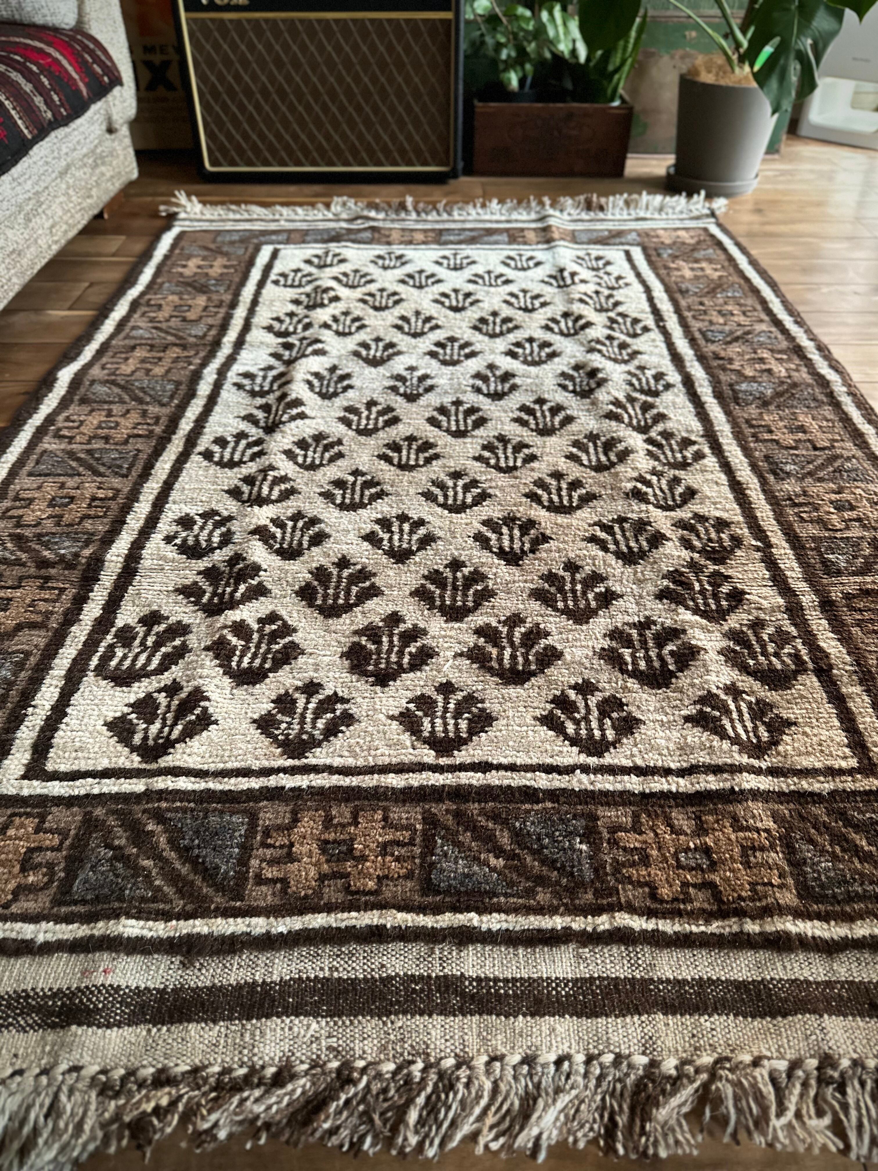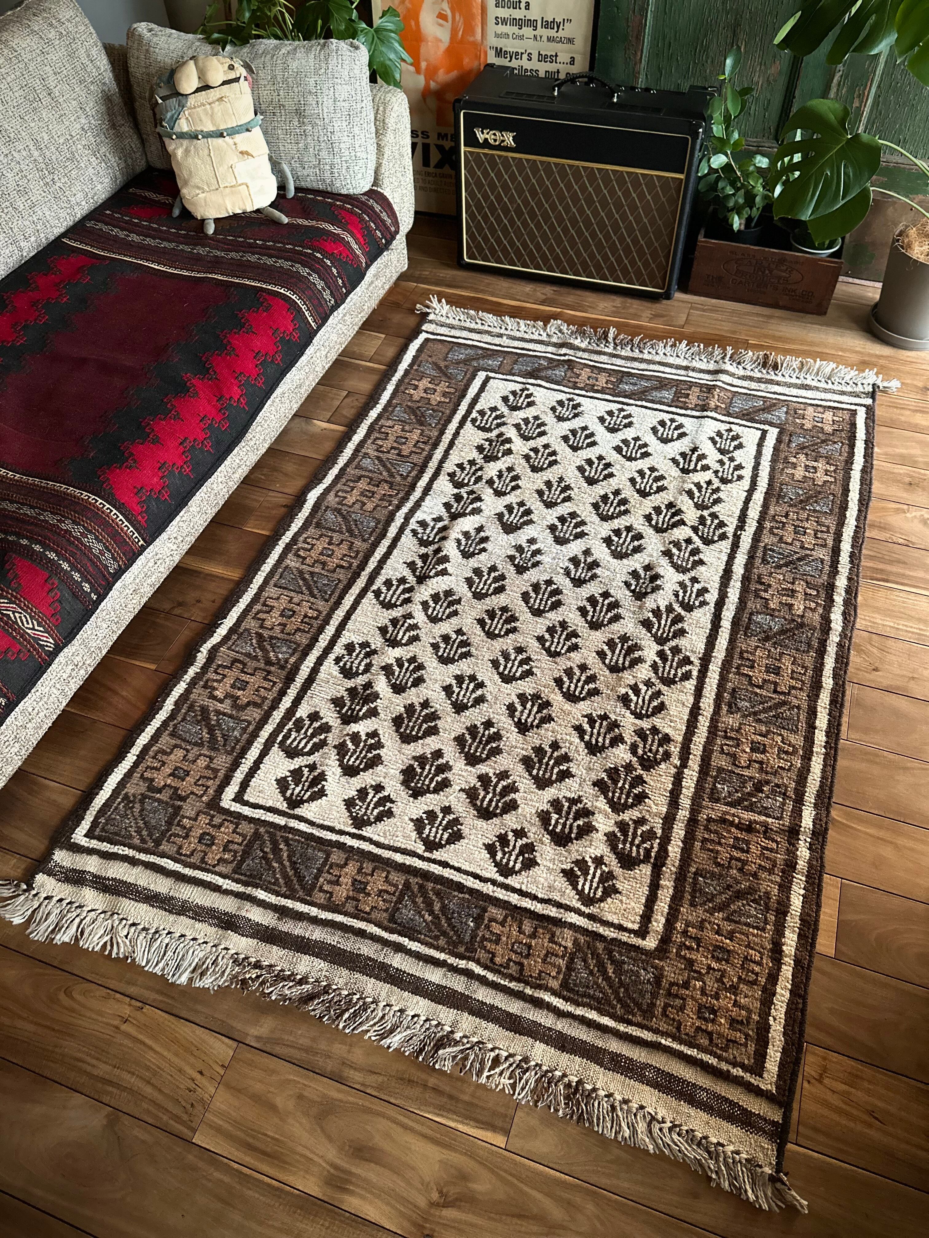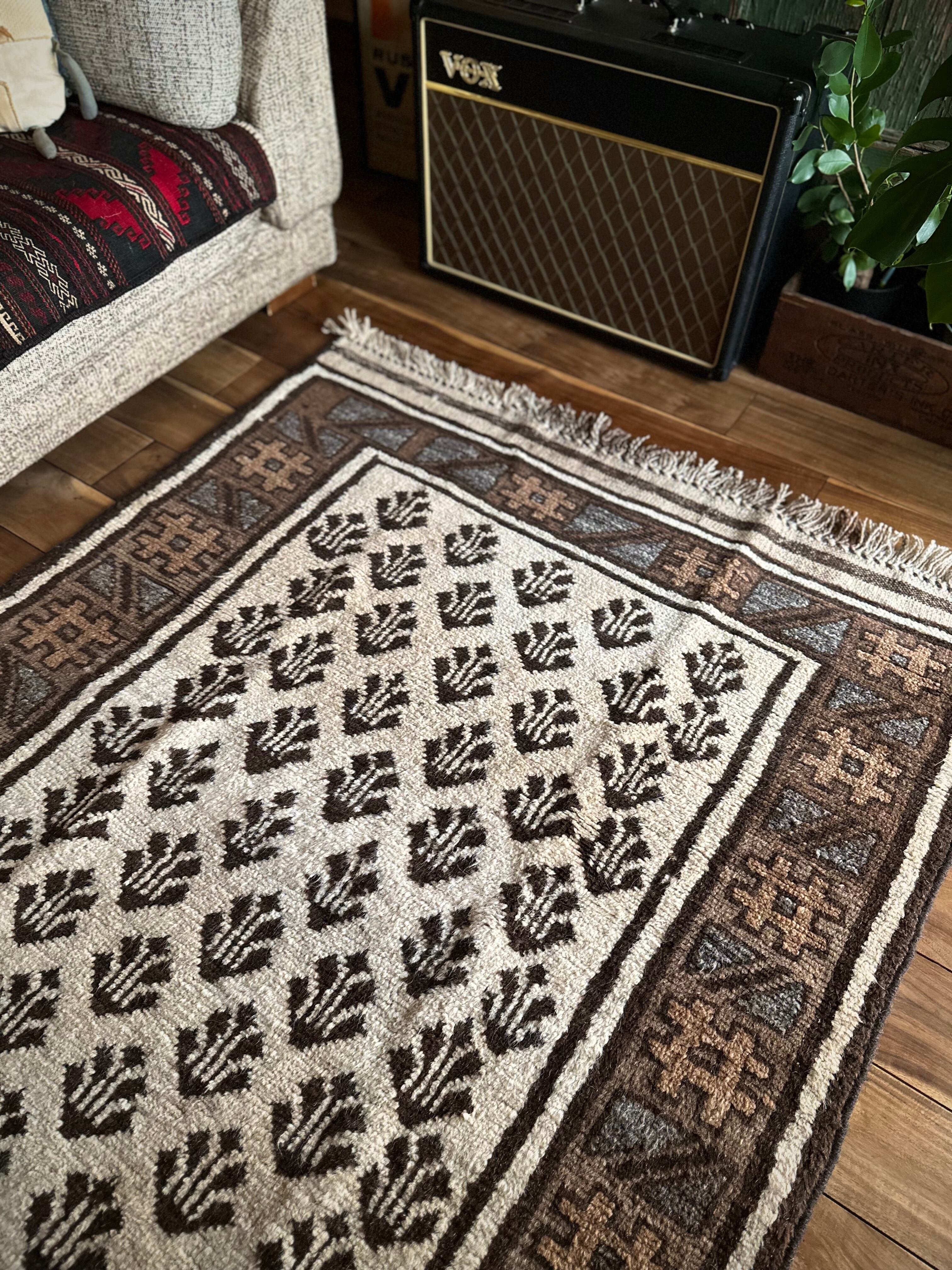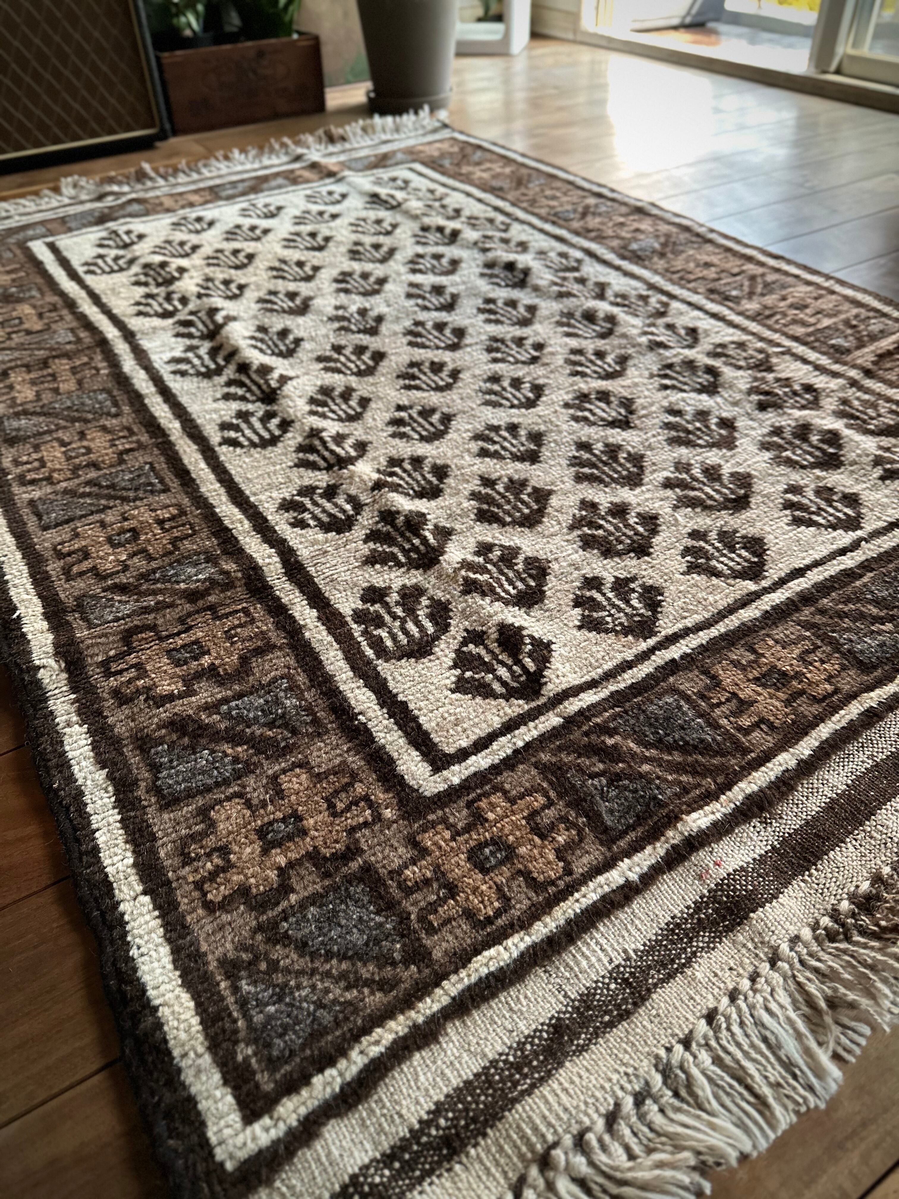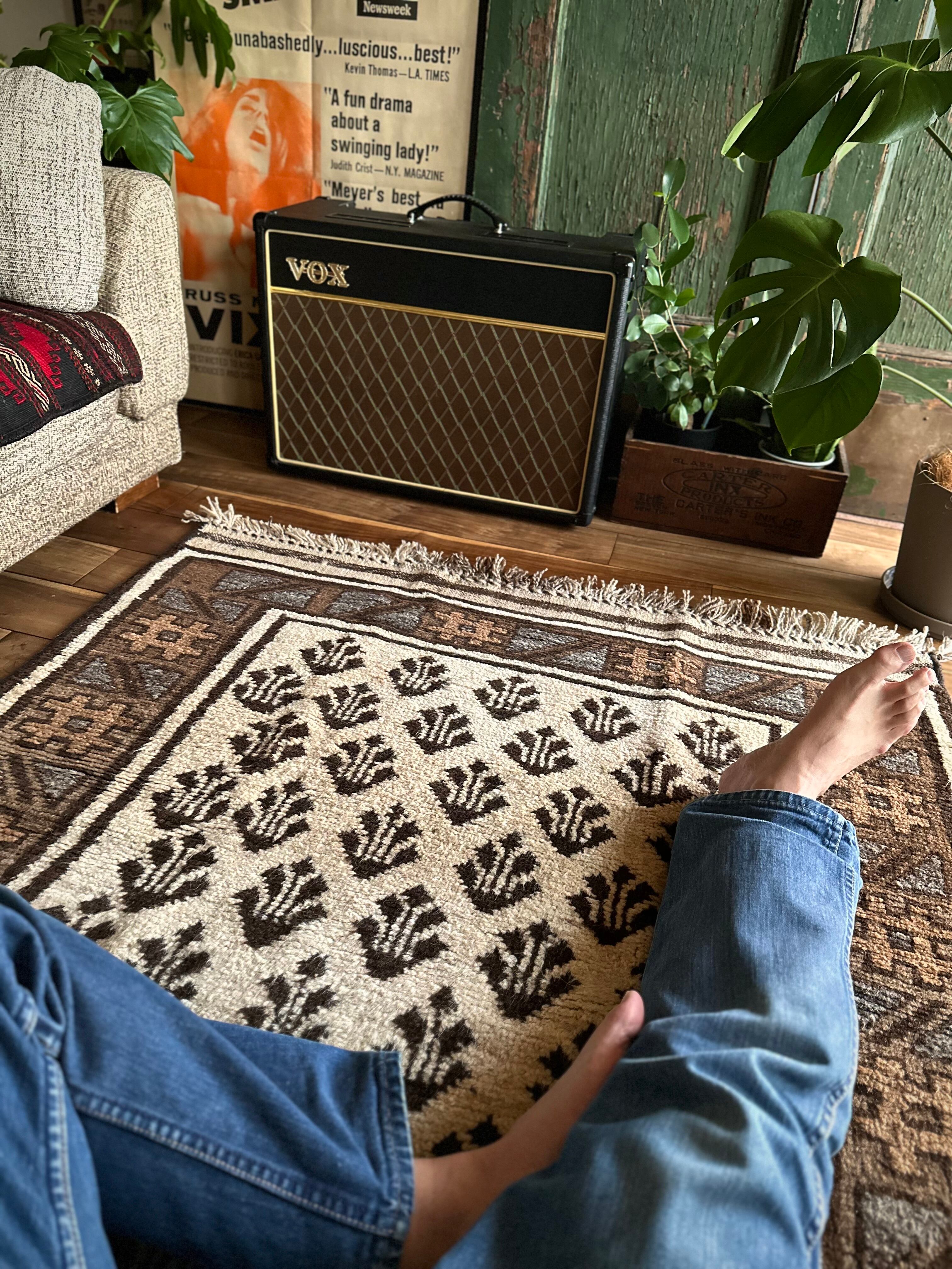 最後にラグそのものに関しては羊毛特有の匂いがあり、採寸は中央付近で計測していますが、手織りならではの歪みによる誤差や水洗いクリーニングによる縮み、また草木染めによる経年劣化の色ムラなどがありますが、それもまたヴィンテージラグの魅力かとご理解ください。